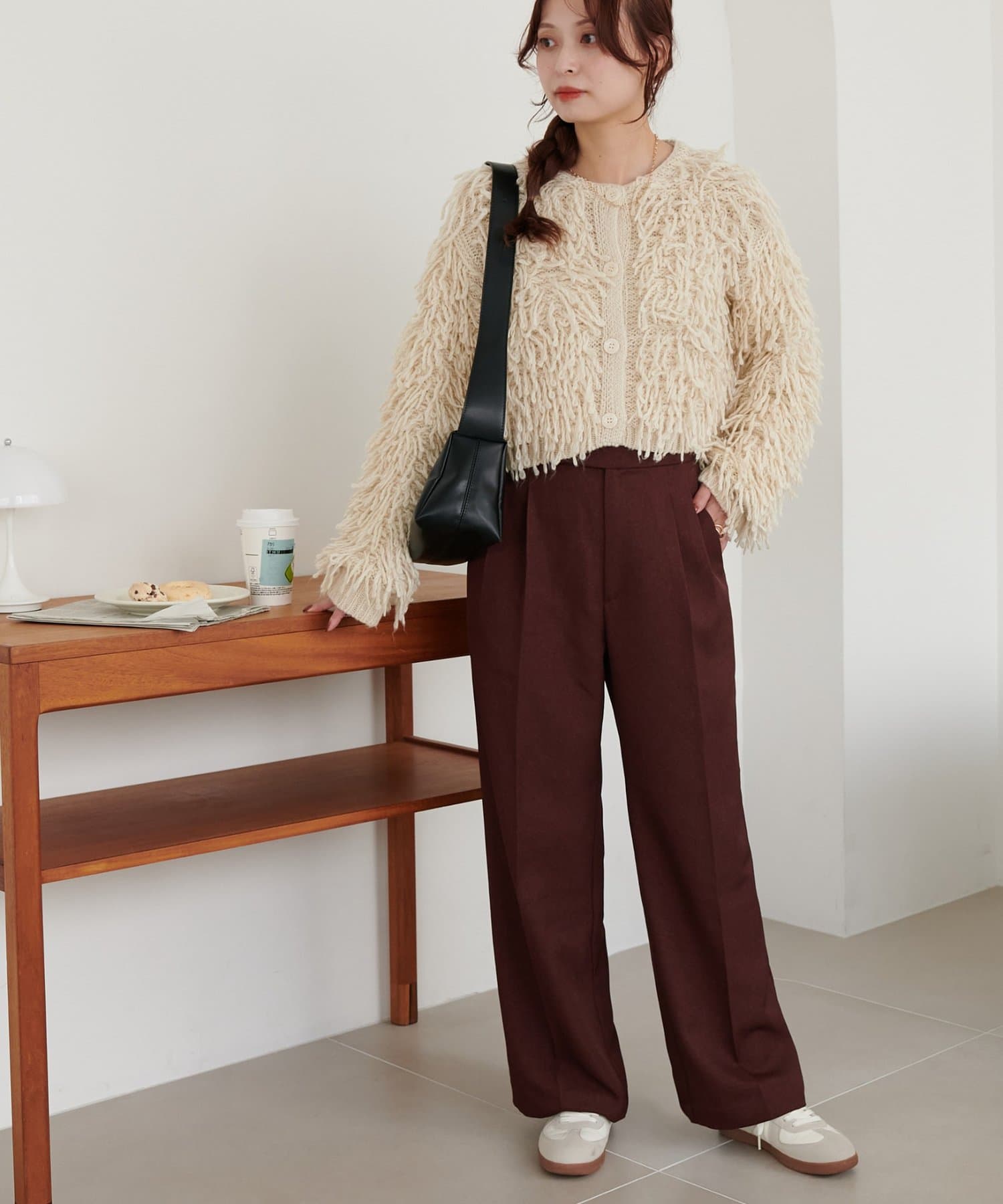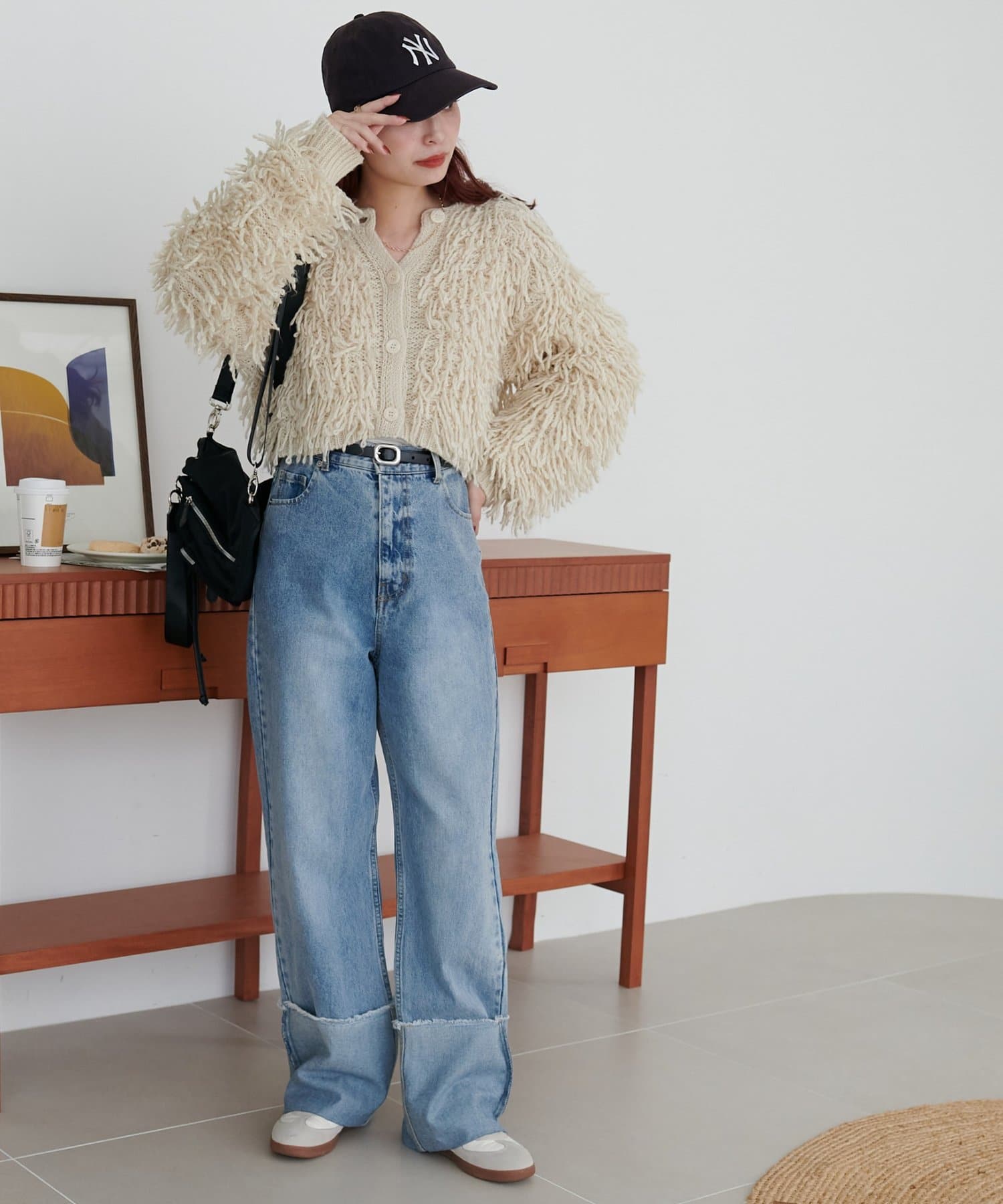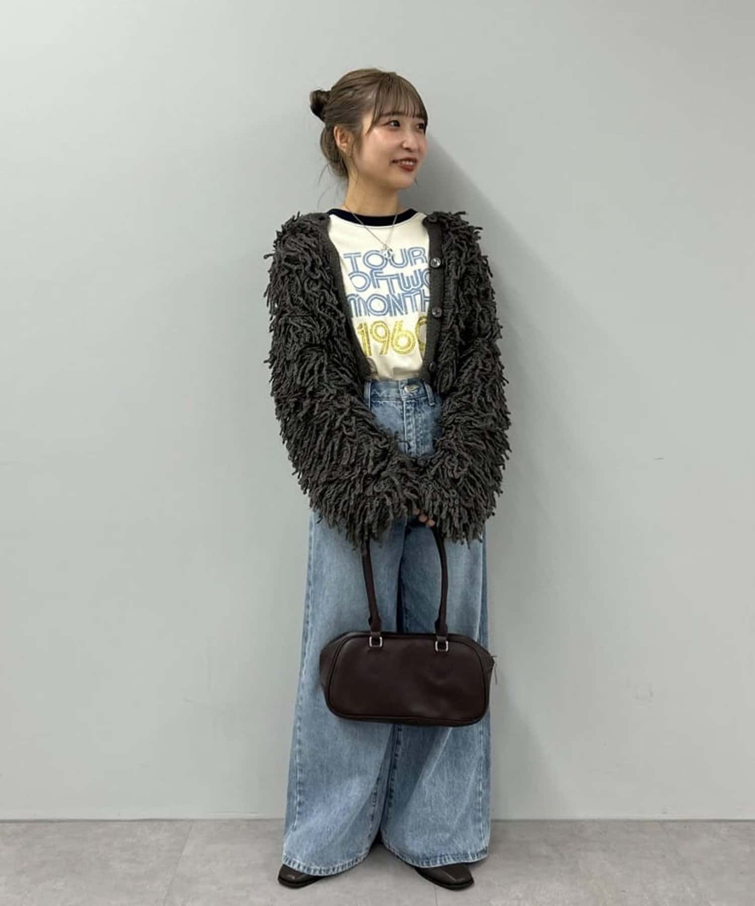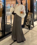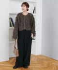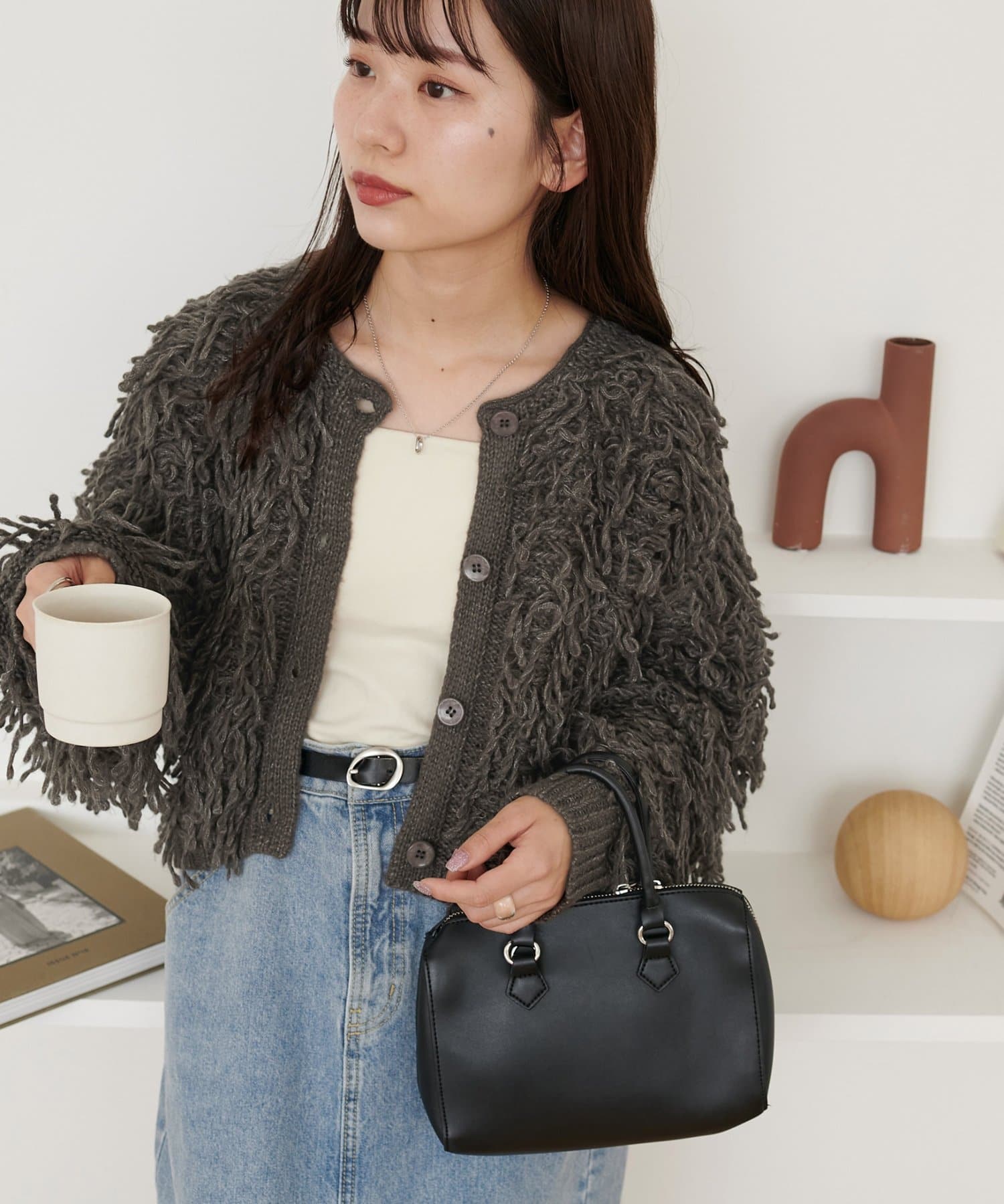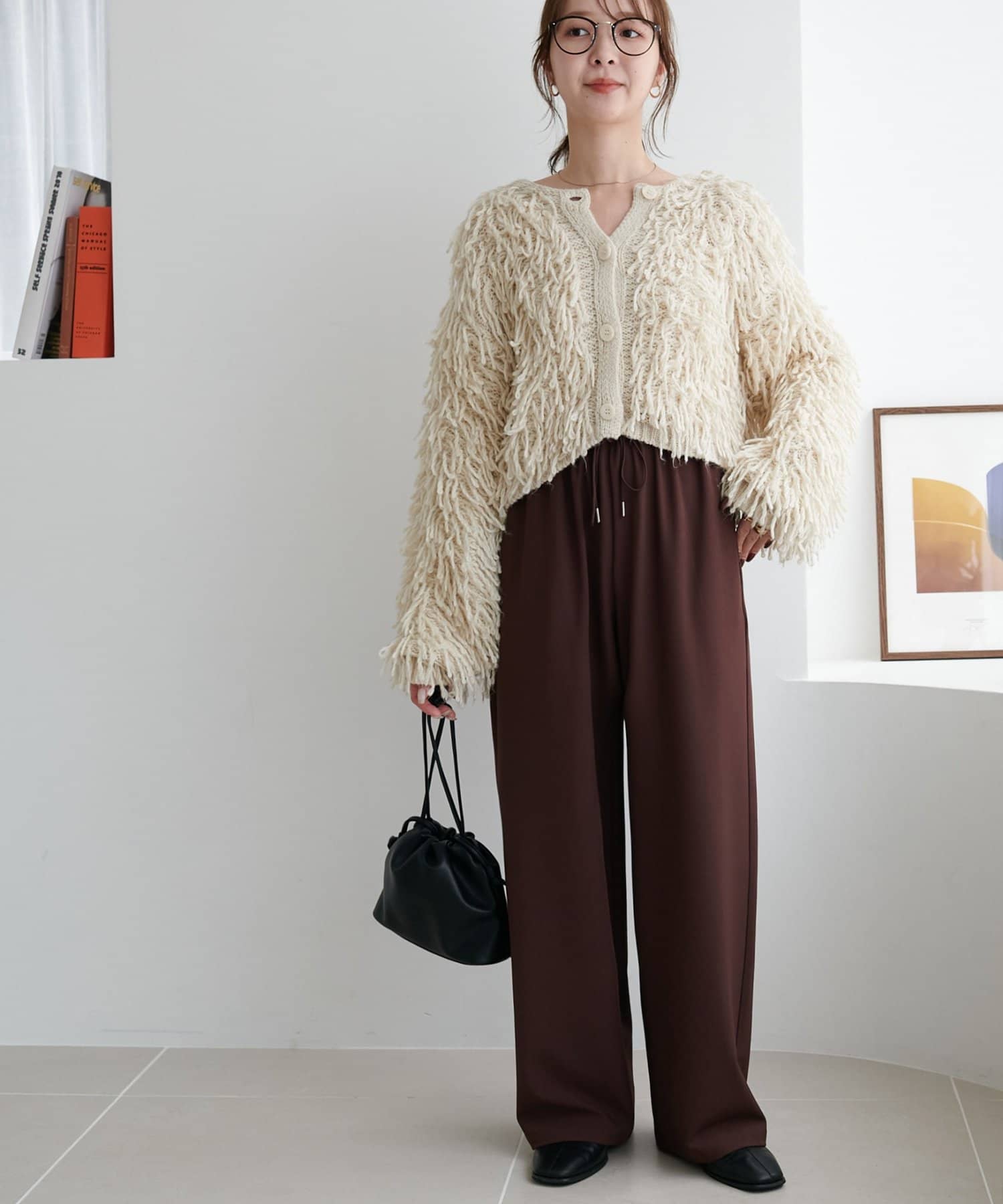 目を惹くボリュームのあるフリンジ素材が魅力。ボリューム感がありながらも、ショート丈なのでスッキリ見えします。前後2WAY仕様で、カーディガンとしても着用できるので様々な着こなしを楽しめます♩