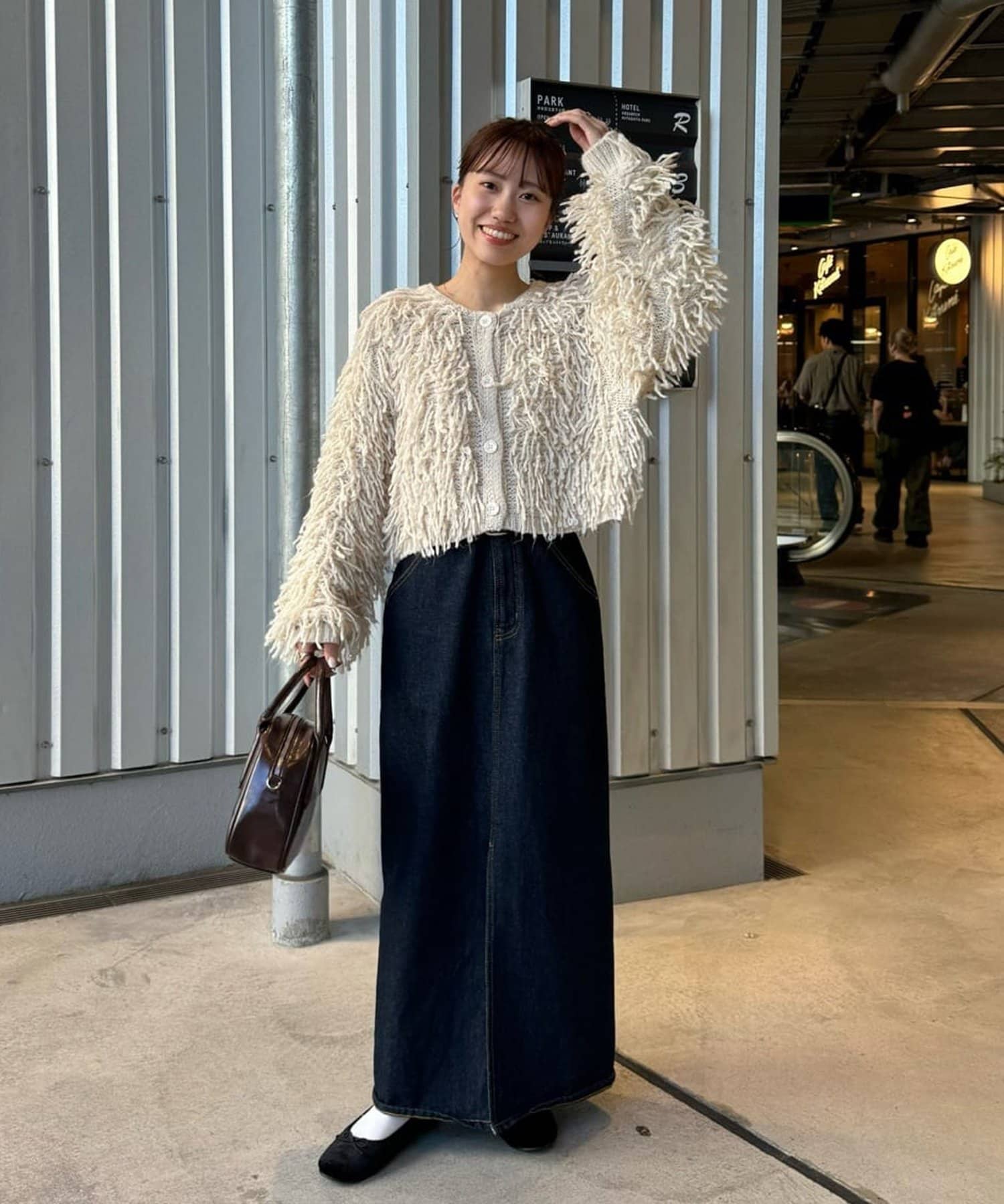 ・155cmスタッフ:ふわっとしたフリンジ素材が華やかで、着るだけでコーデが映える一枚です。