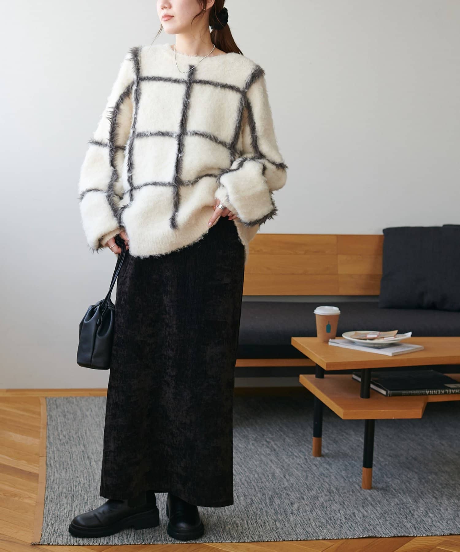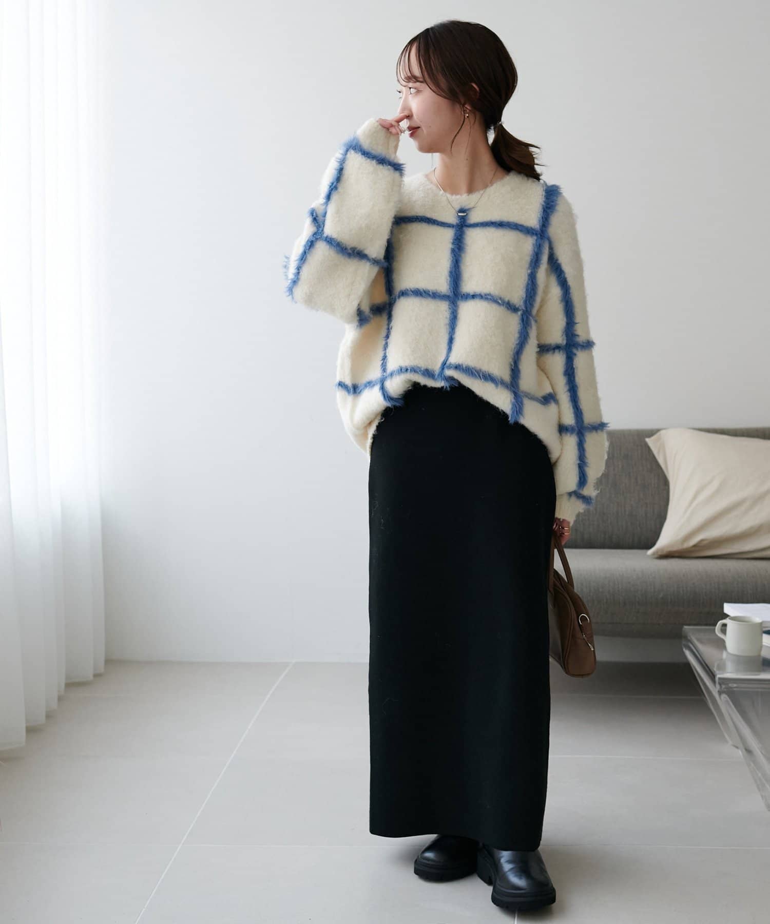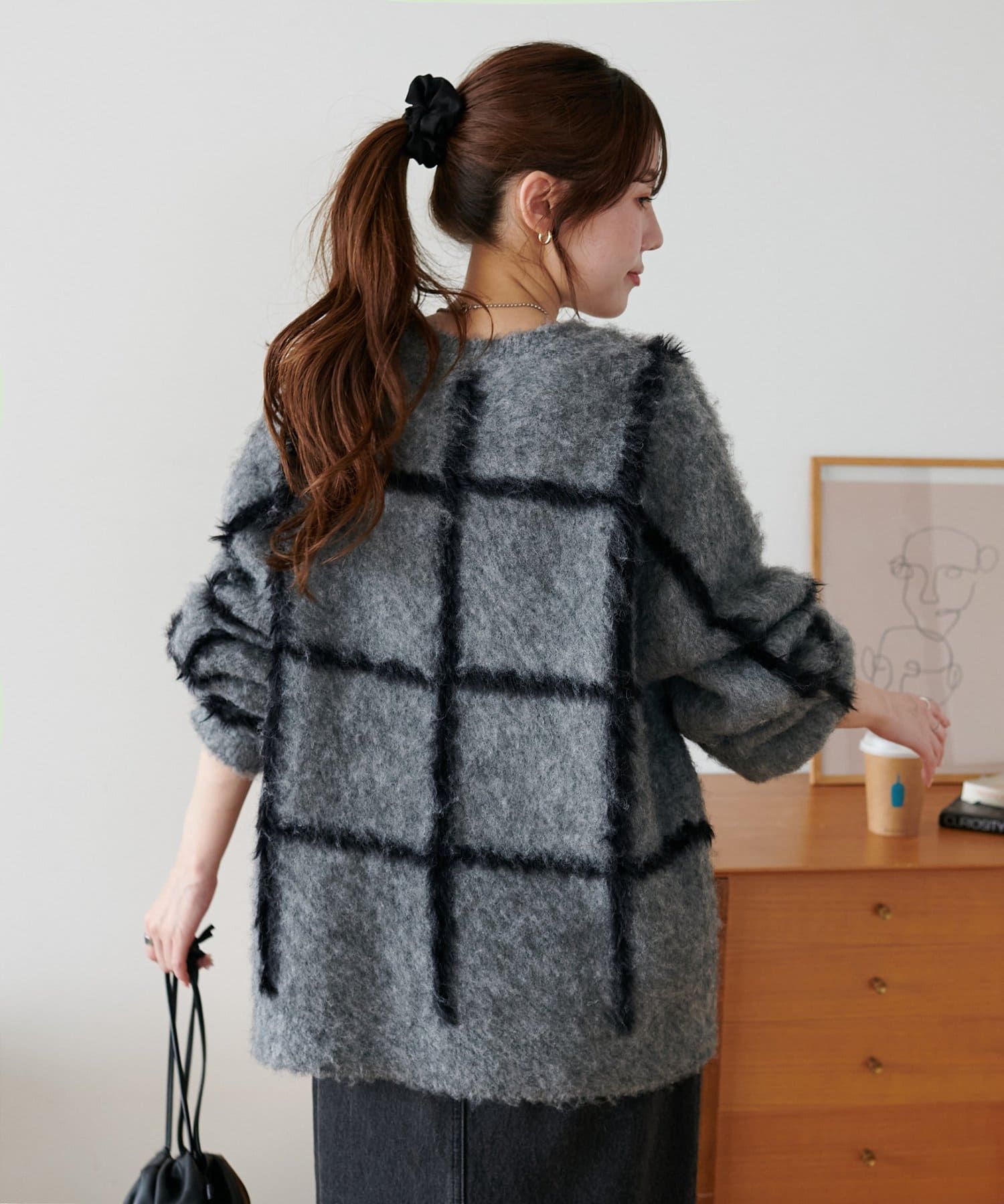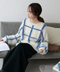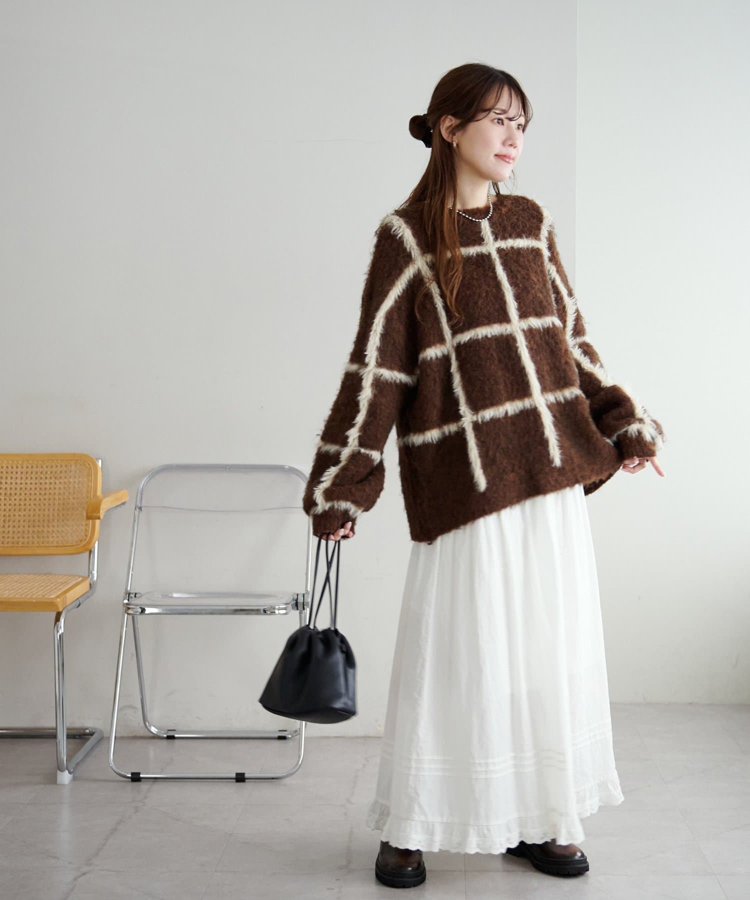 大胆でインパクトのあるチェック柄を全面にあしらったニット。