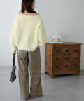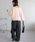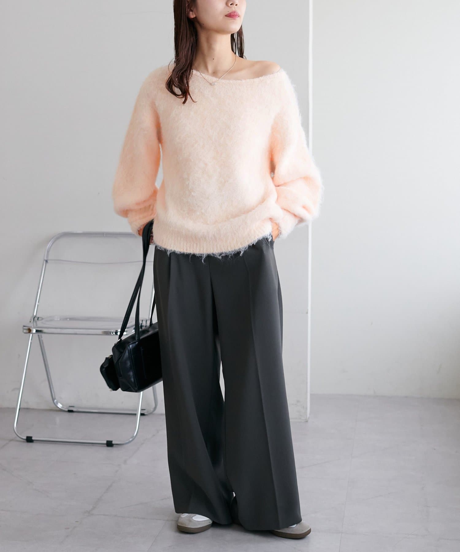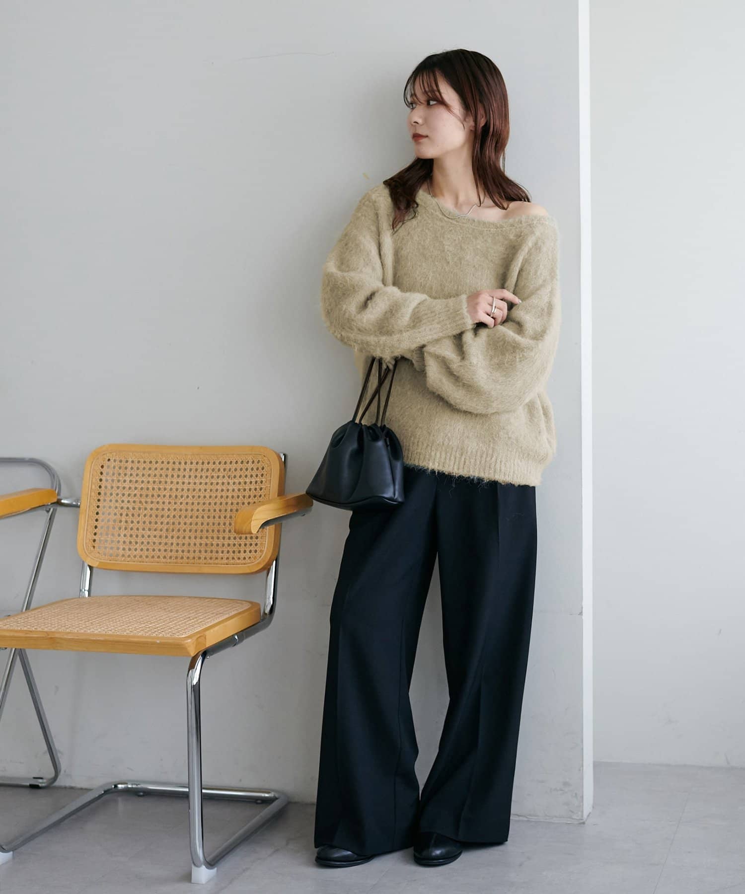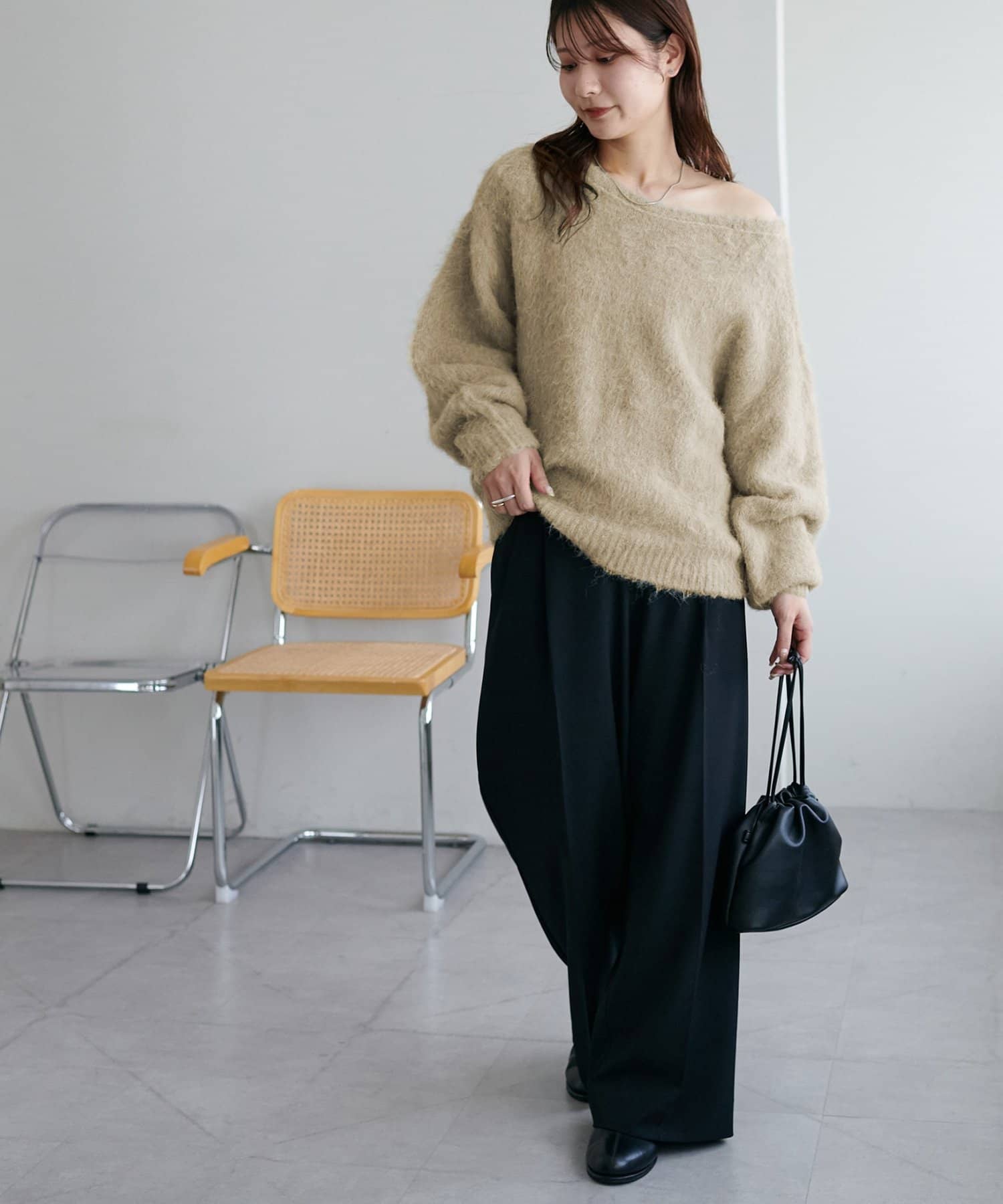 157cmスタッフ:ワンショルデザインで女性らしさのあるニット。裾がリブになっていることで、タックインせず着てももたつかずスッキリ見えします!