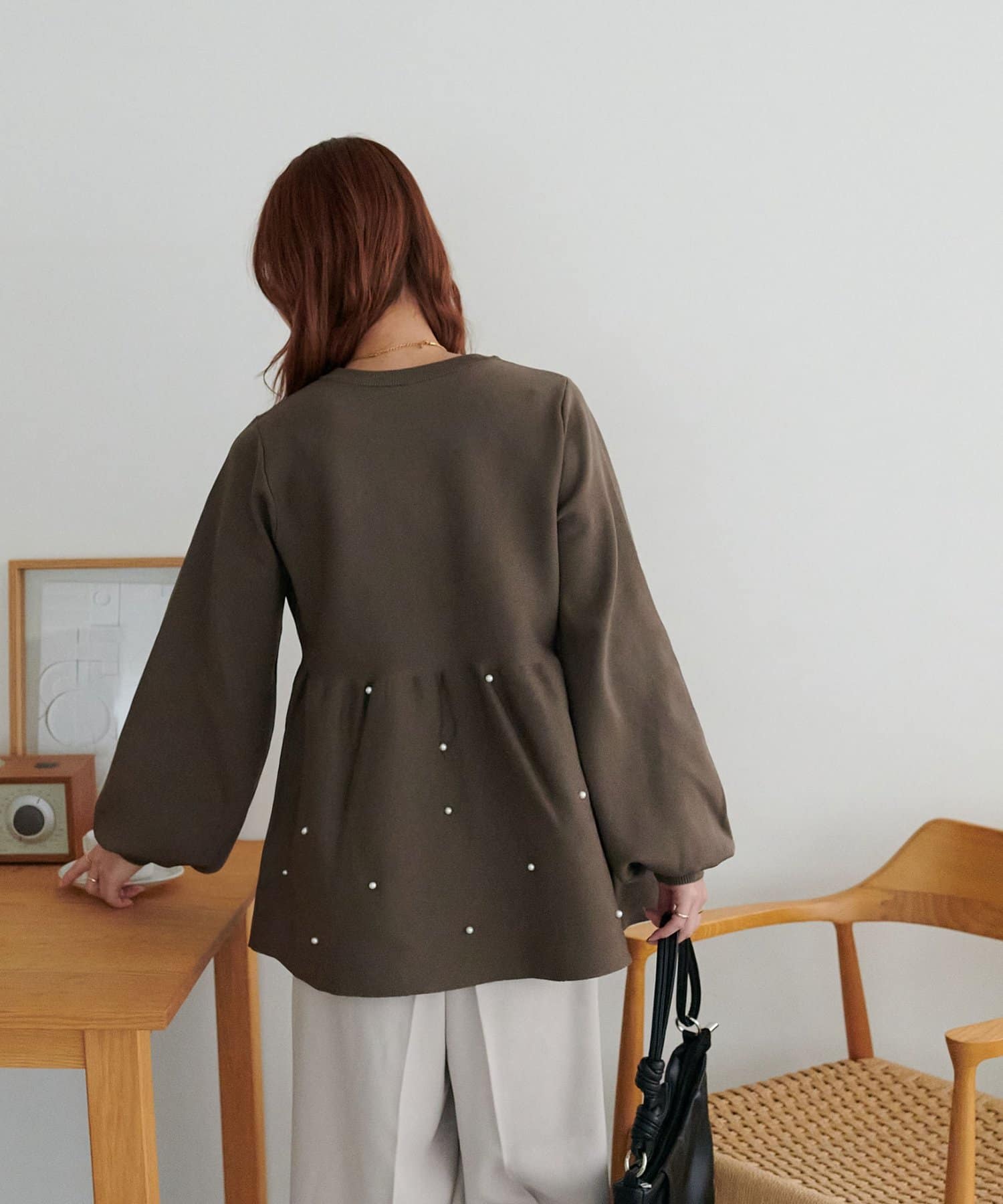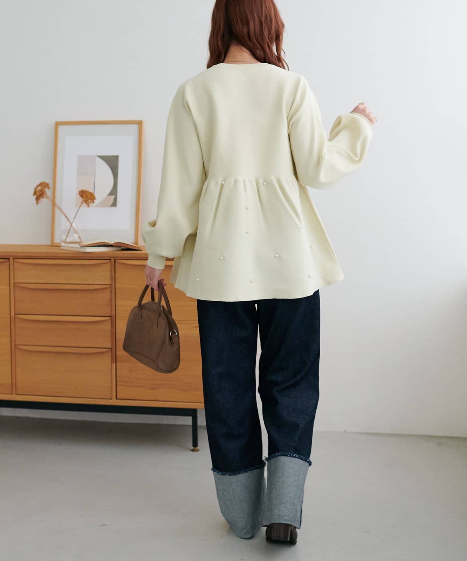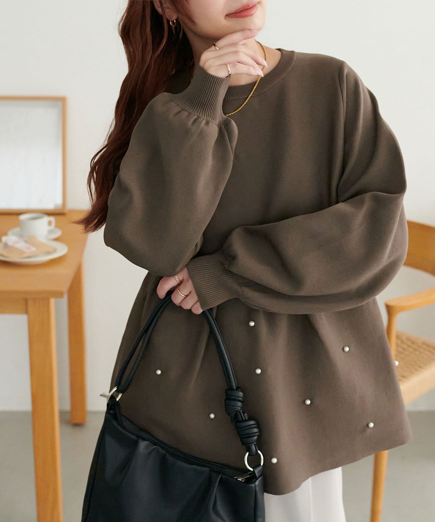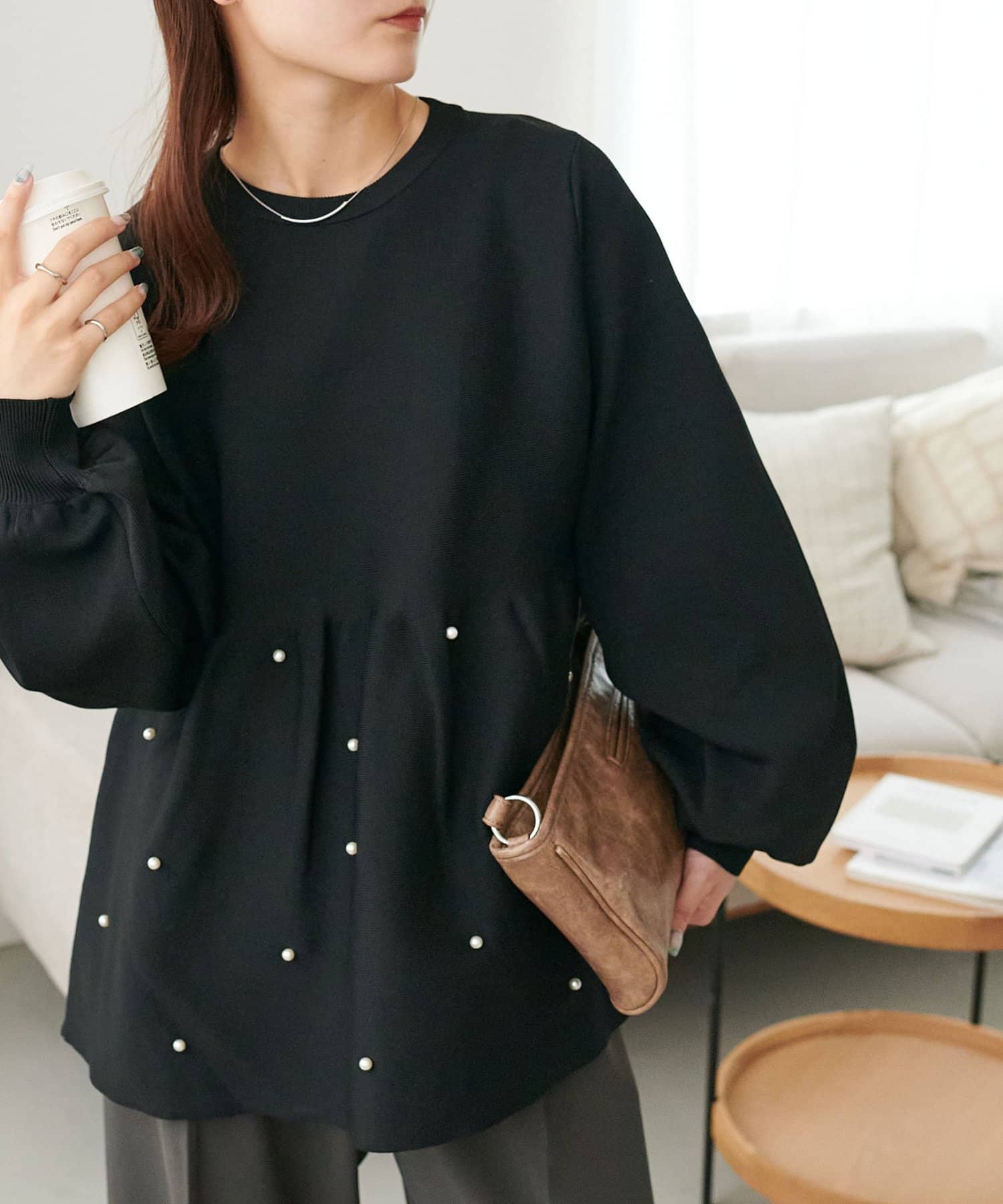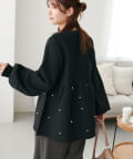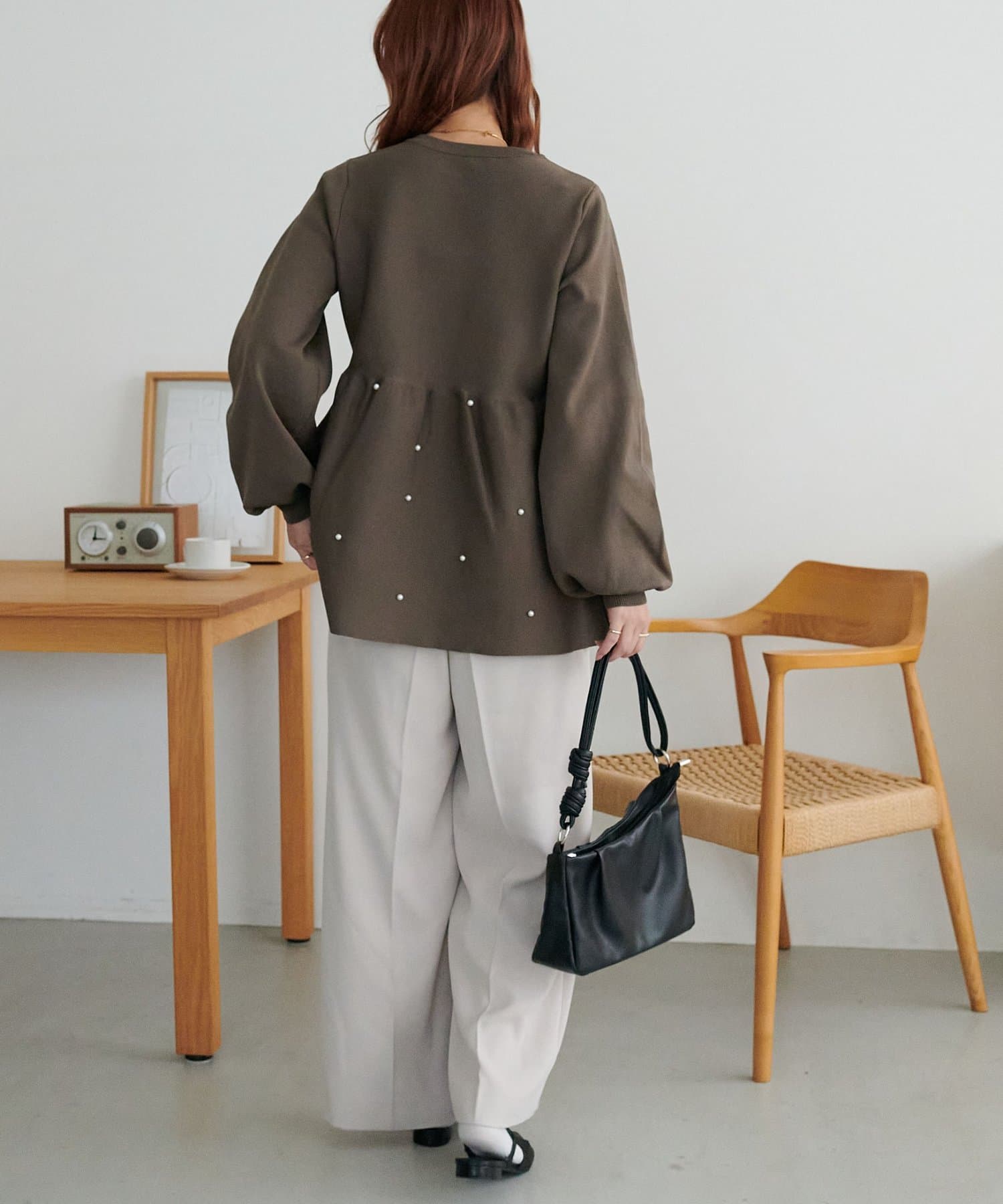 ゆるっとしたシルエットにパールのアクセントが映え、ボリューム袖が女性らしさを引き立ててくれます。