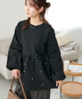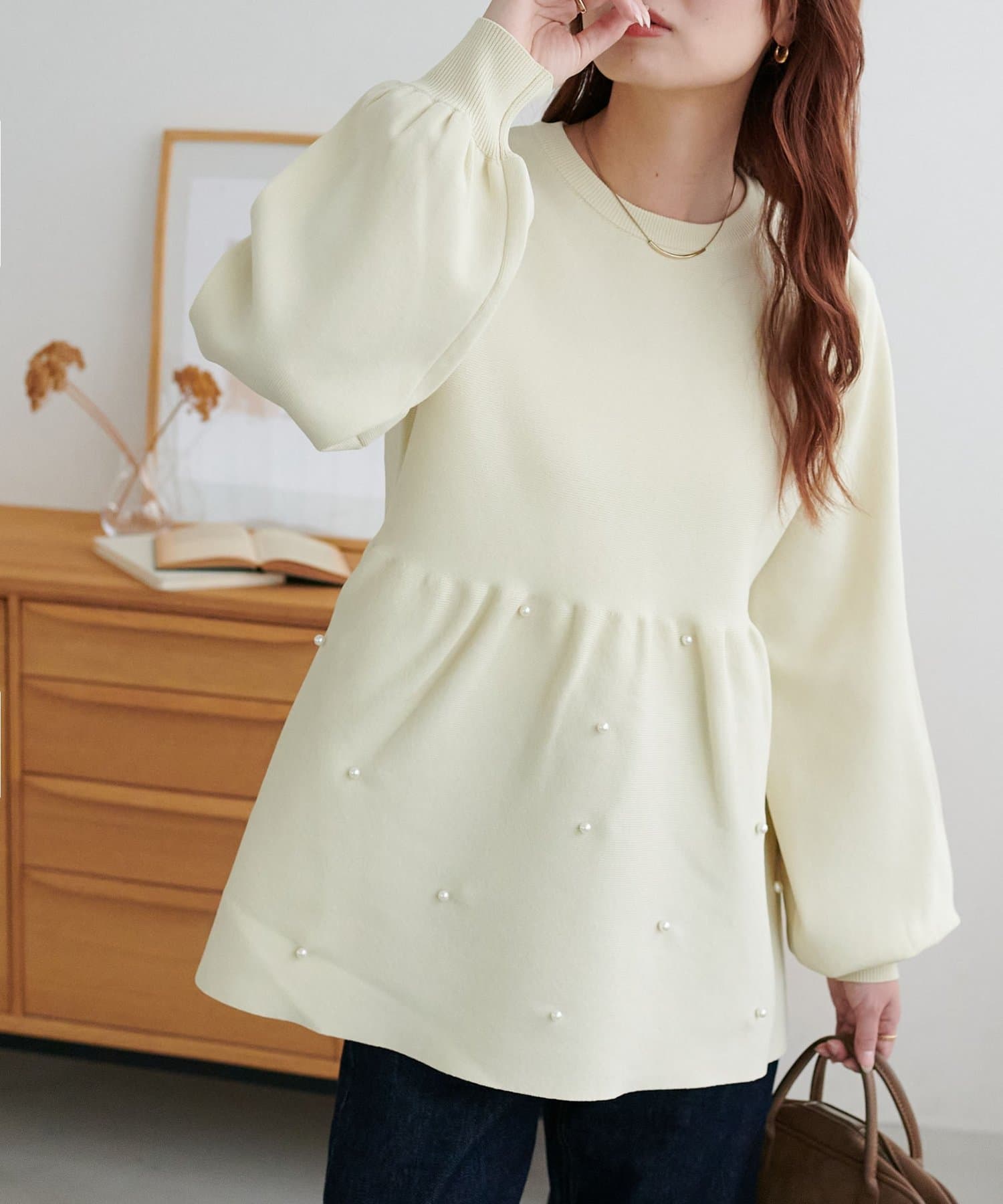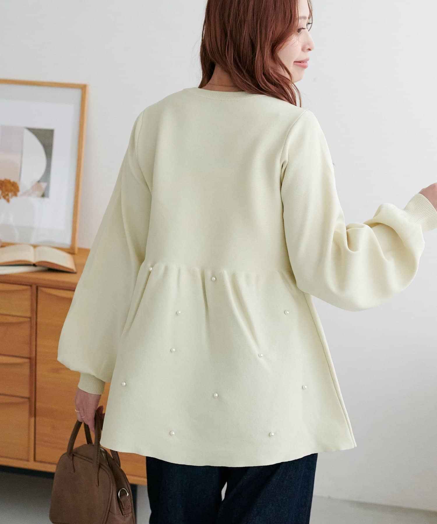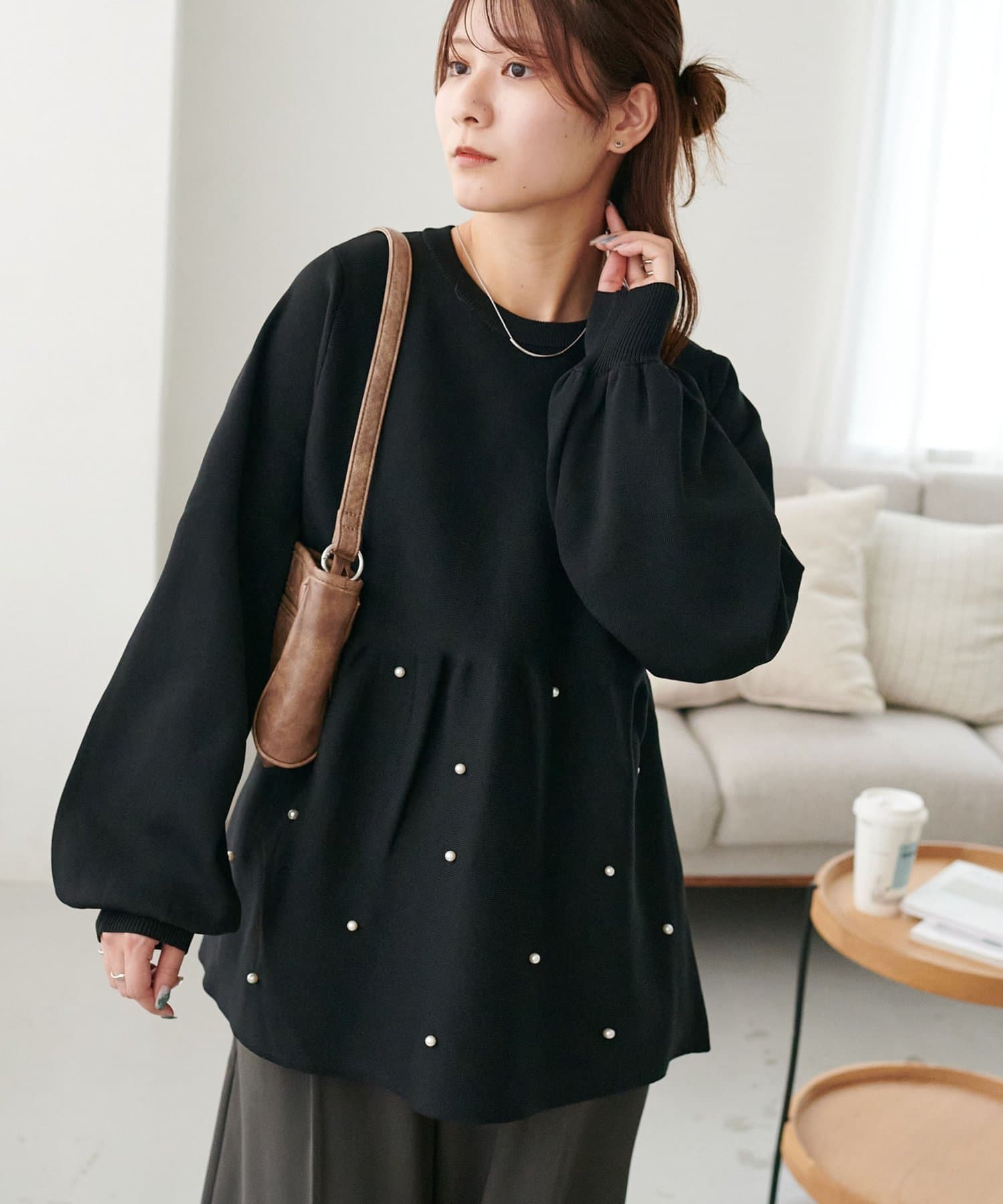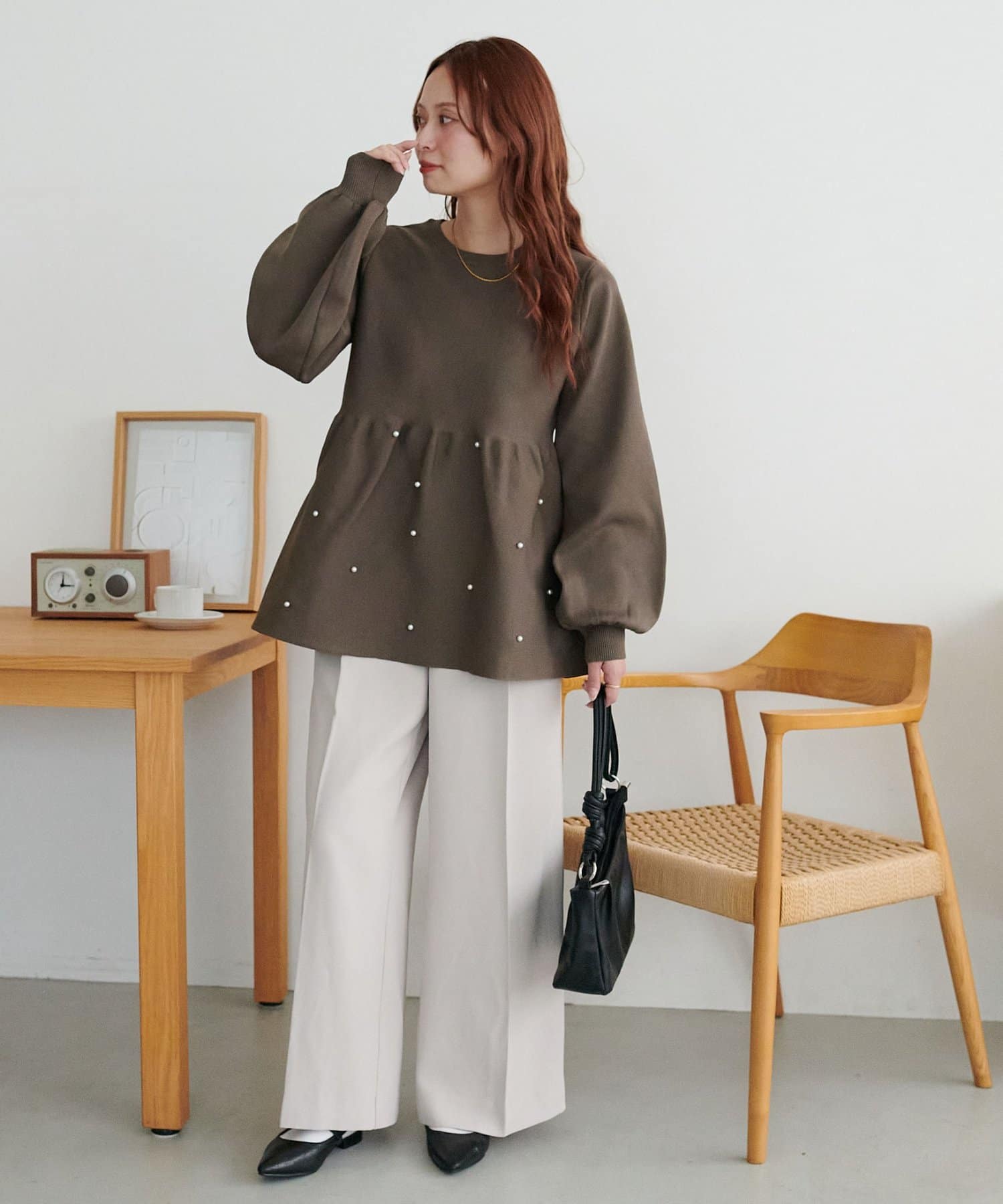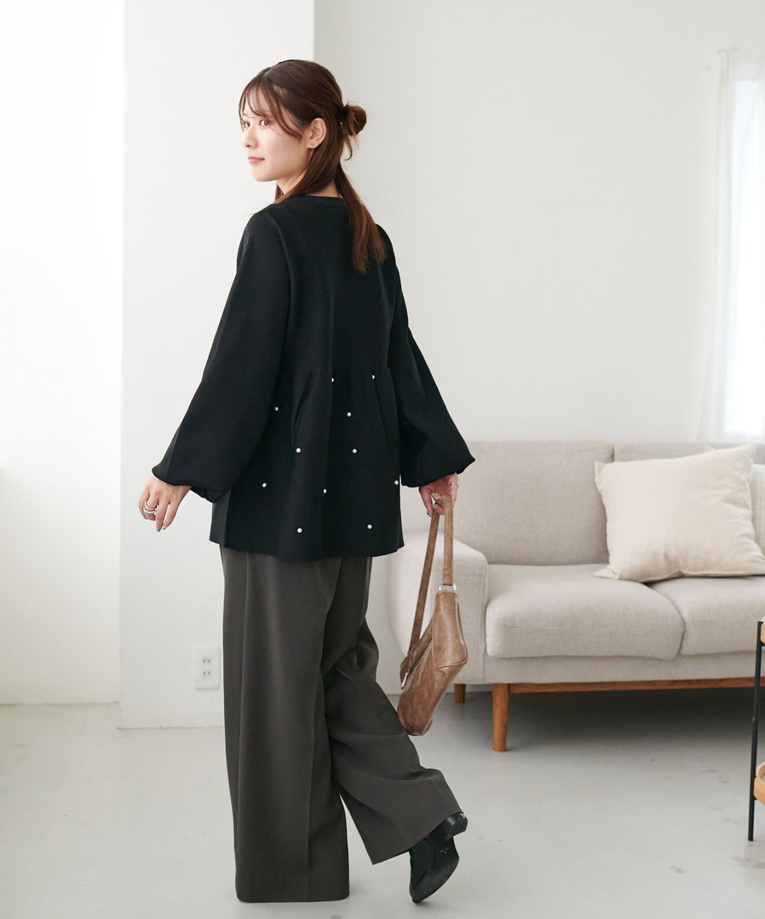 ゆるっとしたシルエットにパールのアクセントが映え、ボリューム袖が女性らしさを引き立ててくれます。