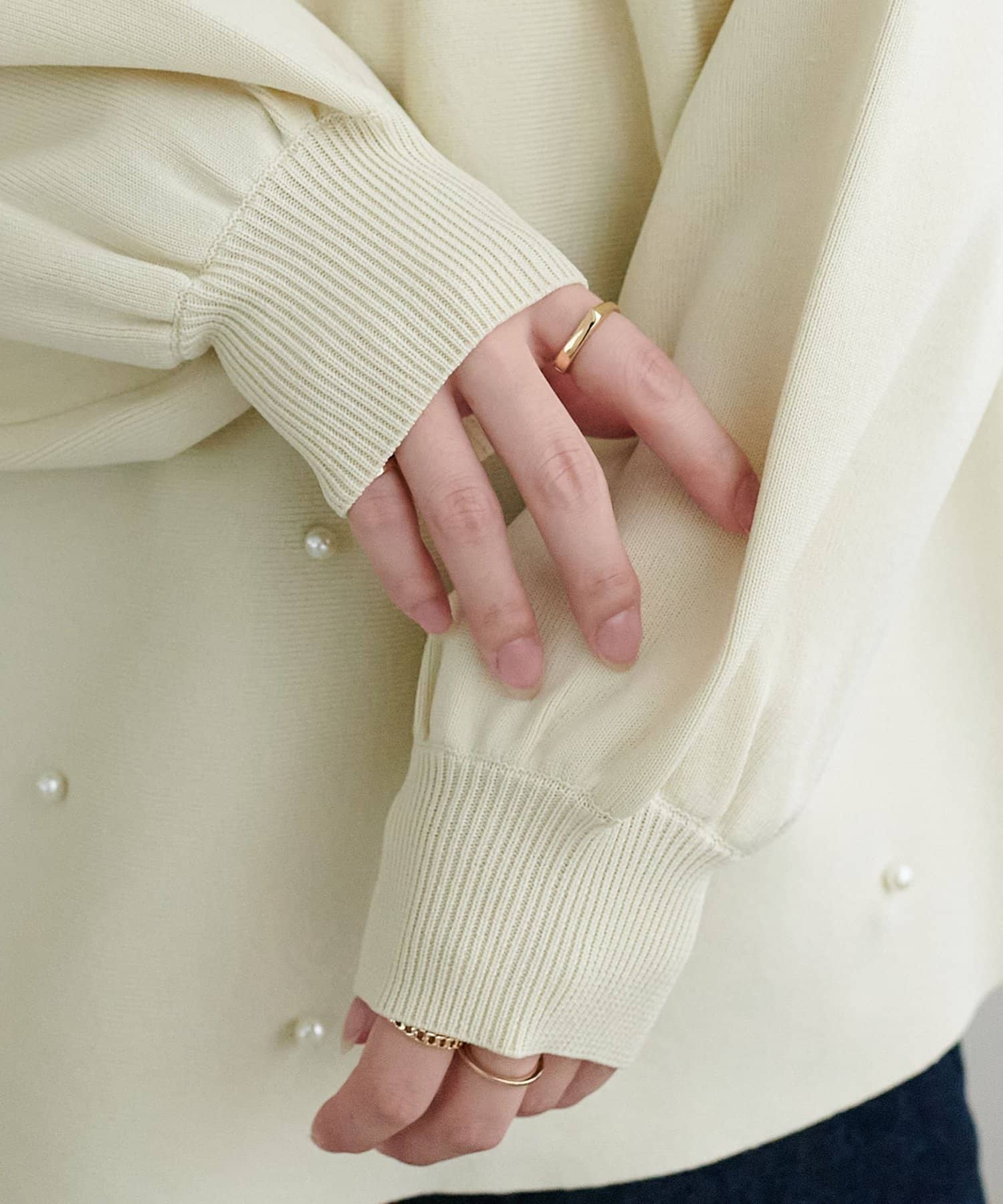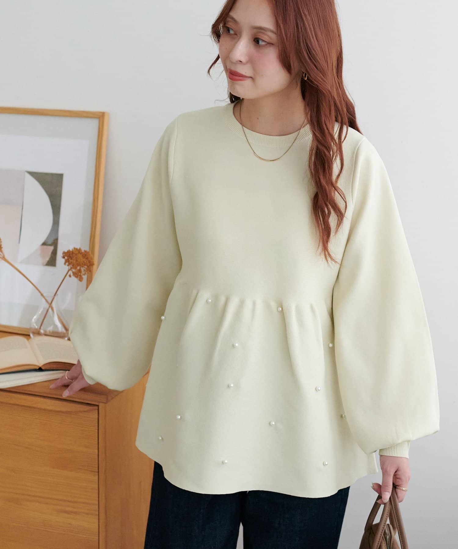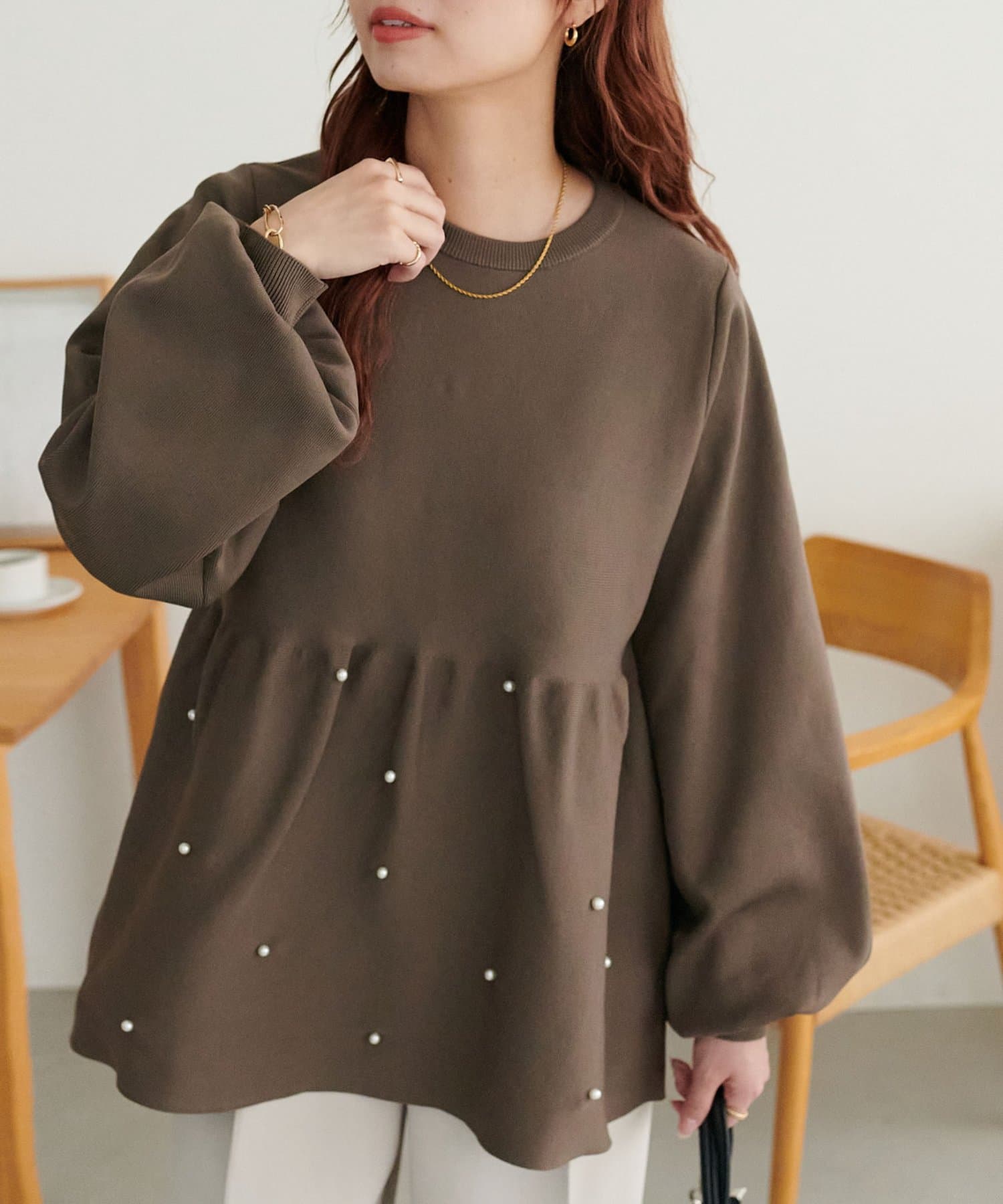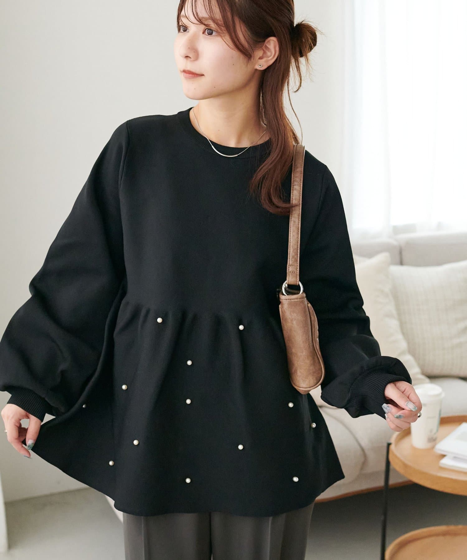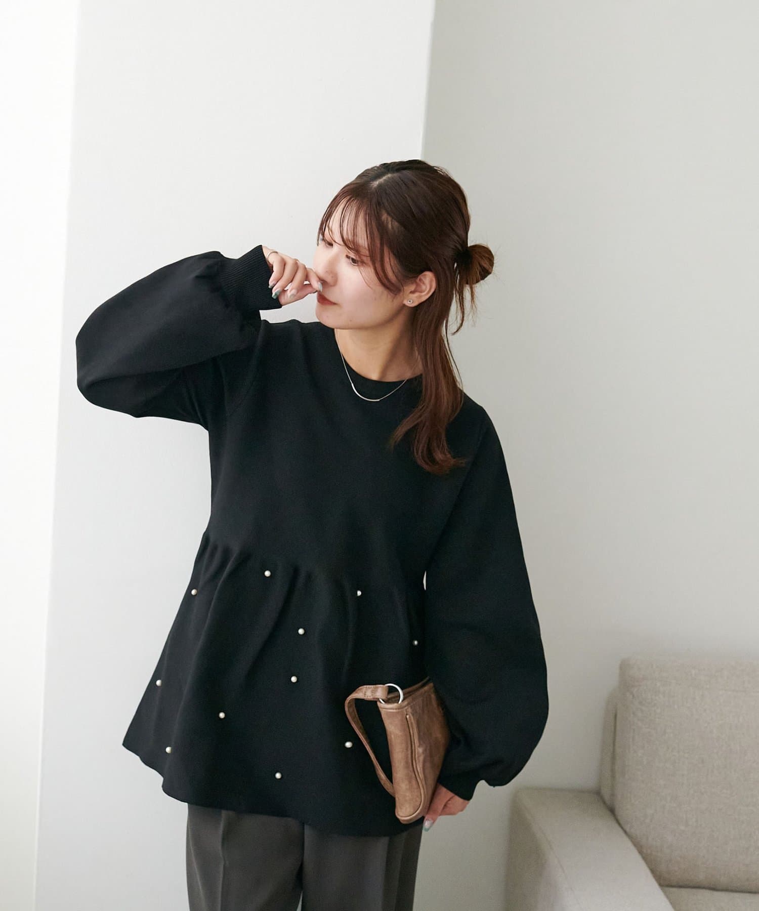 ゆるっとしたシルエットにパールのアクセントが映え、ボリューム袖が女性らしさを引き立ててくれます。