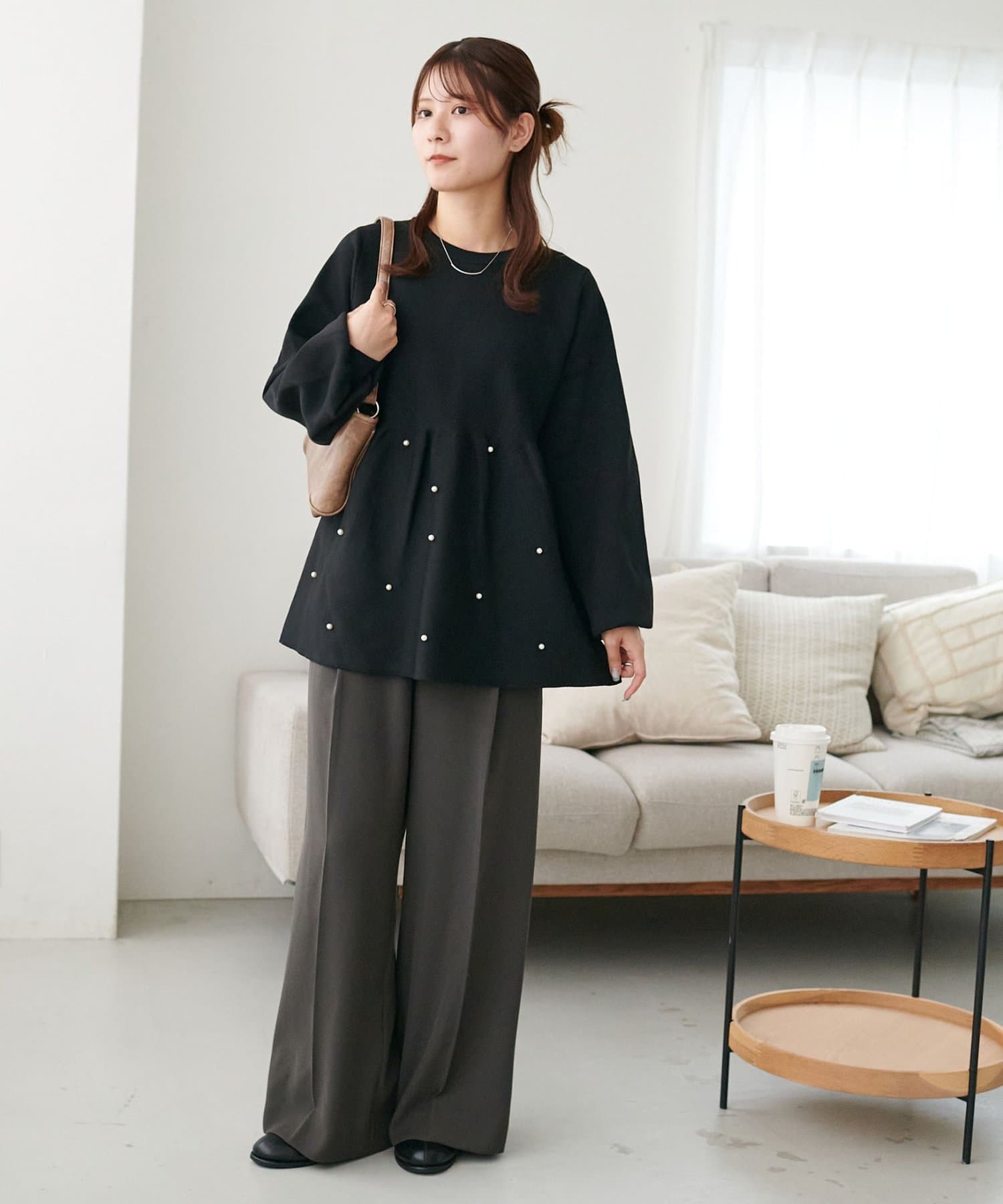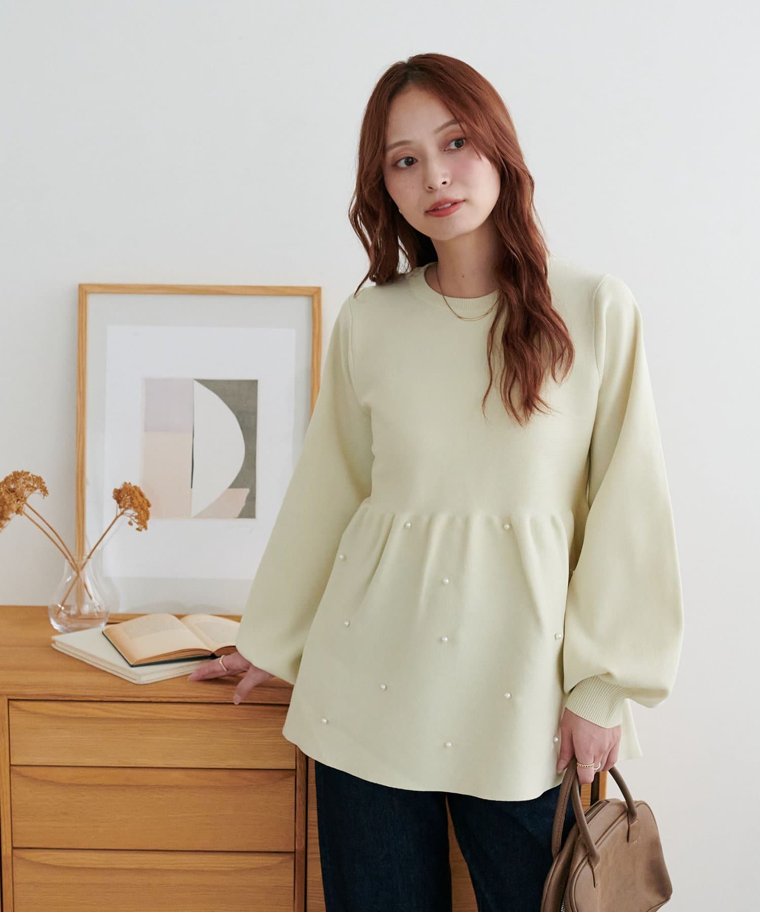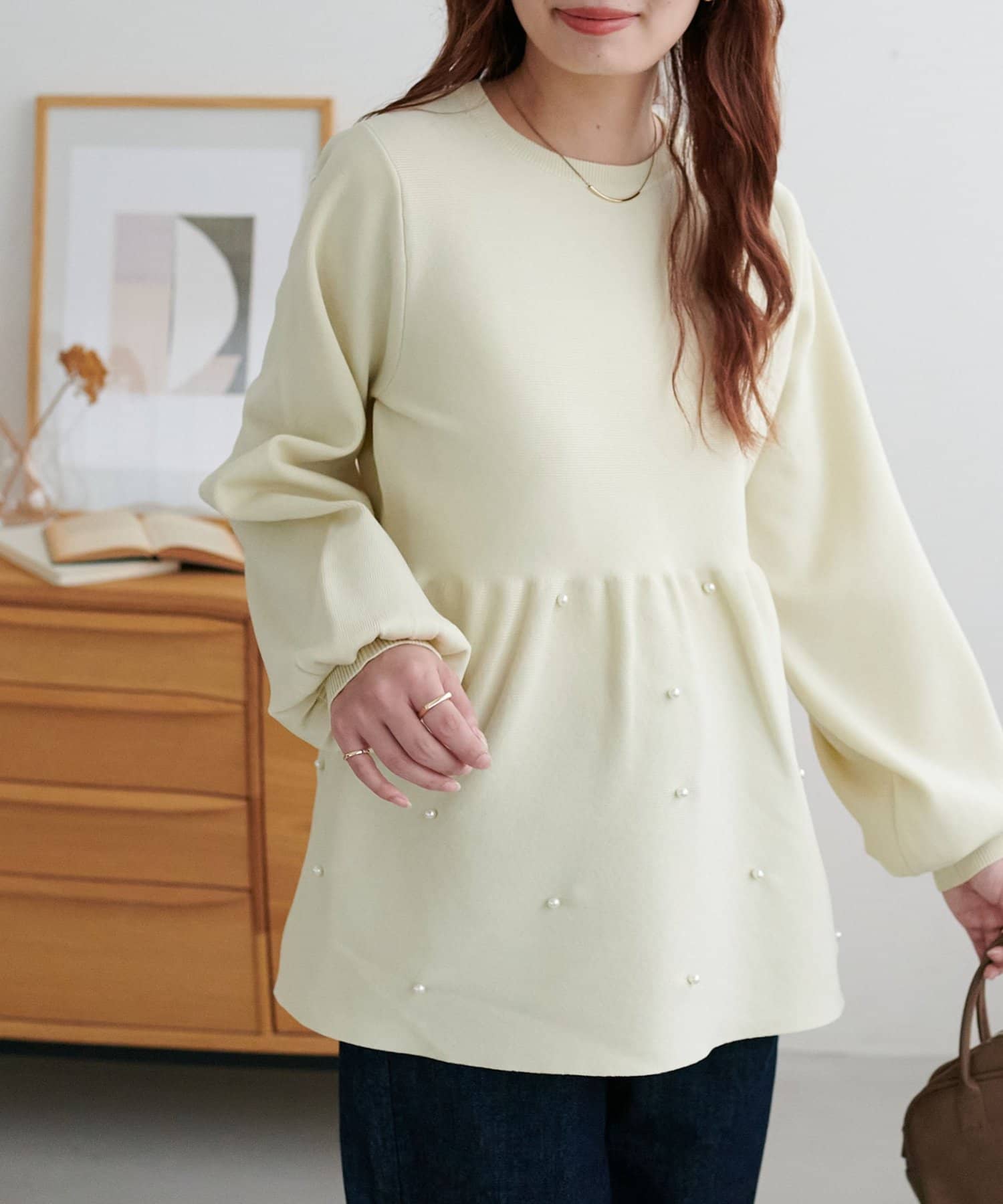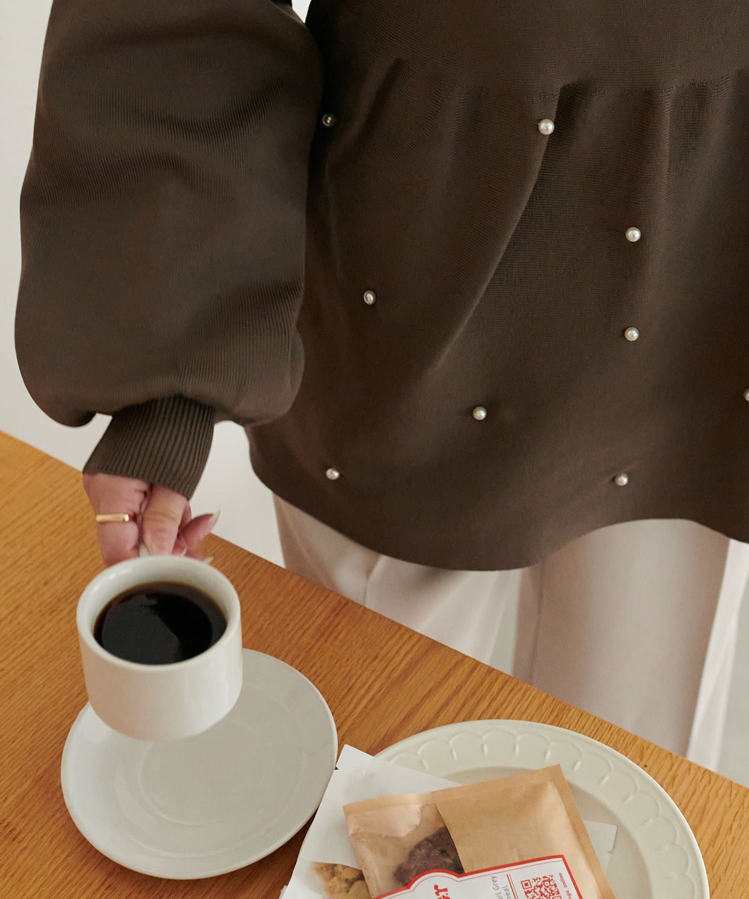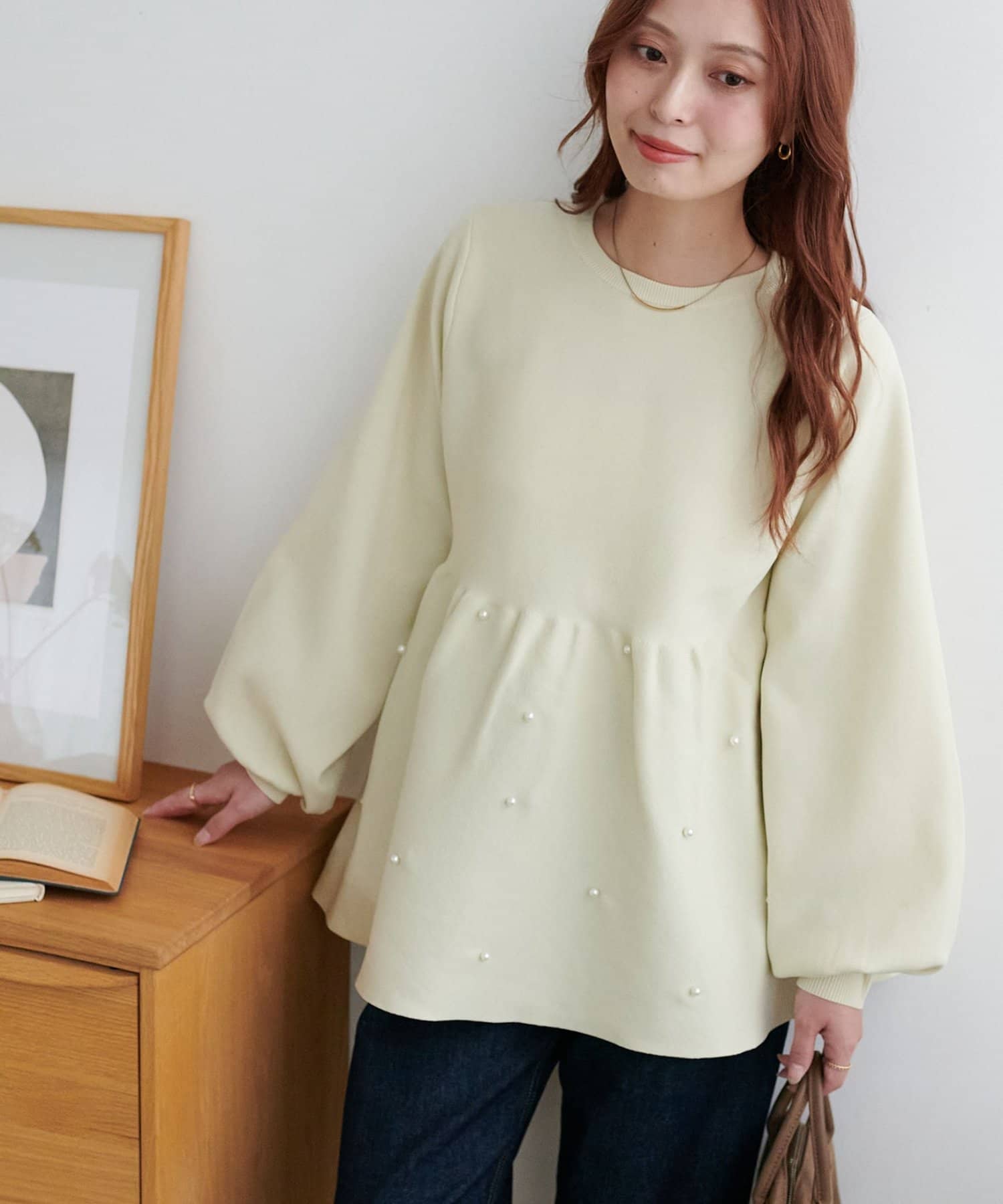 ゆるっとしたシルエットにパールのアクセントが映え、ボリューム袖が女性らしさを引き立ててくれます。