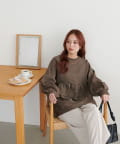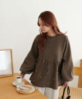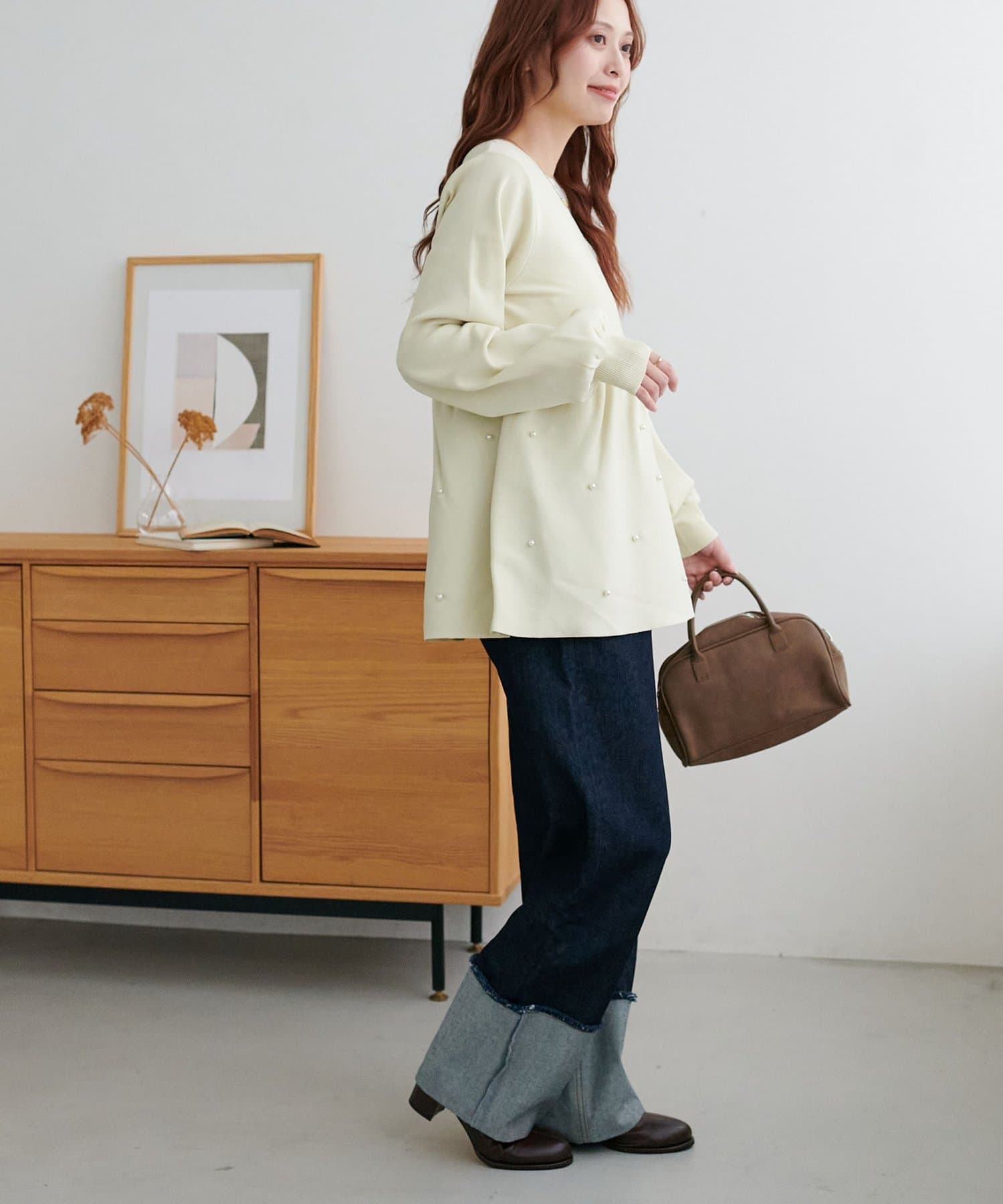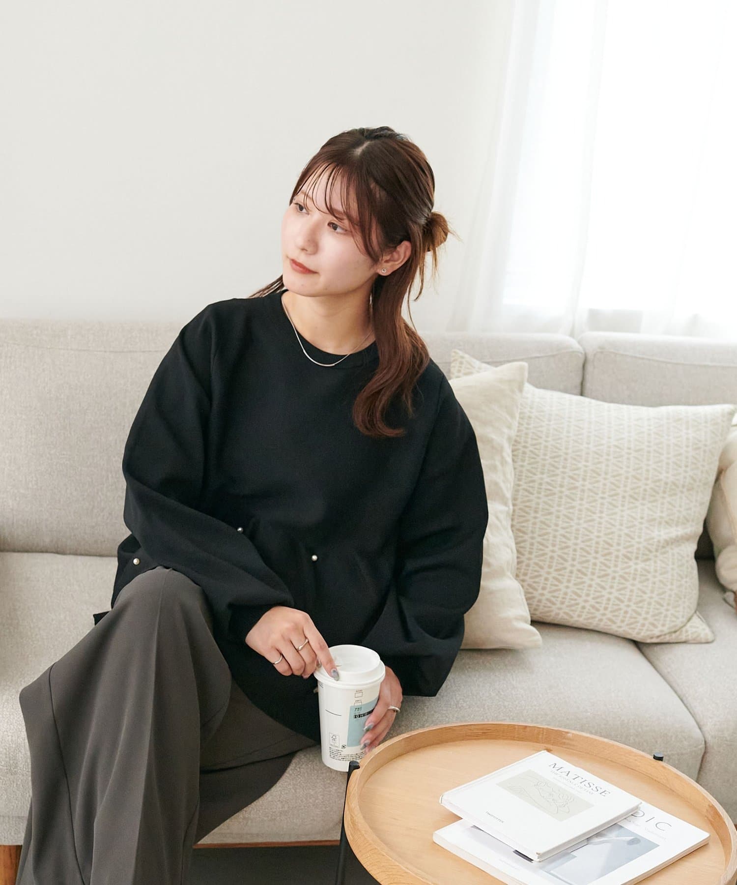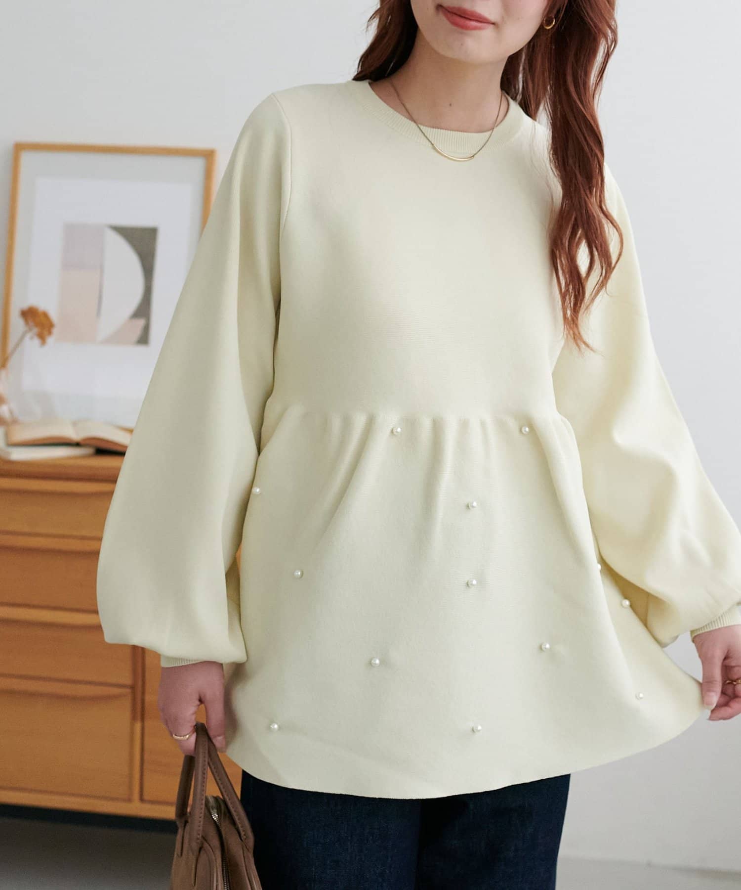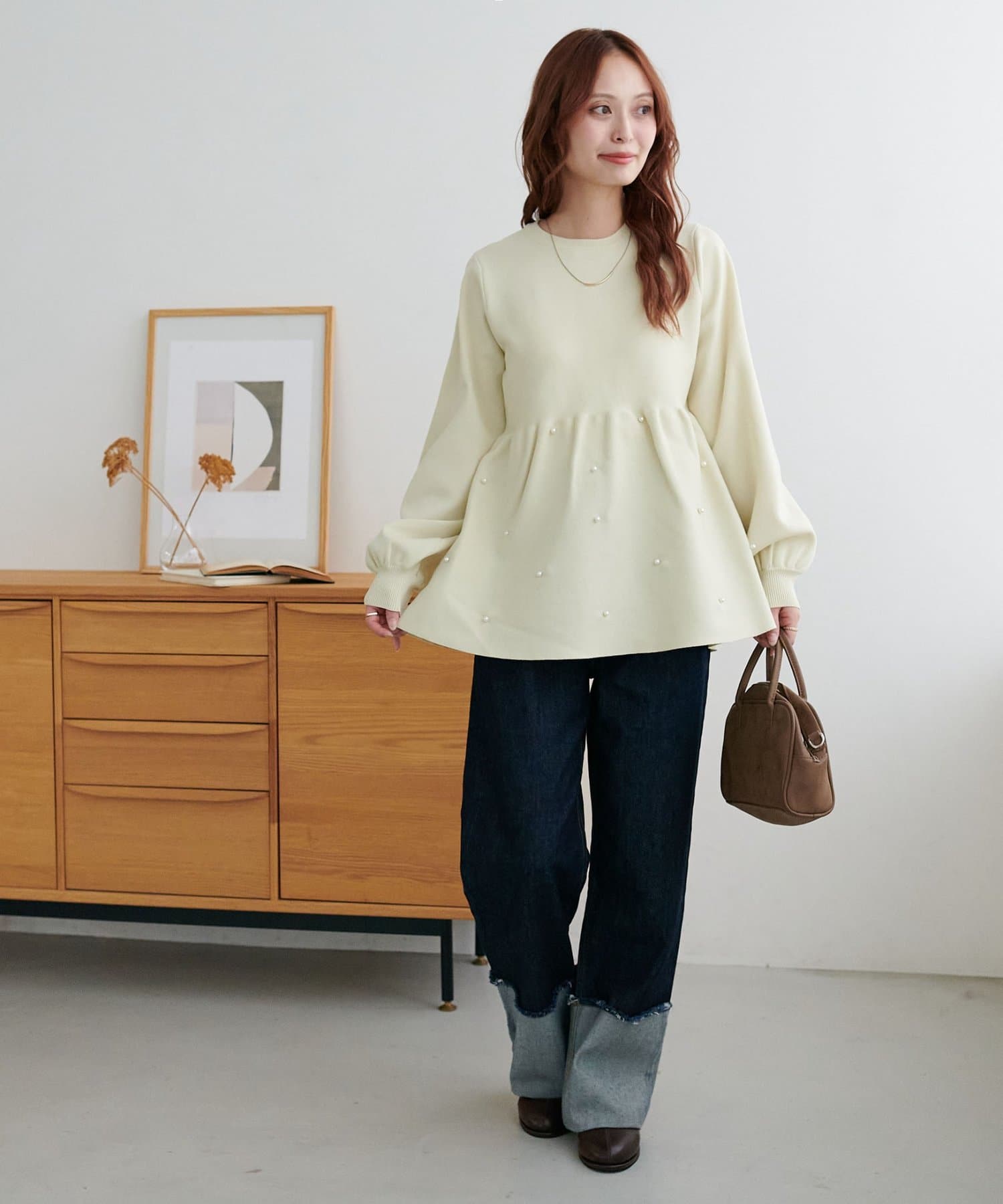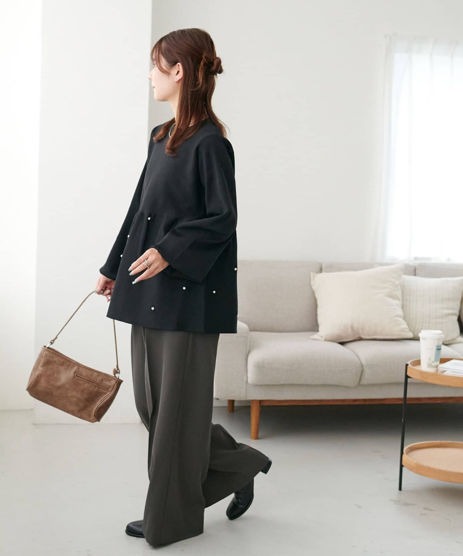 ゆるっとしたシルエットにパールのアクセントが映え、ボリューム袖が女性らしさを引き立ててくれます。