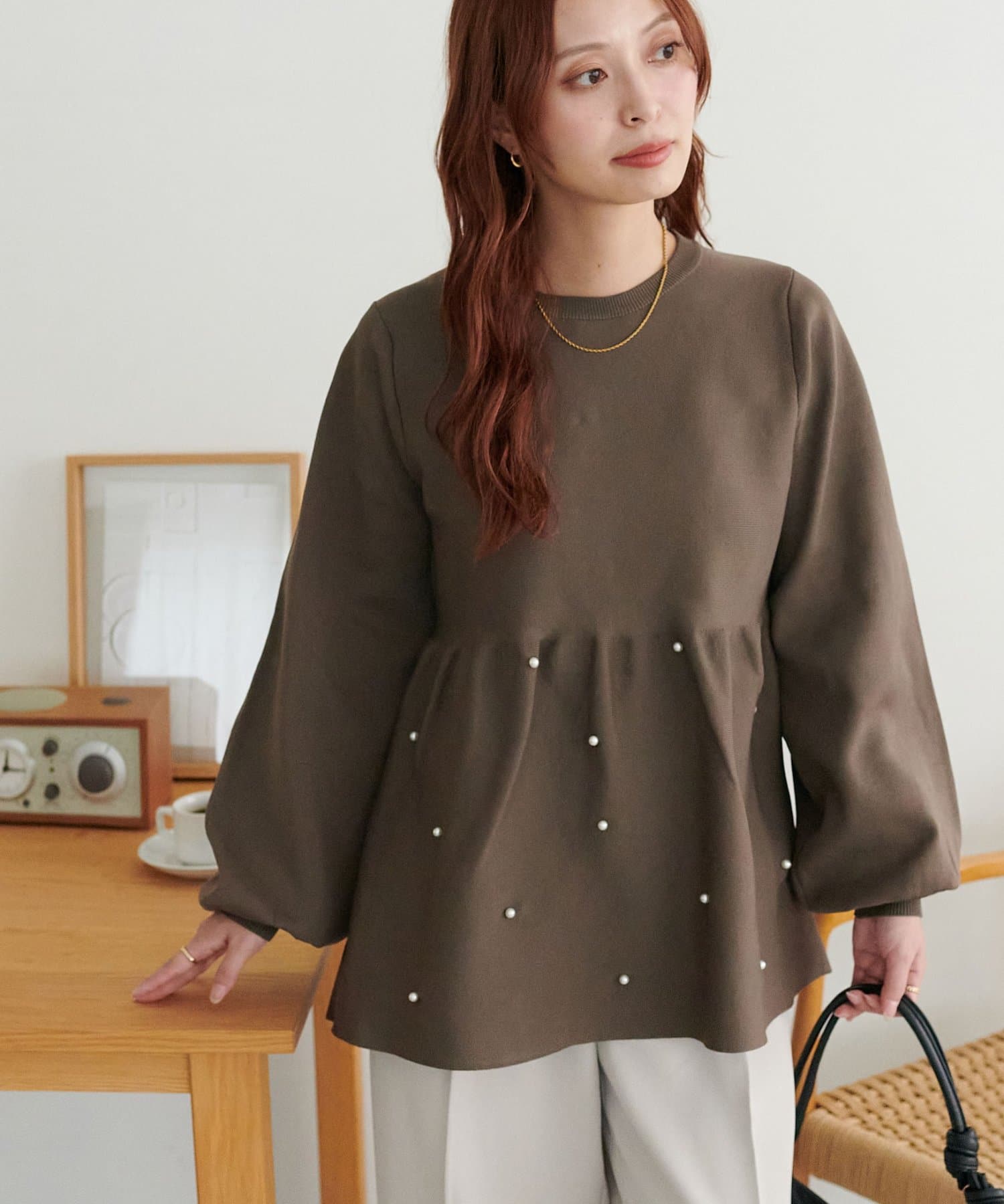 華やかさと女性らしさをプラスするパール付きペプラムニット
