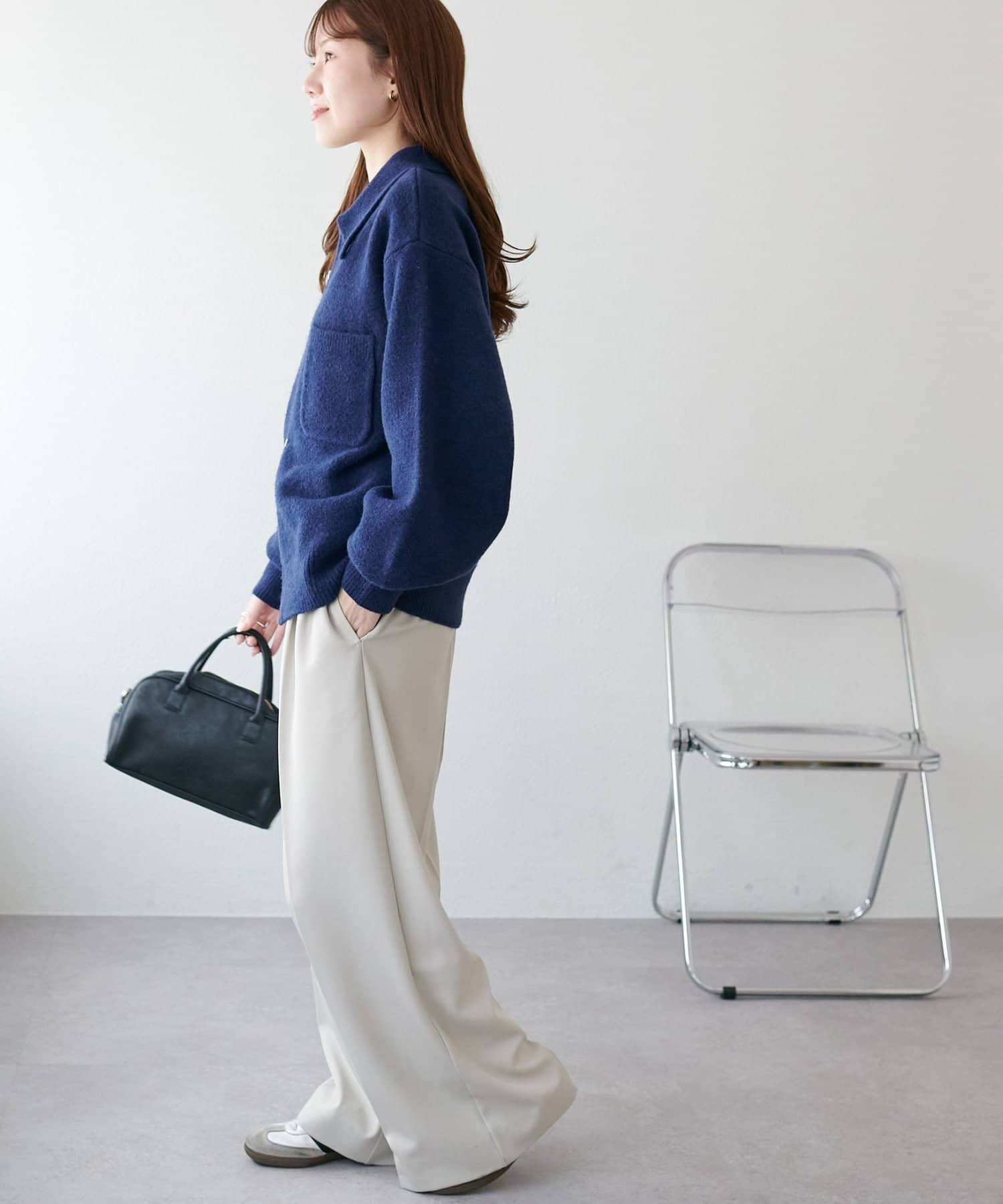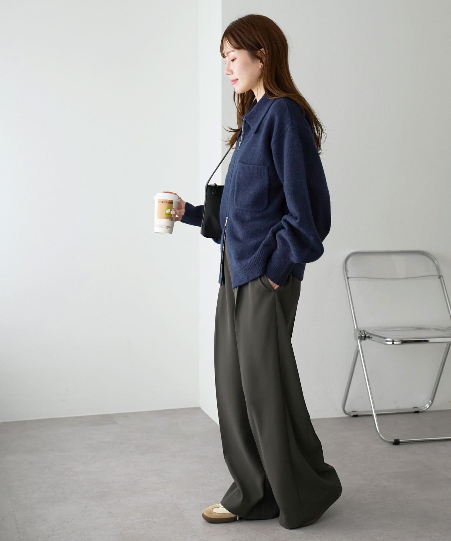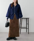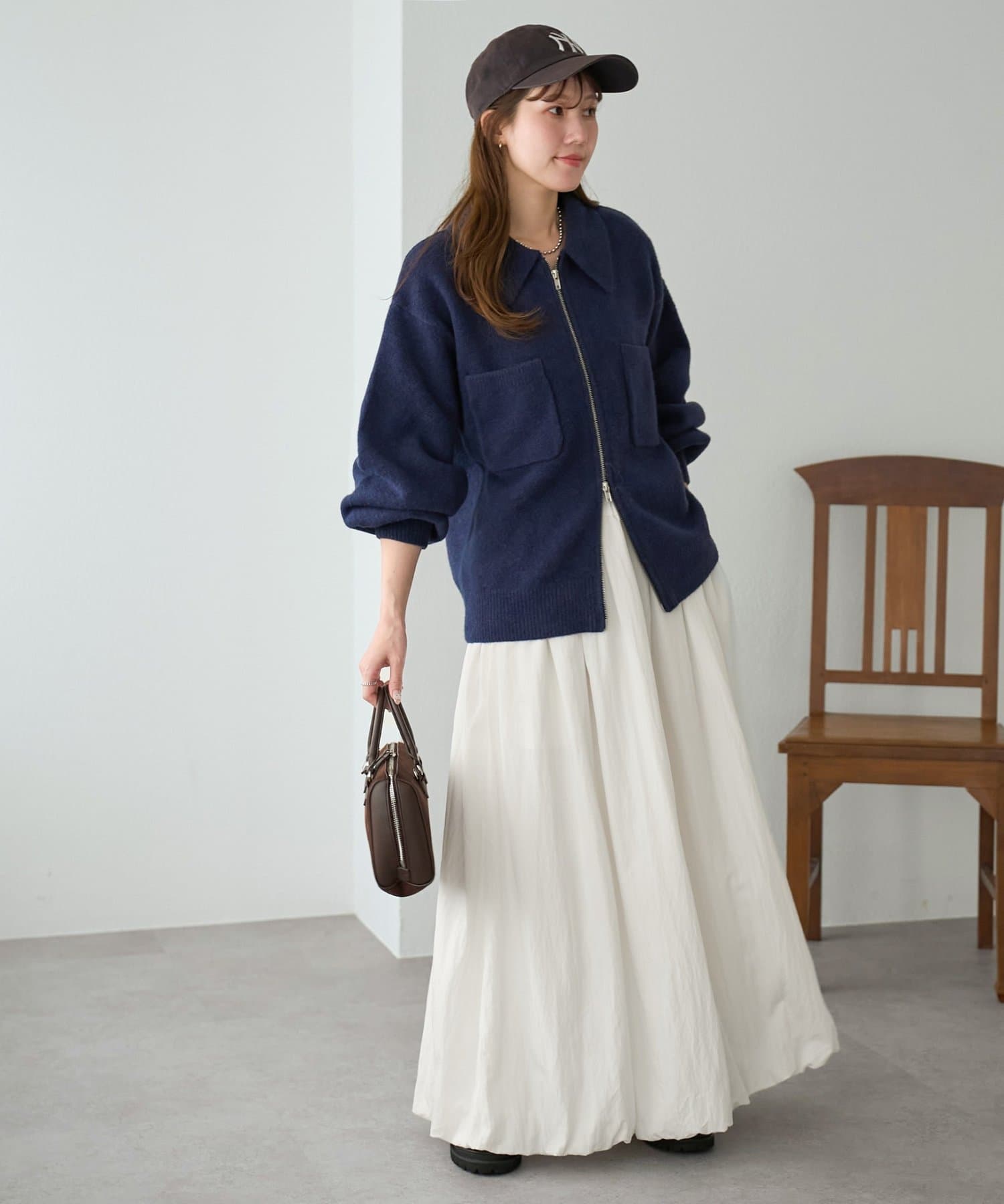 ジップの裾を開けてワイドパンツやボリューム感のあるスカートを合わせても抜け感のあるコーデに!