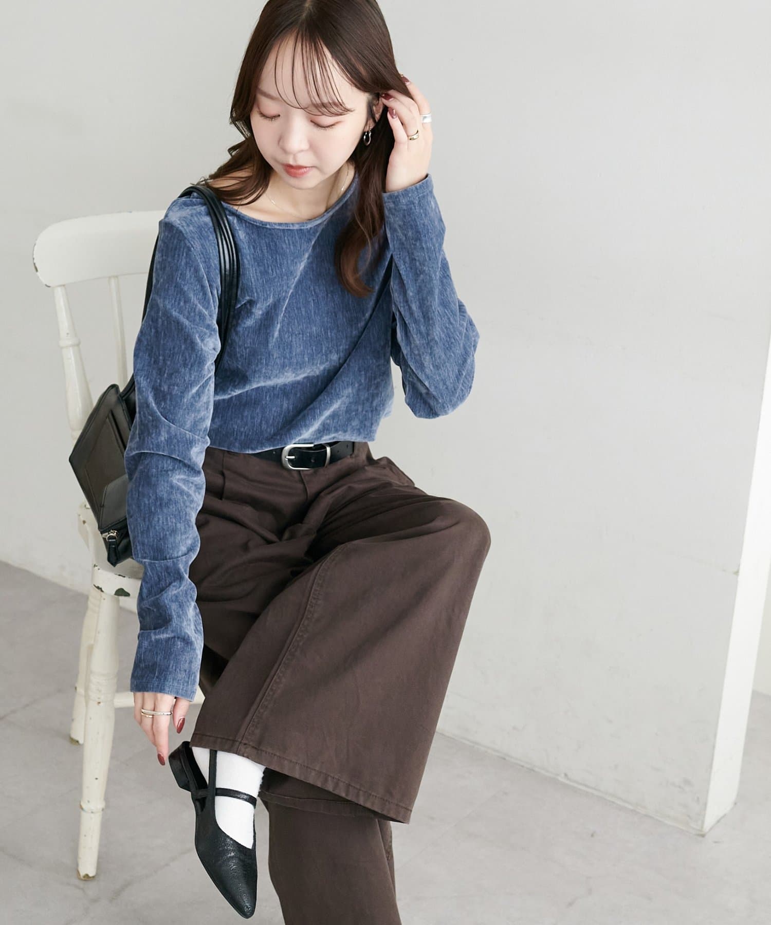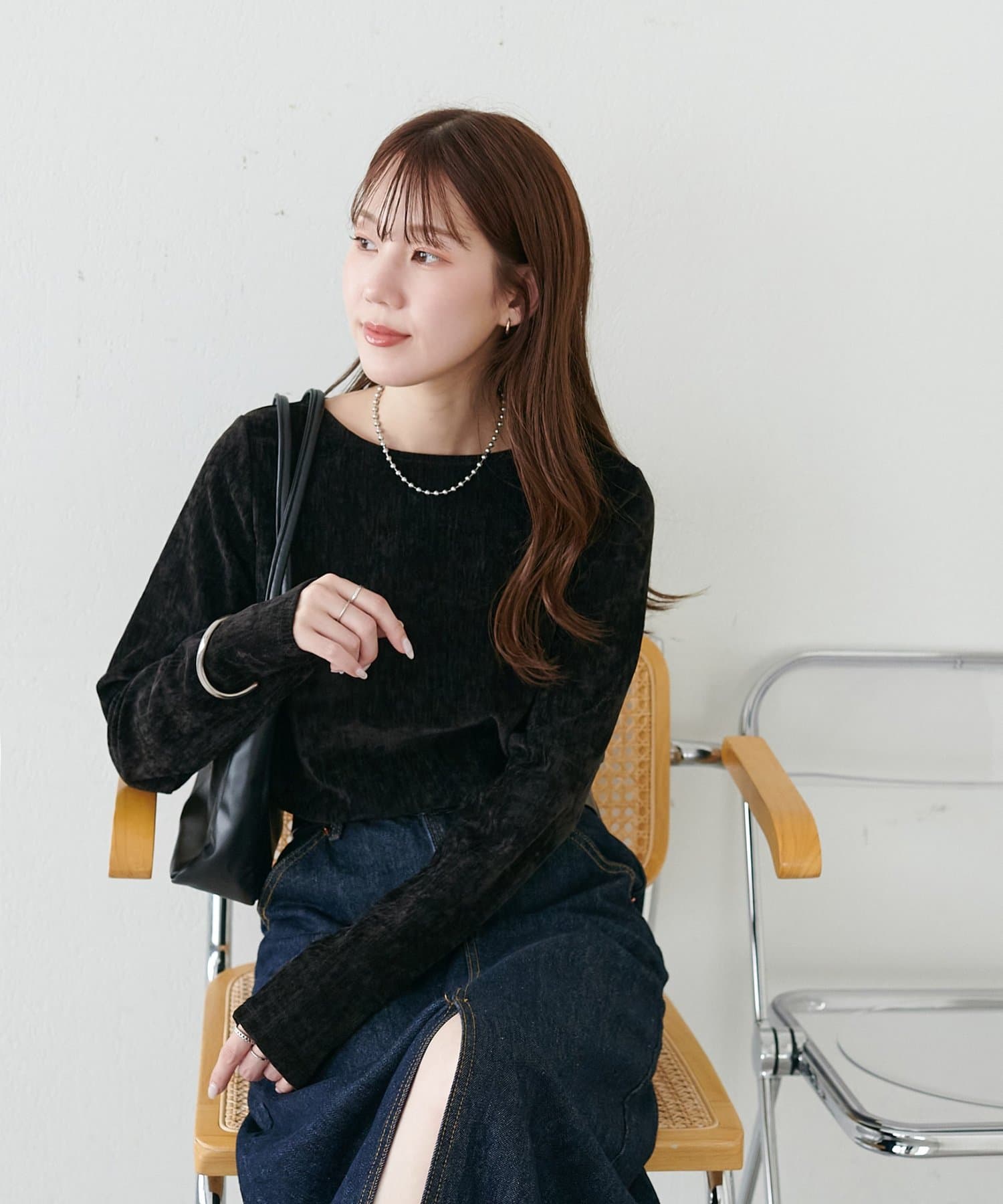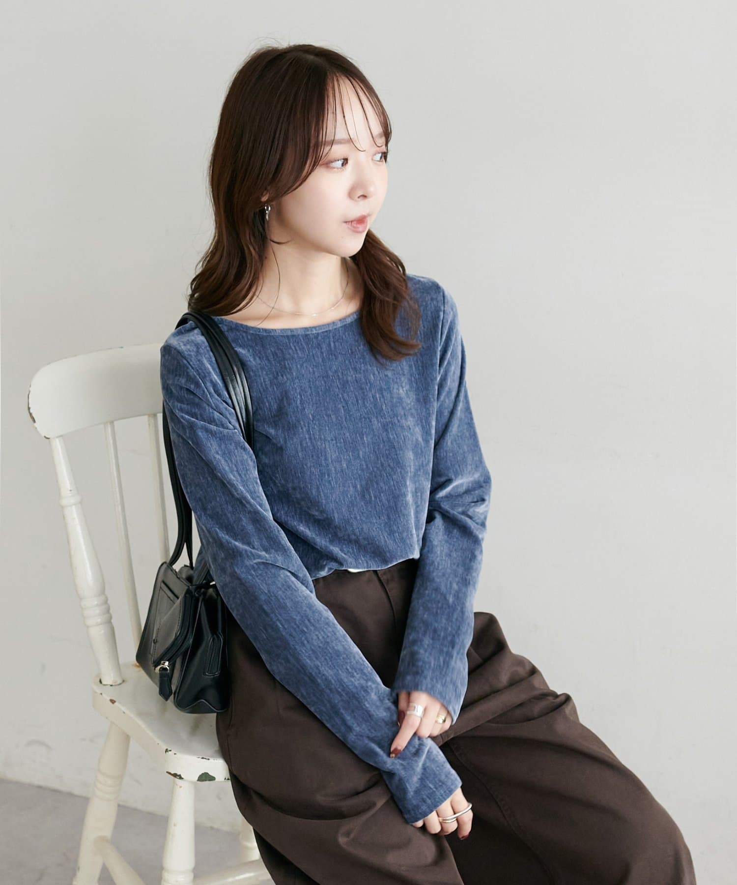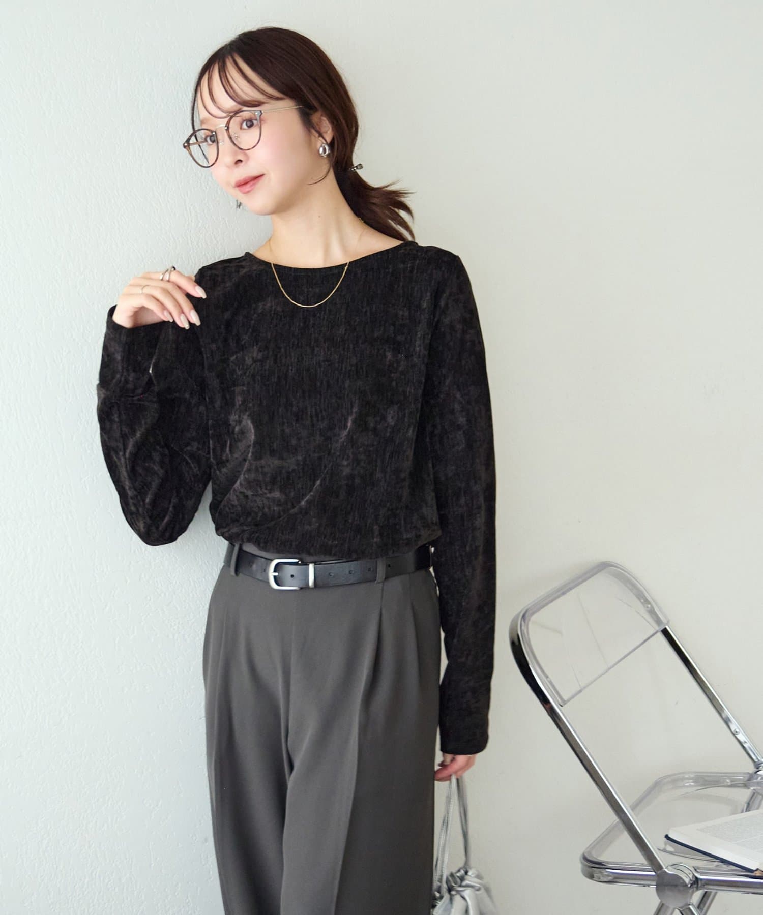 シンプルながらも上品な光沢を放つベロア素材を使用したプルオーバー。