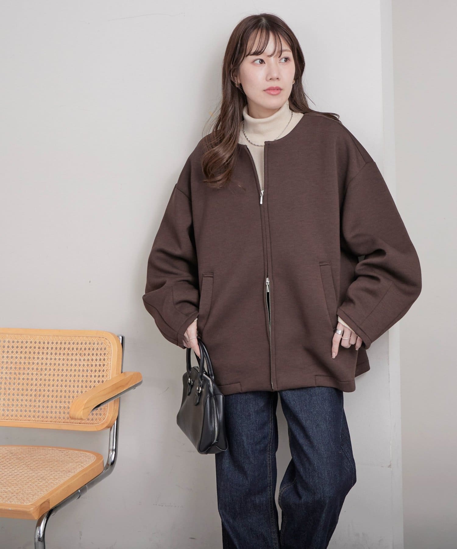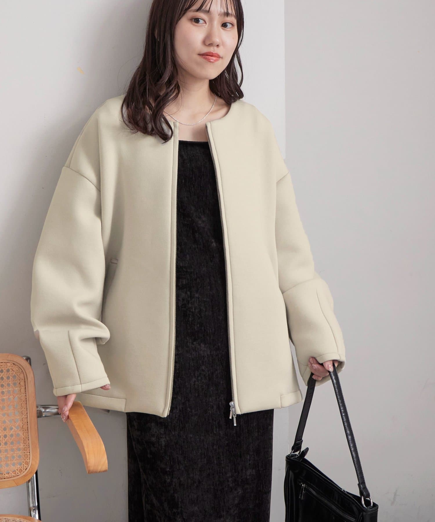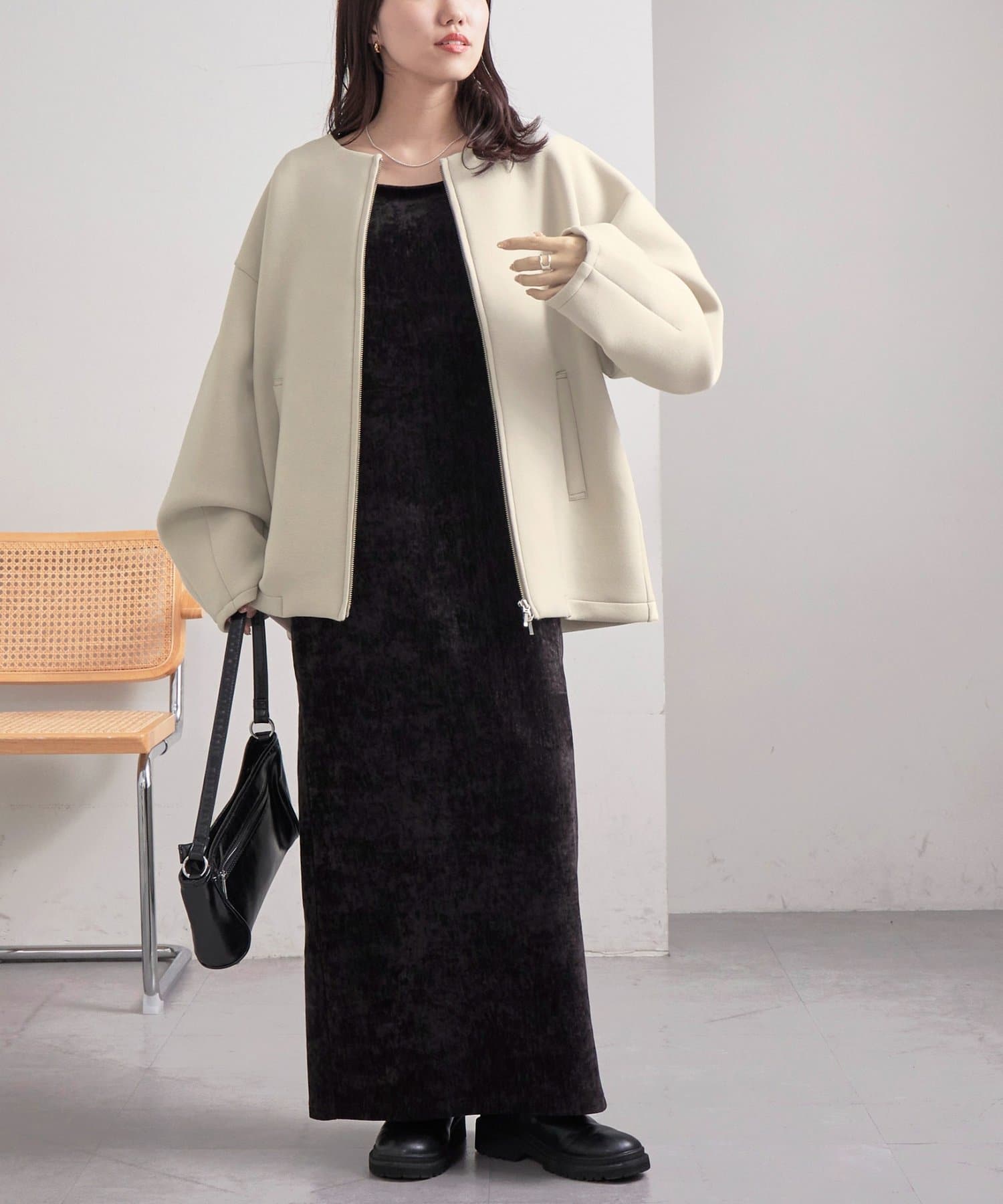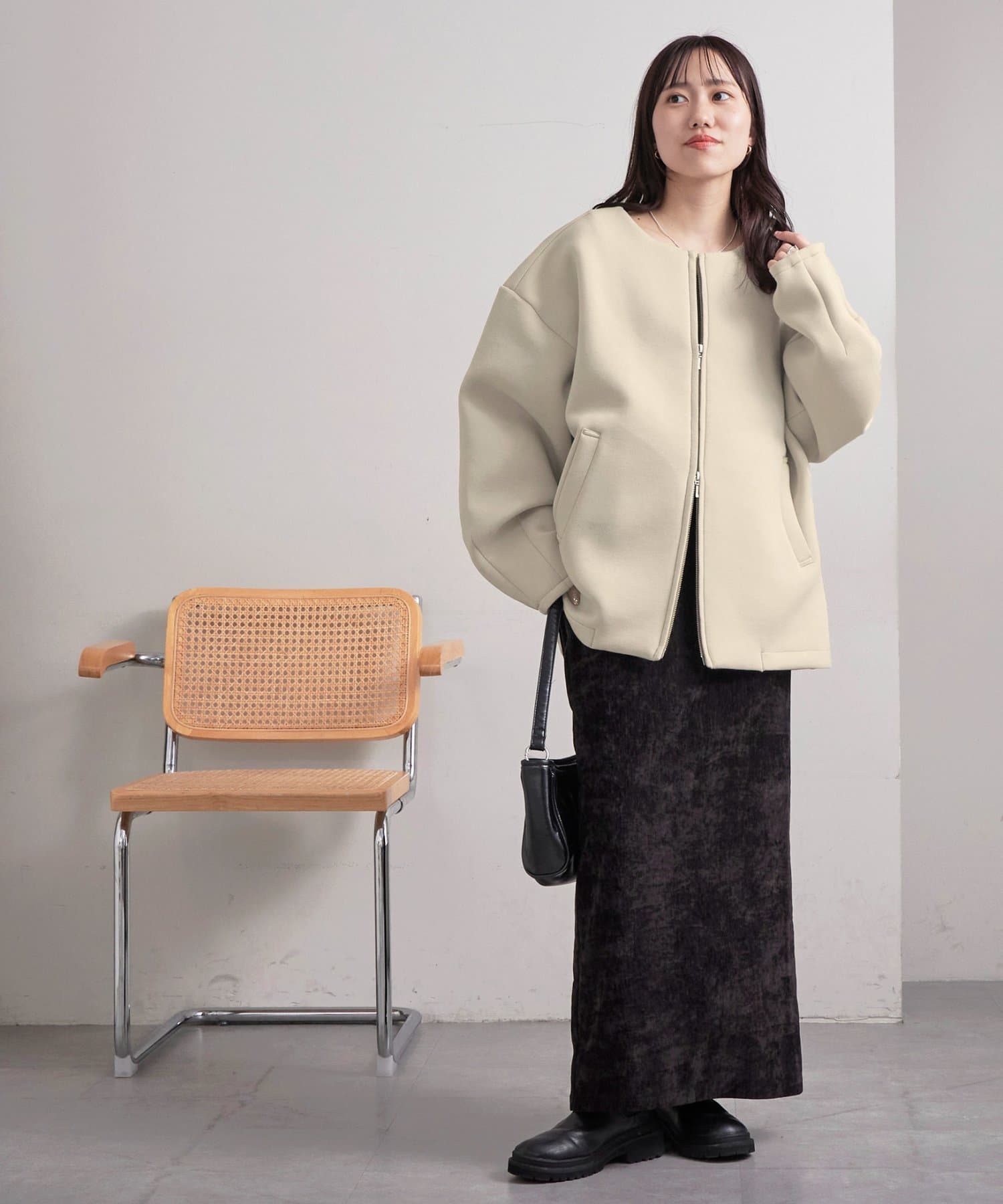 ボトムスはダブルジップデザインなので、ナロースカートやスラックスパンツだけではなくボリューム感のあるスカートやワイドパンツまで素敵に合わせることができます。