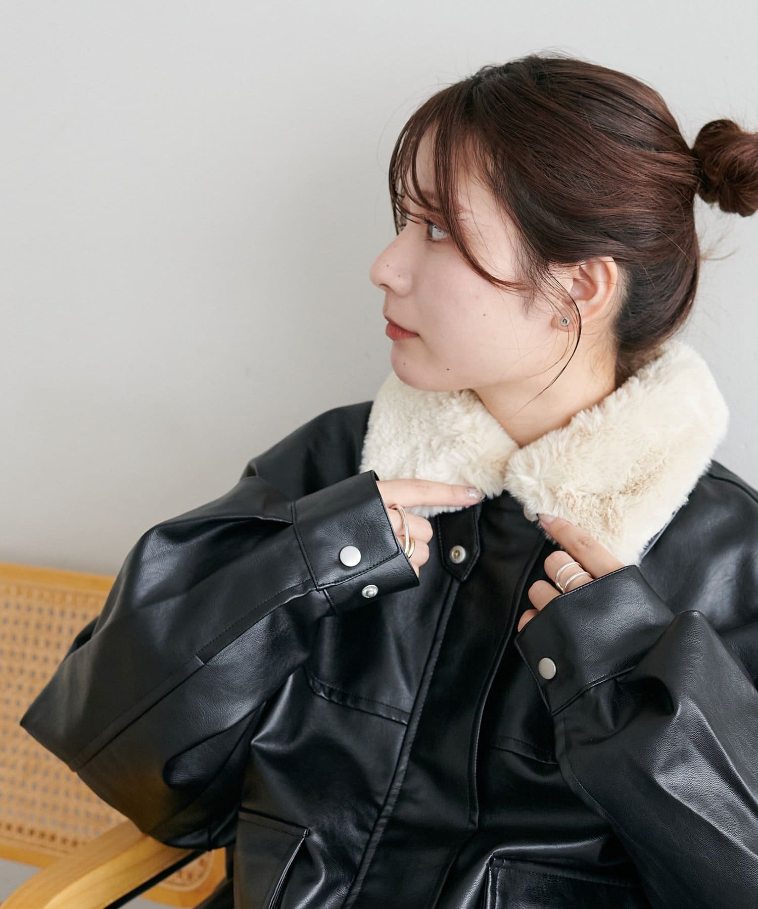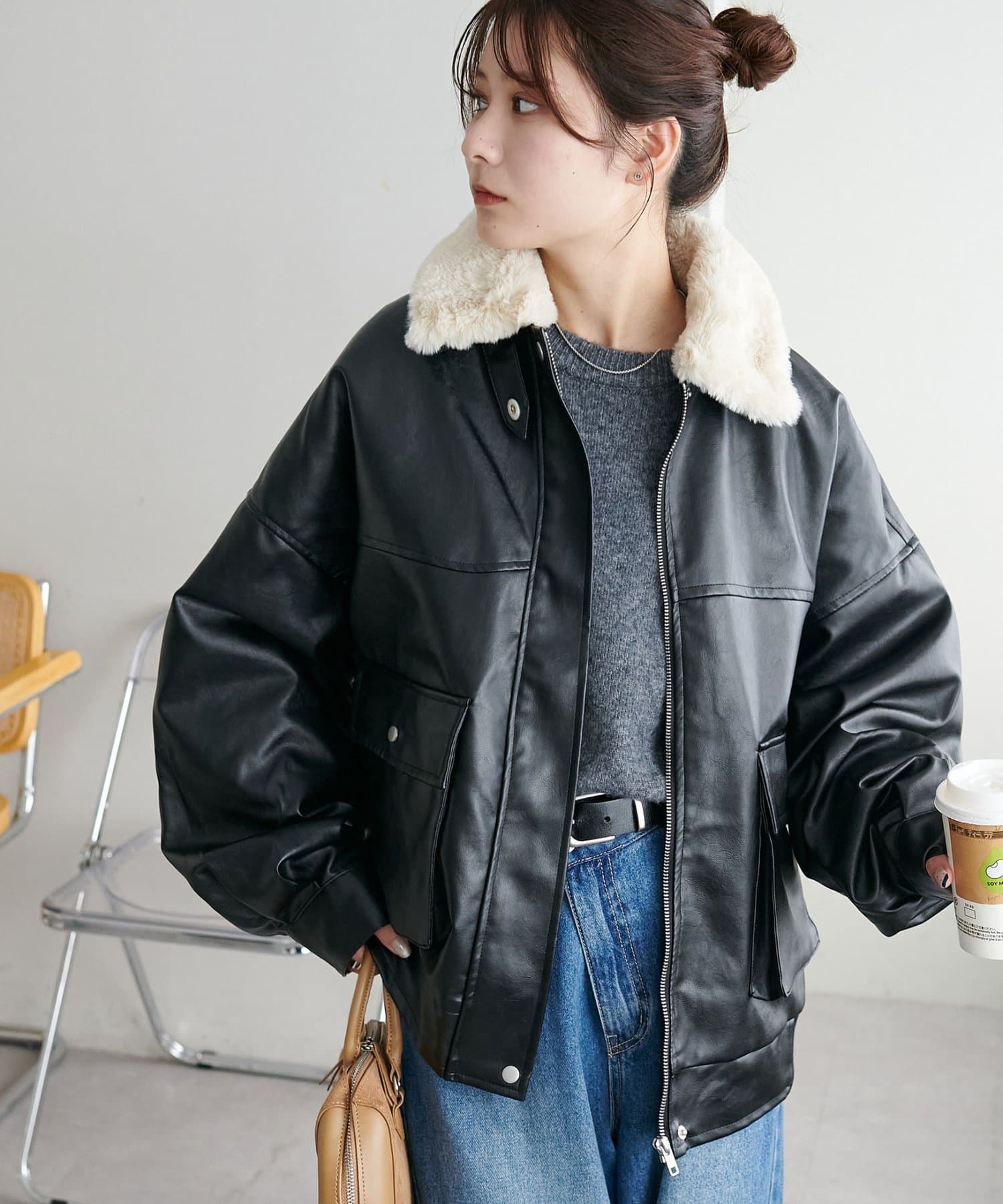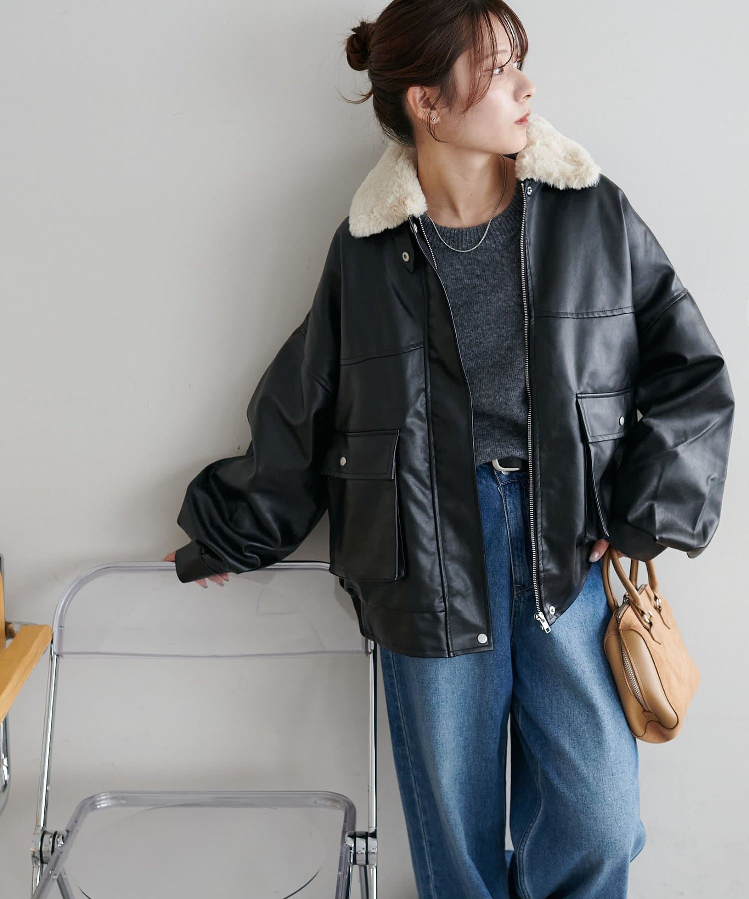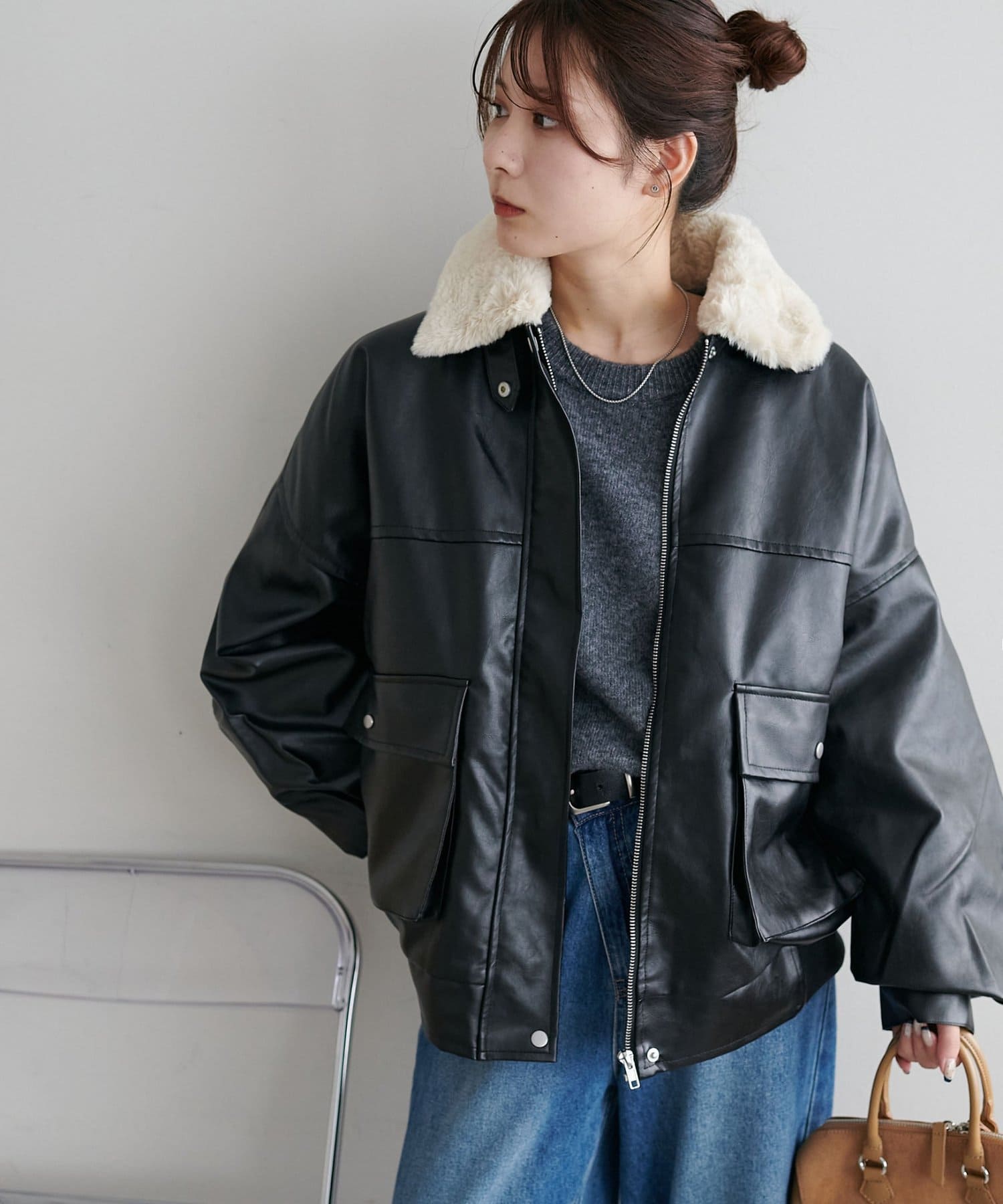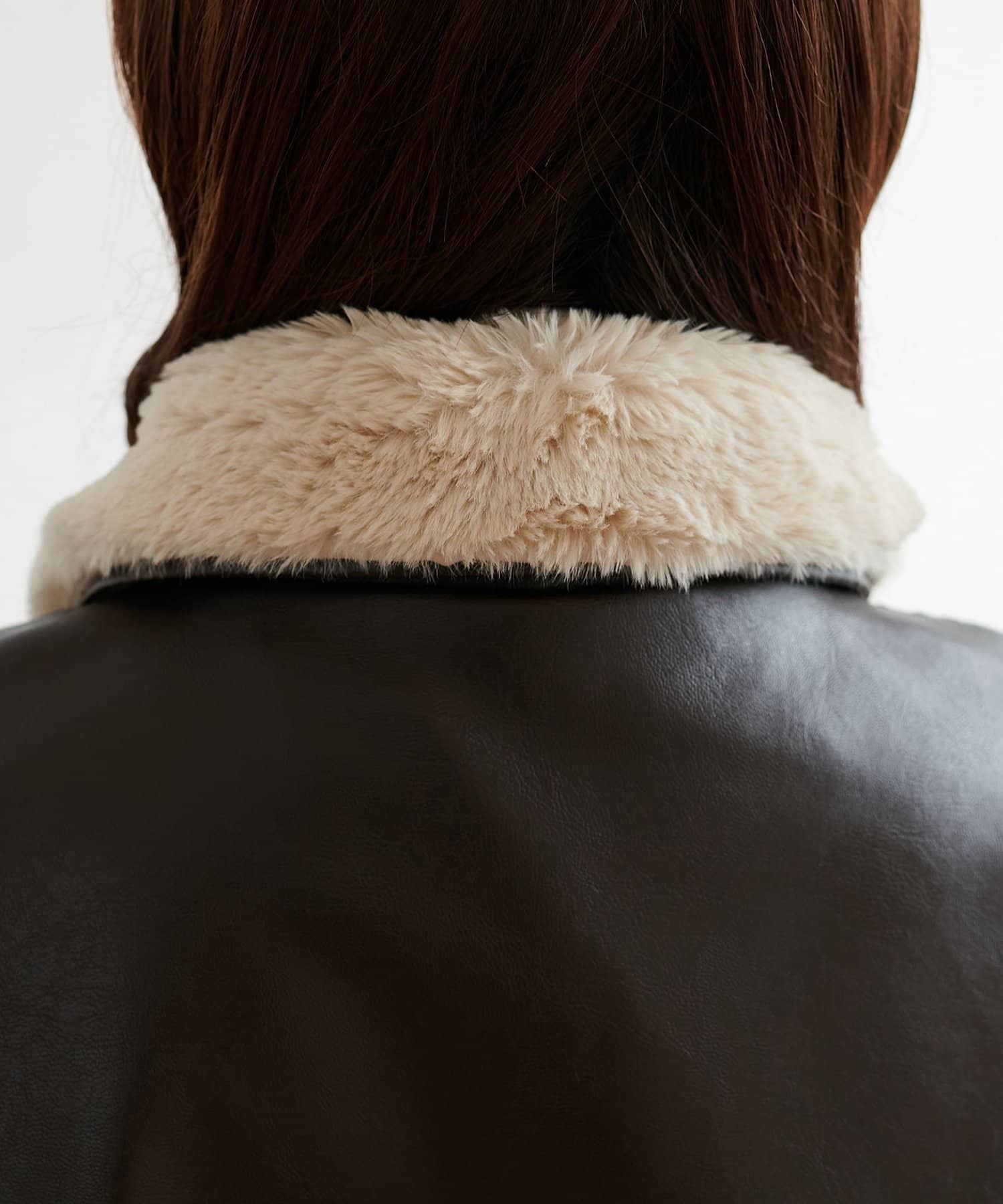 ふわふわのファー素材の襟が目を引くフェイクレザーフライトジャケット。