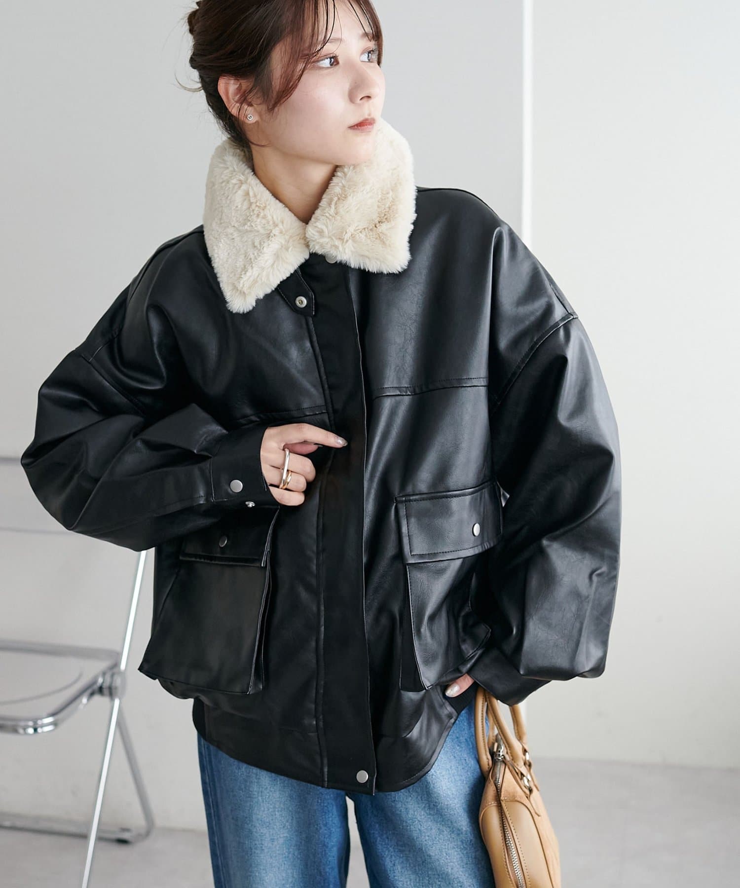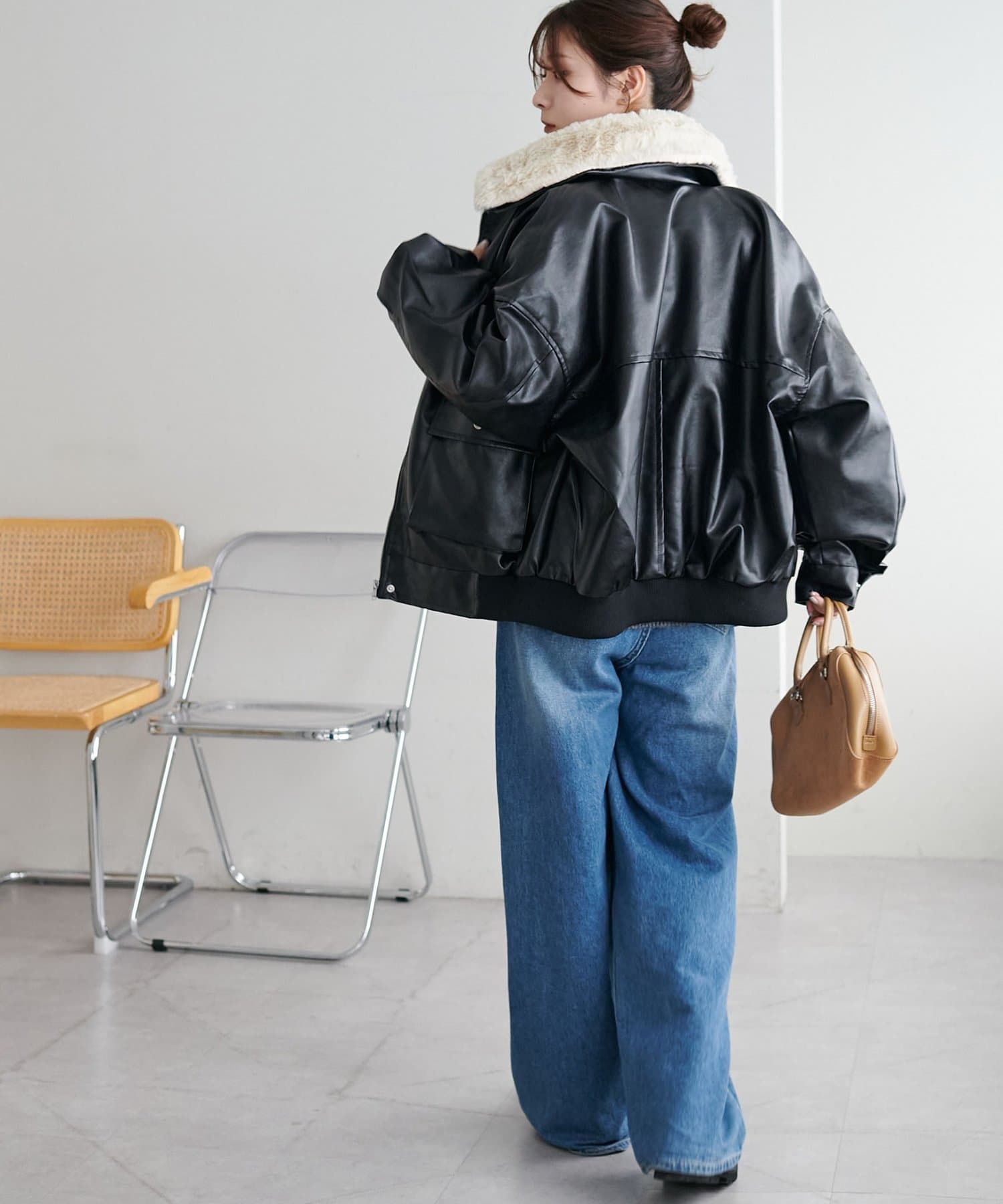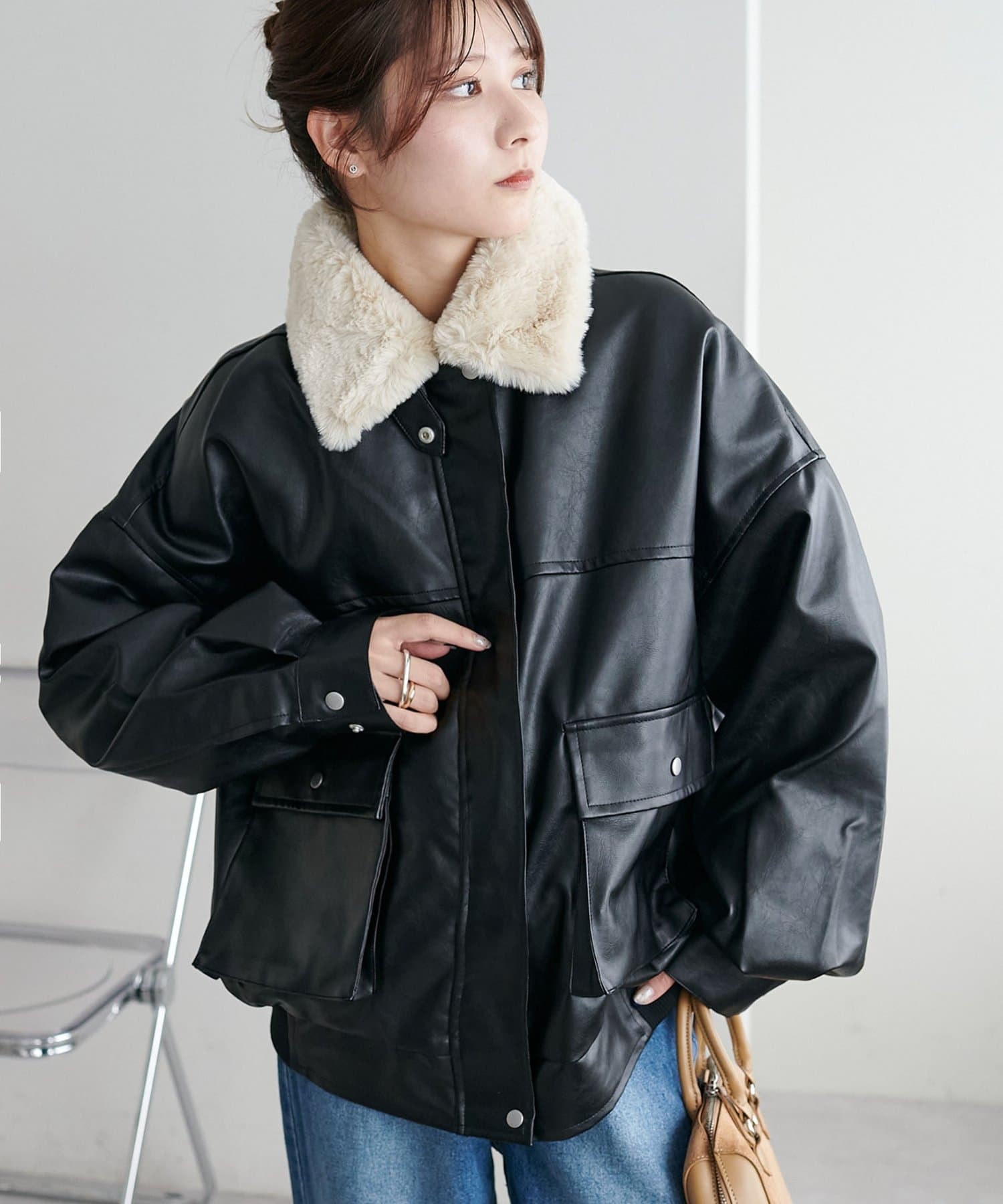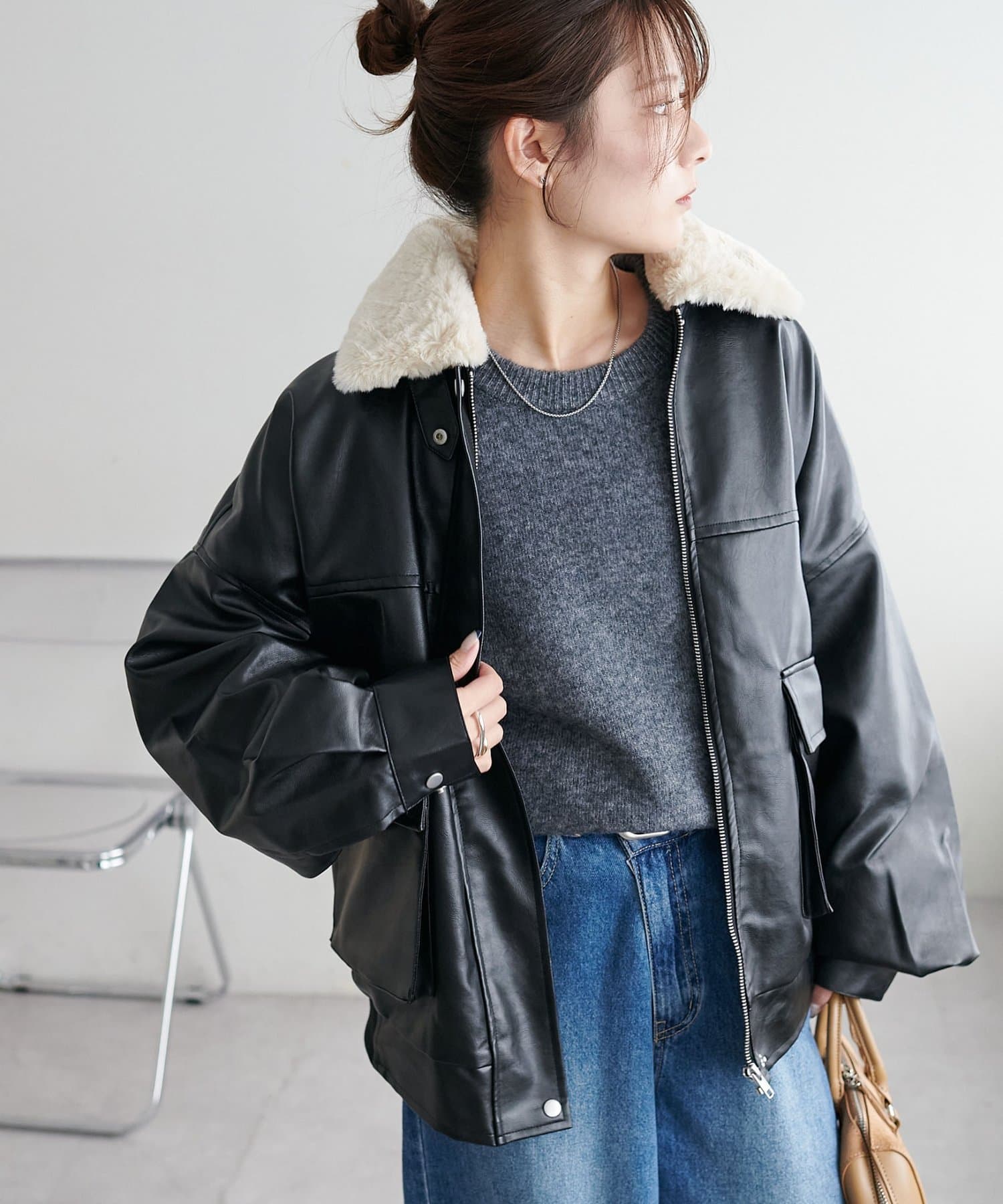 ふわふわのファー素材の襟が目を引くフェイクレザーフライトジャケット。
