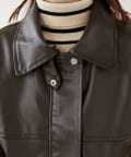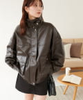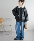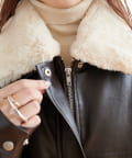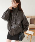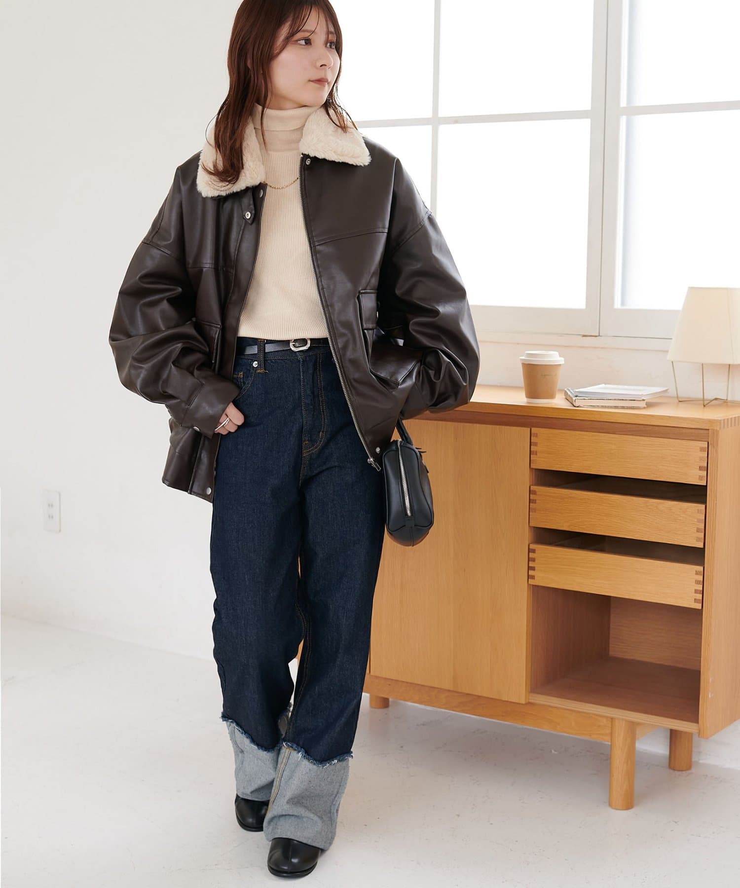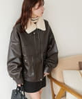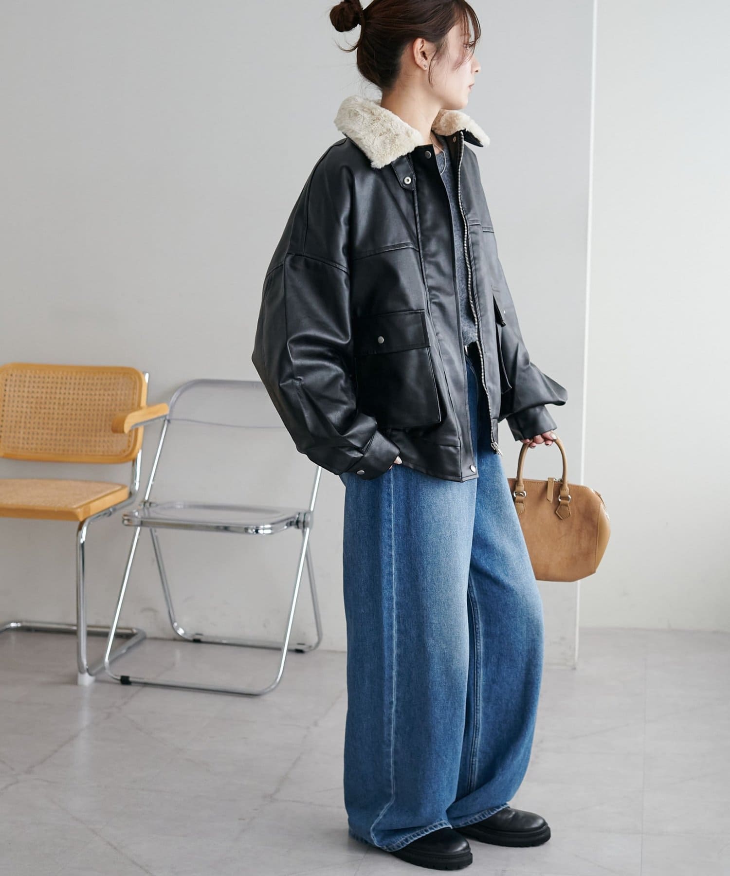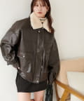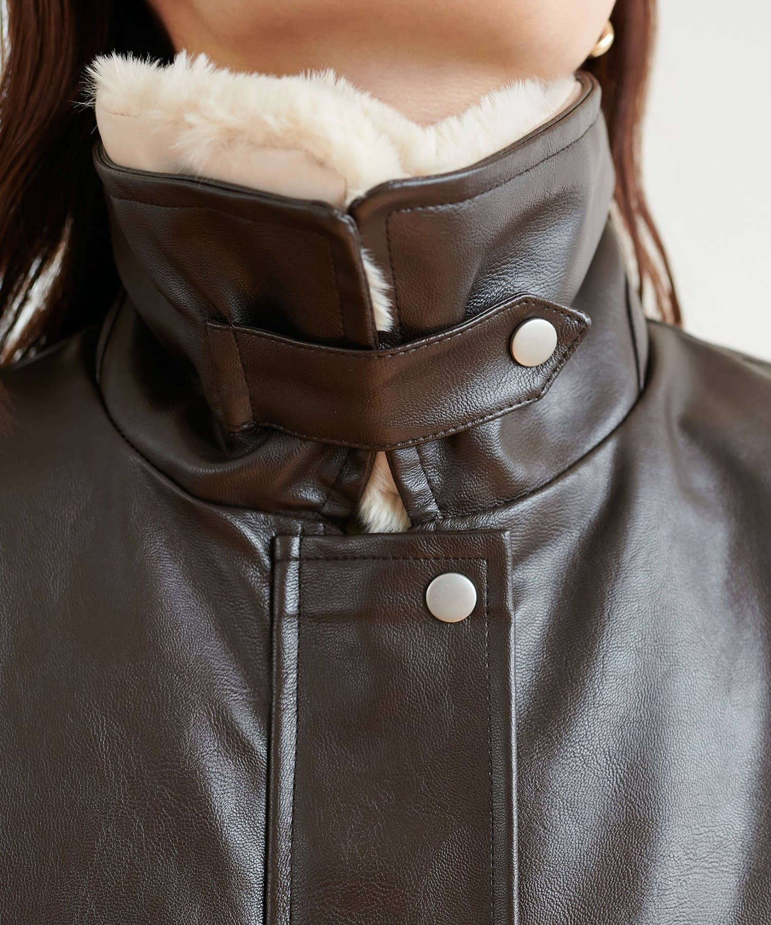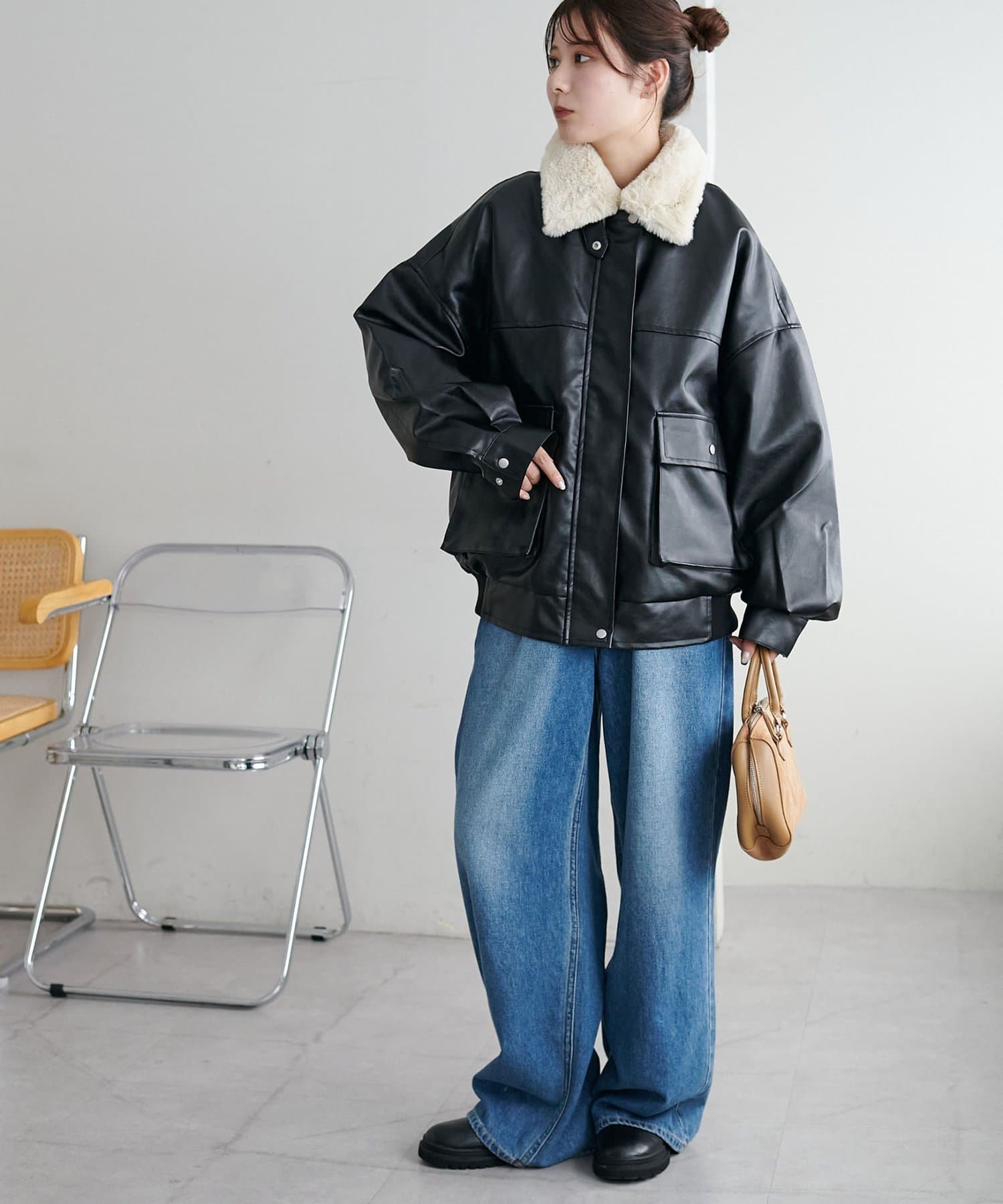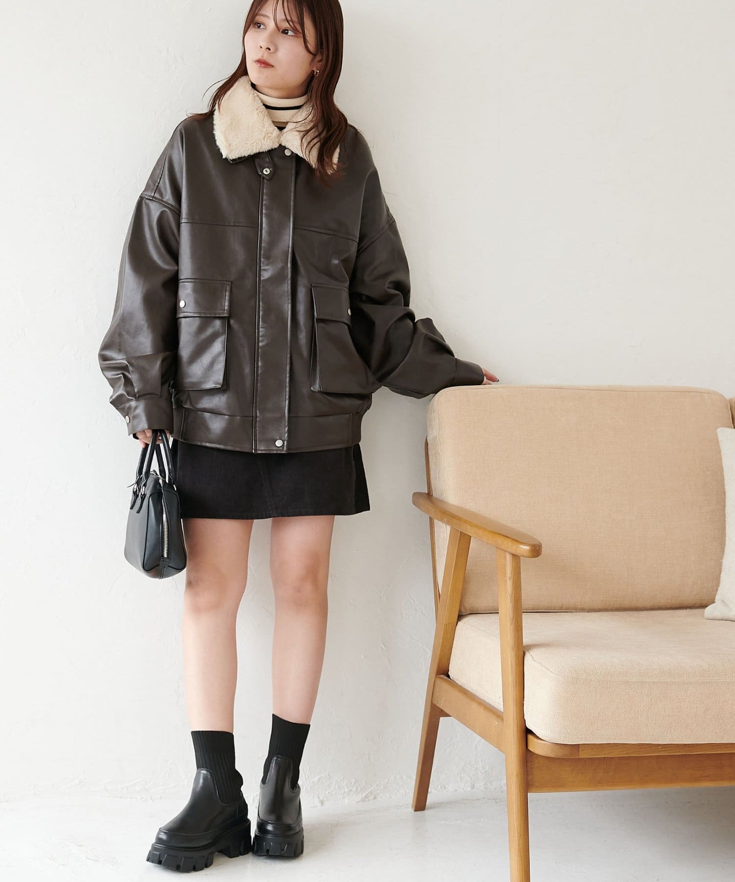 ふわふわのファー素材の襟が目を引くフェイクレザーフライトジャケット。