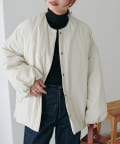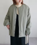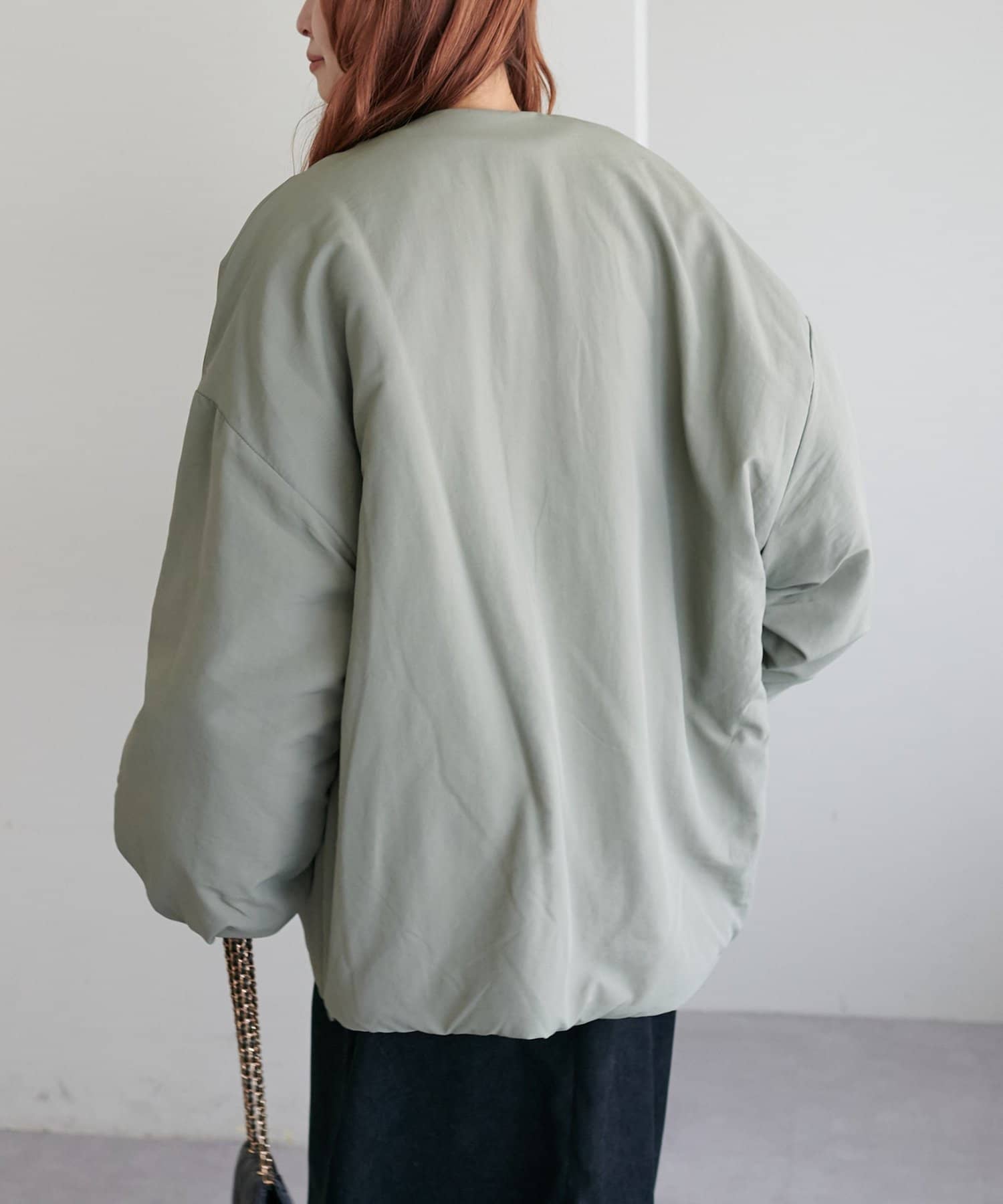 ノーカラーデザインが顔周りをすっきりと見せてくれるジャケット。