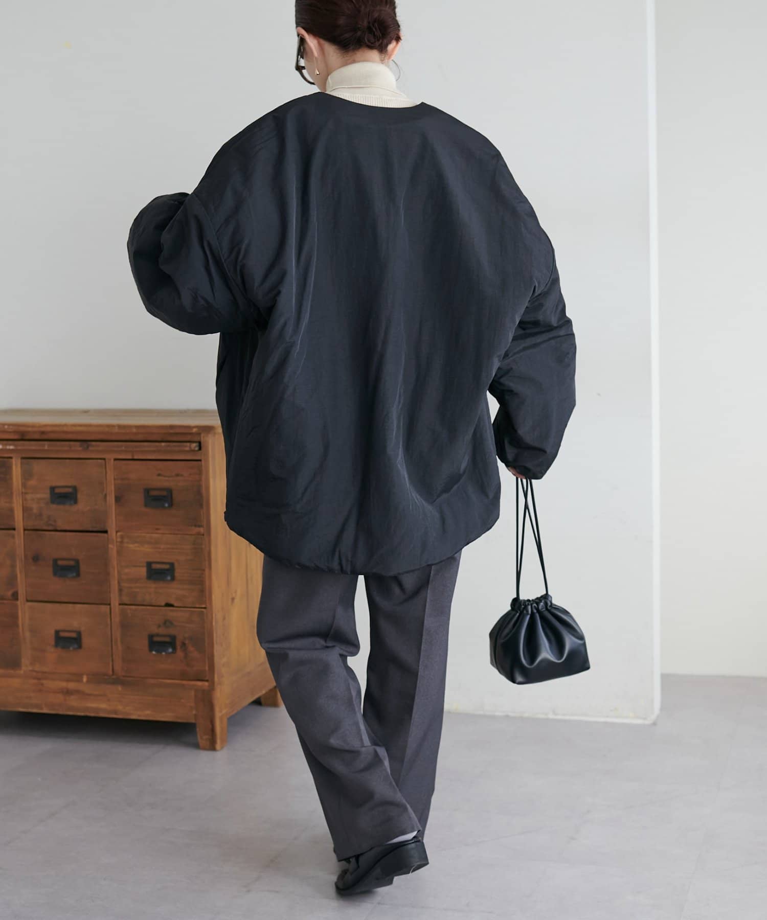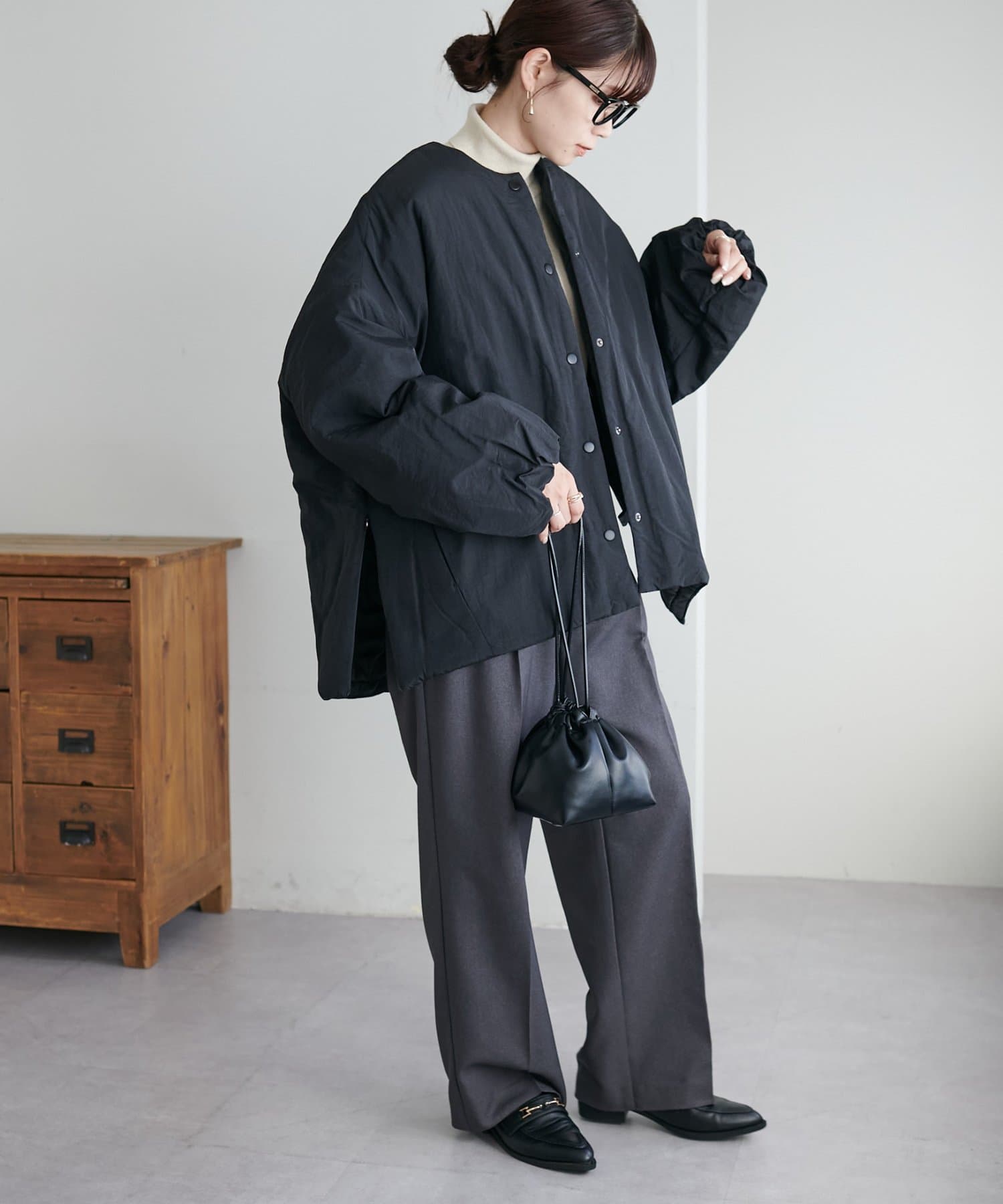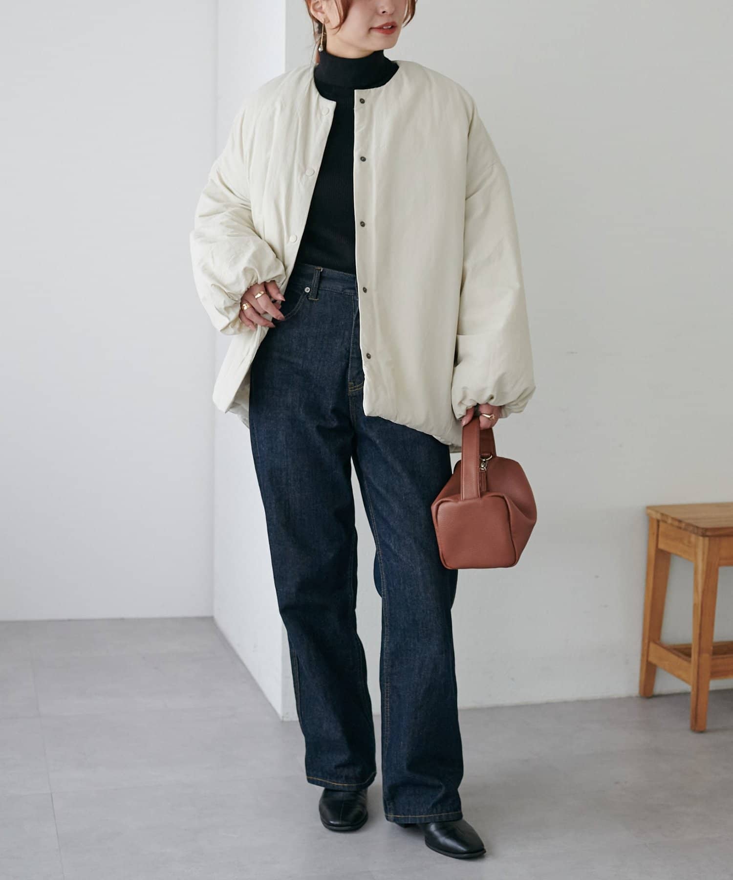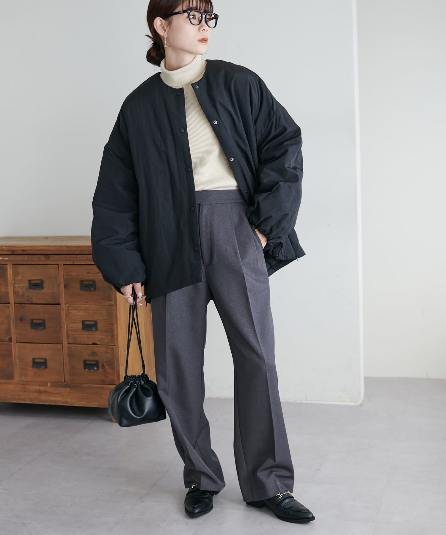デニムやスラックスを合わせて大人カジュアルなコーデも、スカートやワンピースに合わせてフェミニンなコーデも。ノーカラーデザインなのでハイネックのトップスとの相性も抜群!