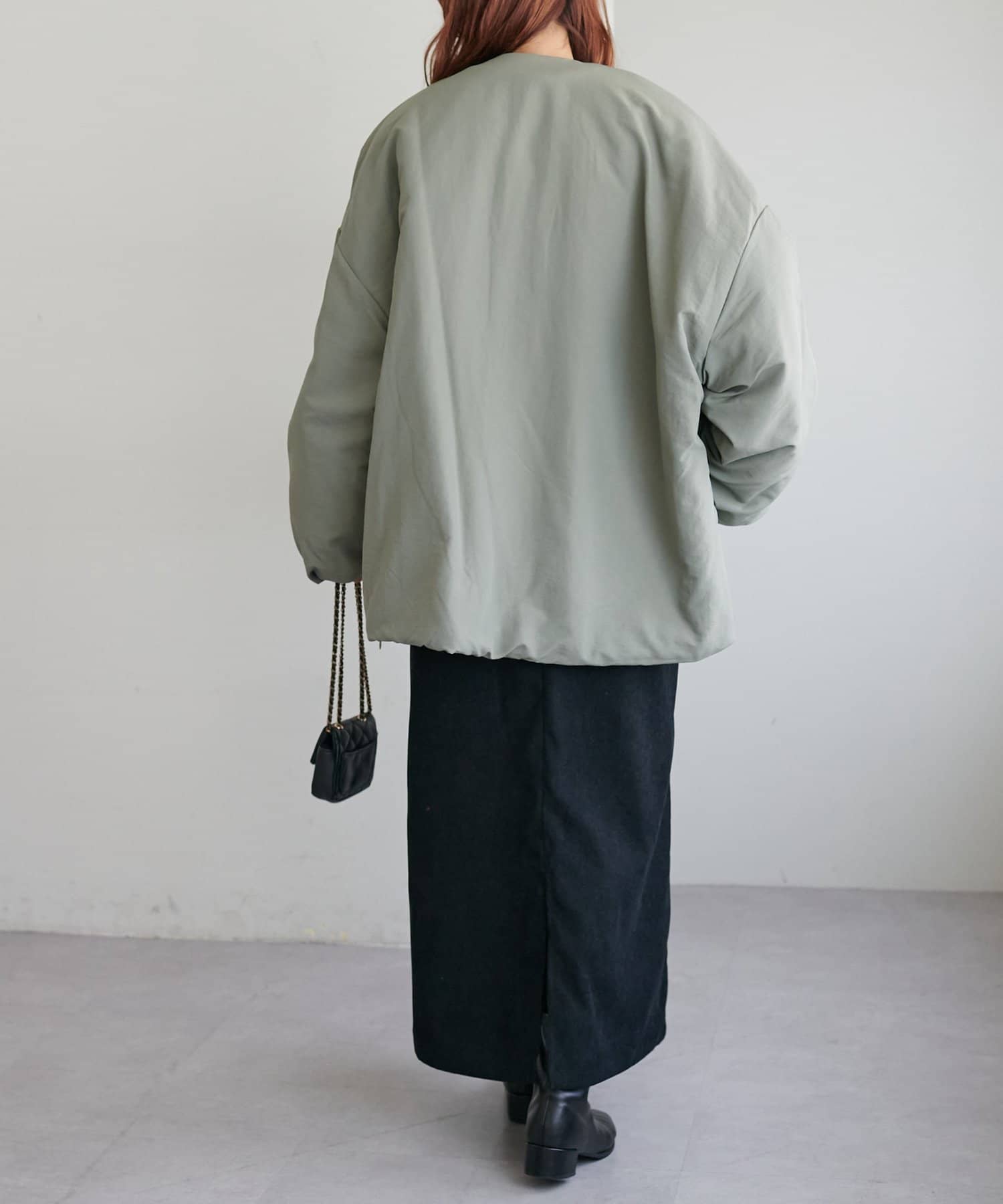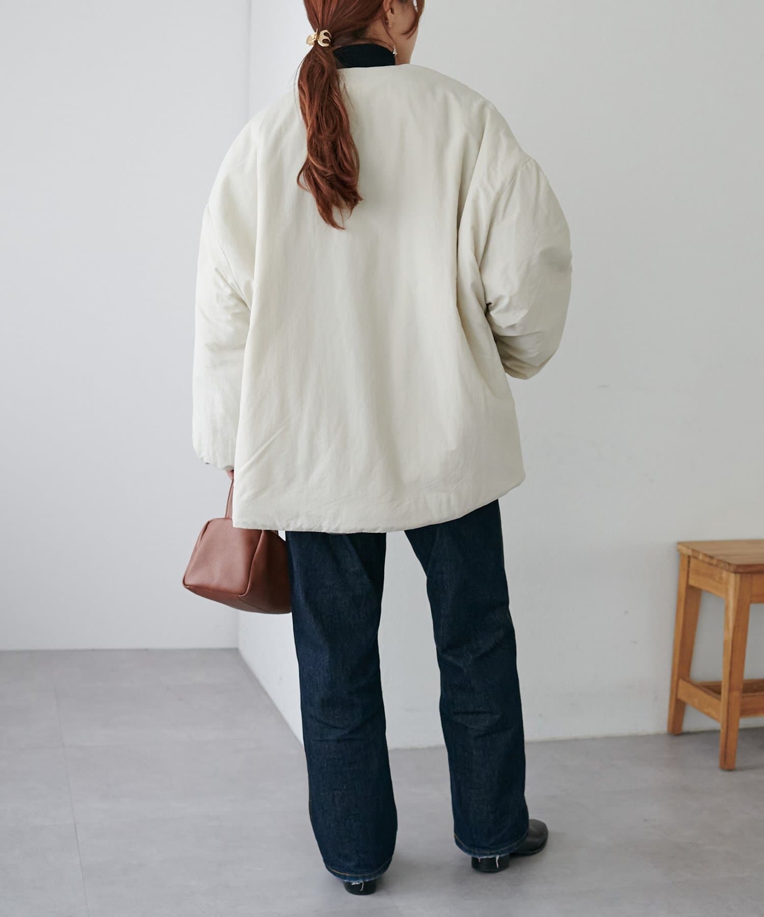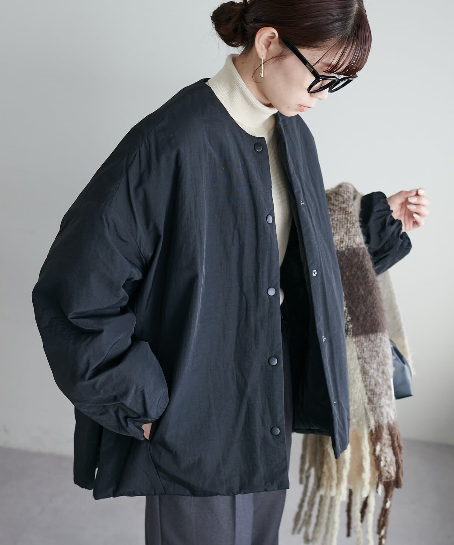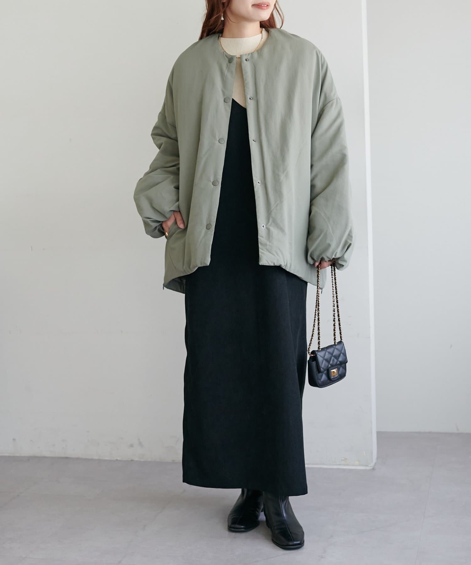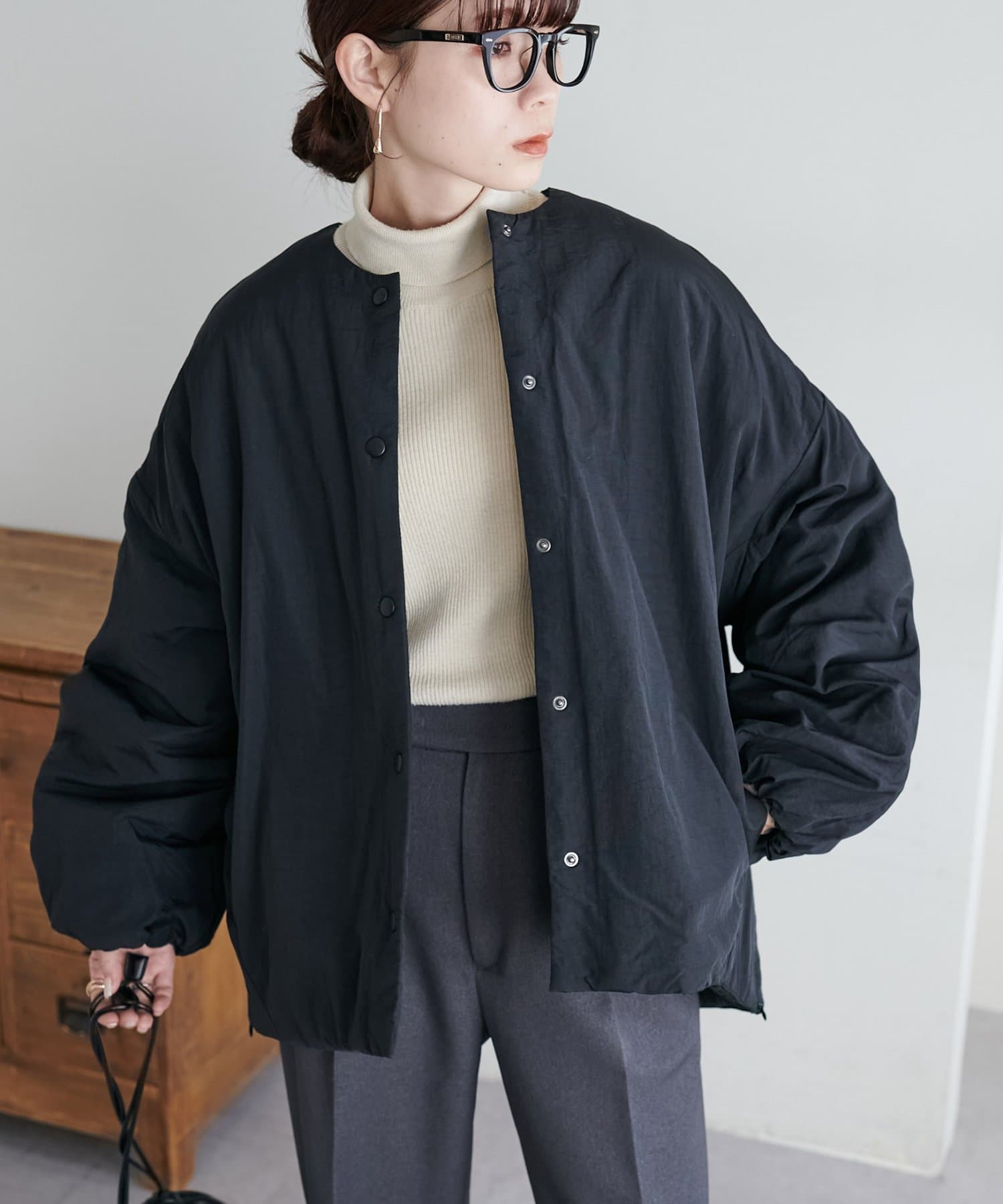 デニムやスラックスを合わせて大人カジュアルなコーデも、スカートやワンピースに合わせてフェミニンなコーデも。ノーカラーデザインなのでハイネックのトップスとの相性も抜群!