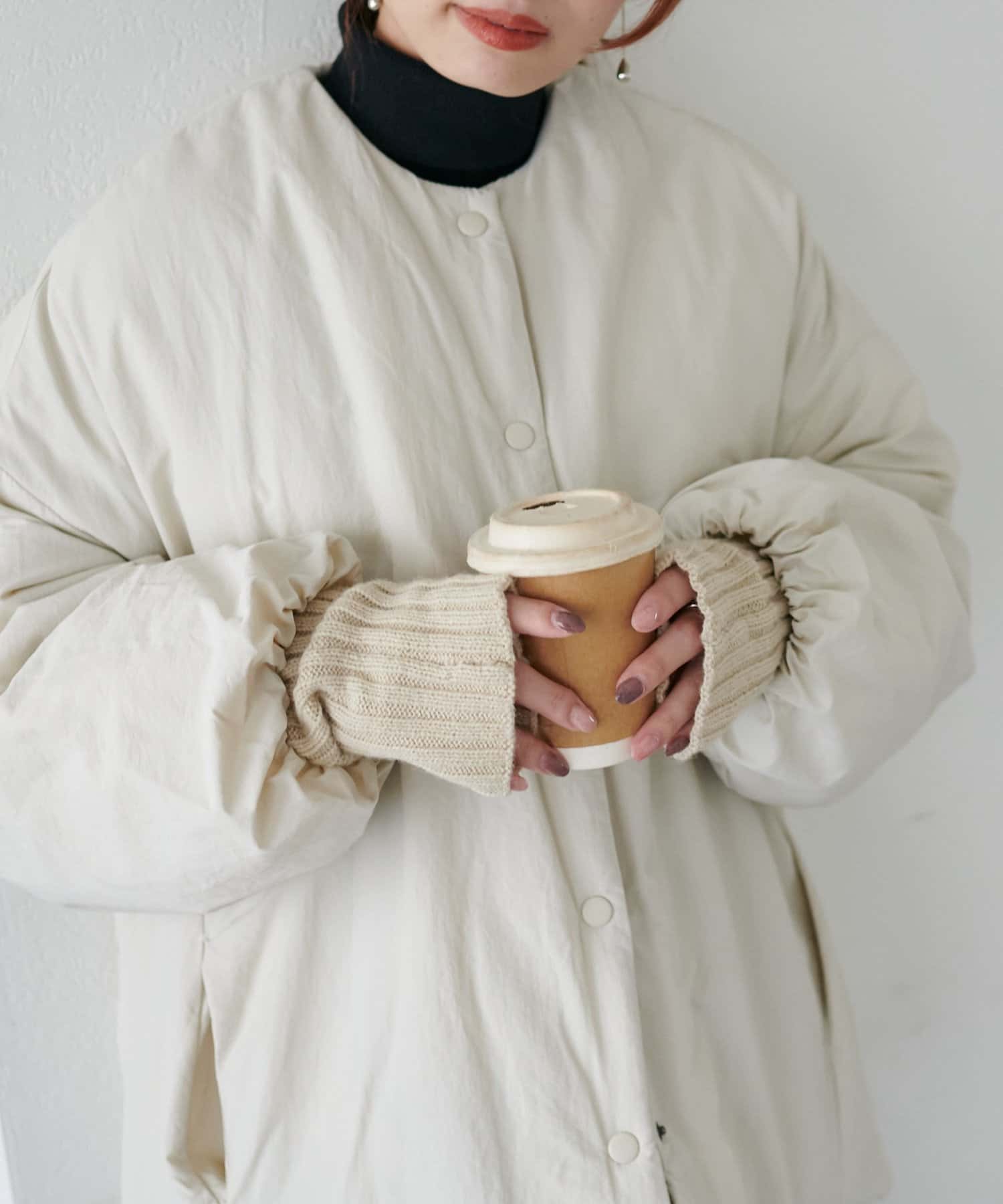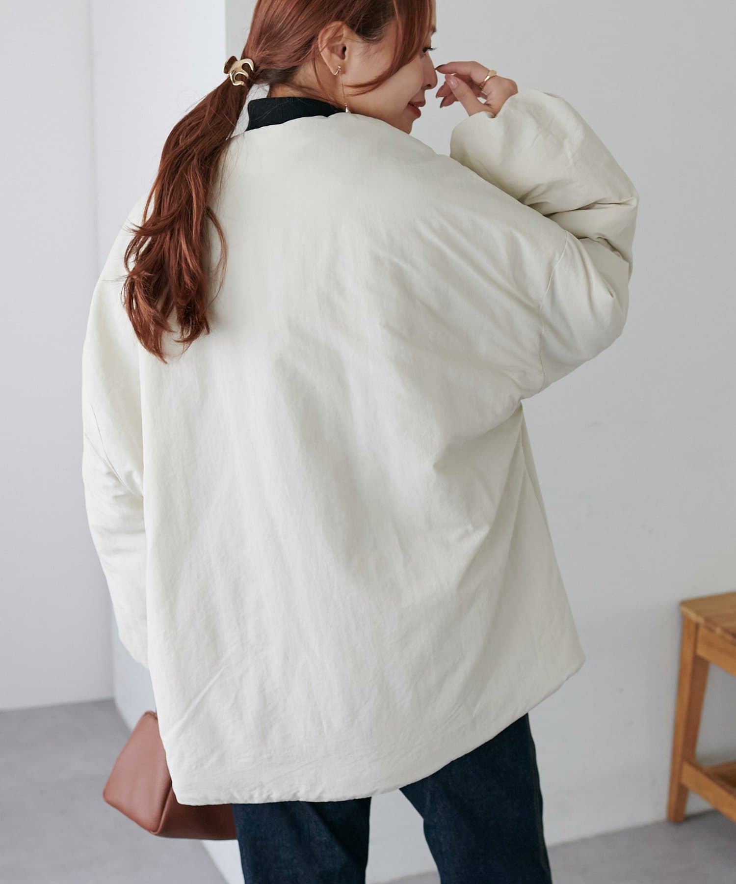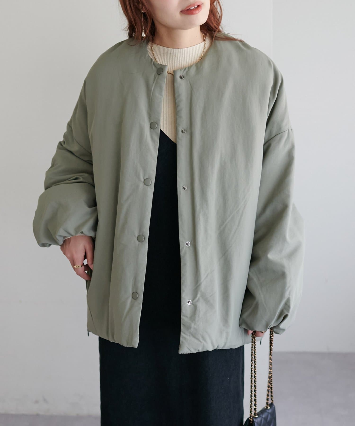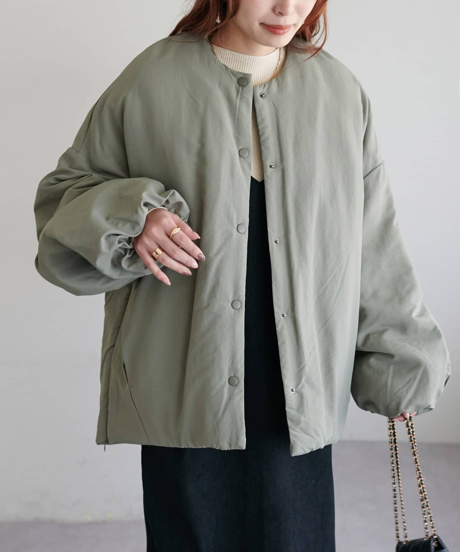 デニムやスラックスを合わせて大人カジュアルなコーデも、スカートやワンピースに合わせてフェミニンなコーデも。ノーカラーデザインなのでハイネックのトップスとの相性も抜群!
