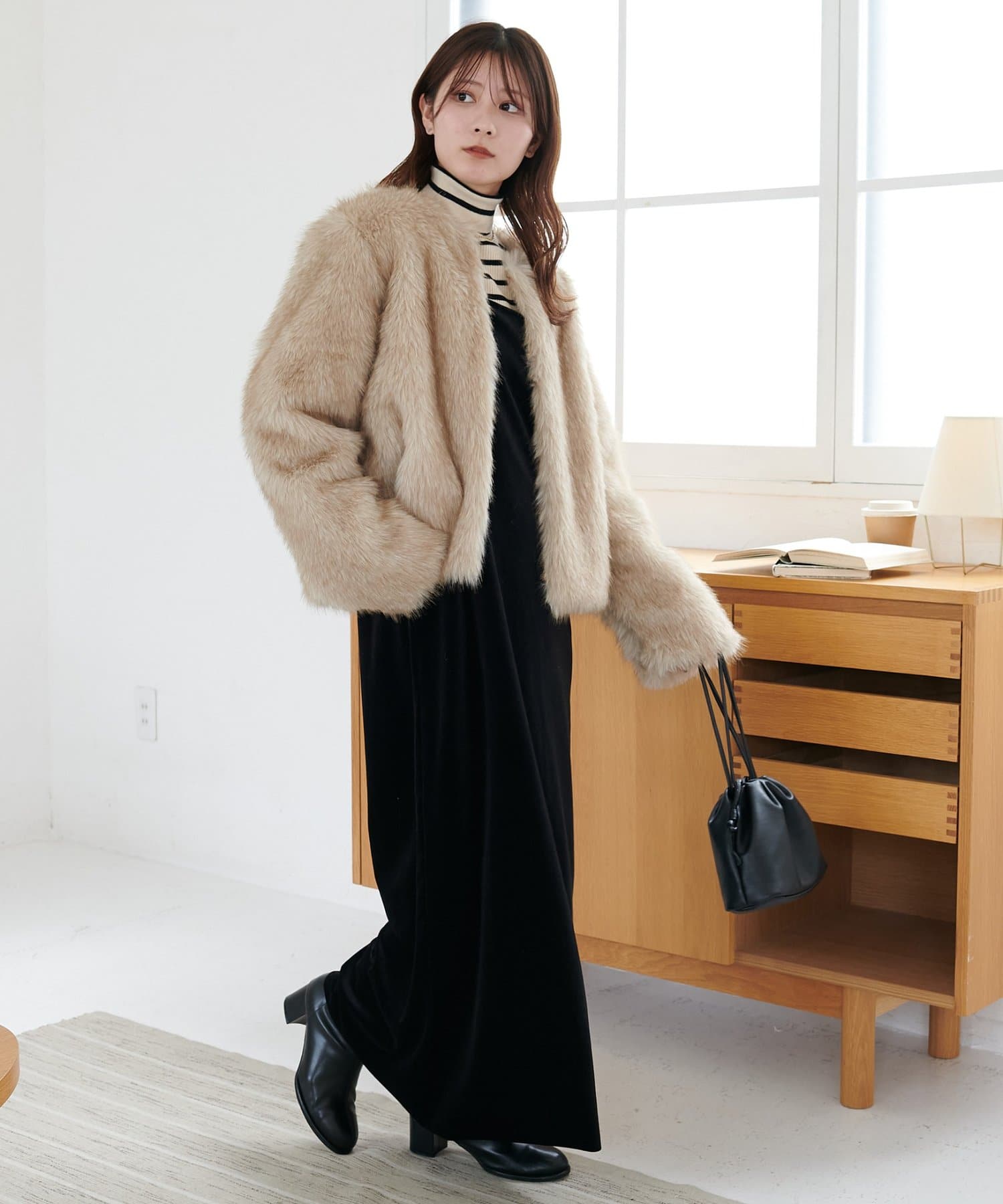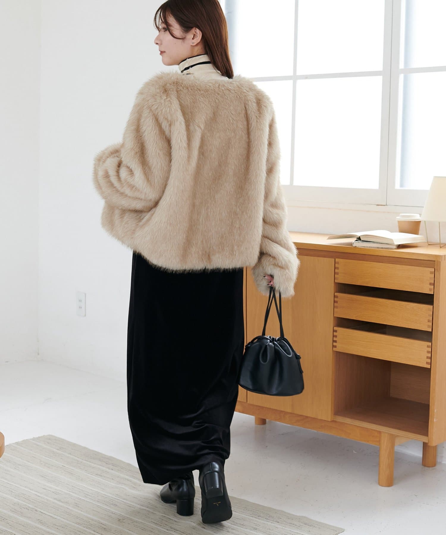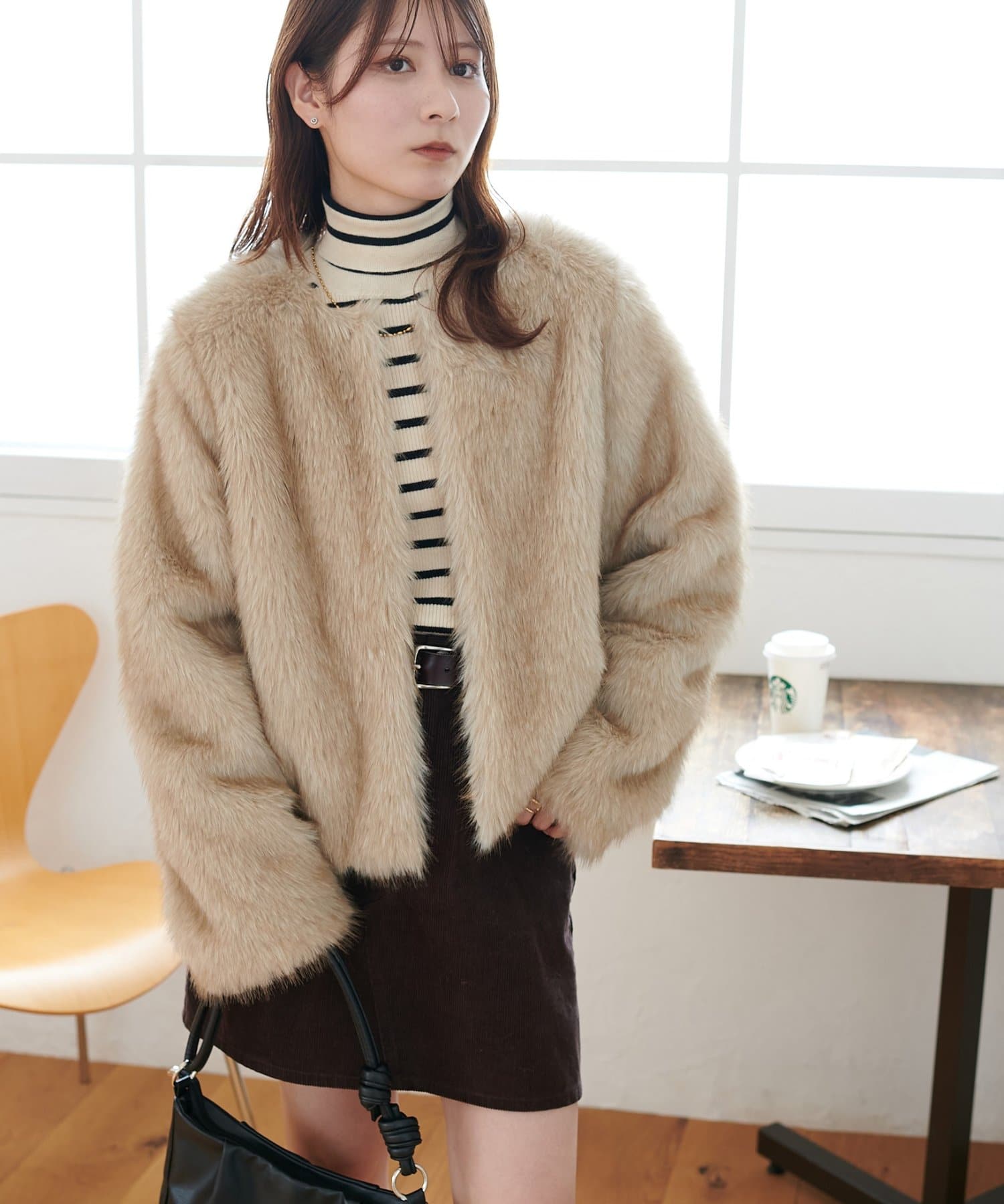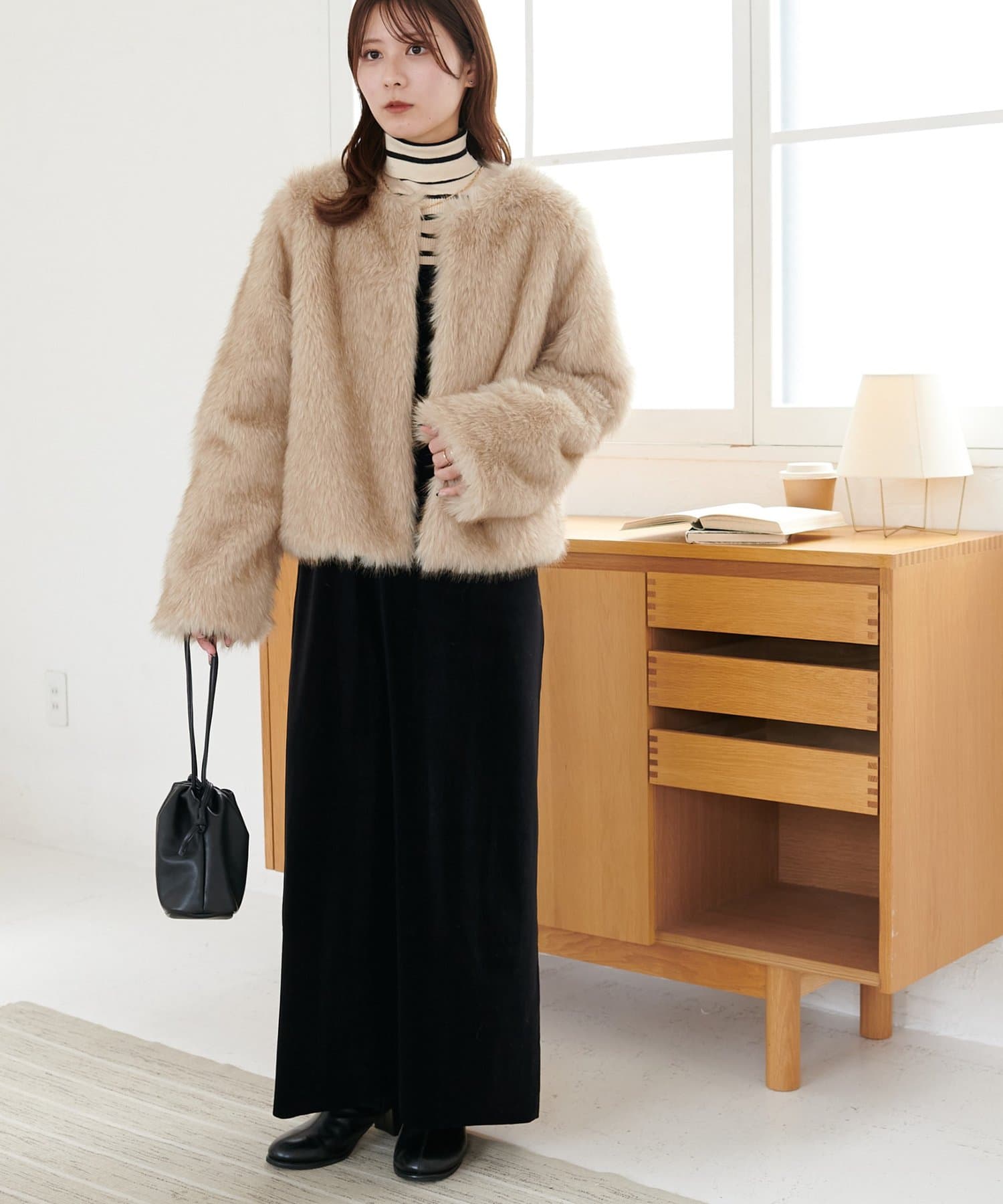 毛足が長く程よいボリューム感がでるファージャケットは、ノーカラーにしたことですっきりとした印象と柔らかな雰囲気を両立します。