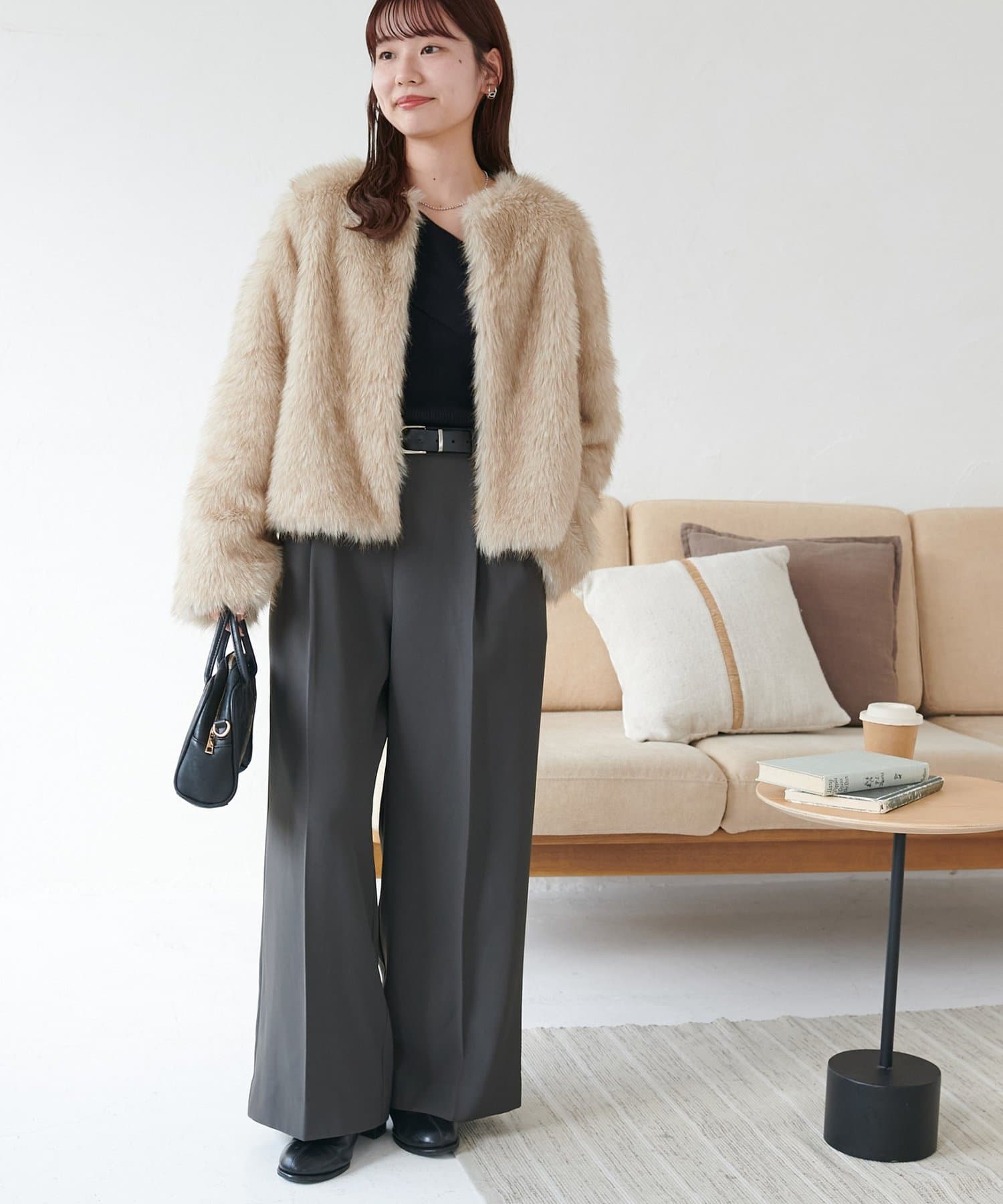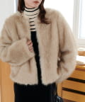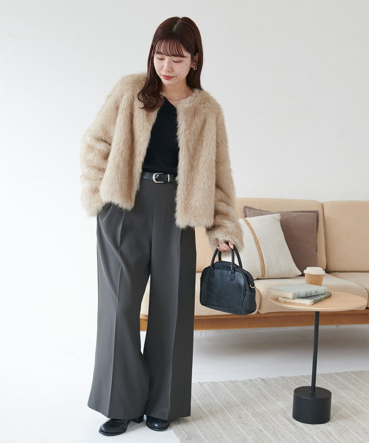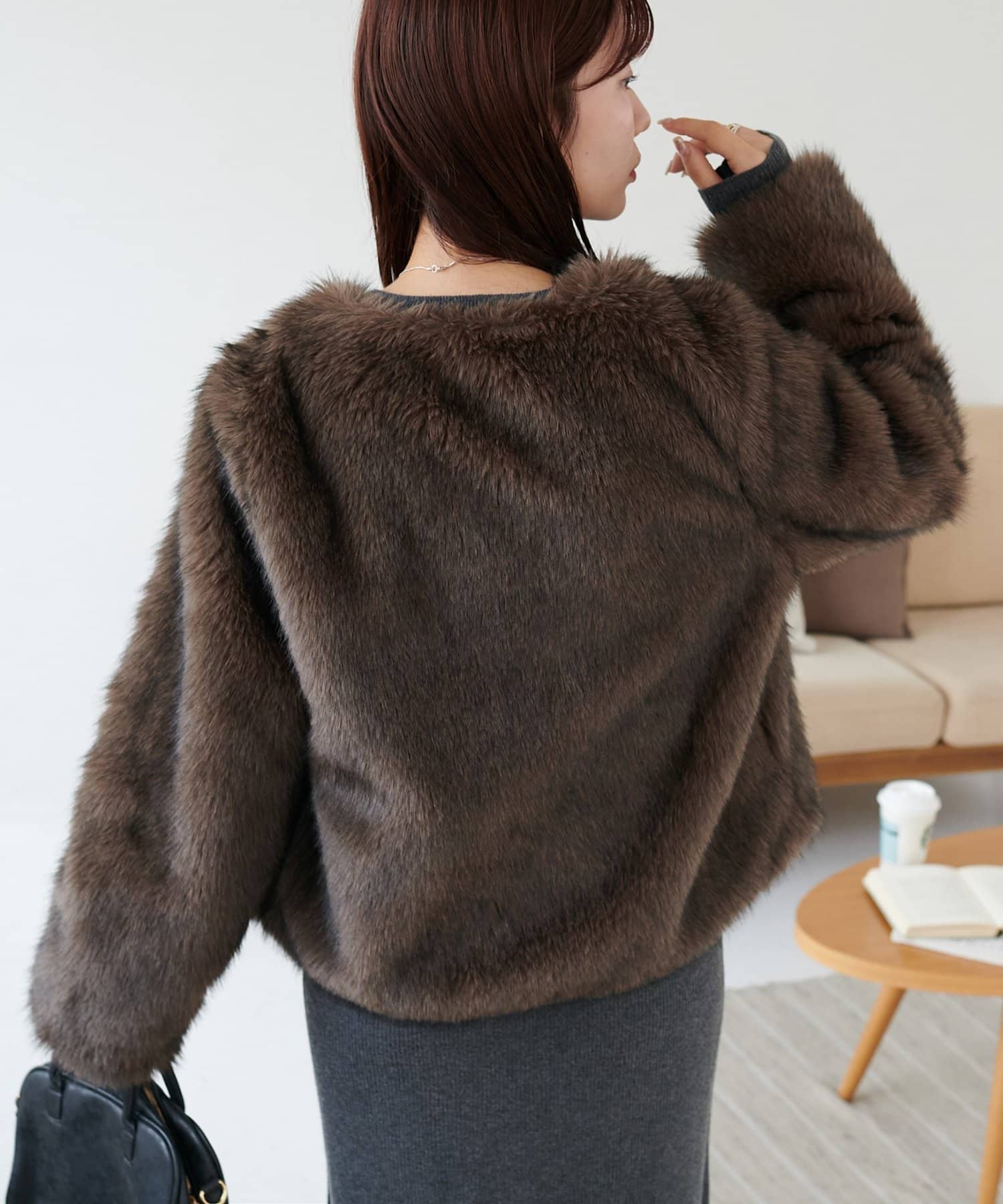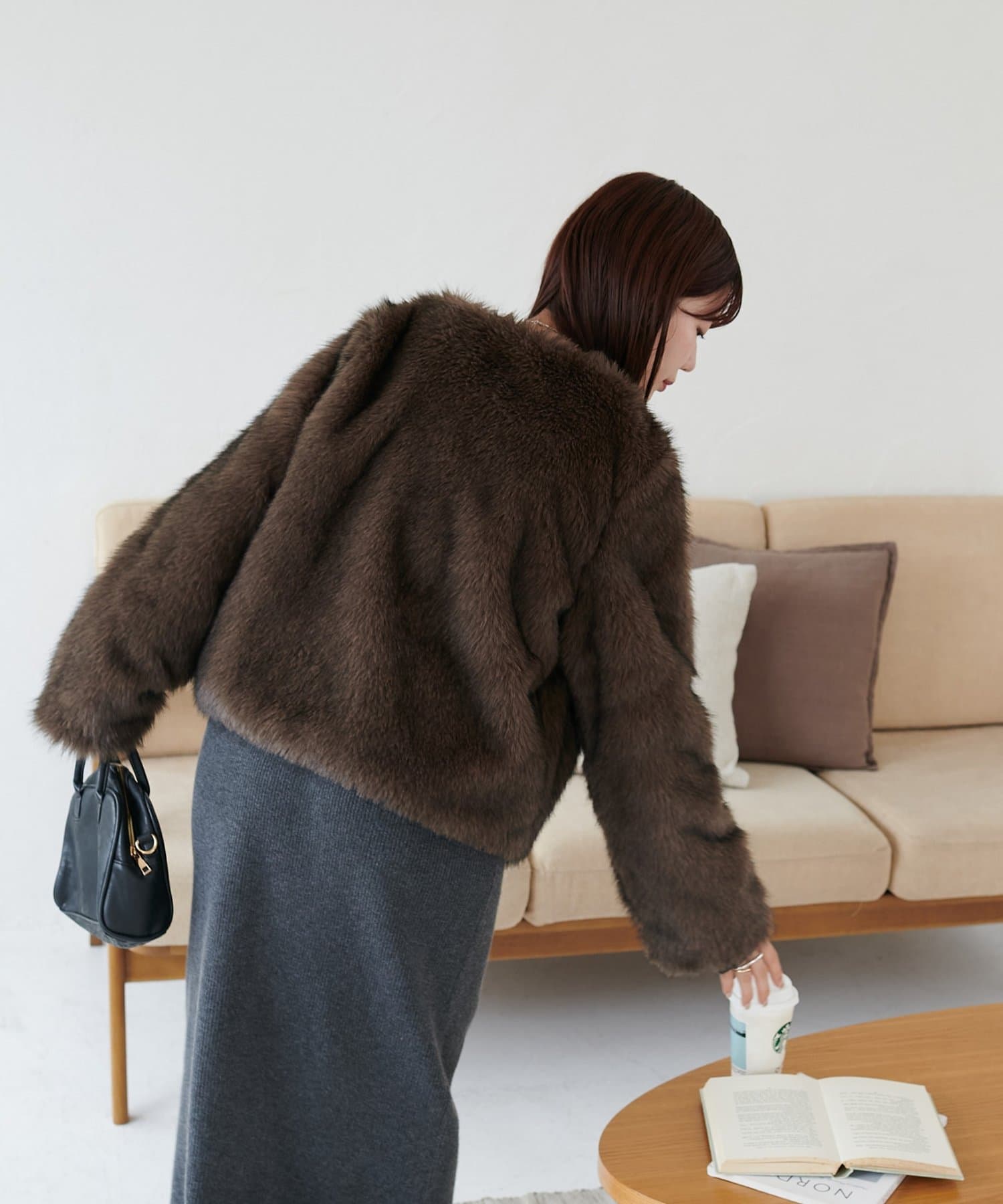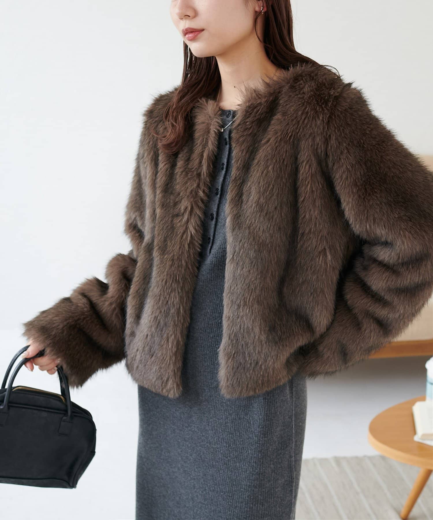 毛足が長く程よいボリューム感がでるファージャケットは、ノーカラーにしたことですっきりとした印象と柔らかな雰囲気を両立します。