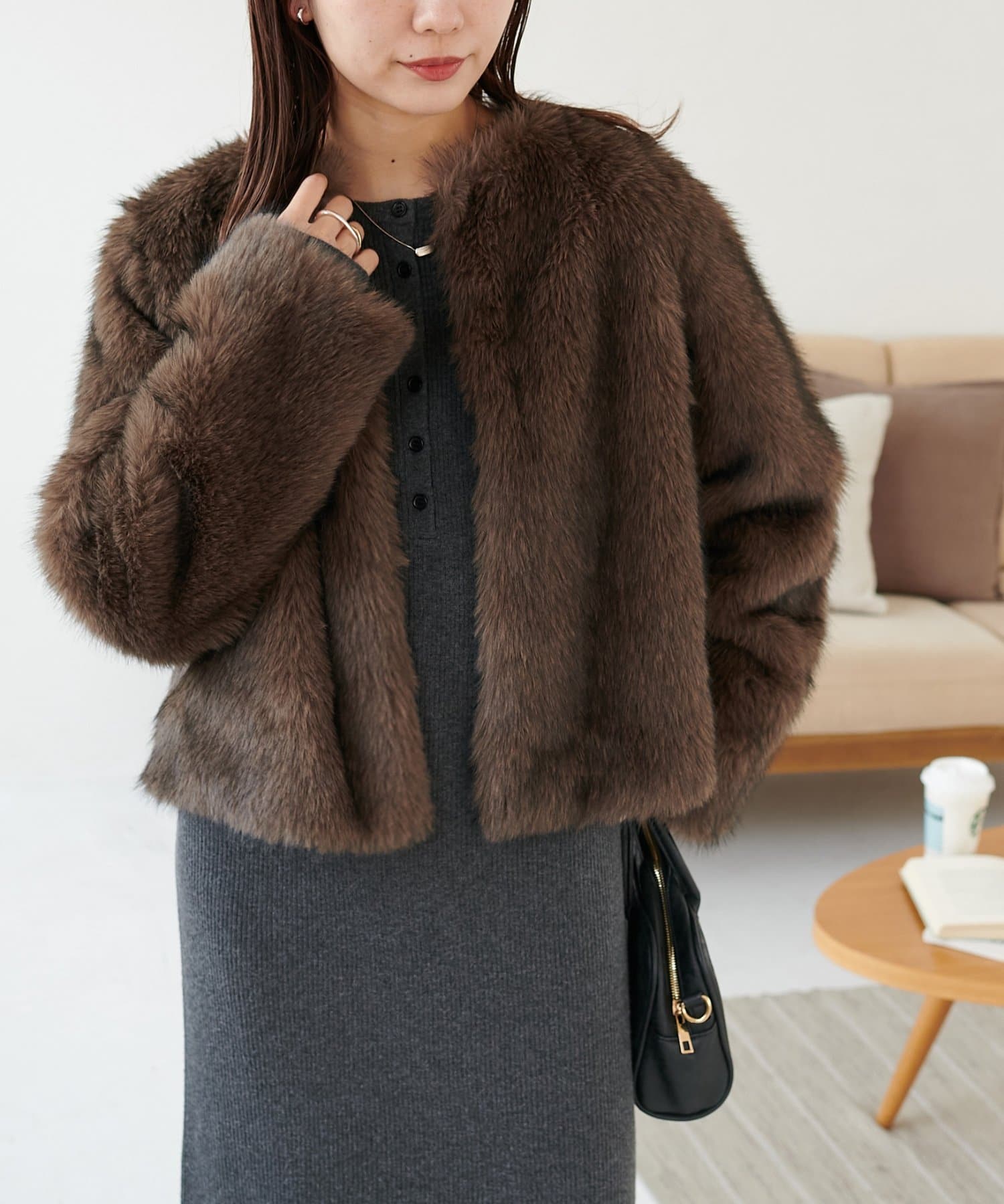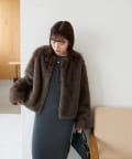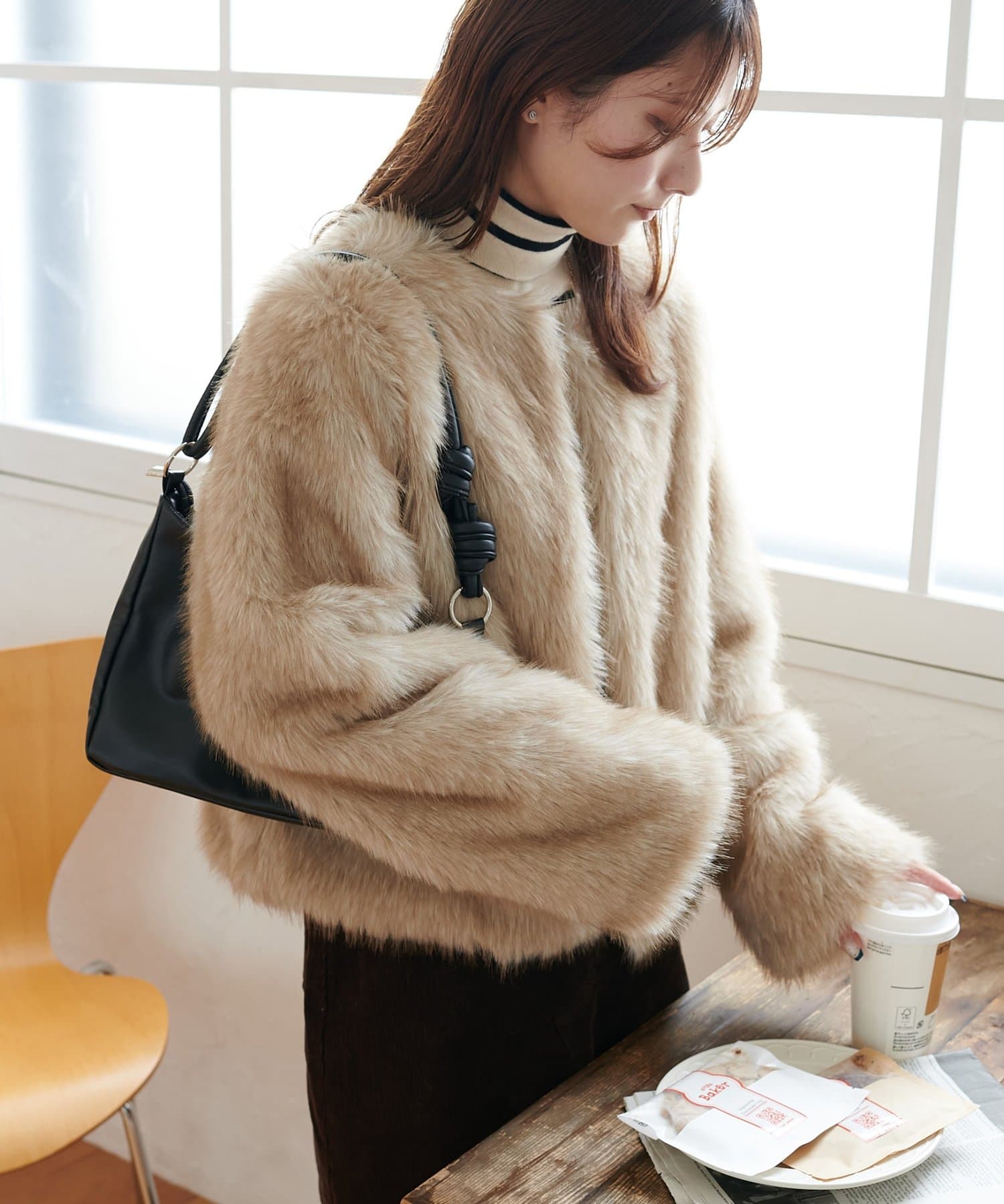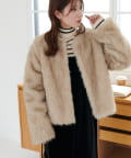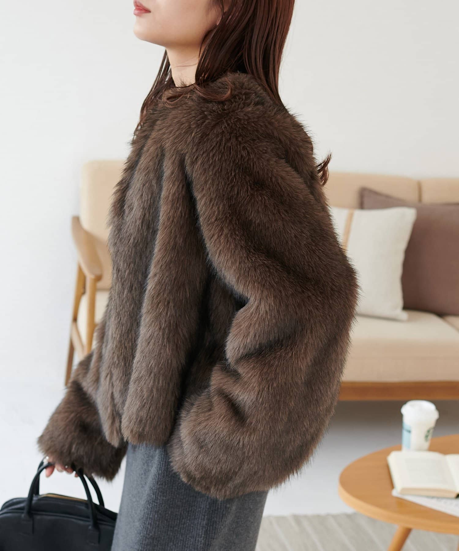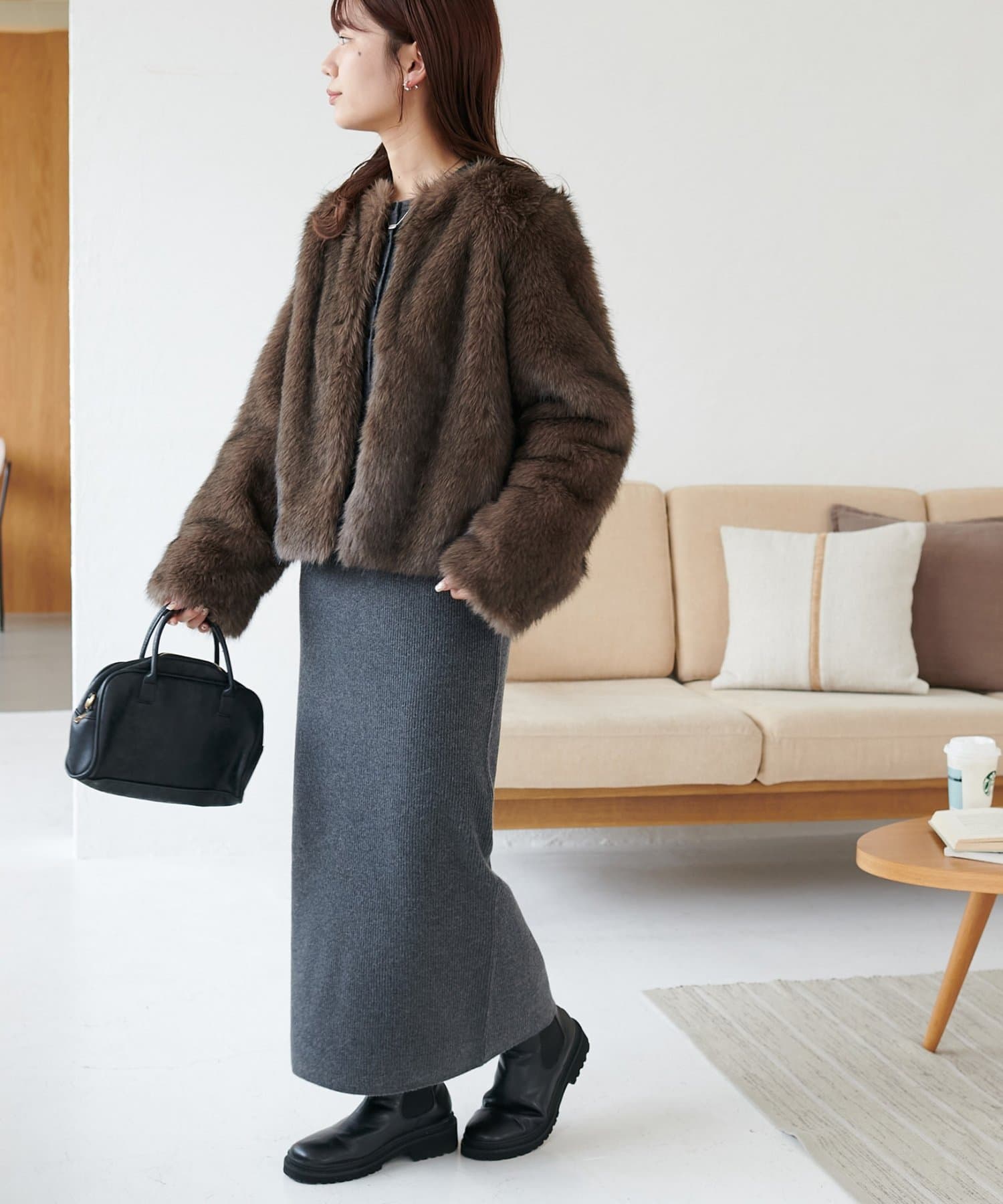 毛足が長く程よいボリューム感がでるファージャケットは、ノーカラーにしたことですっきりとした印象と柔らかな雰囲気を両立します。