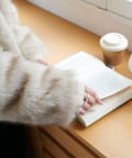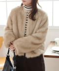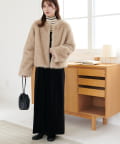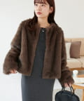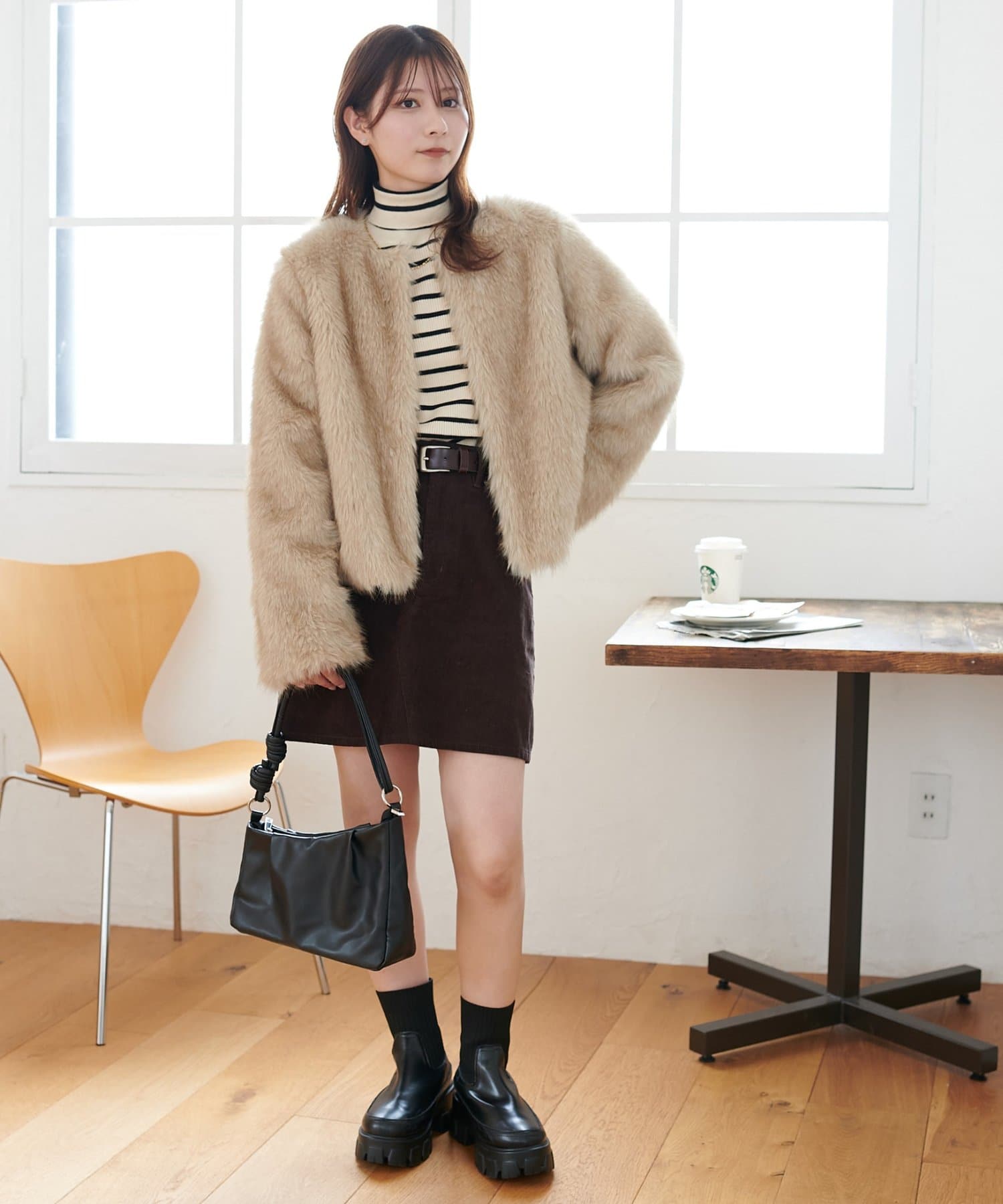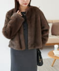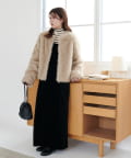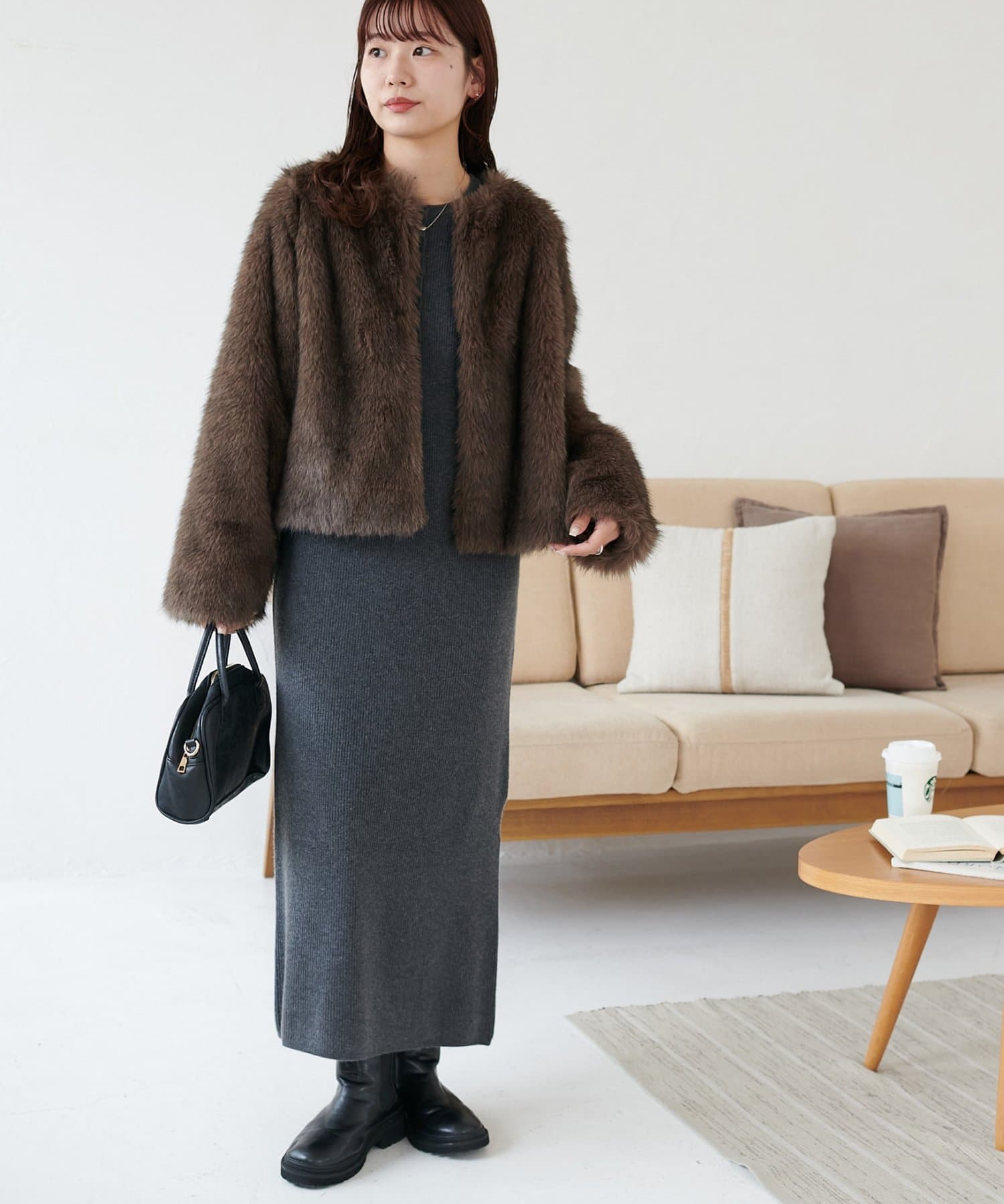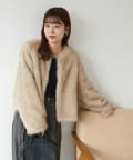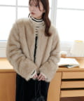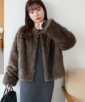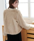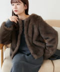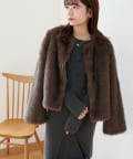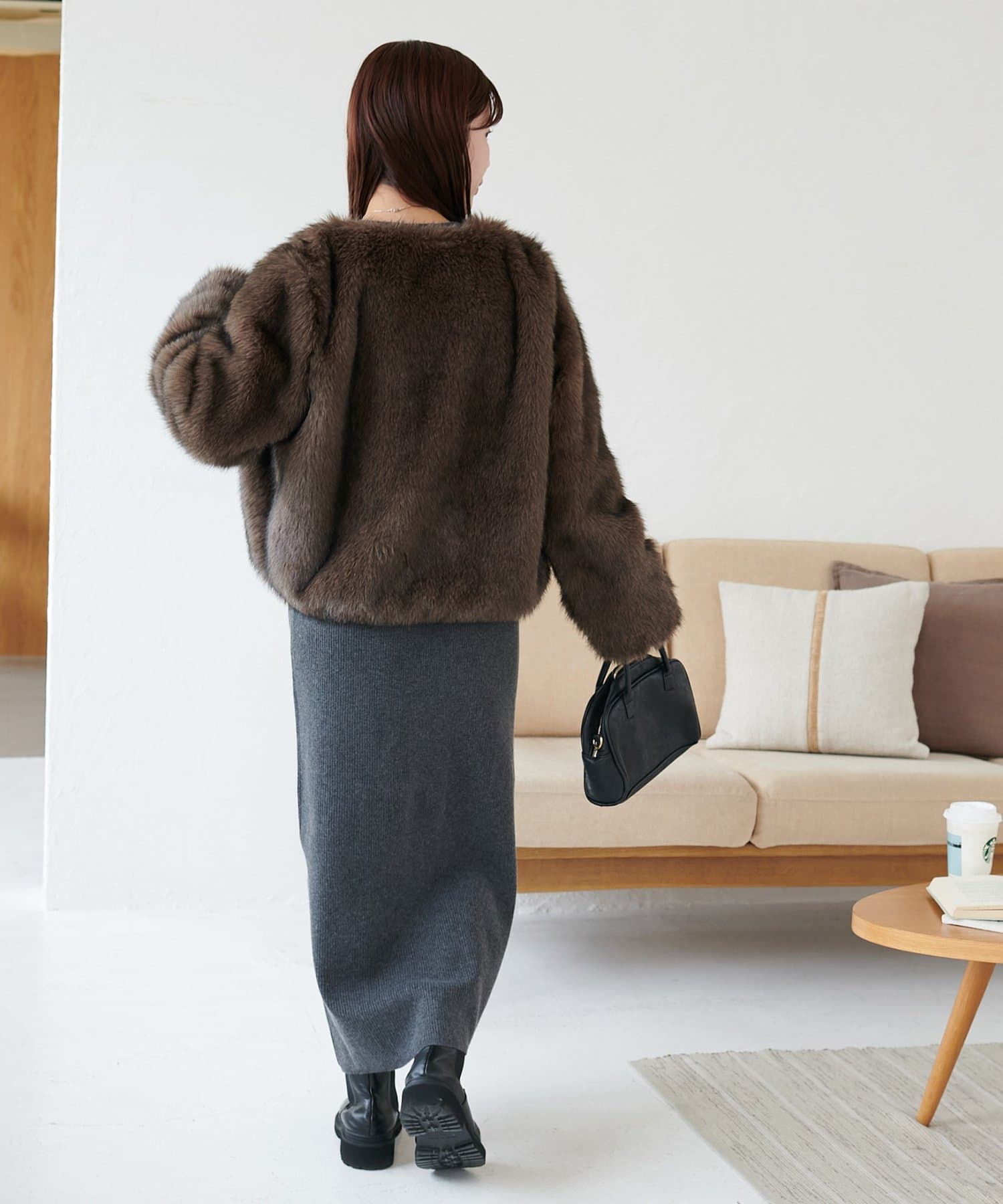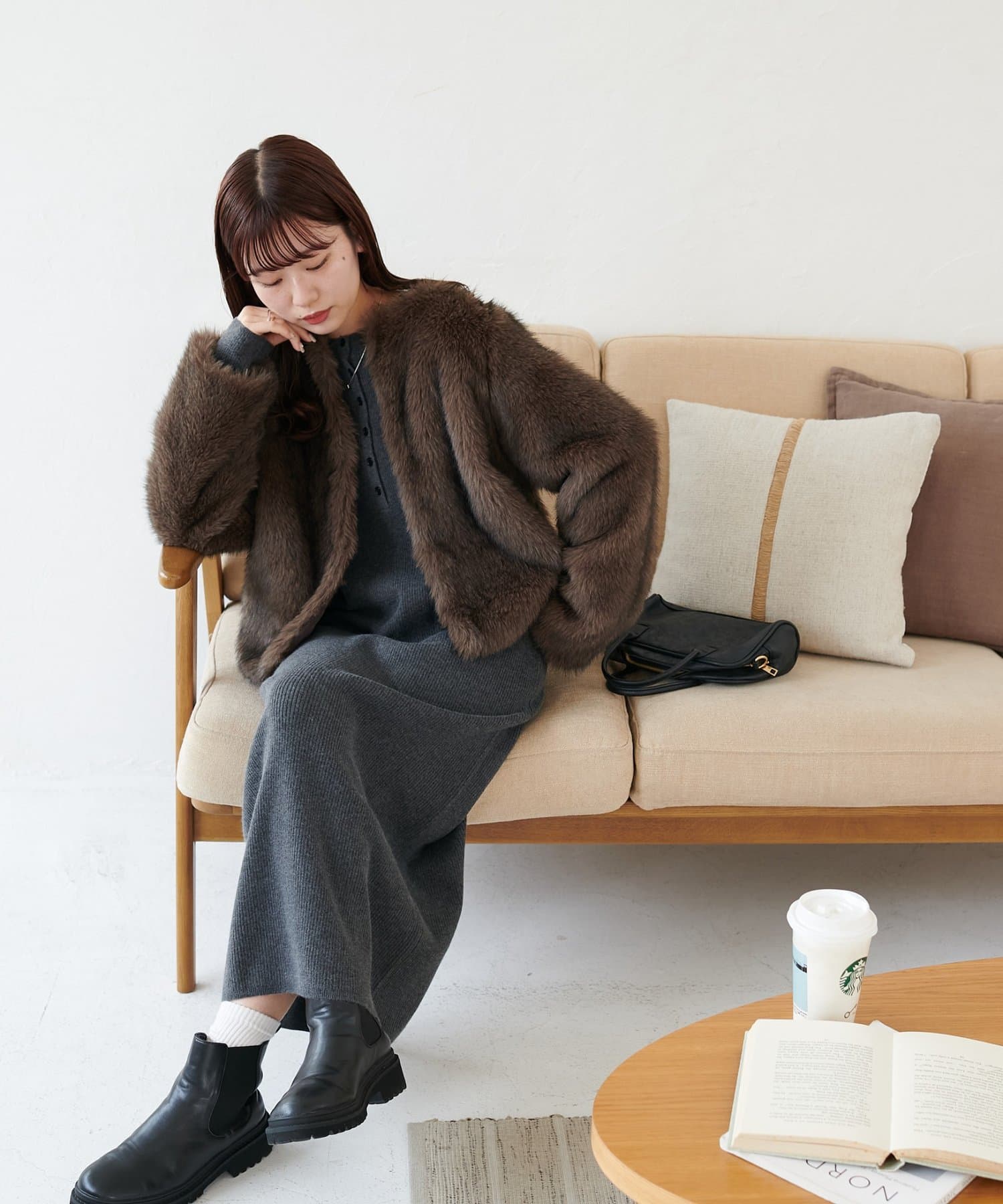 毛足が長く程よいボリューム感がでるファージャケットは、ノーカラーにしたことですっきりとした印象と柔らかな雰囲気を両立します。