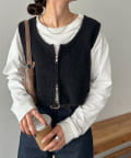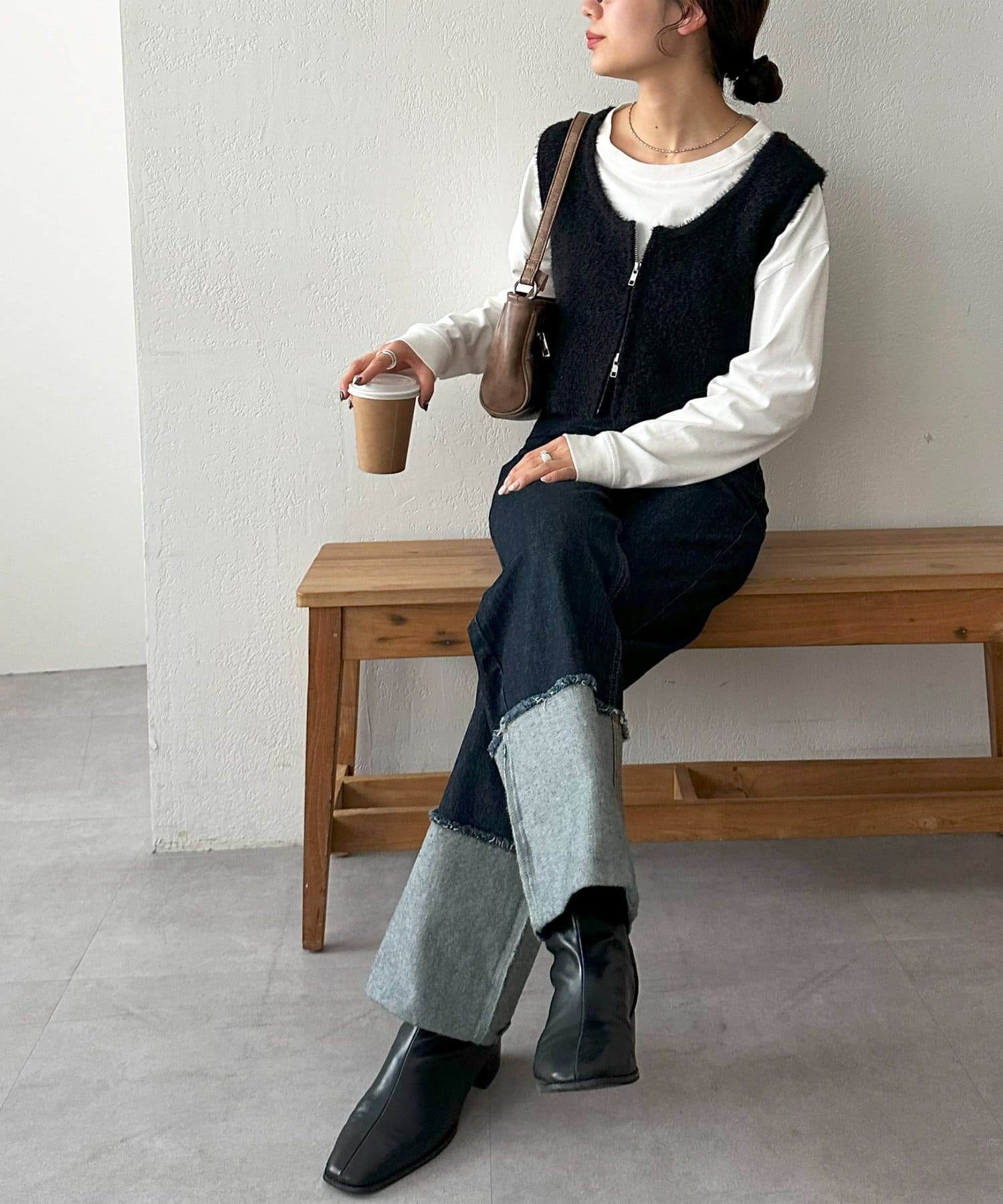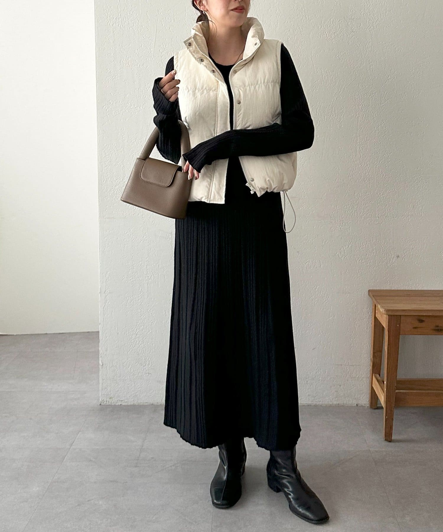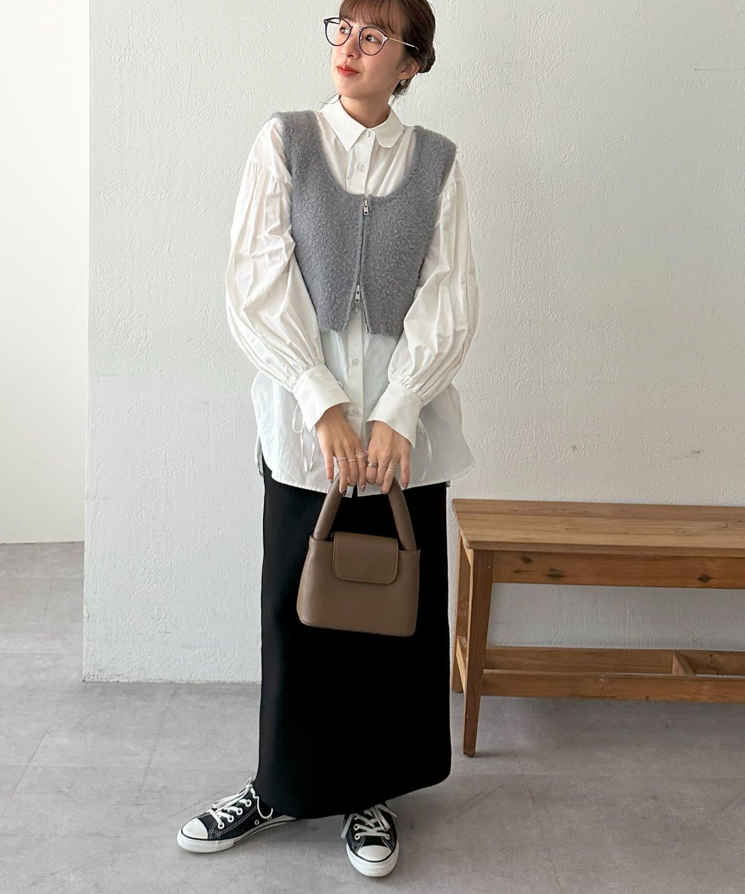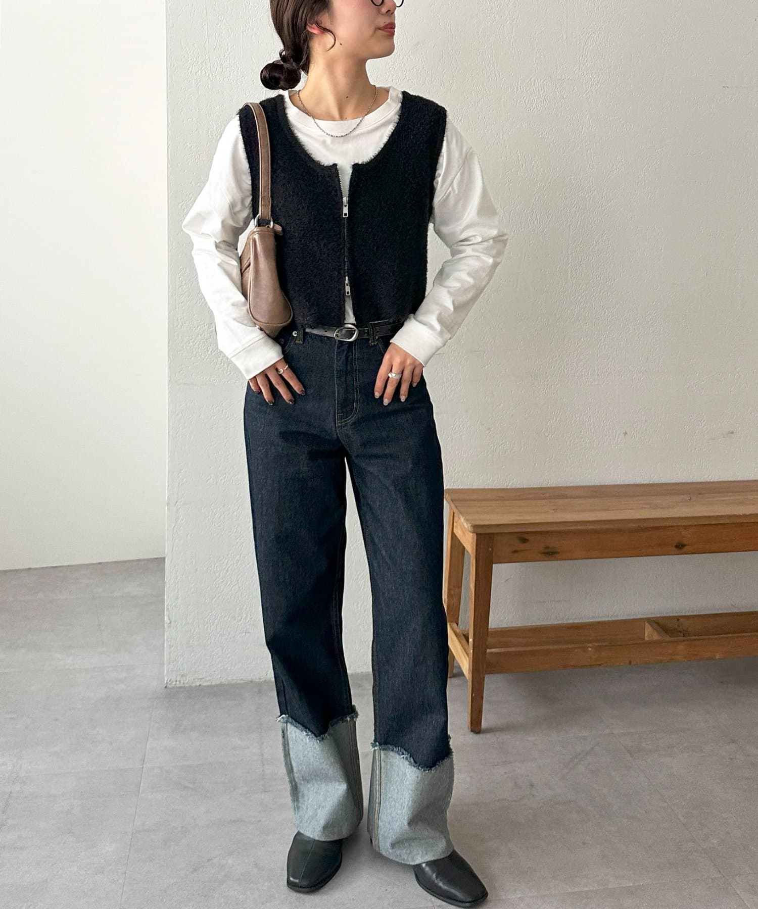 ・ベストはコンパクト丈でメリハリのあるコーデに