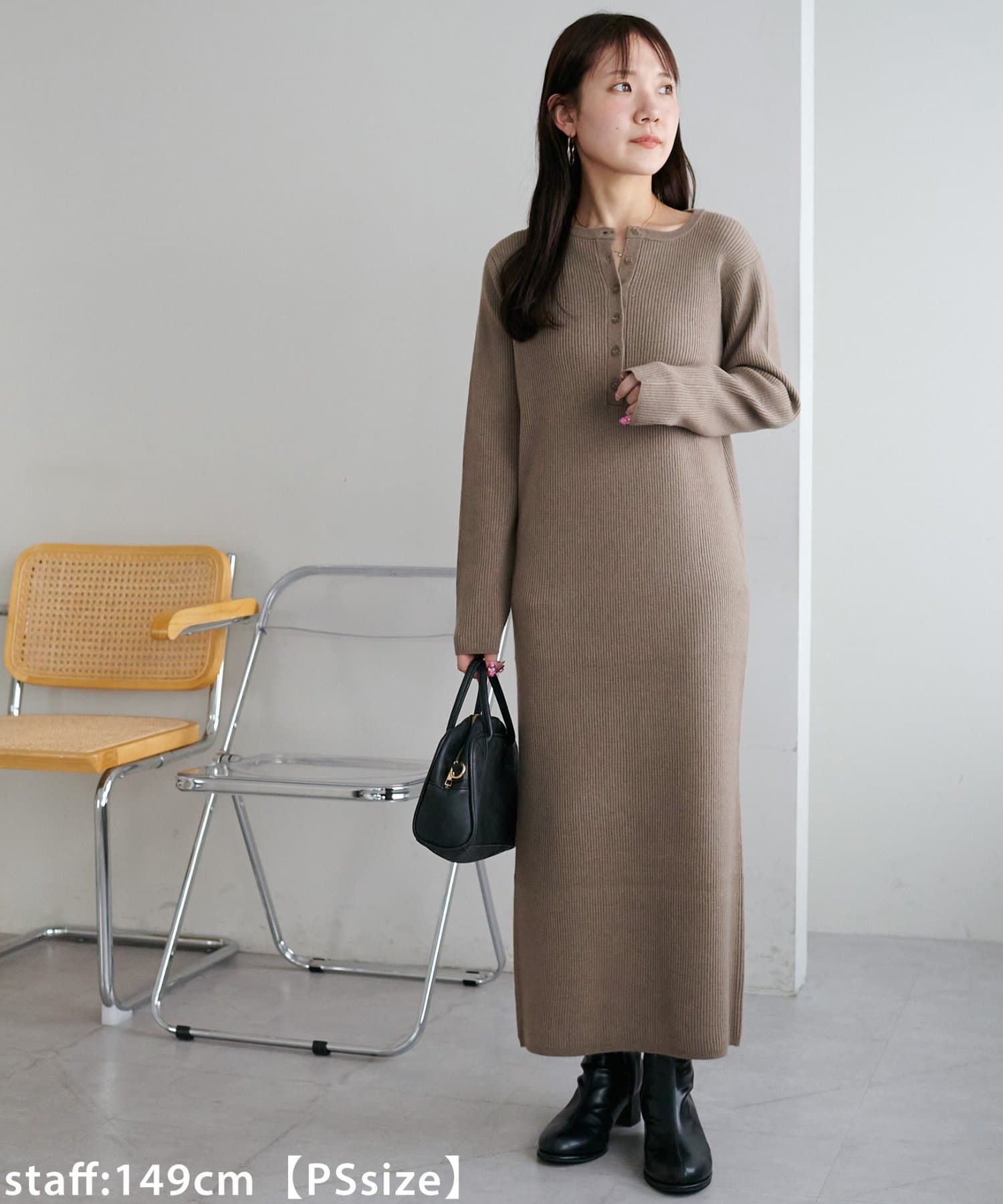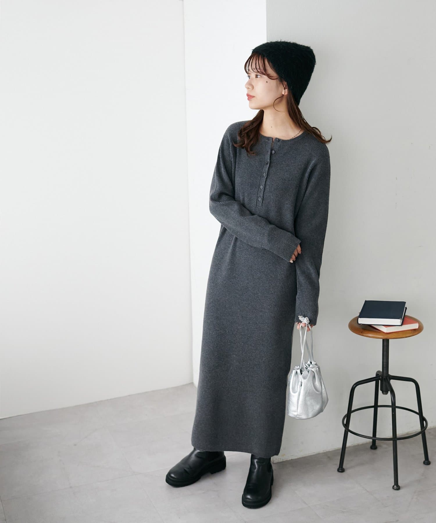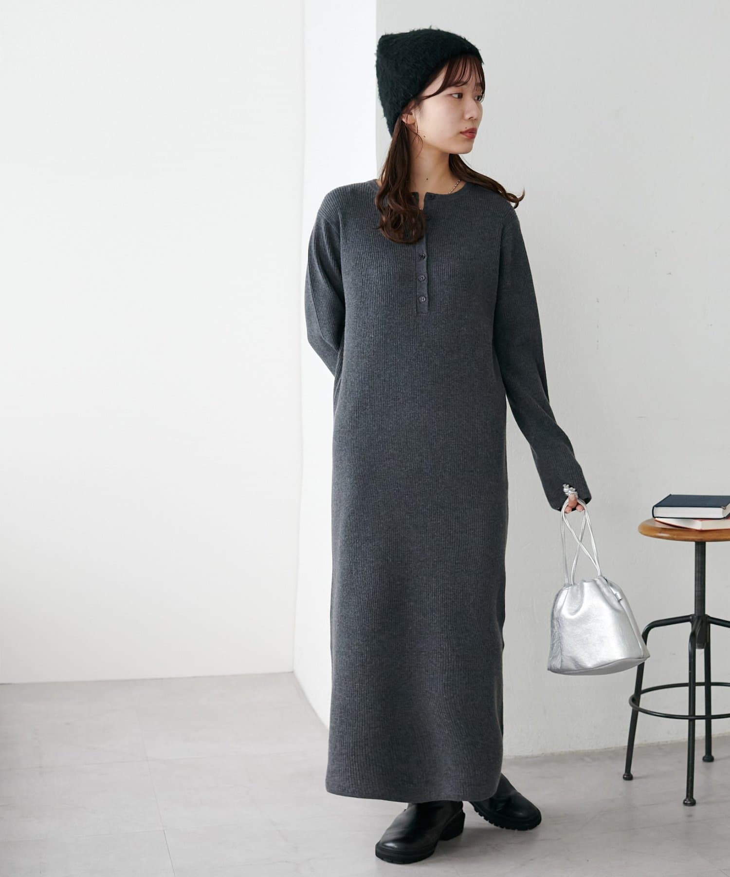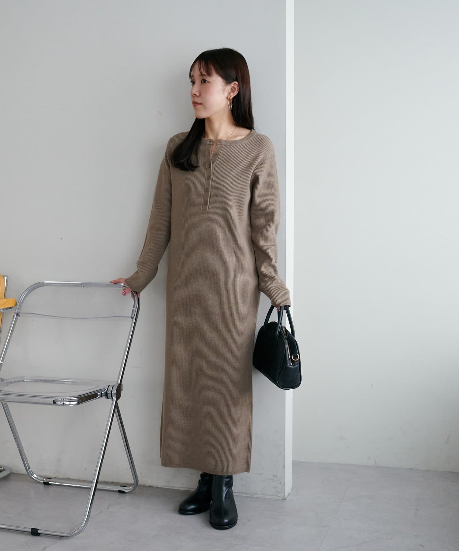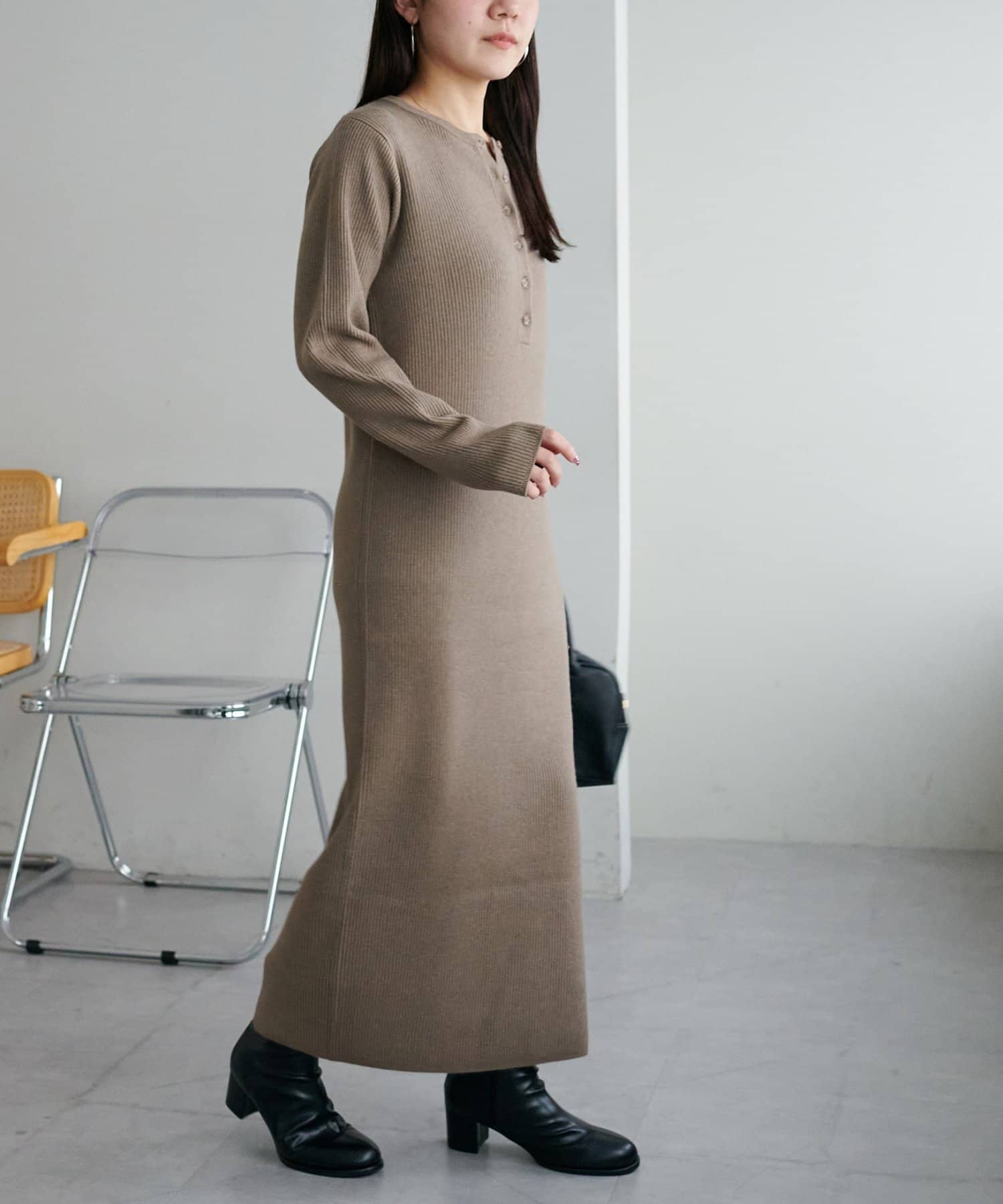 シンプルながらも女性らしさを引き立てるヘンリーネックデザインのリブニットワンピース。