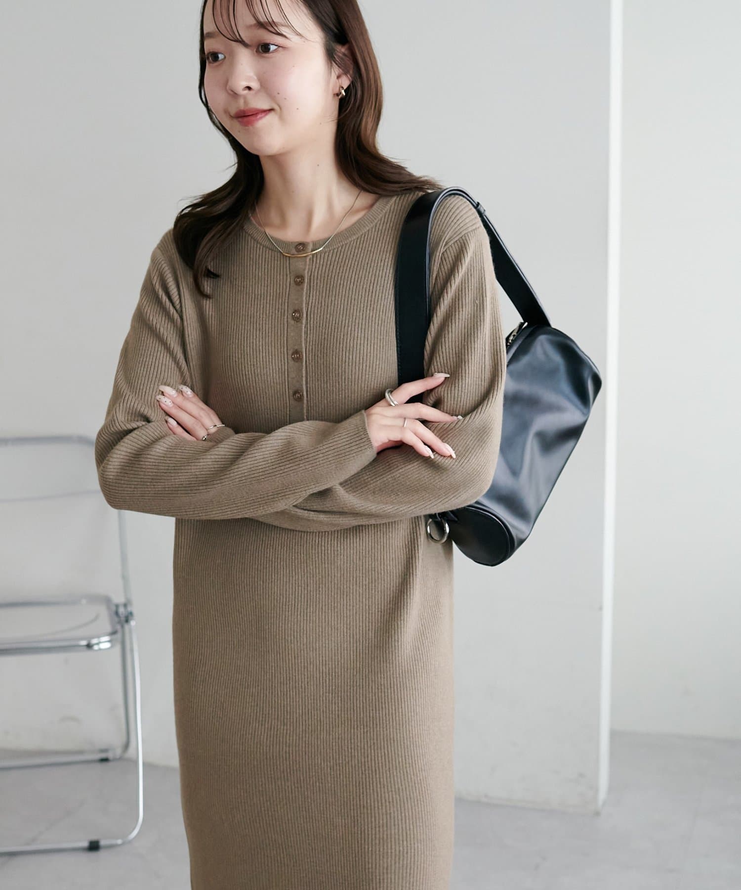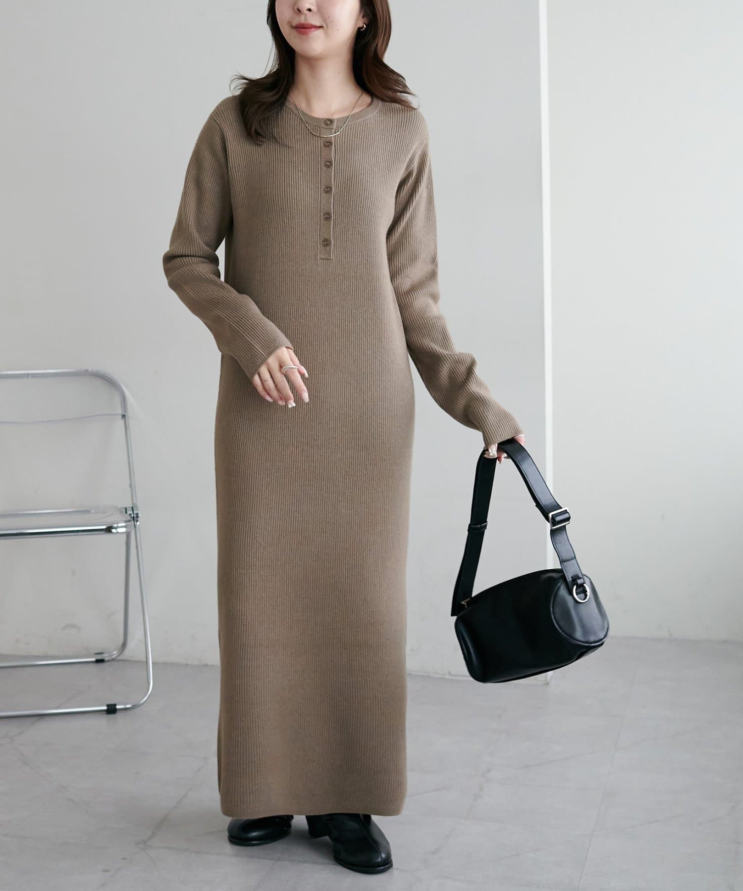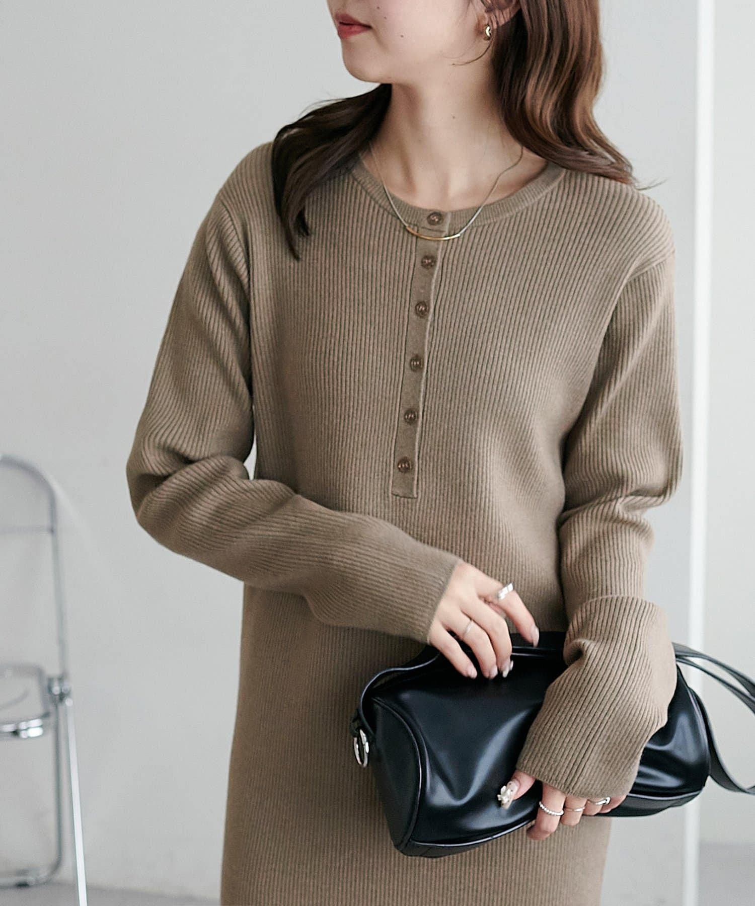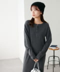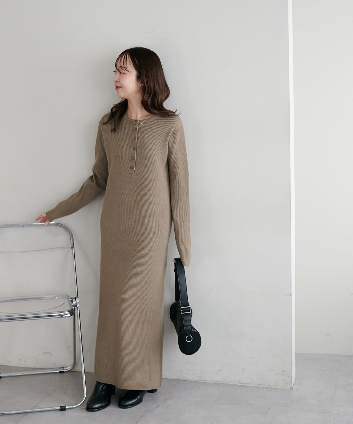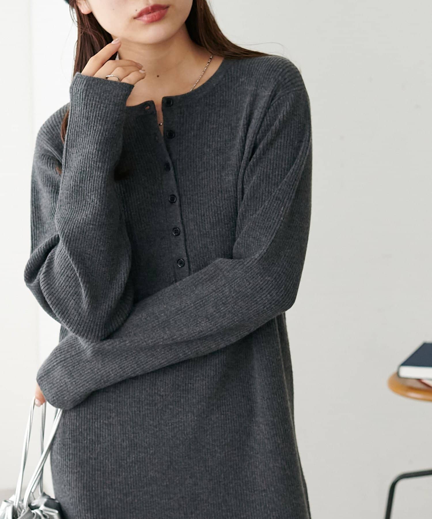 シンプルながらも女性らしさを引き立てるヘンリーネックデザインのリブニットワンピース。