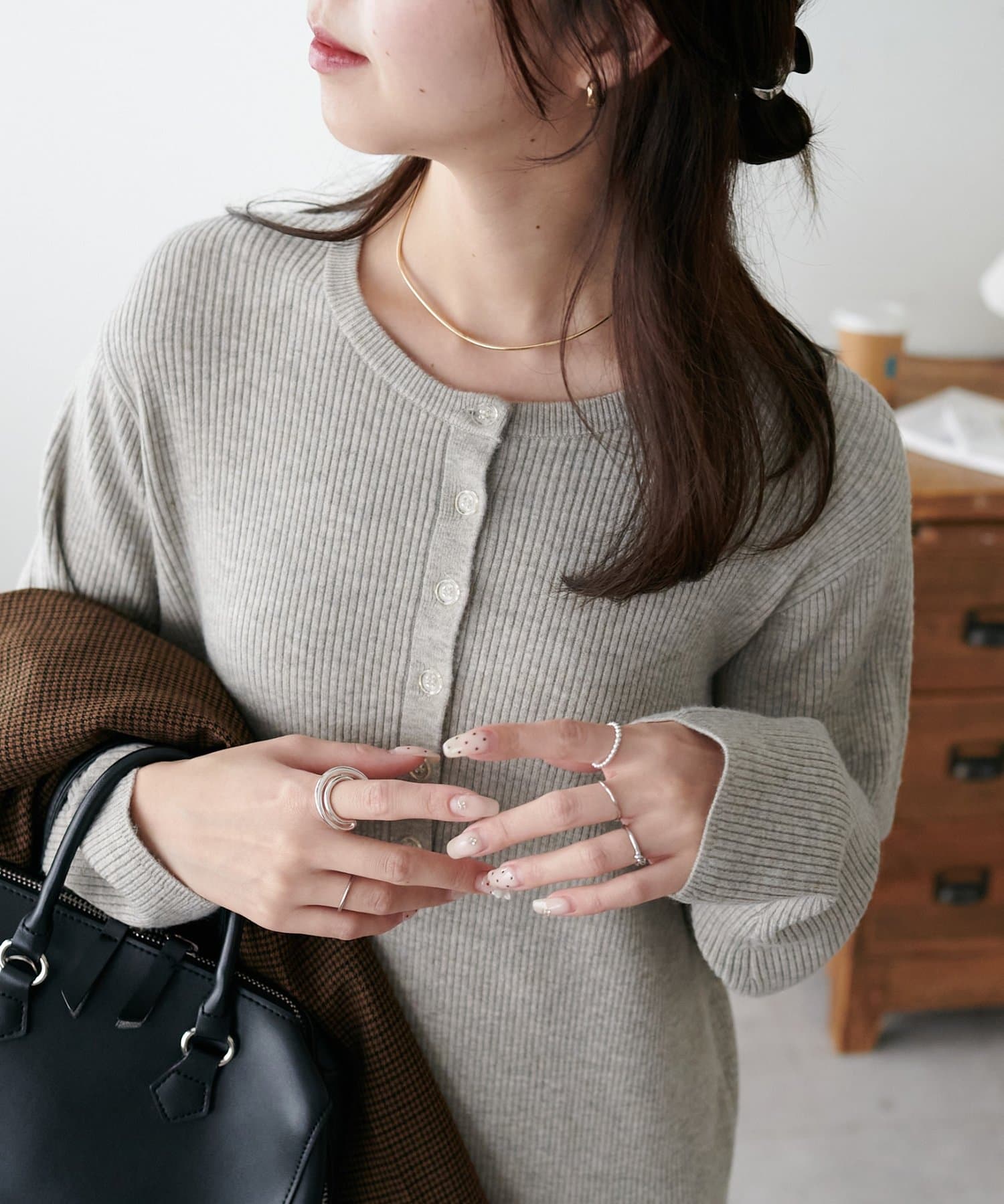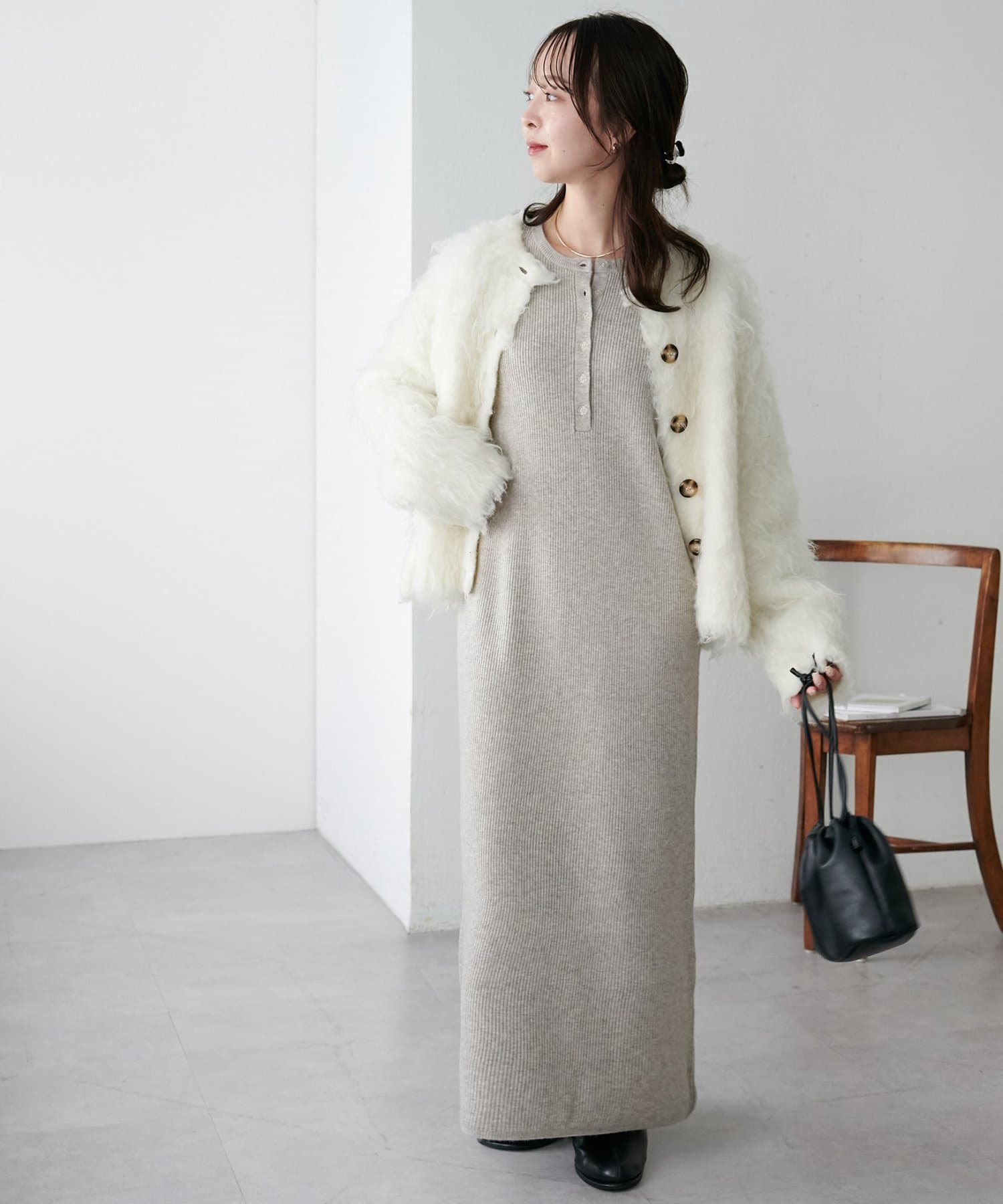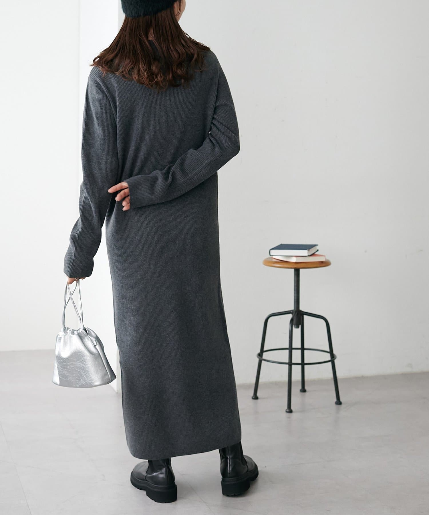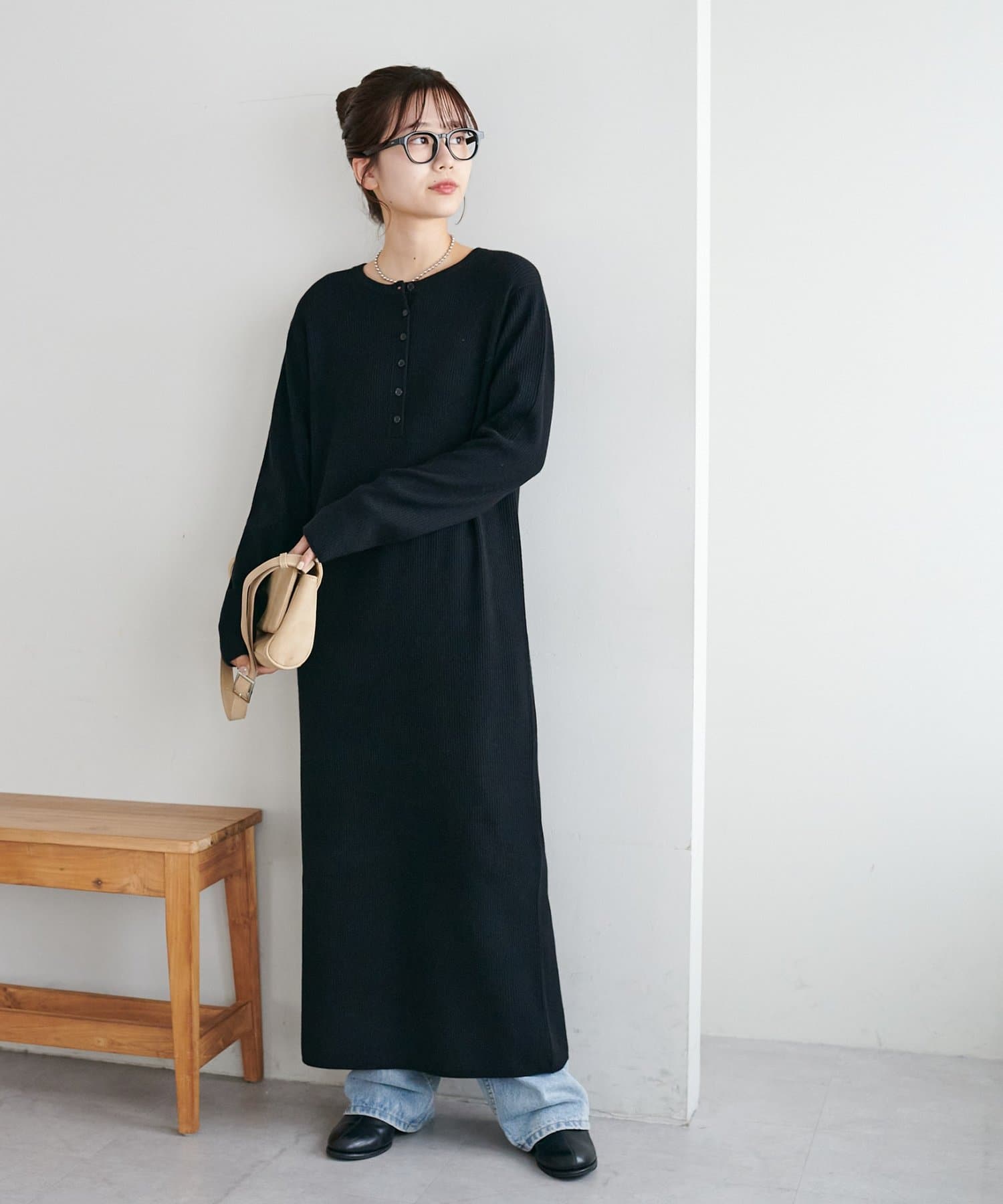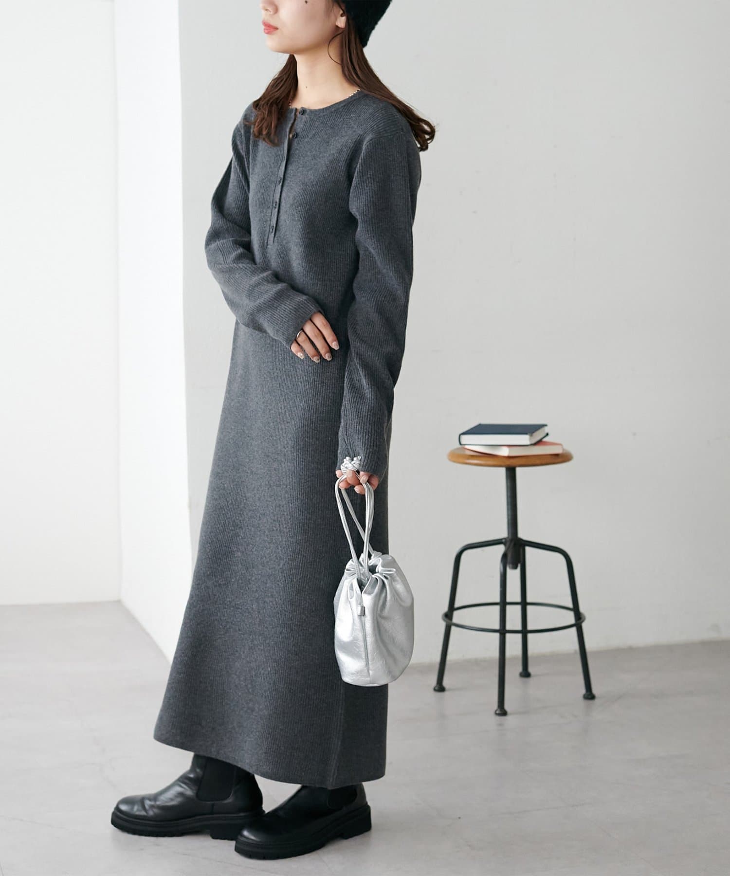 シンプルながらも女性らしさを引き立てるヘンリーネックデザインのリブニットワンピース。