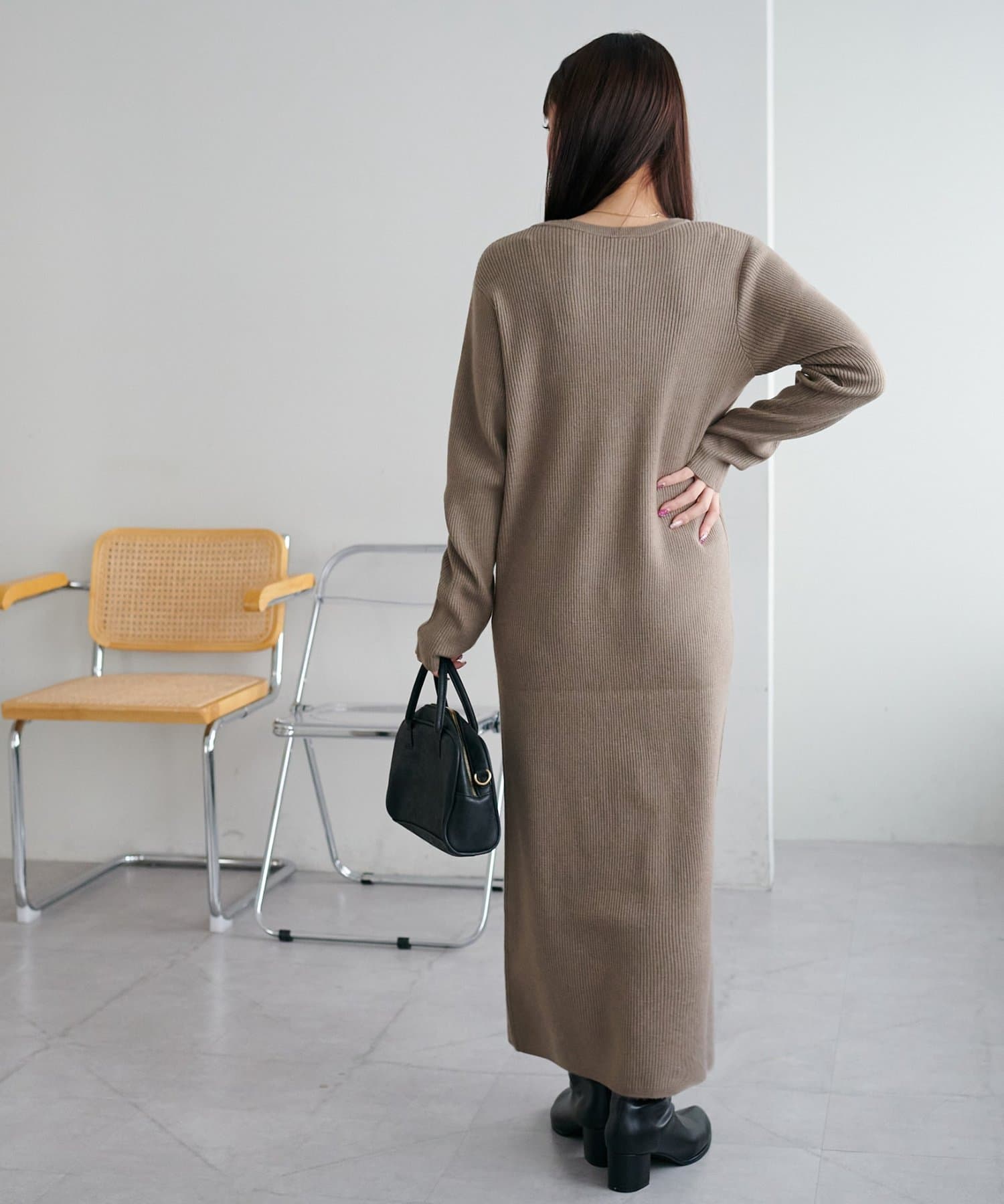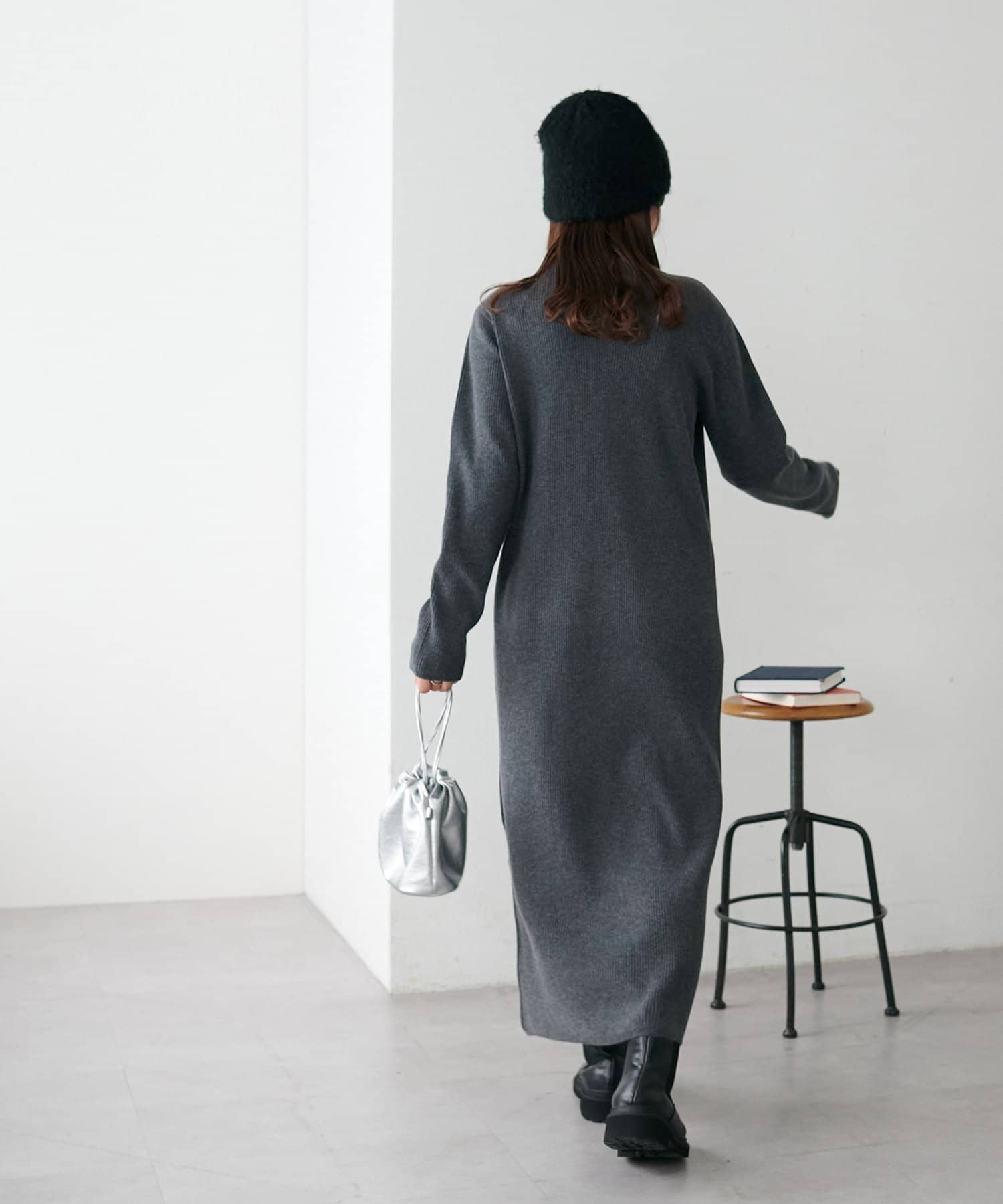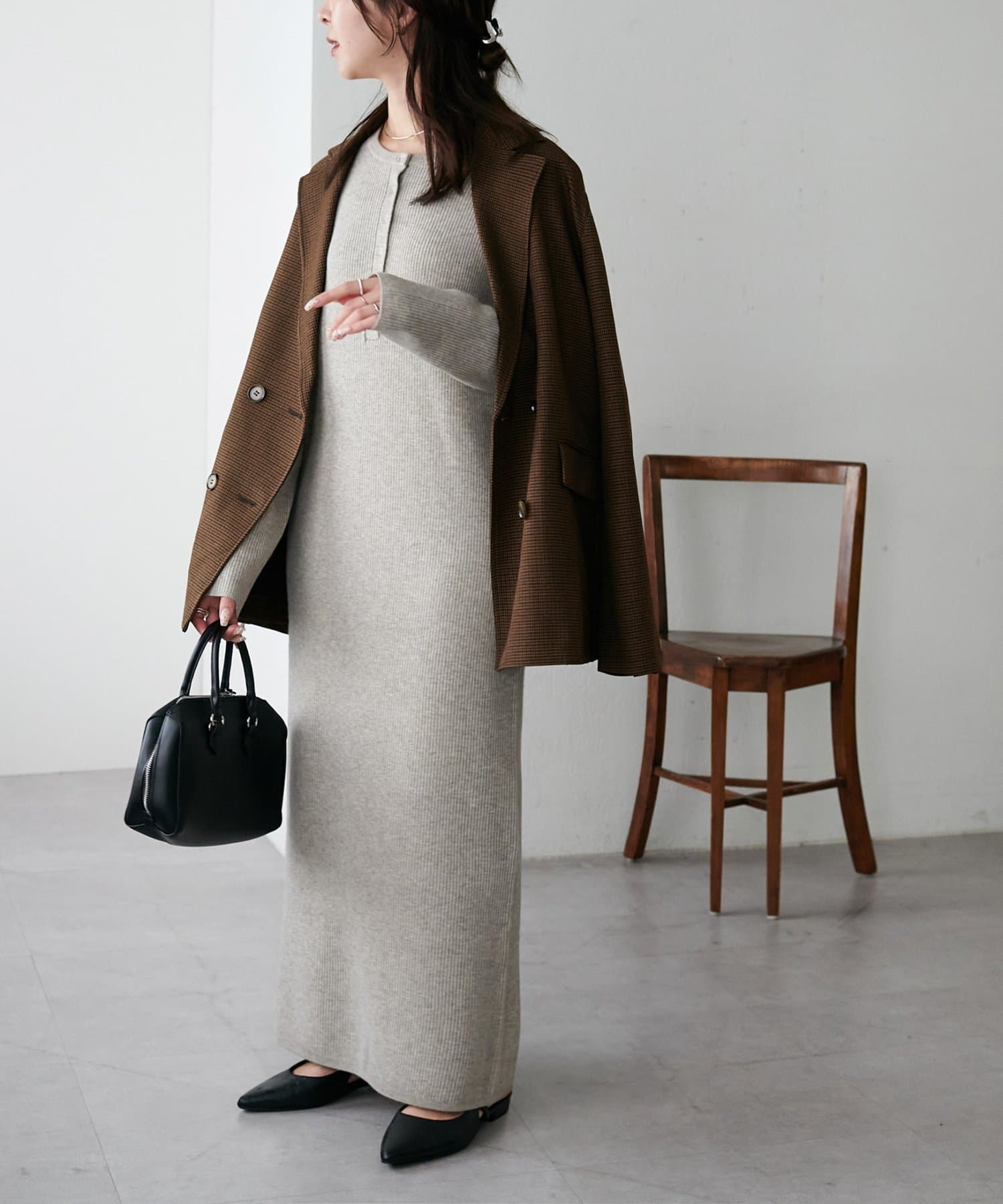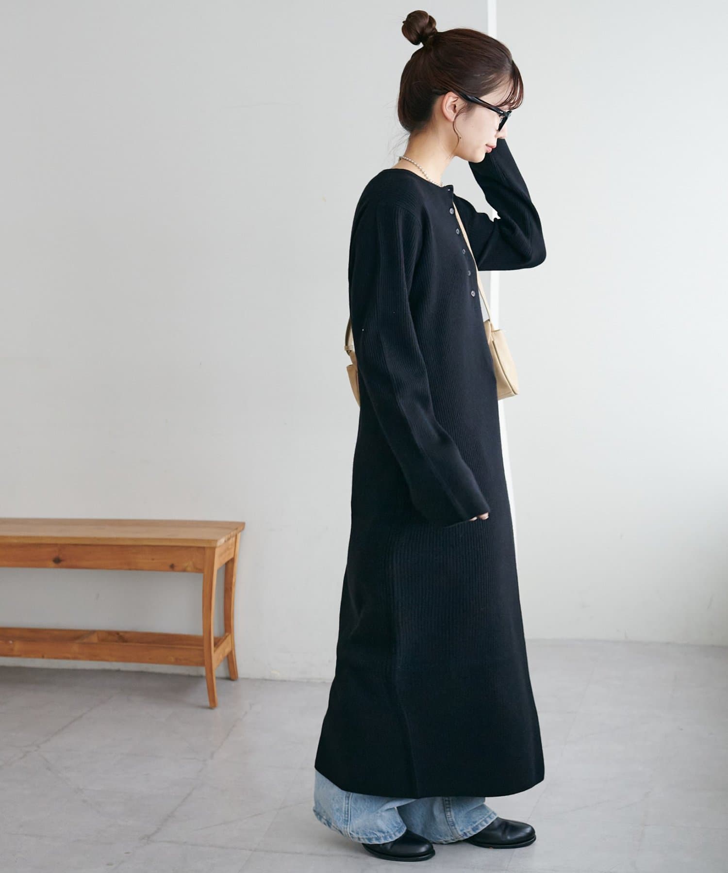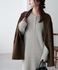 シンプルながらも女性らしさを引き立てるヘンリーネックデザインのリブニットワンピース。