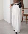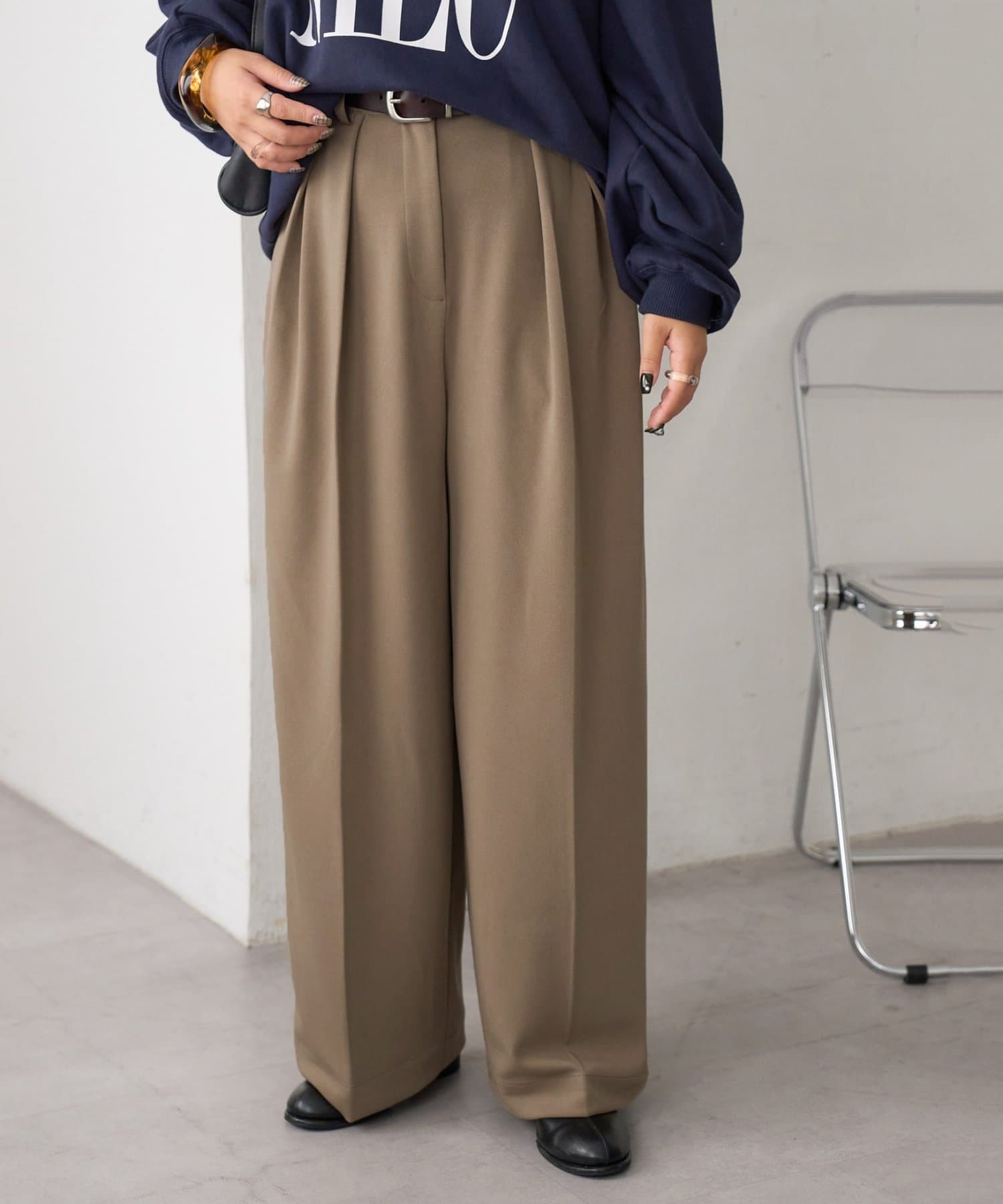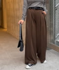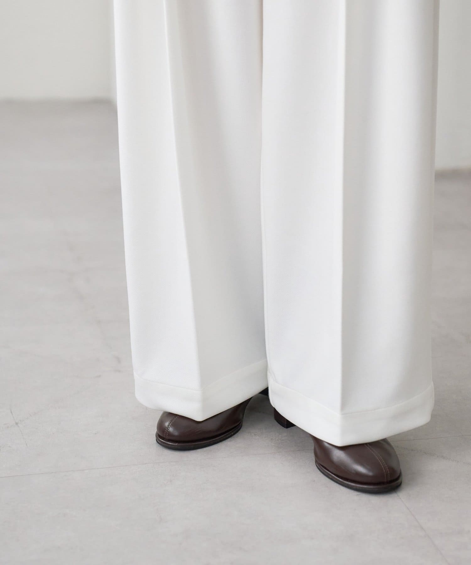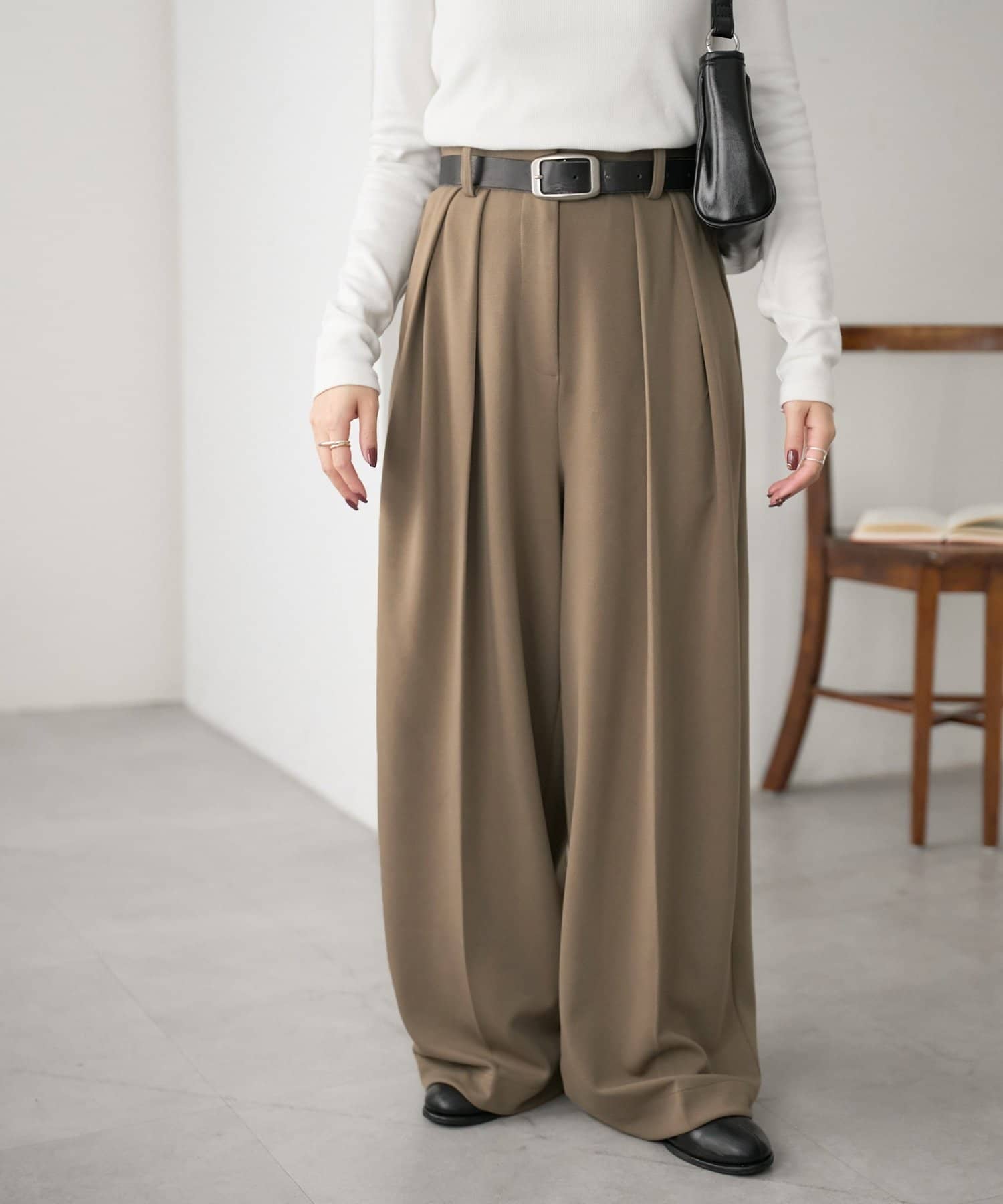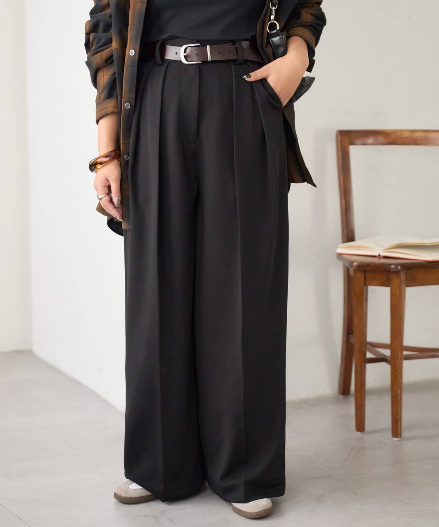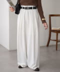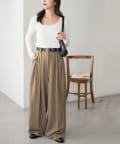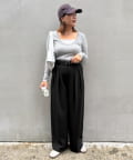 ワイドシルエットながらも、縦のラインを強調するタックとセンタープレスの効果で、全体がすっきりとした印象に仕上がっています。