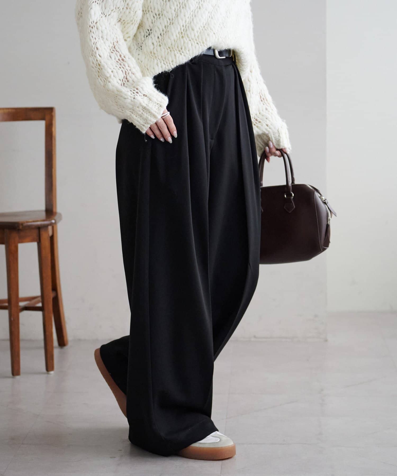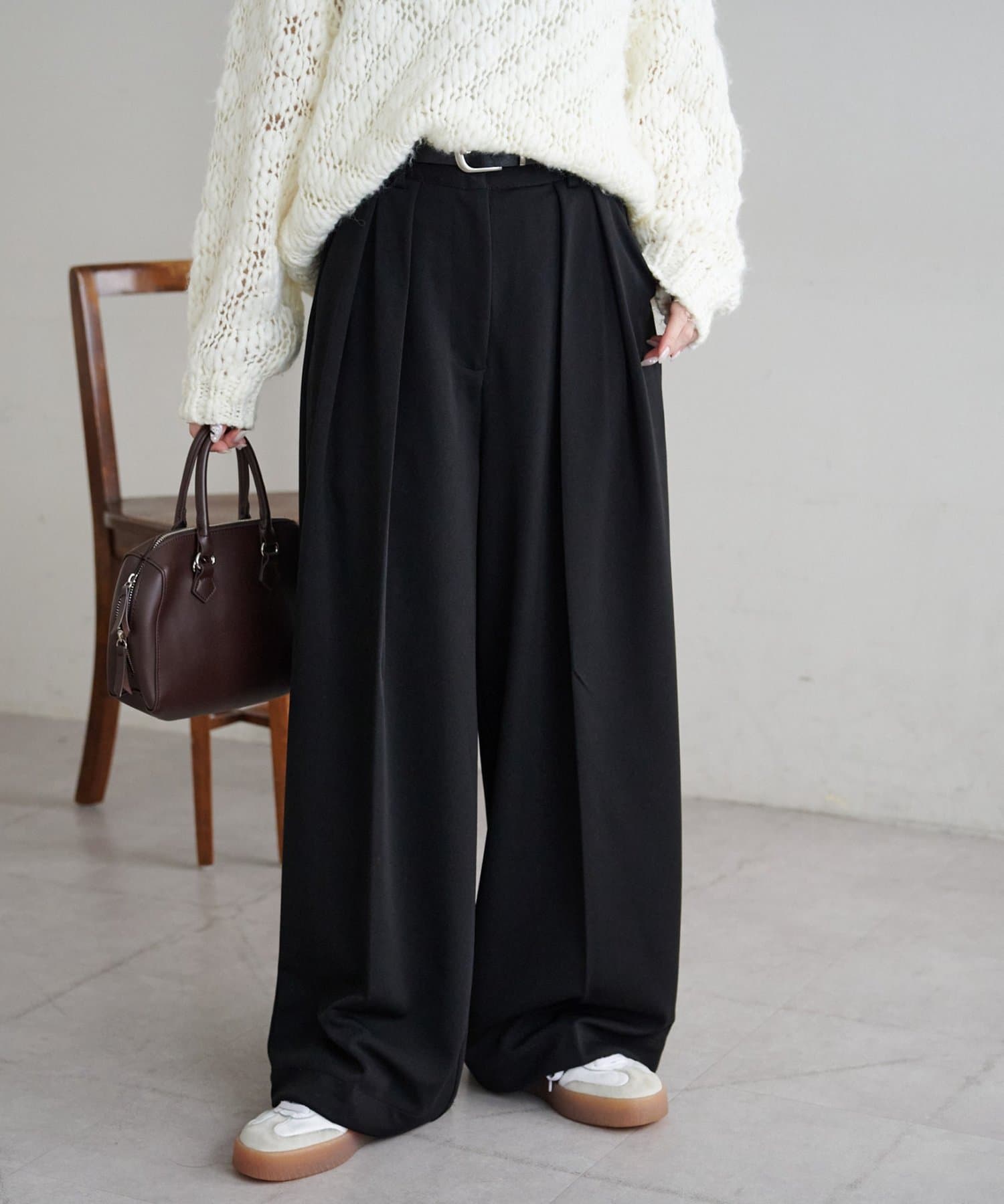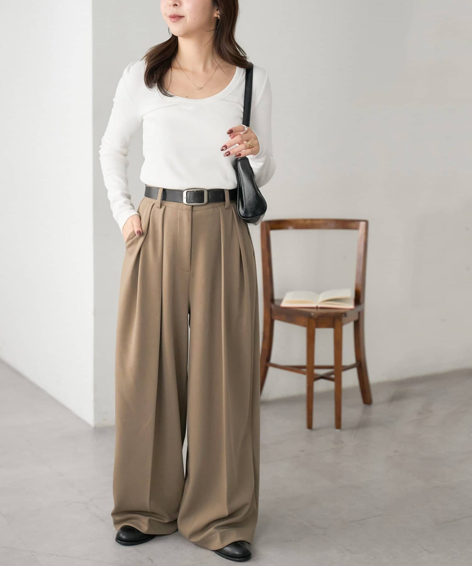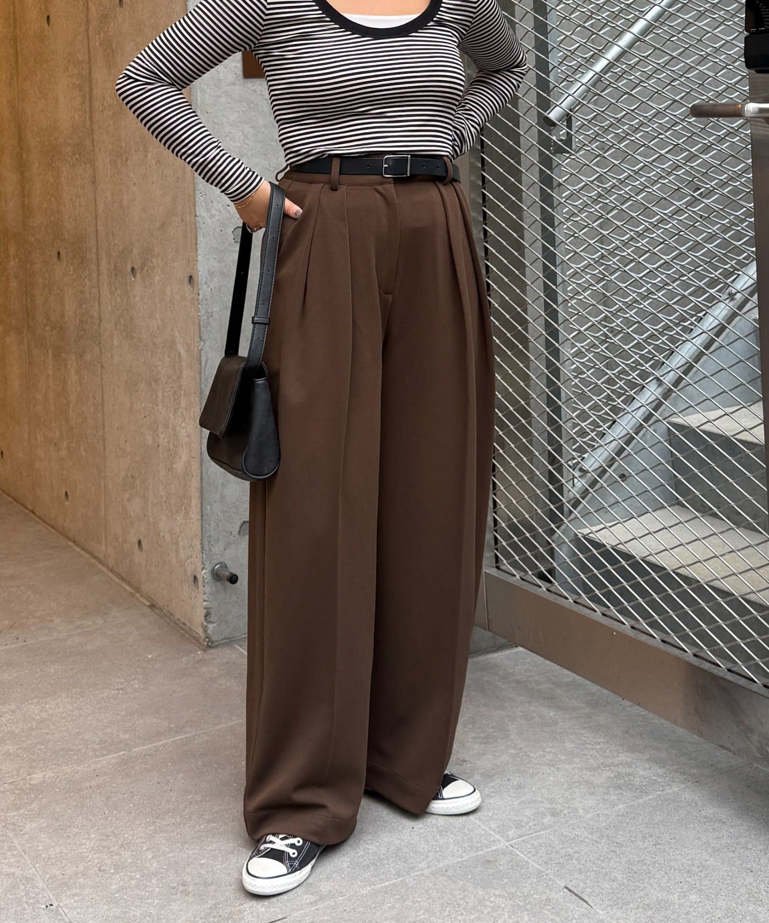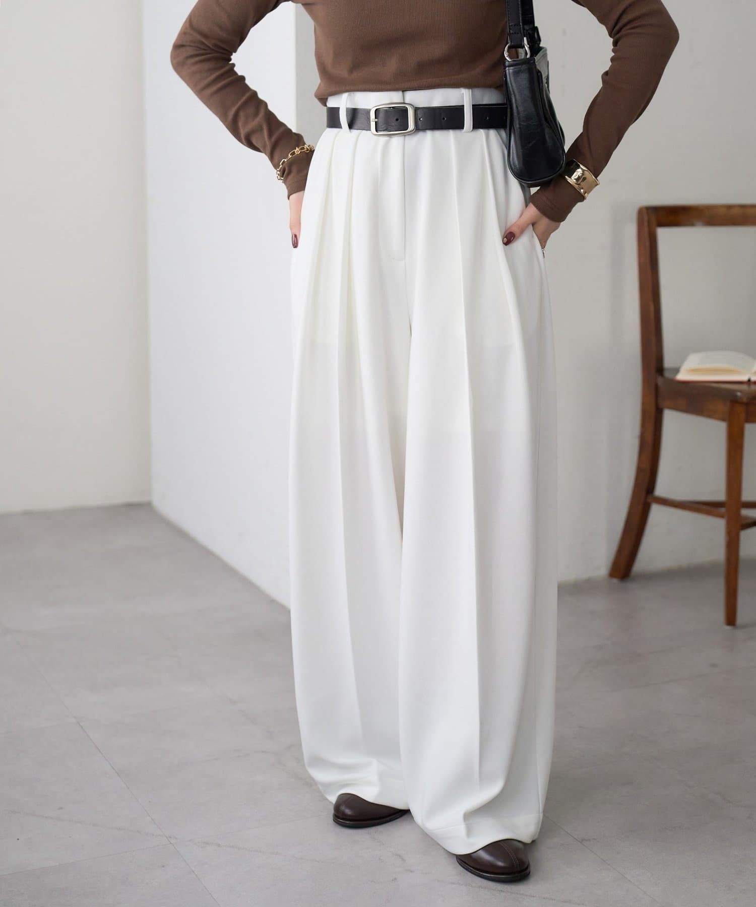 ワイドシルエットながらも、縦のラインを強調するタックとセンタープレスの効果で、全体がすっきりとした印象に仕上がっています。
