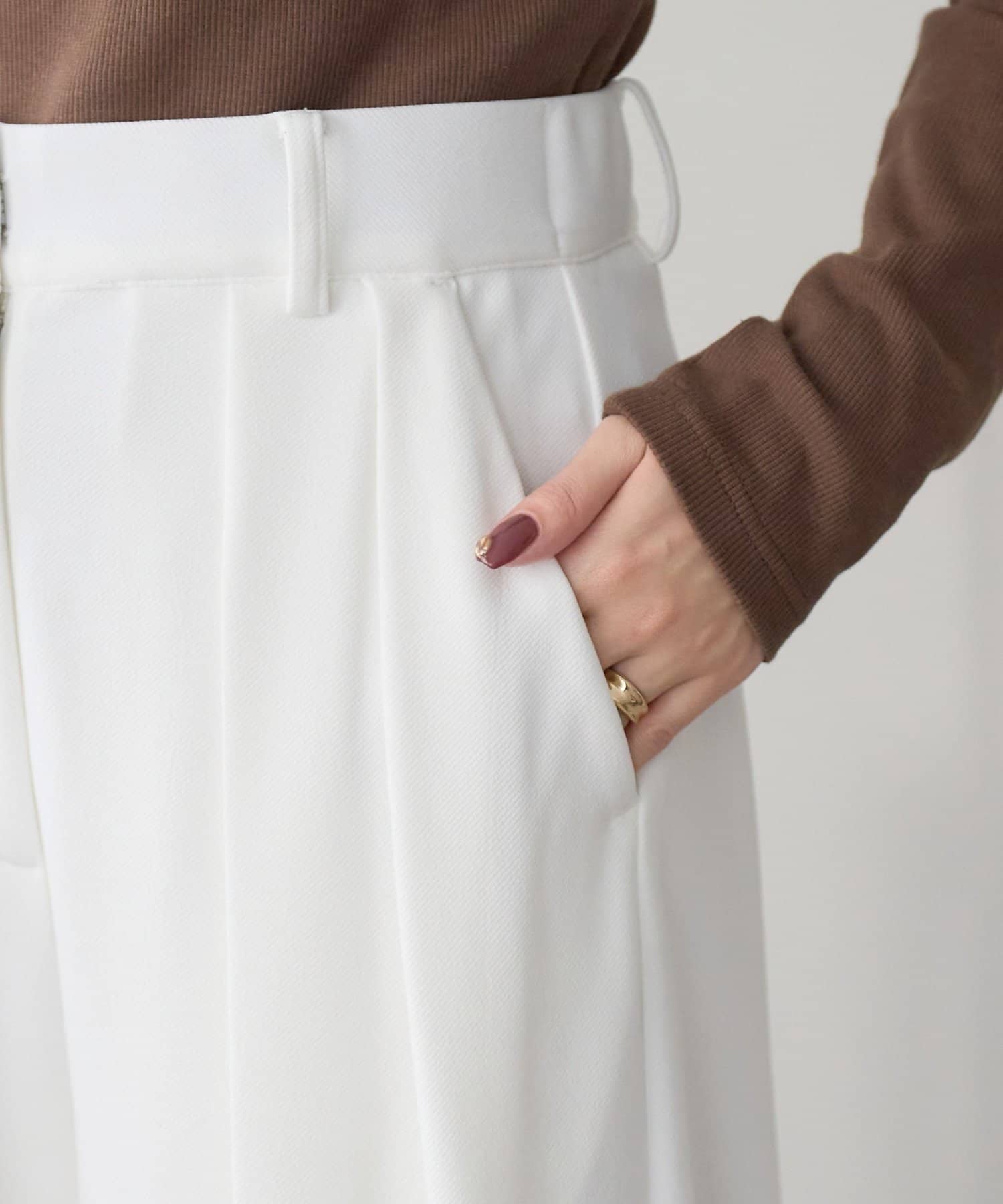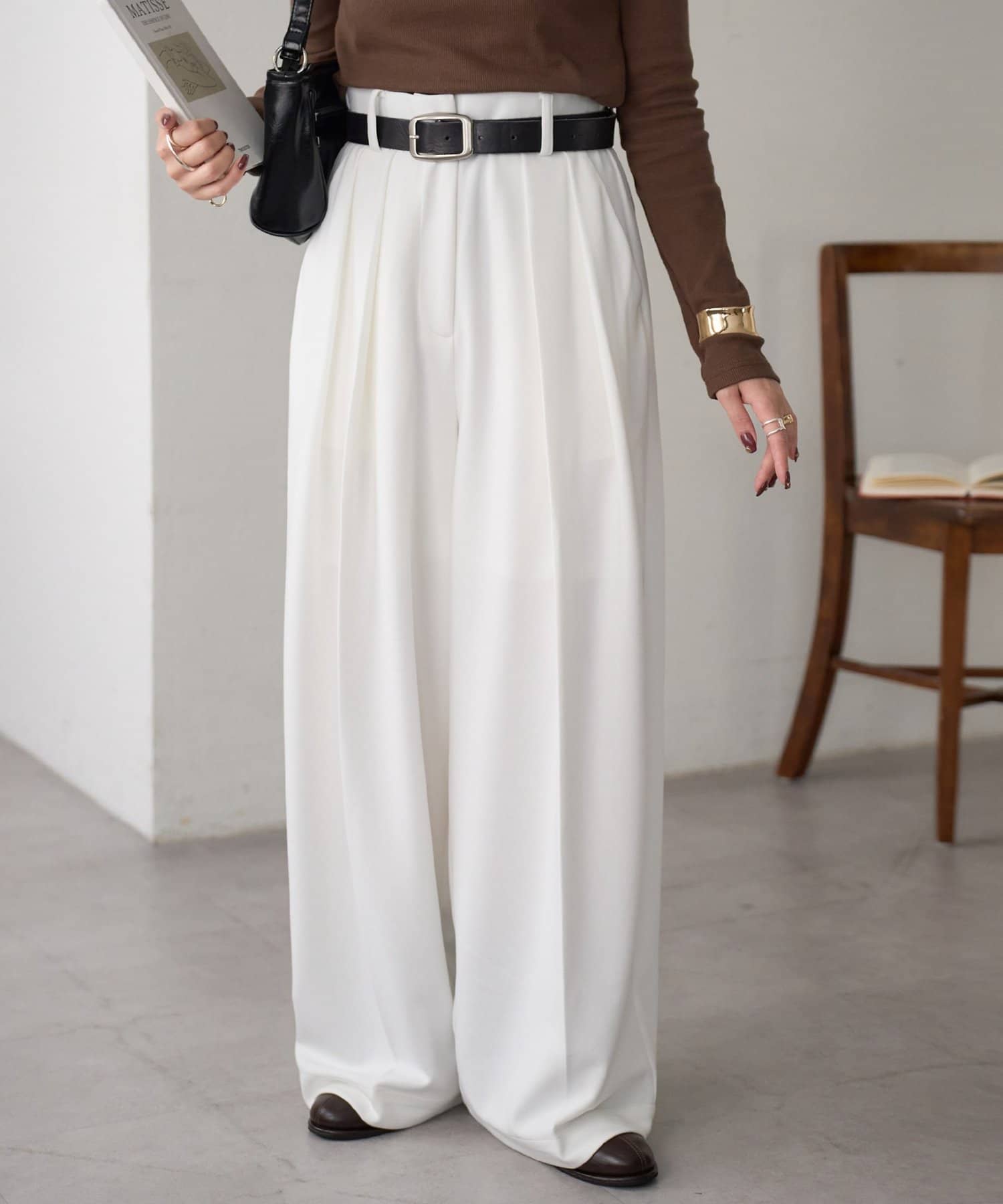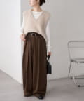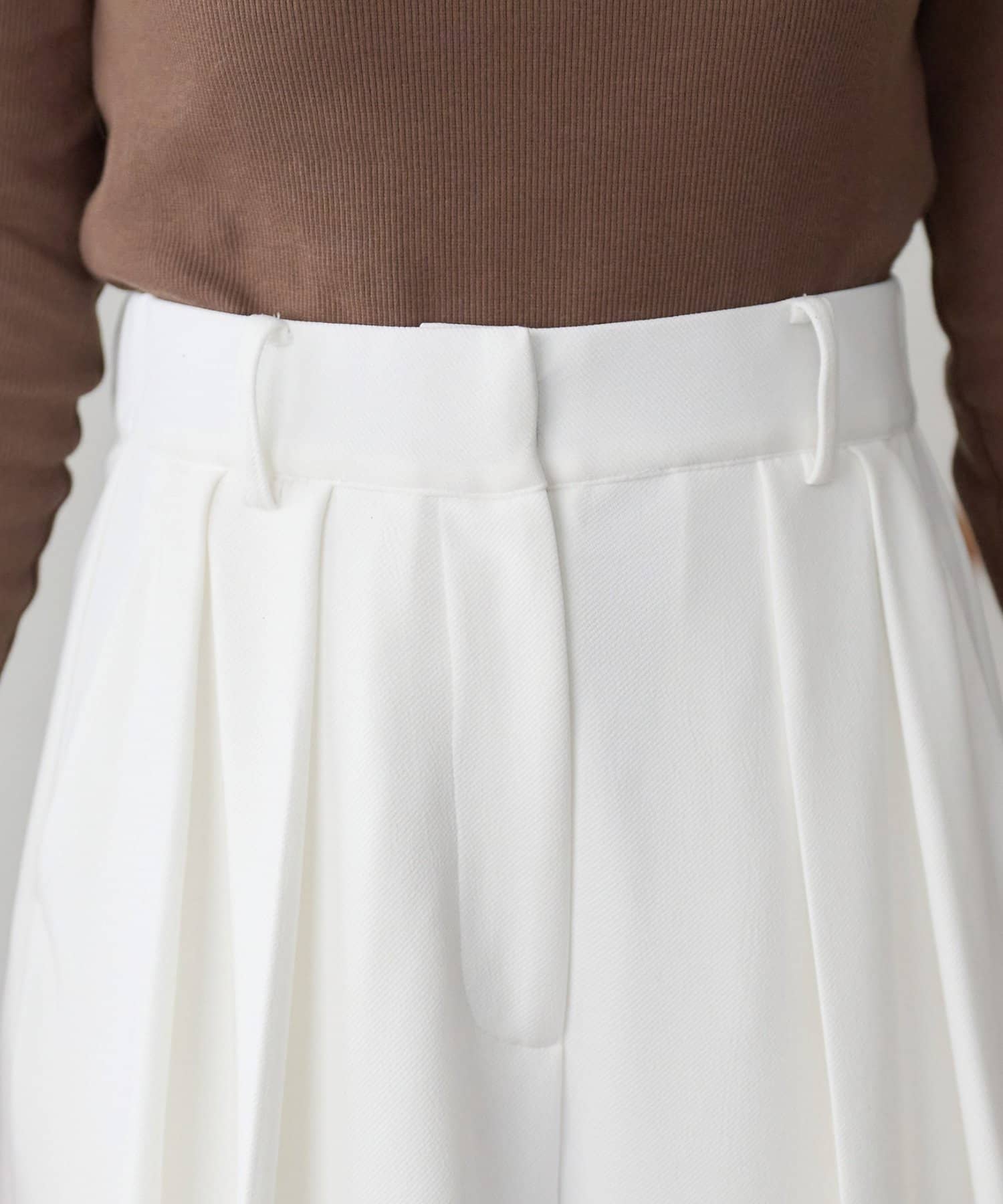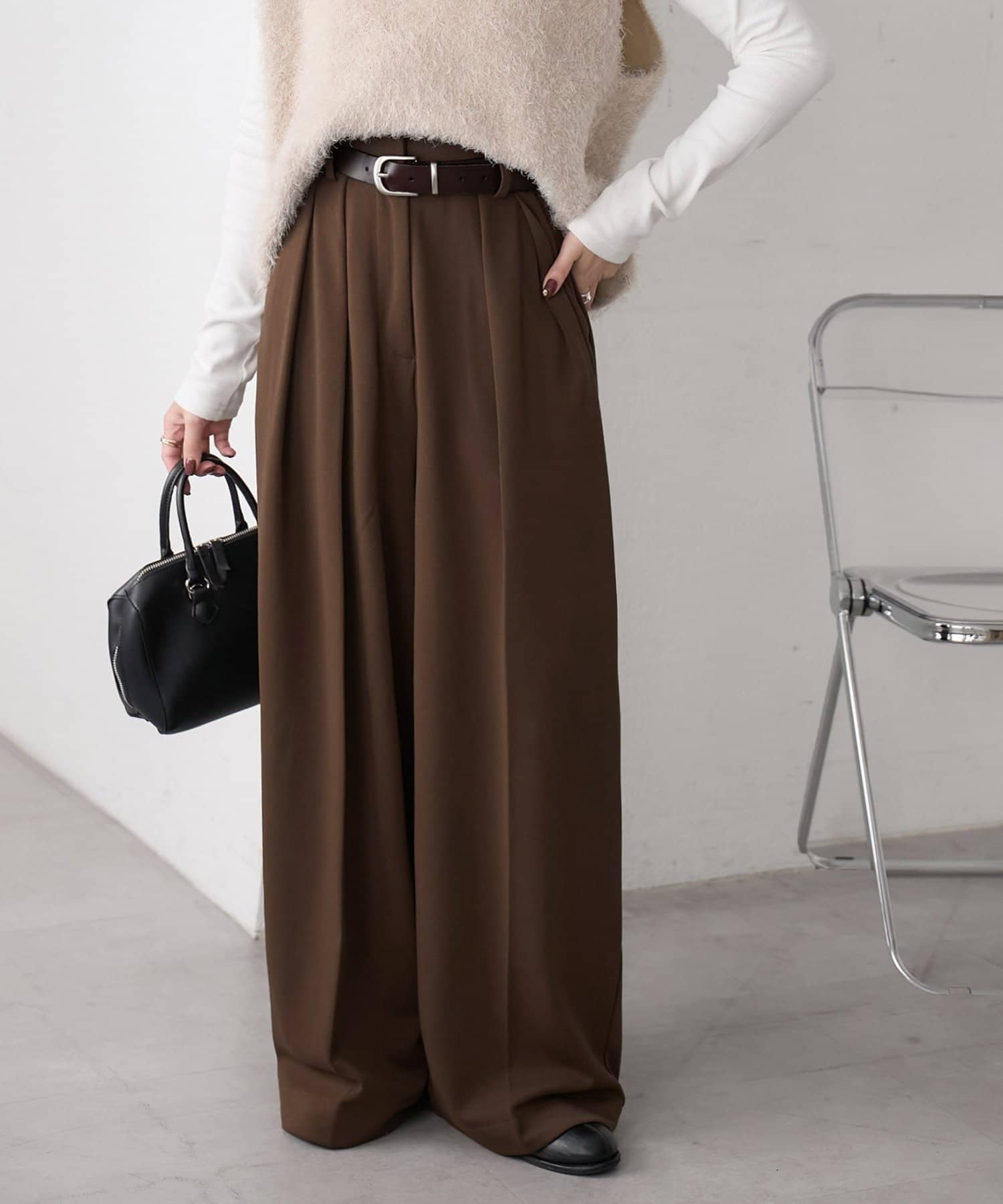 ワイドシルエットながらも、縦のラインを強調するタックとセンタープレスの効果で、全体がすっきりとした印象に仕上がっています。
