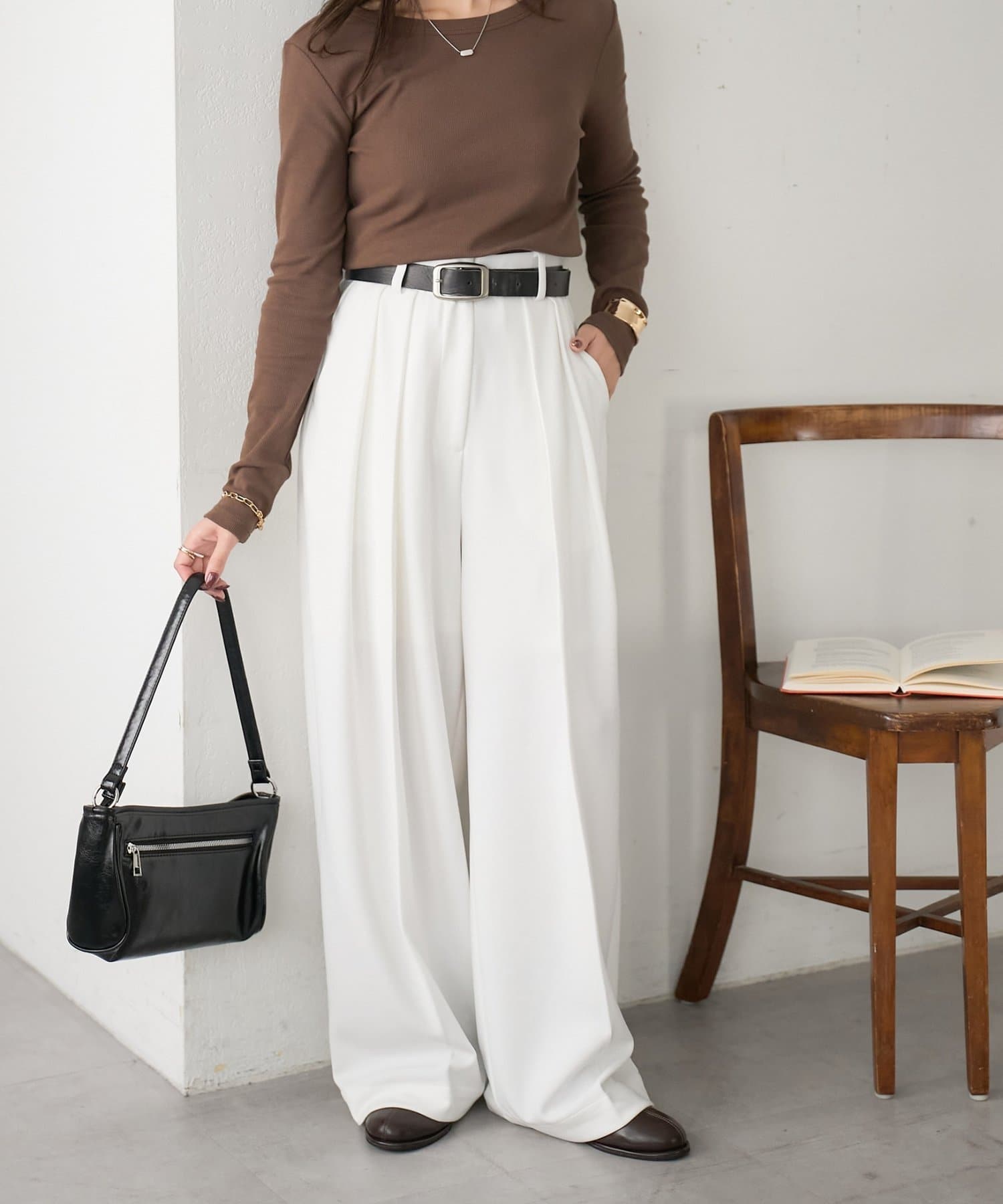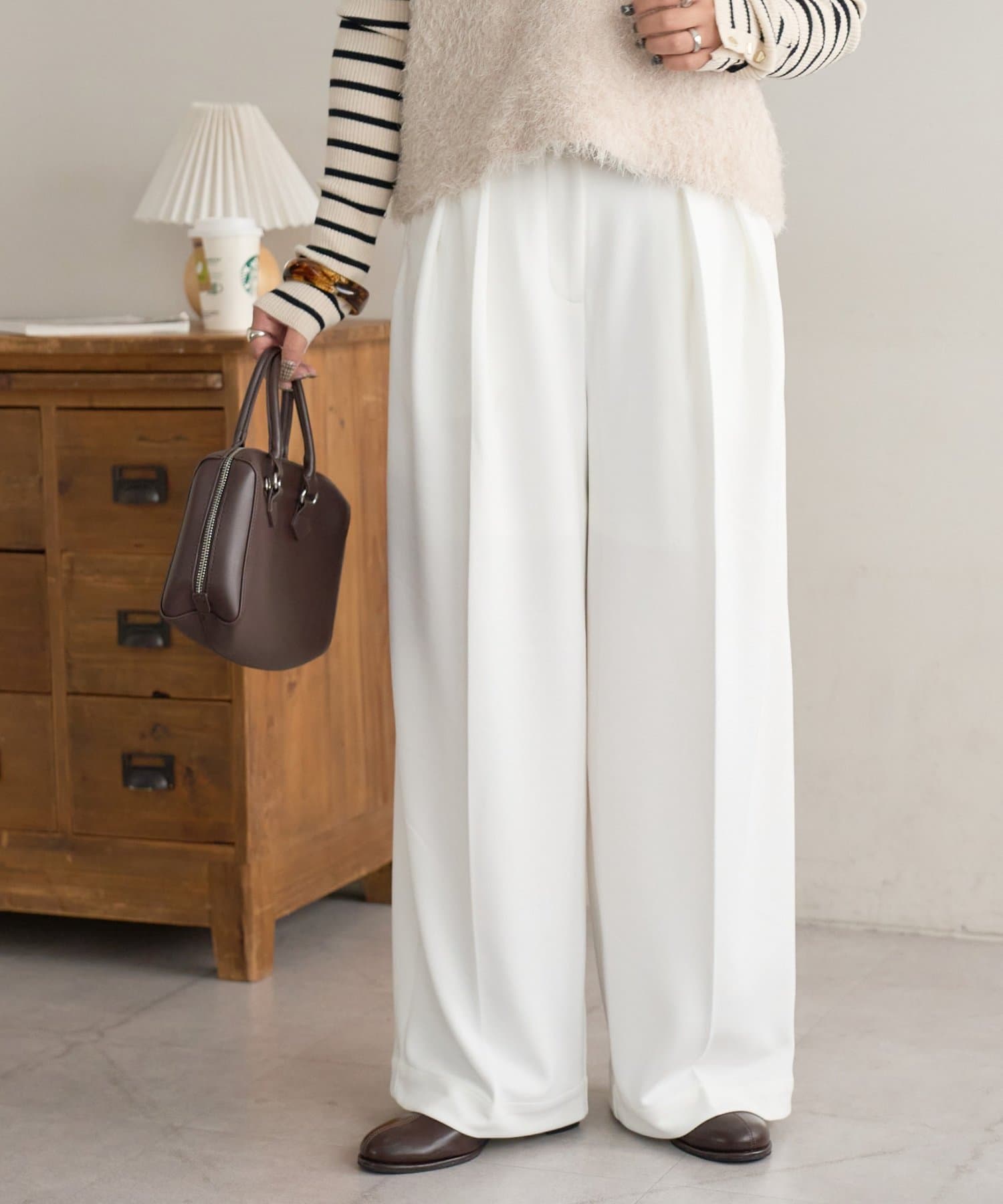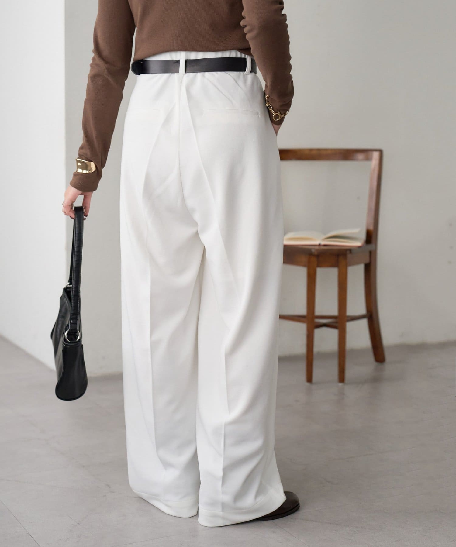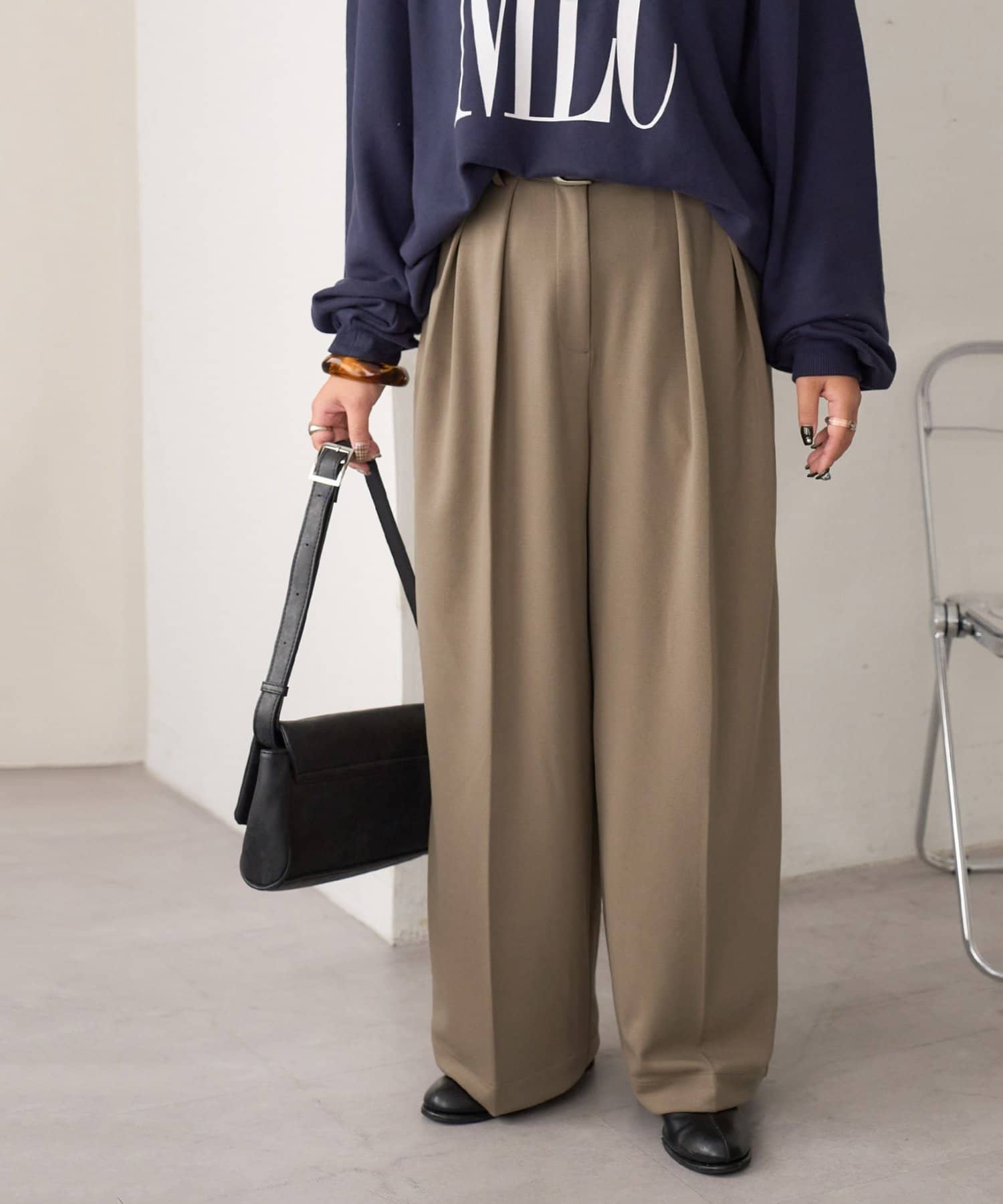 ワイドシルエットながらも、縦のラインを強調するタックとセンタープレスの効果で、全体がすっきりとした印象に仕上がっています。