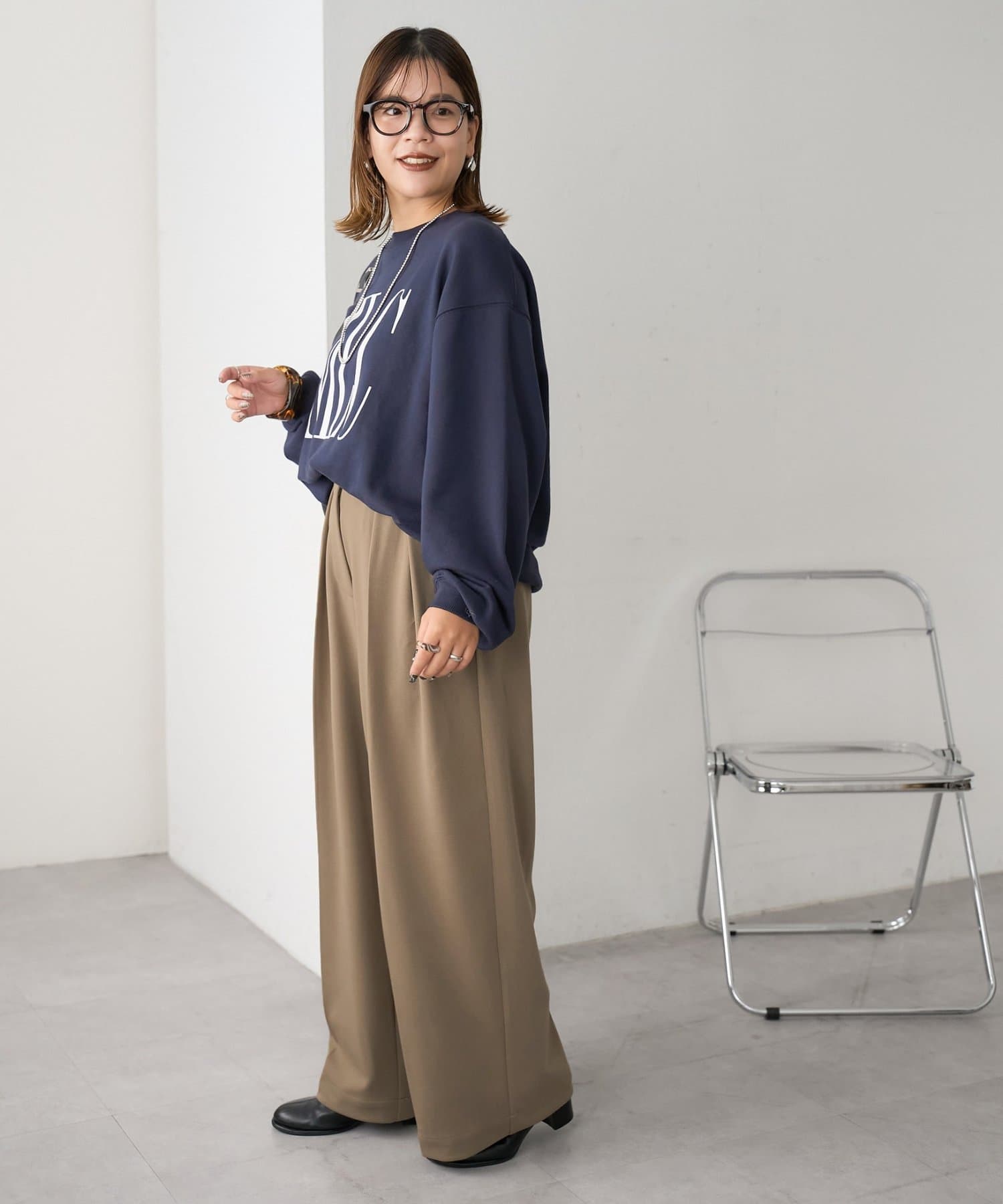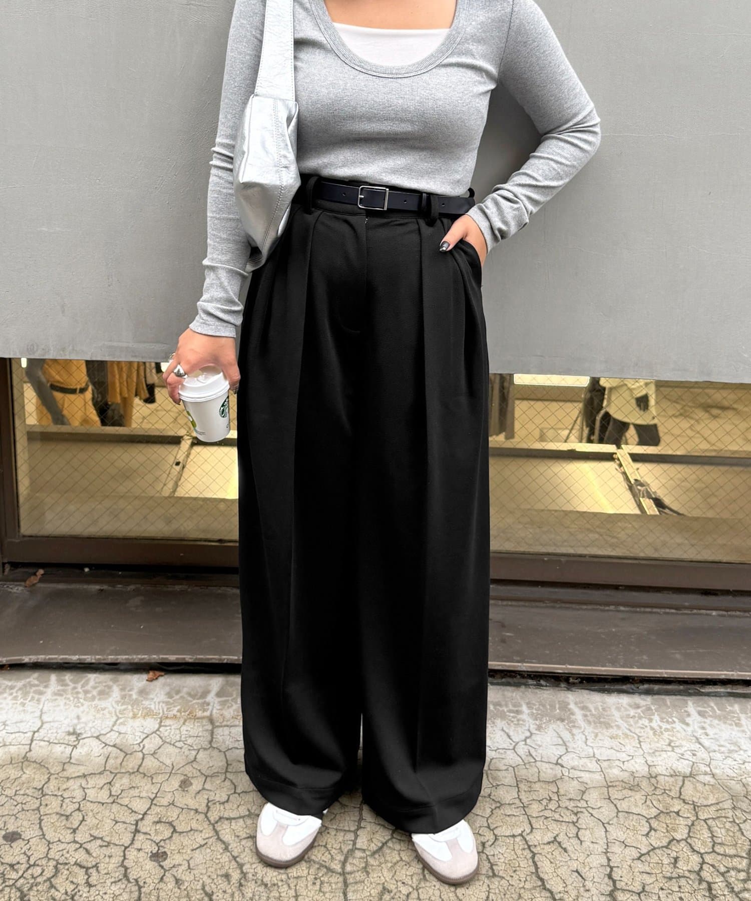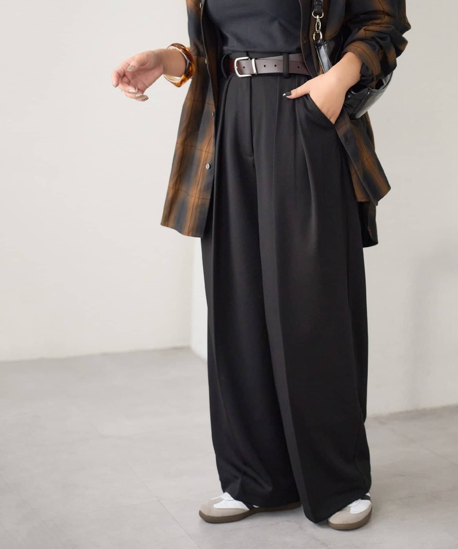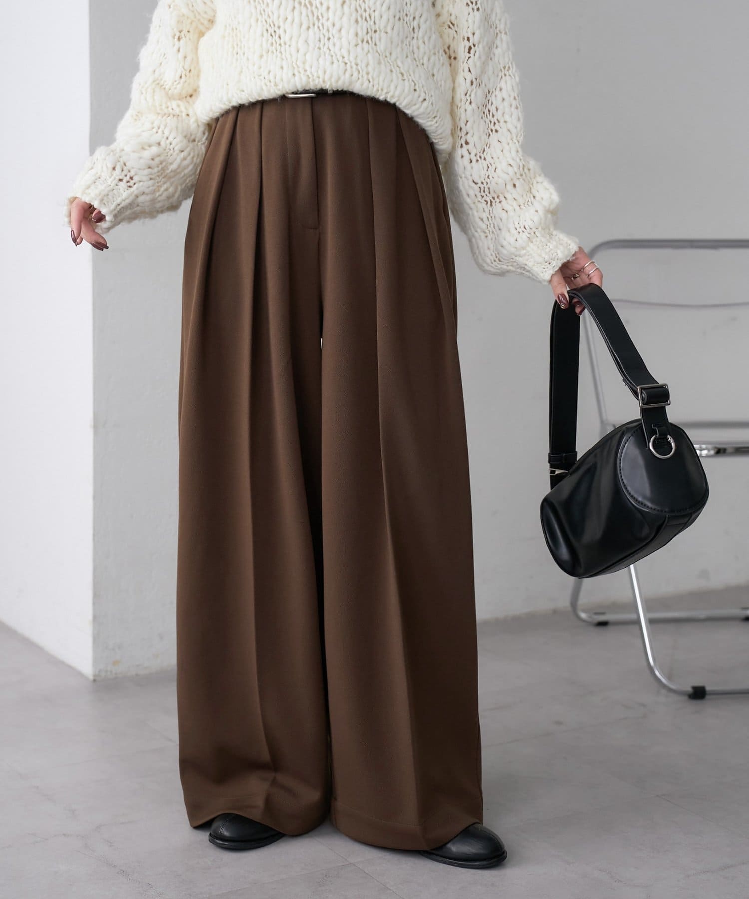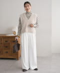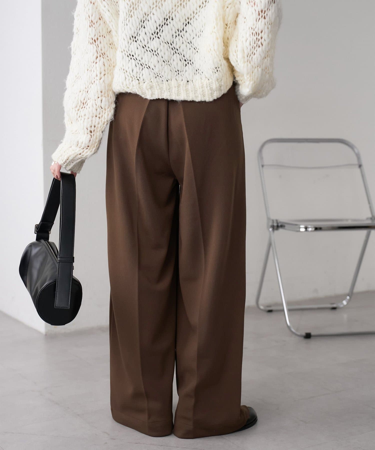 ワイドシルエットながらも、縦のラインを強調するタックとセンタープレスの効果で、全体がすっきりとした印象に仕上がっています。