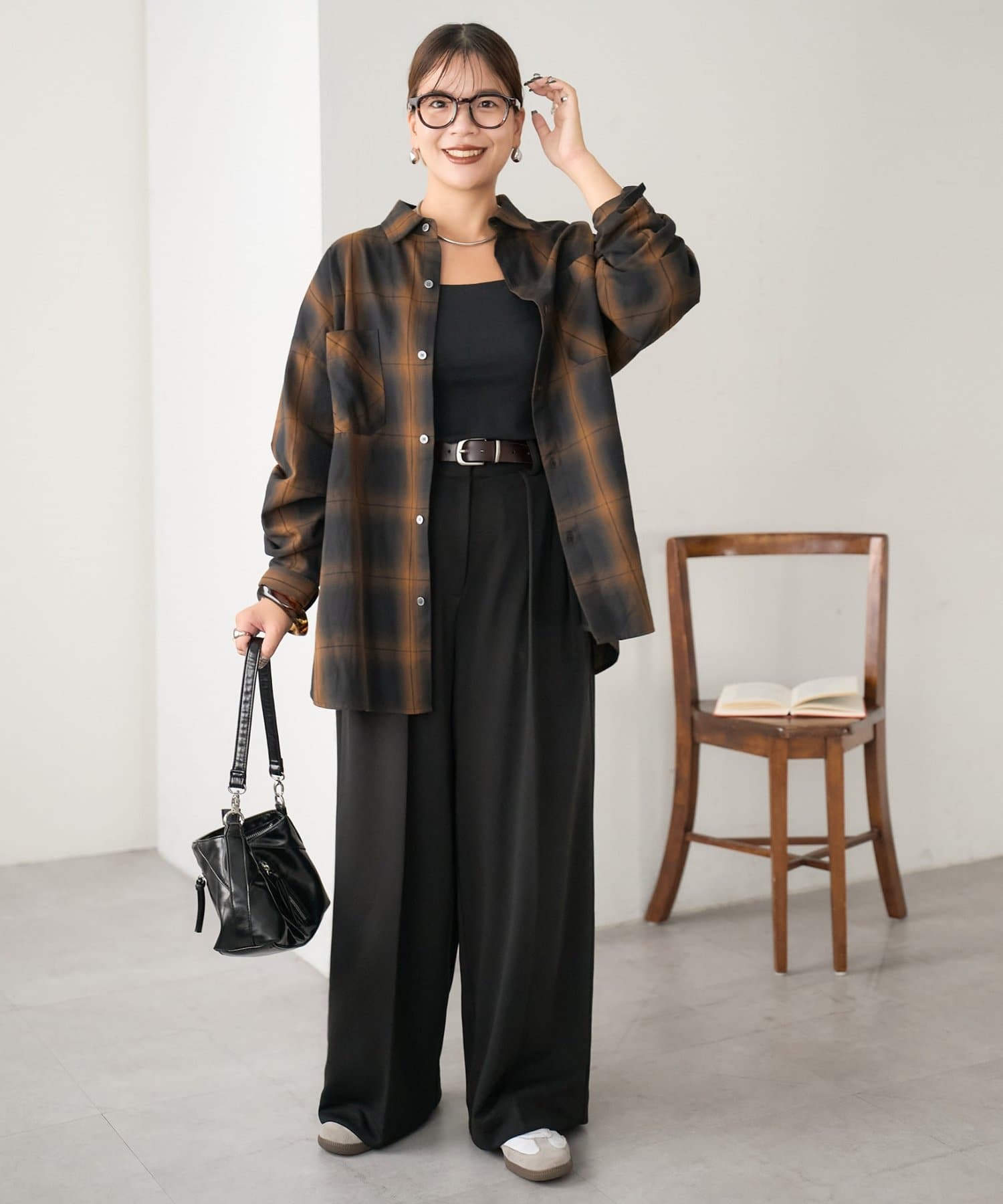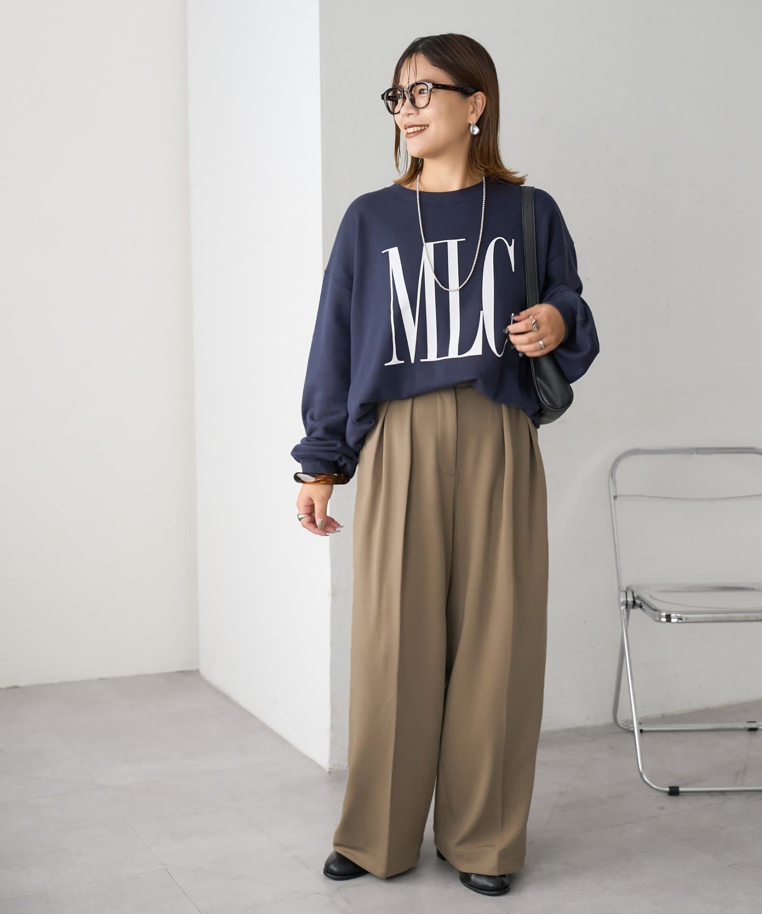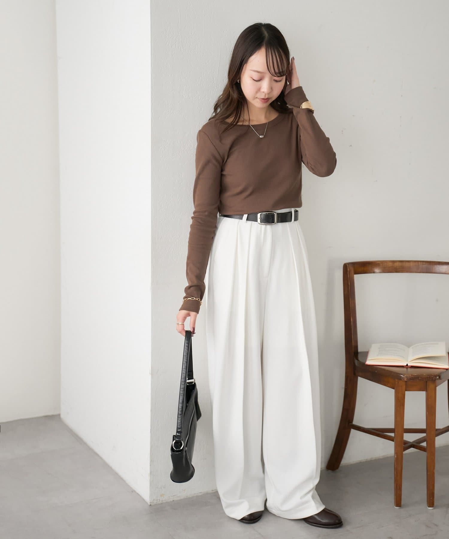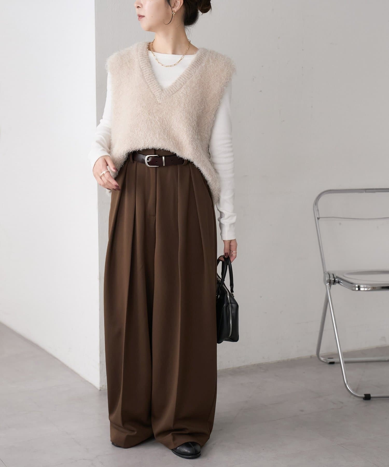 ワイドシルエットながらも、縦のラインを強調するタックとセンタープレスの効果で、全体がすっきりとした印象に仕上がっています。