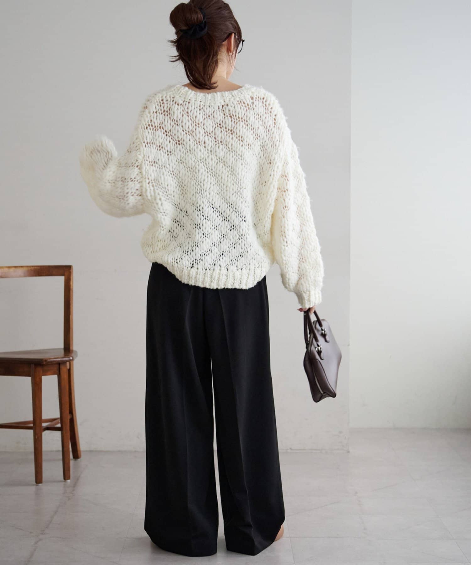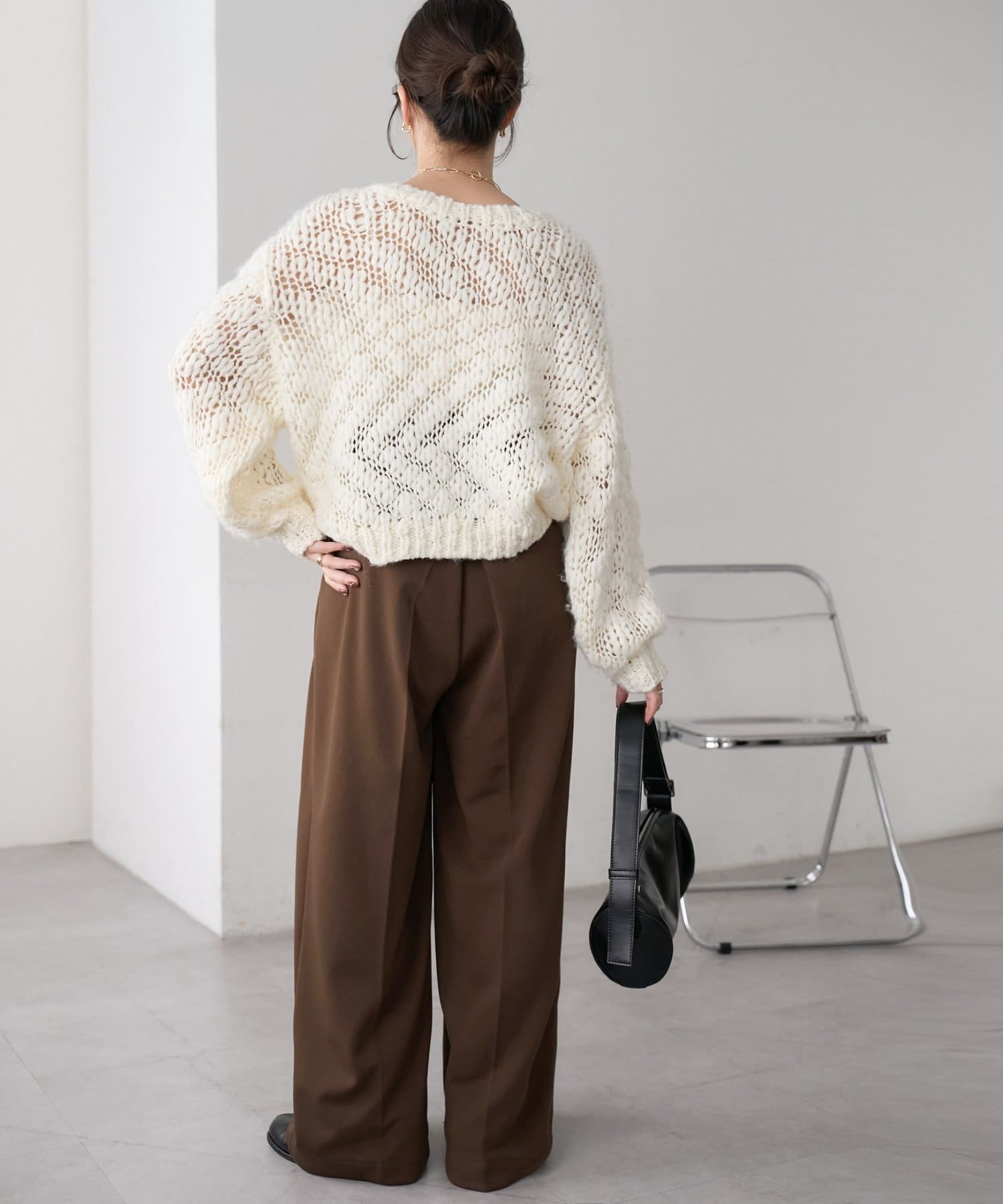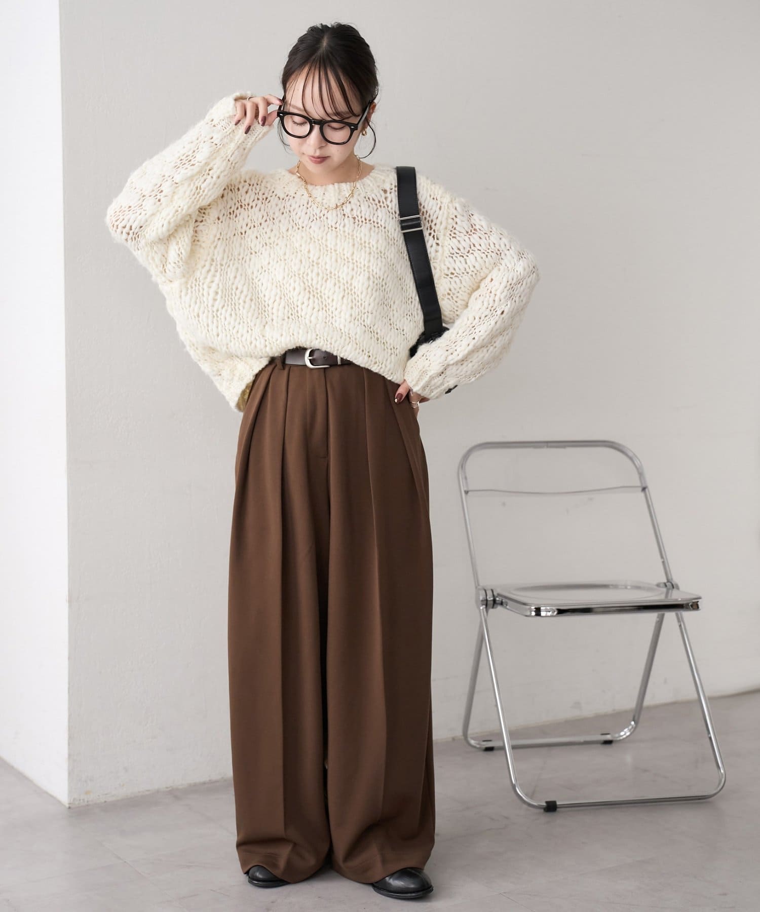 コンパクトなトップスを合わせれば、ウエスト位置が強調されて脚長効果も抜群。オーバーサイズのニットやスウェットをラフに合わせても、センタープレスが効いていることでだらしなく見えず、バランスよく着こなせます。シャツやブラウス、ジャケットと合わせればオフィススタイルにも◎
