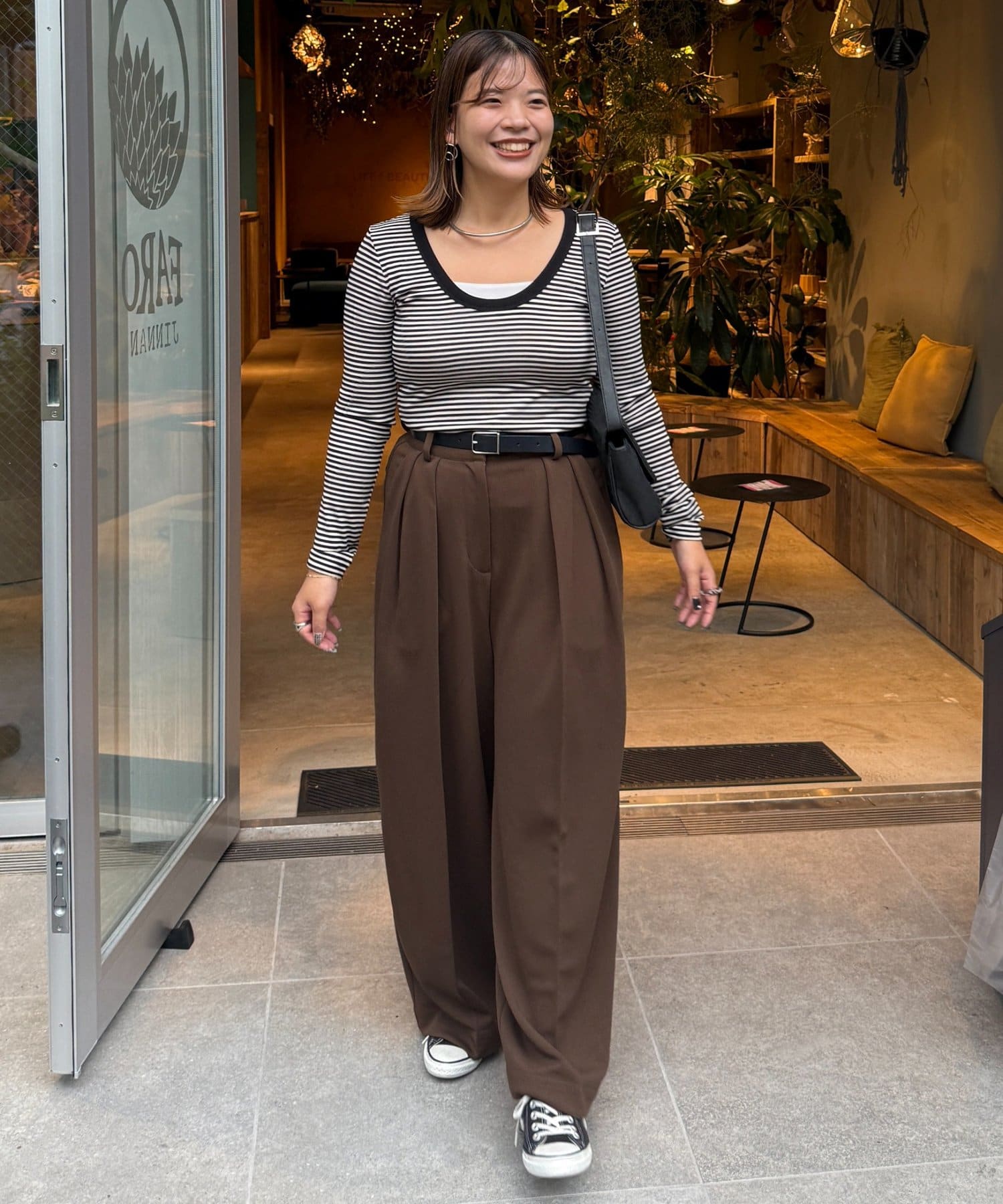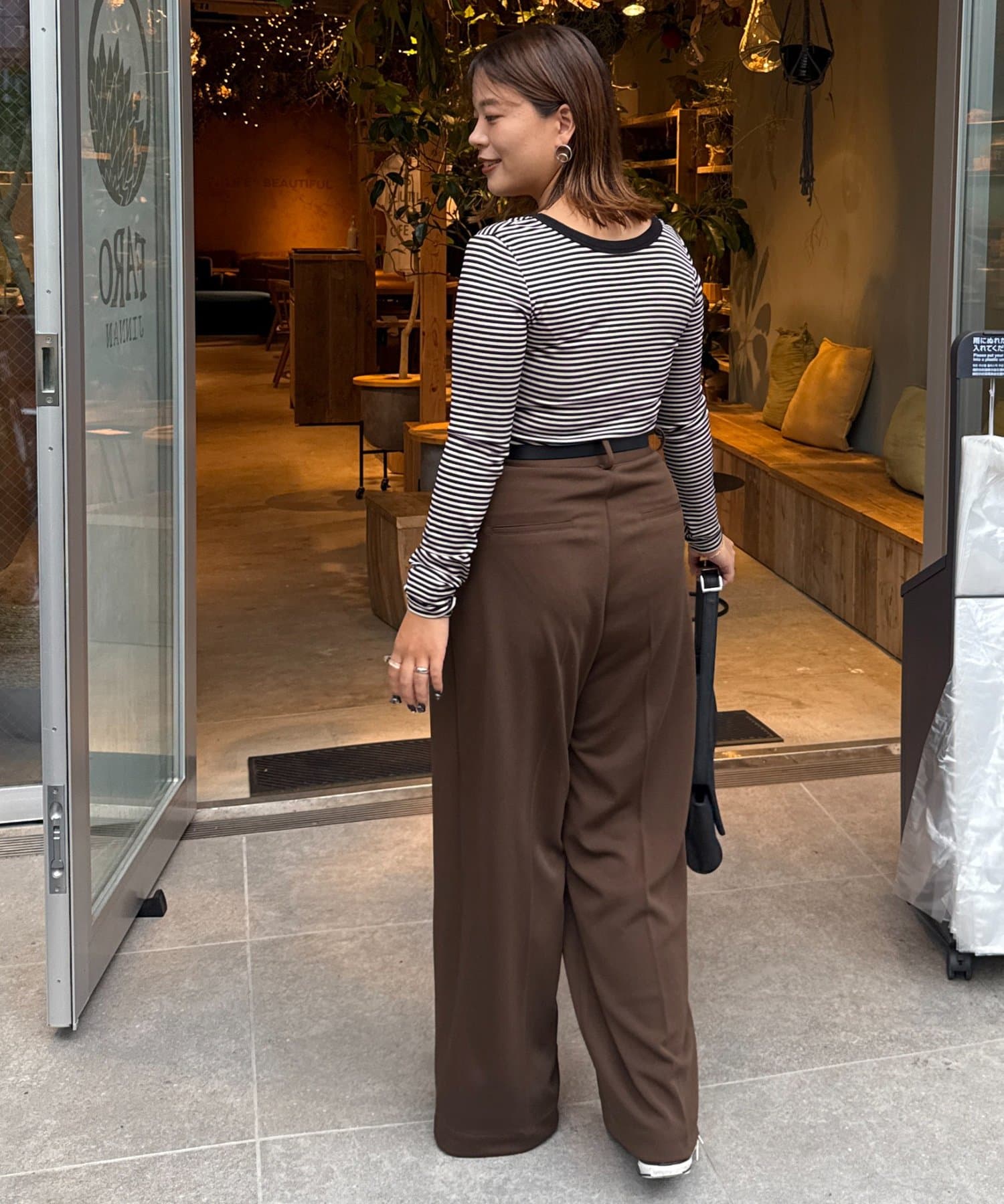 153cmスタッフ(Sサイズ着用):ブーツでもスニーカーでも合わせやすい丈感です。