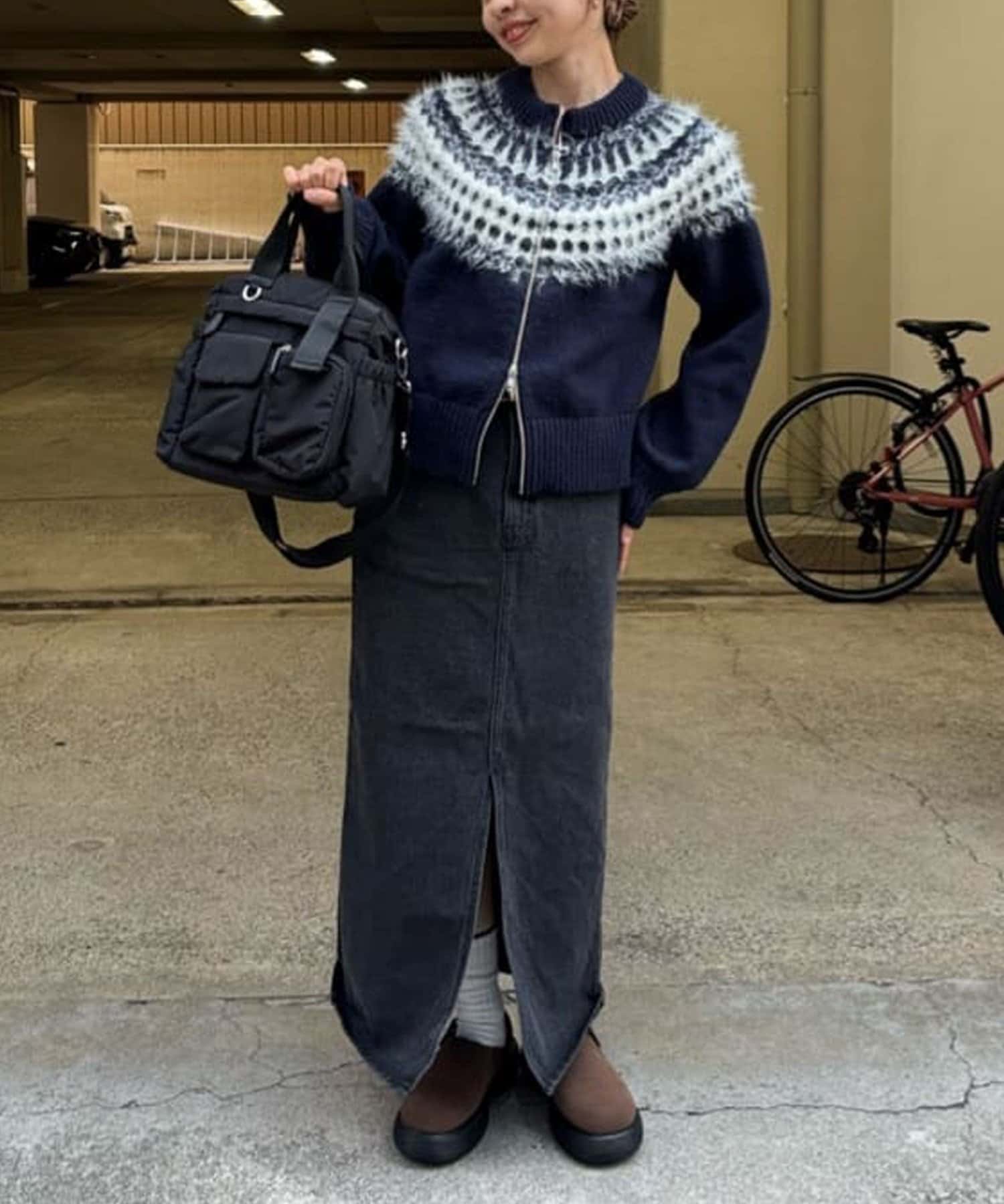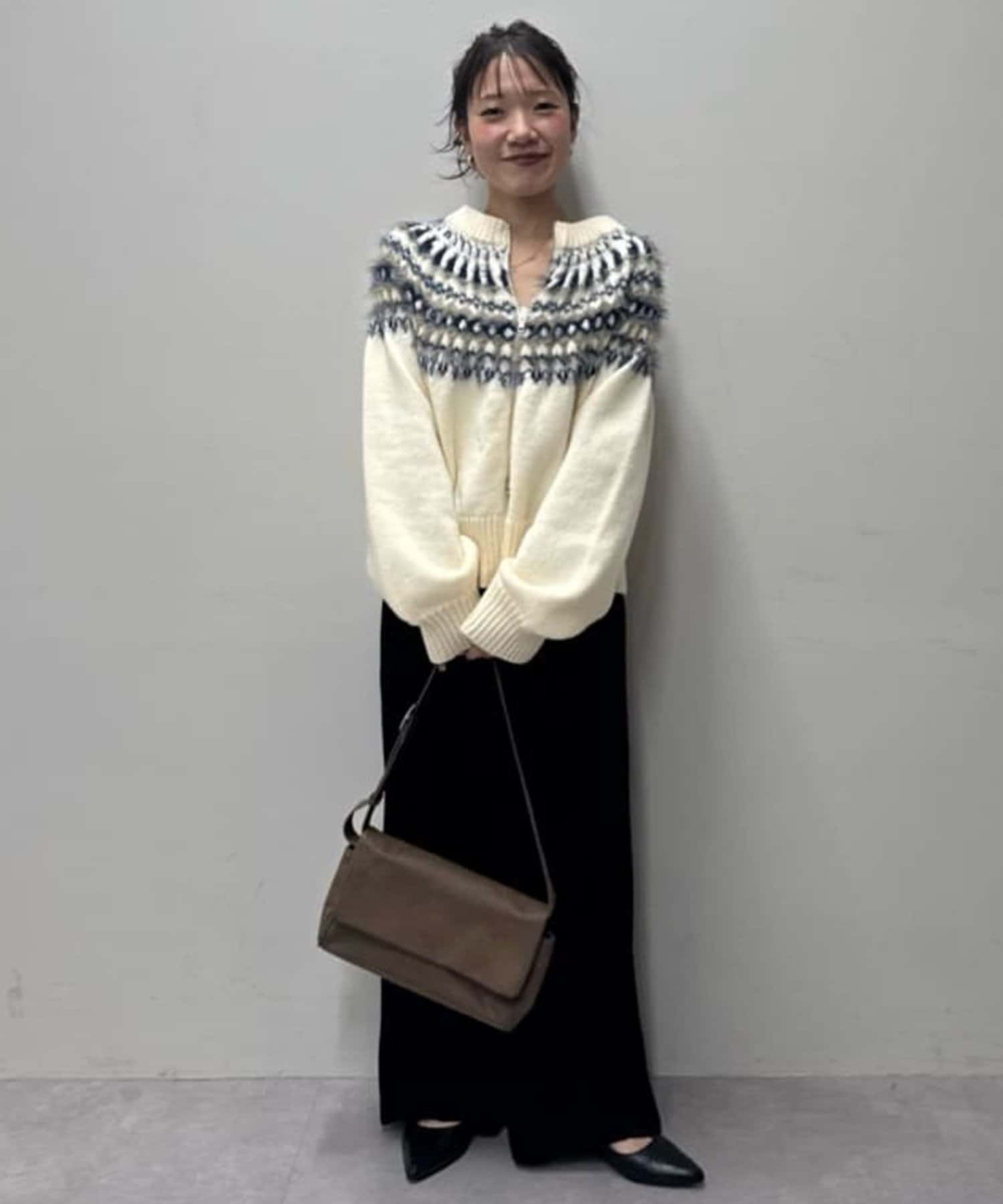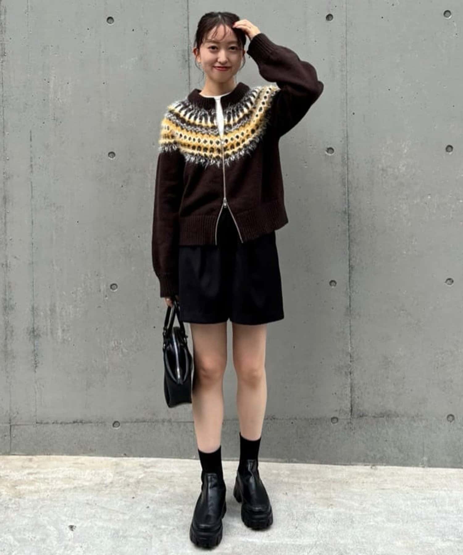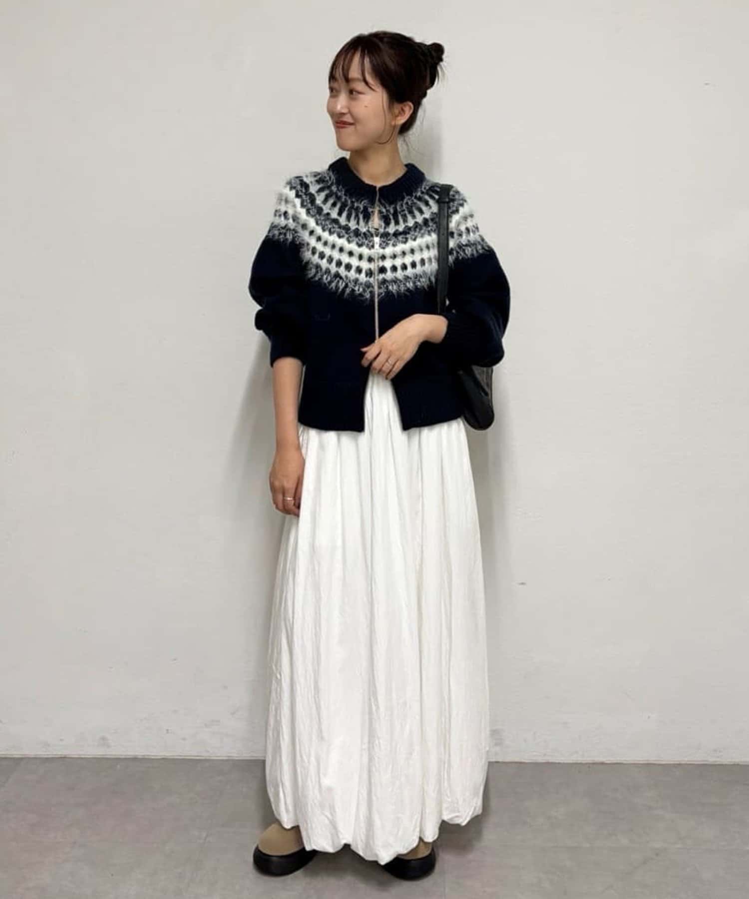 155cmスタッフ:求心柄デザインがコーデの主役に!ジップを少し開けると抜け感がでるのでおすすめです◎