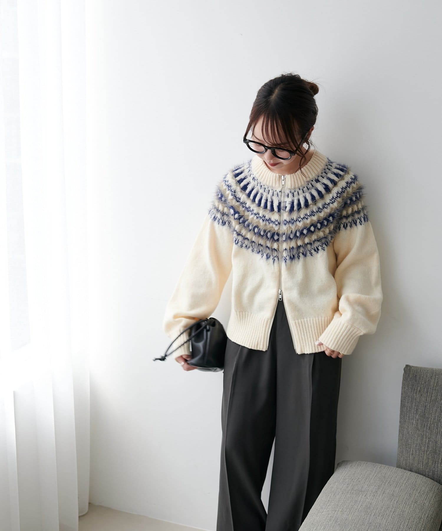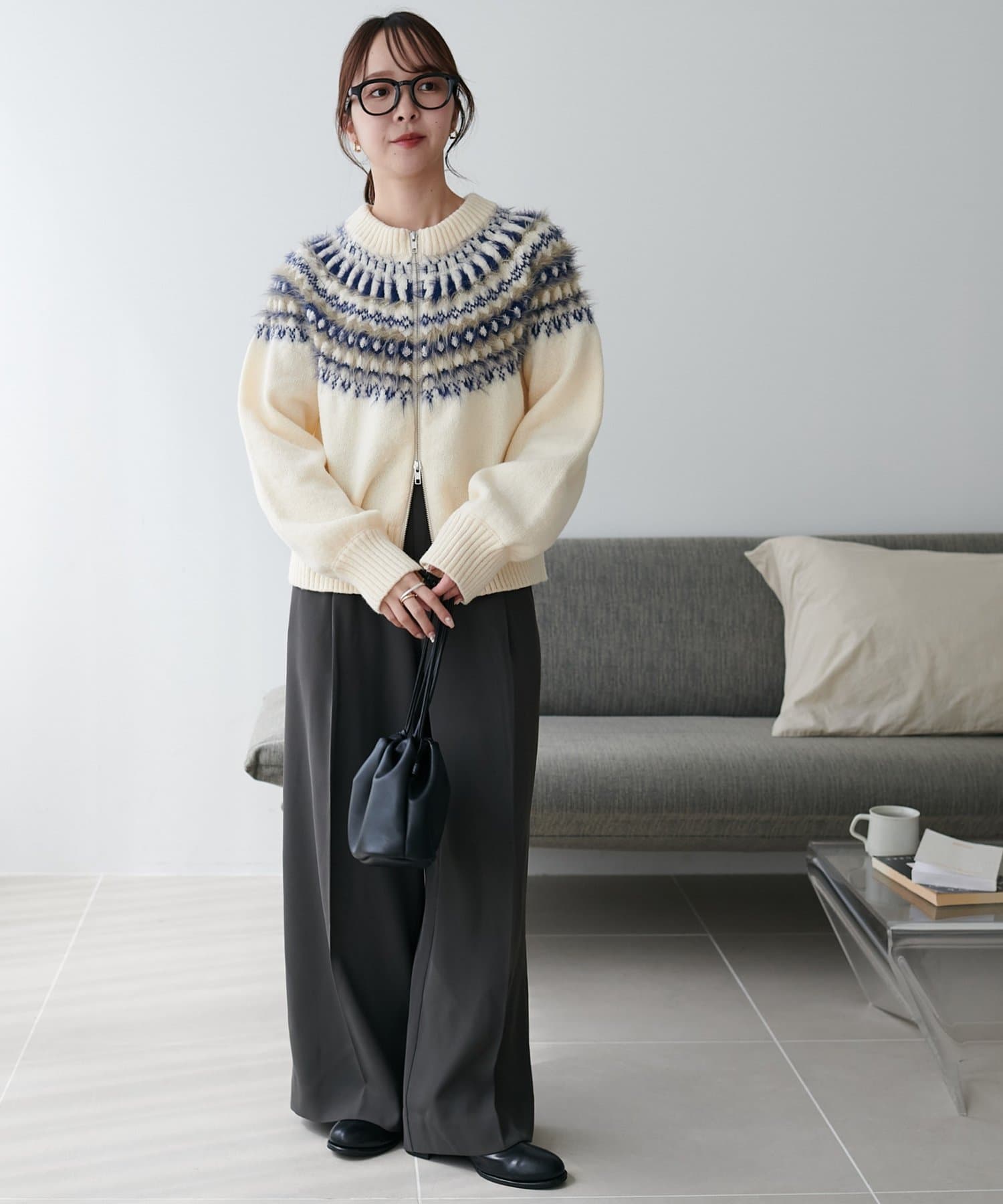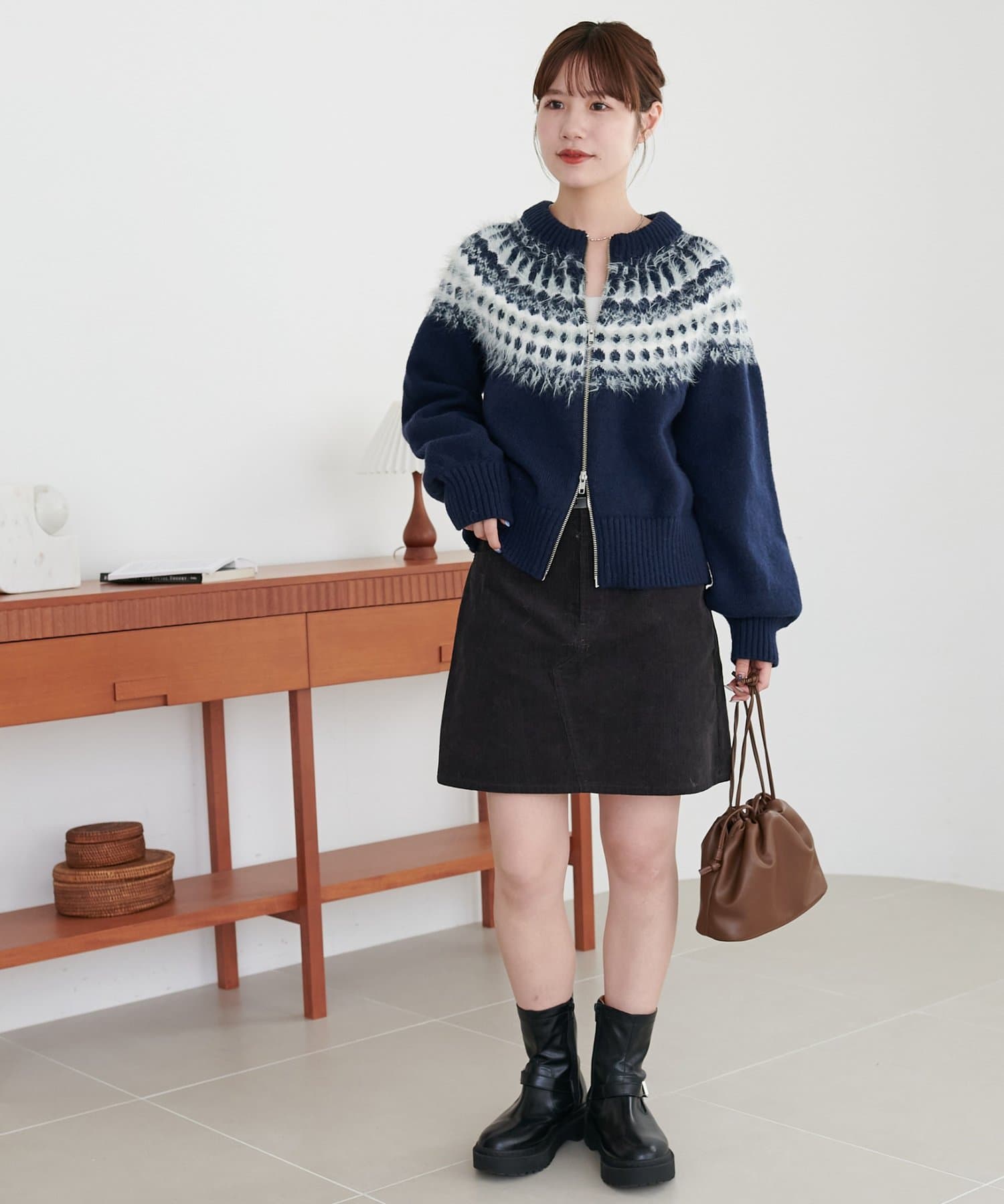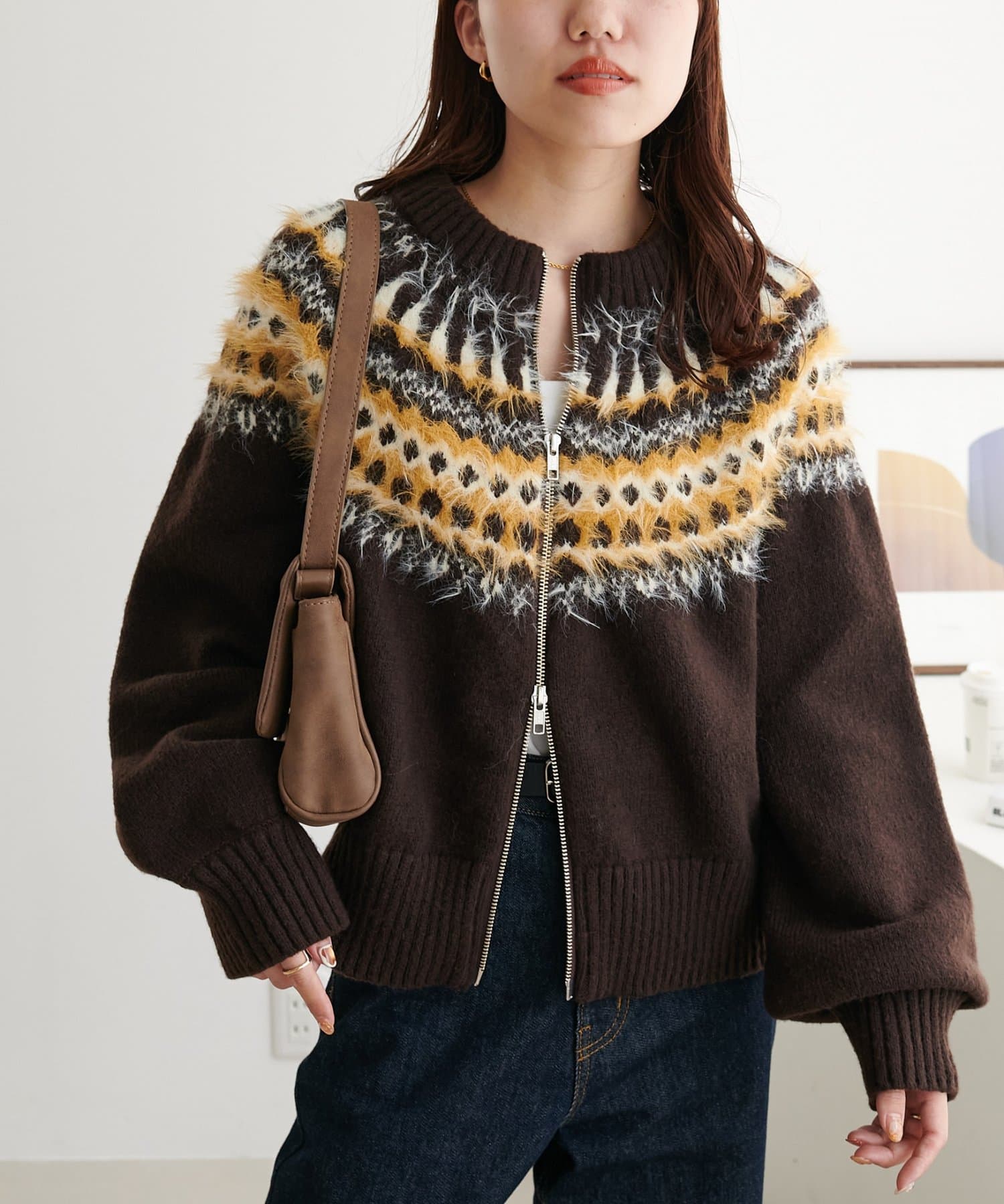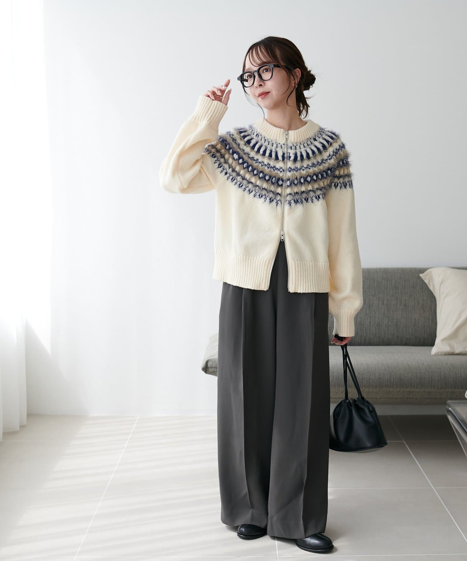 155cmスタッフ:求心柄デザインがコーデの主役に!ジップを少し開けると抜け感がでるのでおすすめです◎