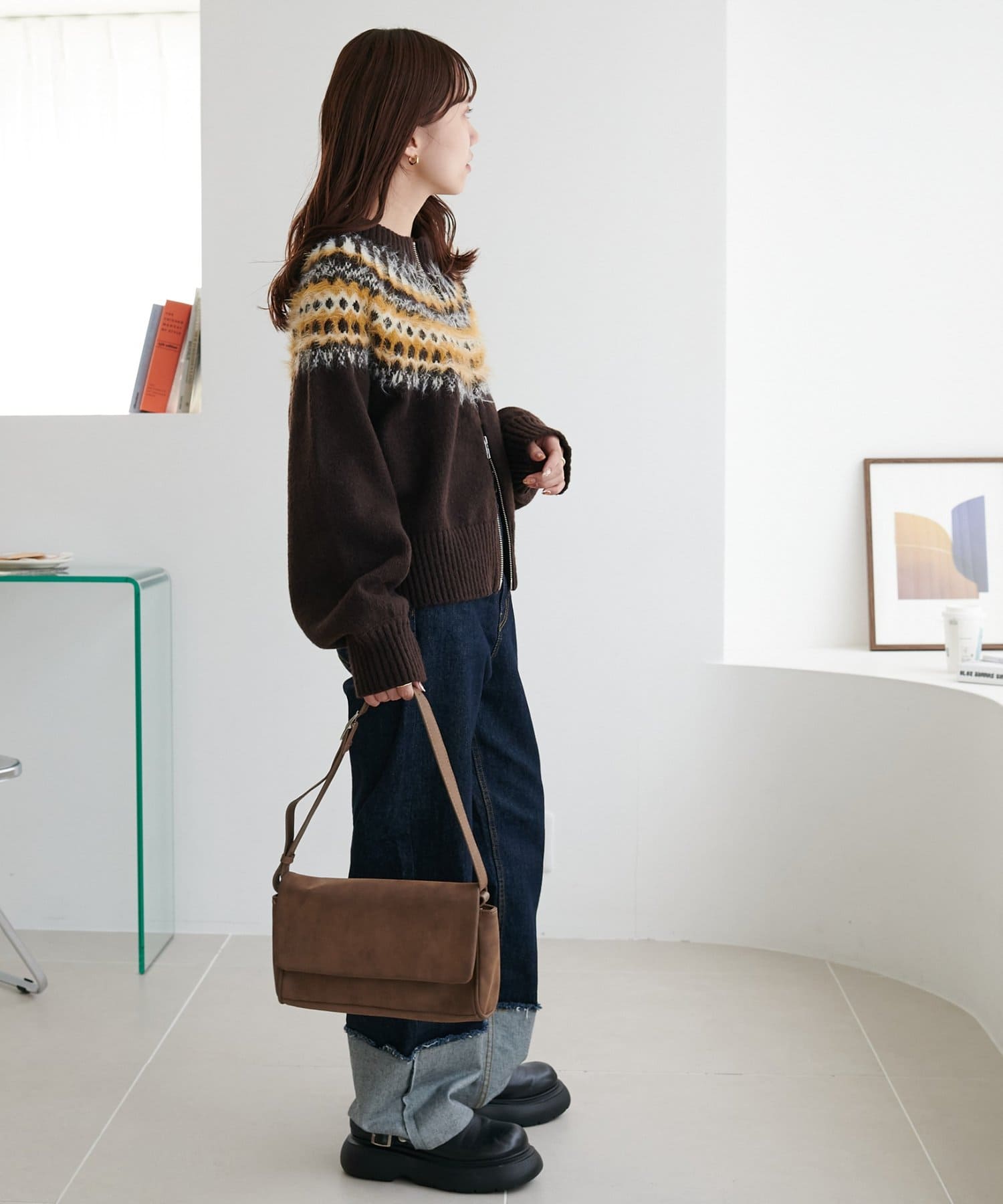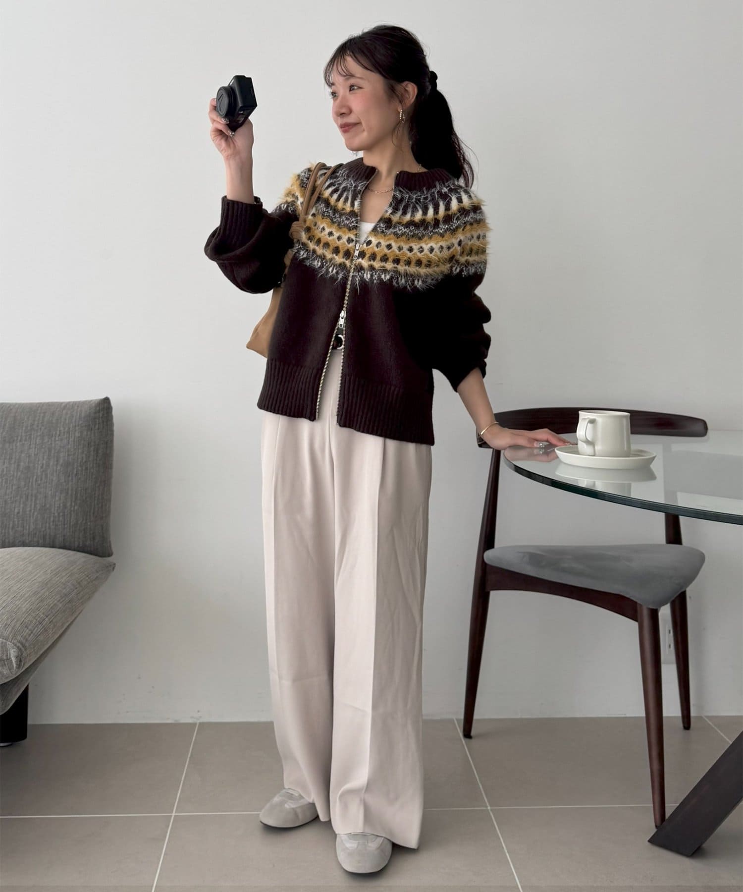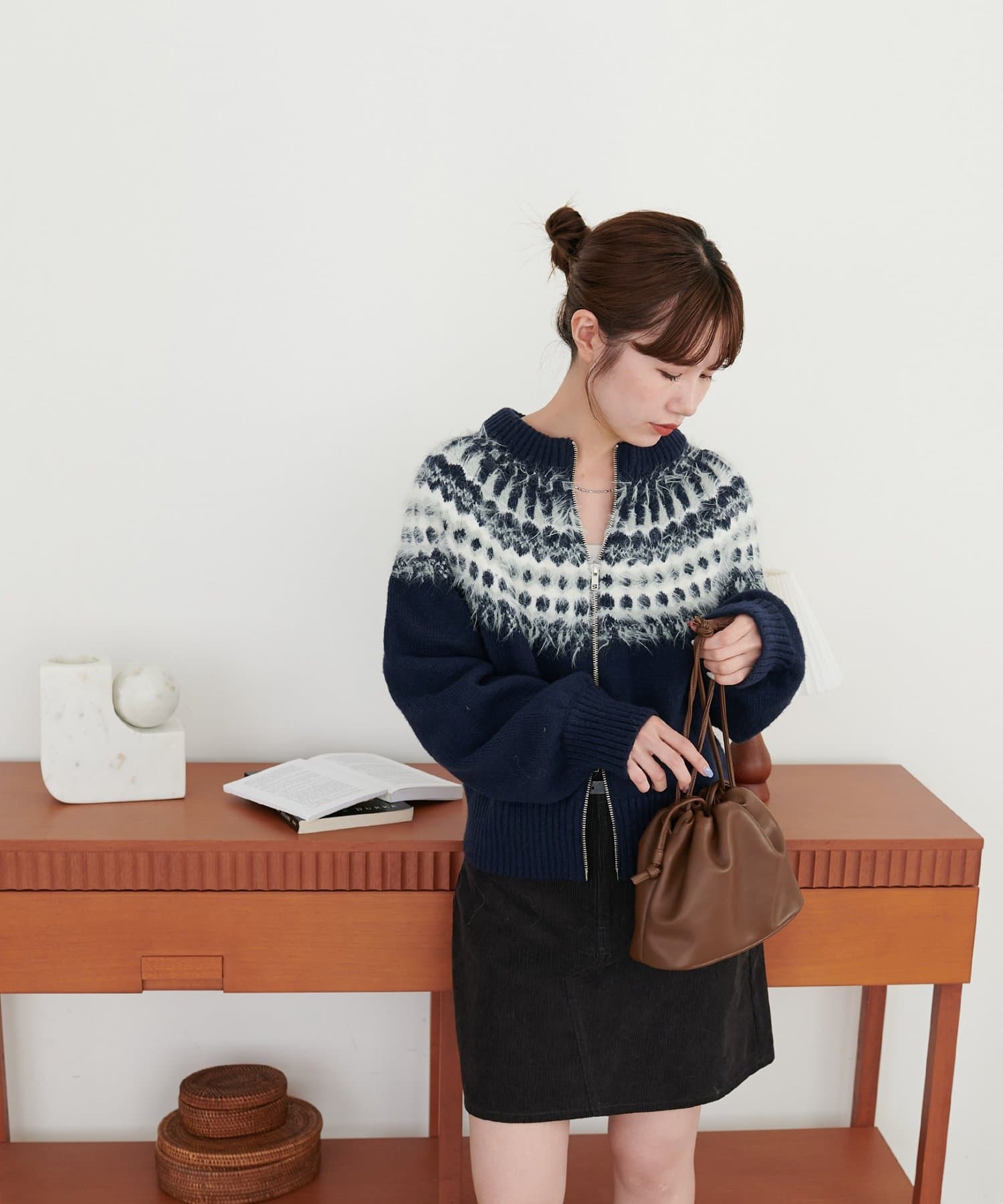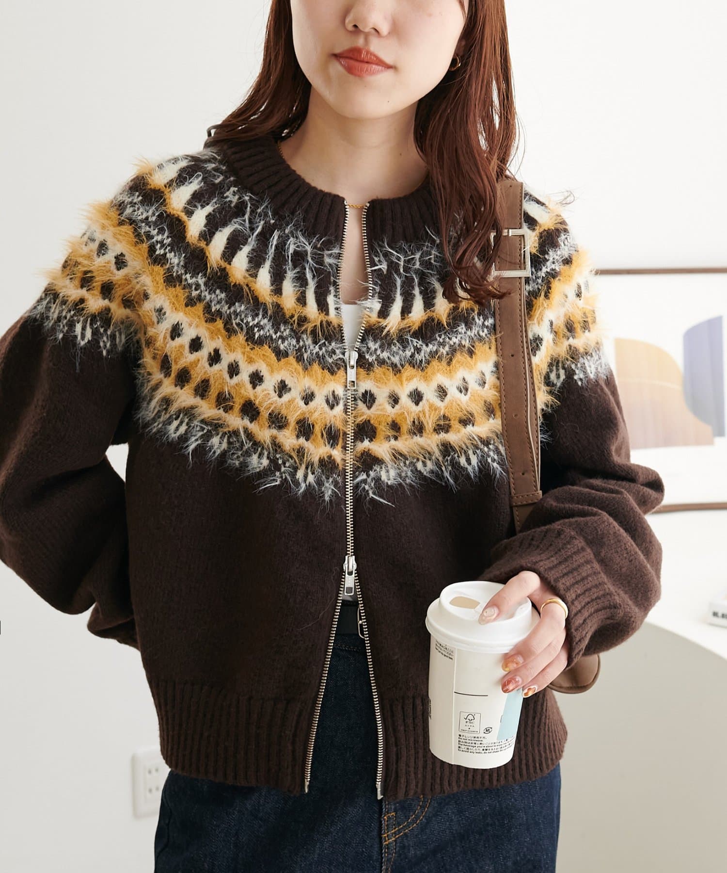 155cmスタッフ:求心柄デザインがコーデの主役に!ジップを少し開けると抜け感がでるのでおすすめです◎