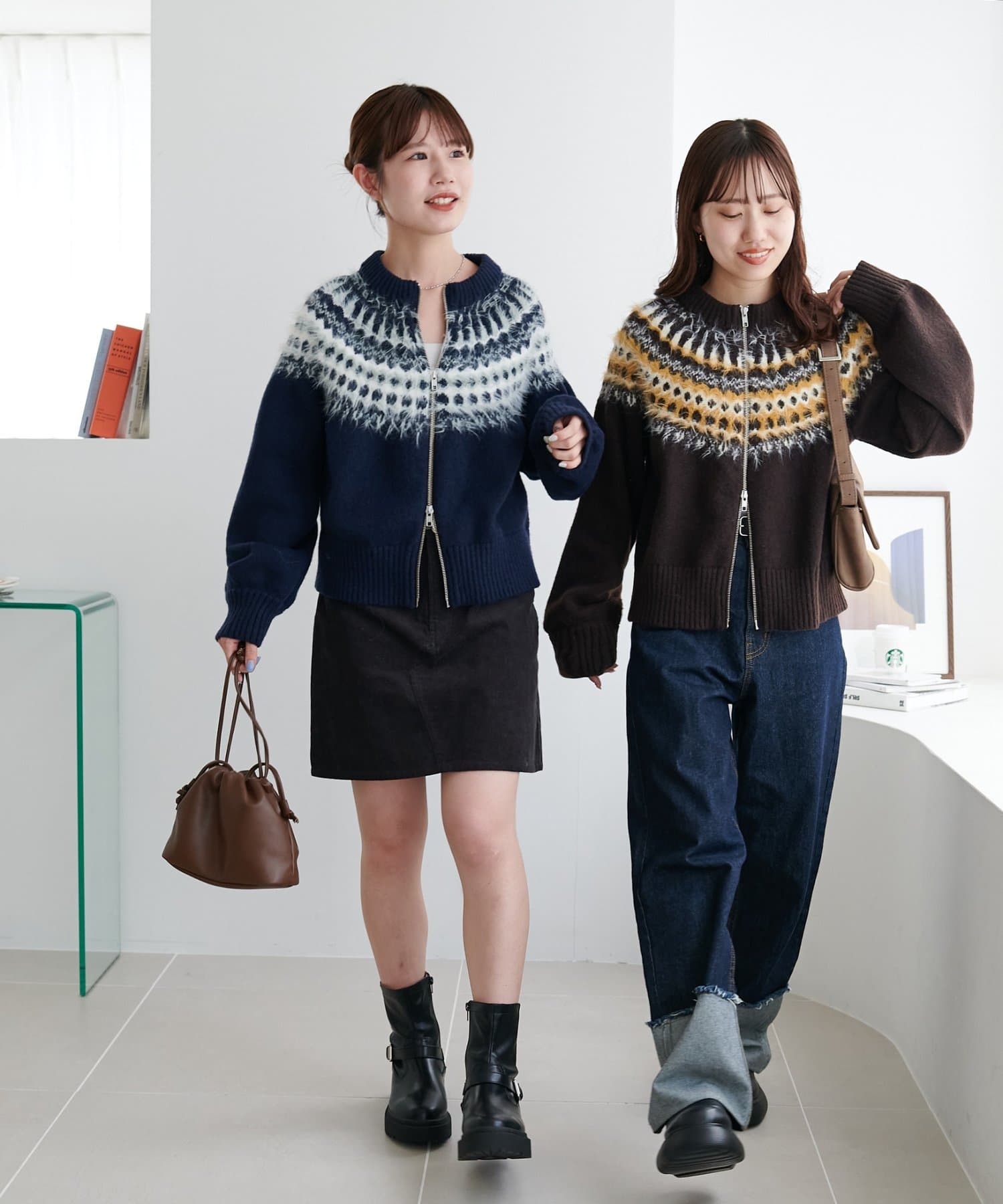ダブルジップを少し開けてインナーを見せれば、抜け感のある着こなしが楽しめます。