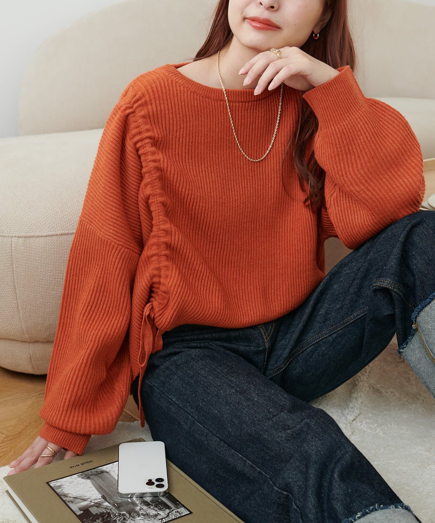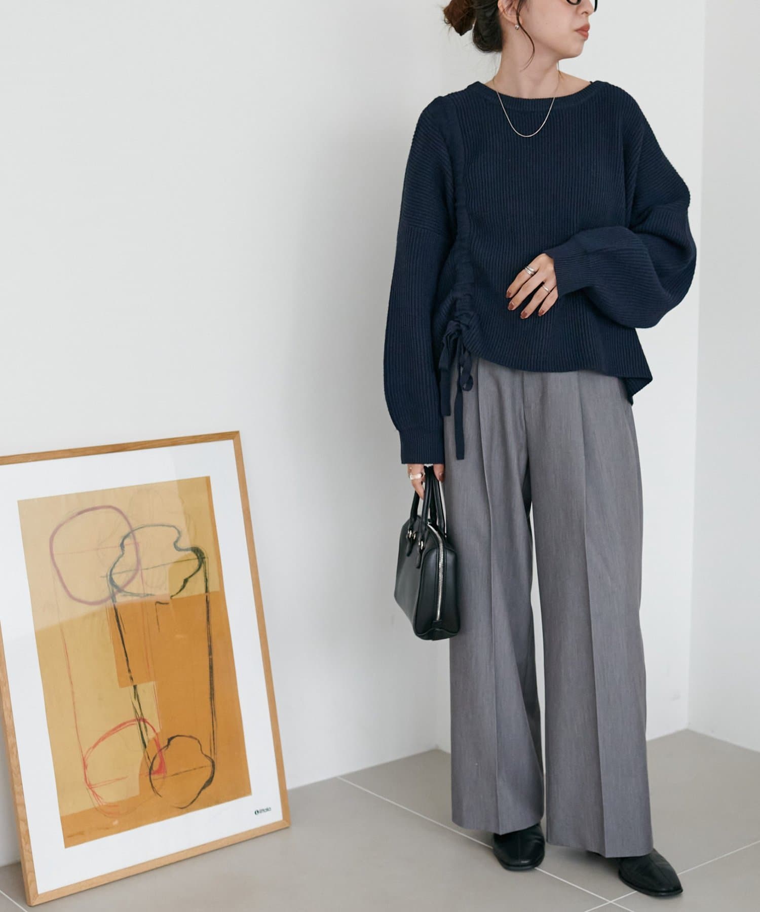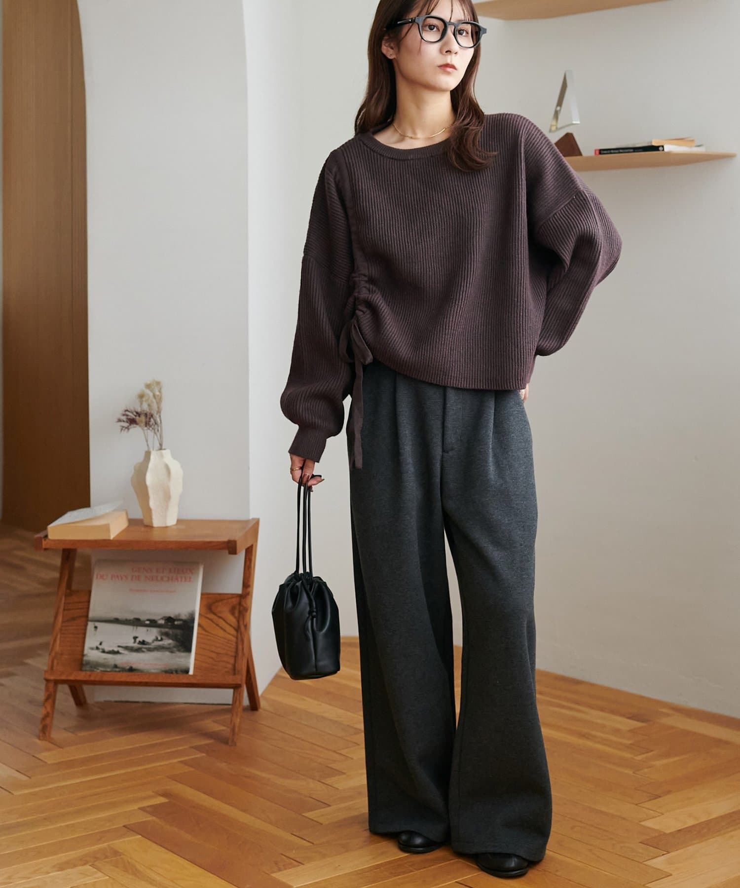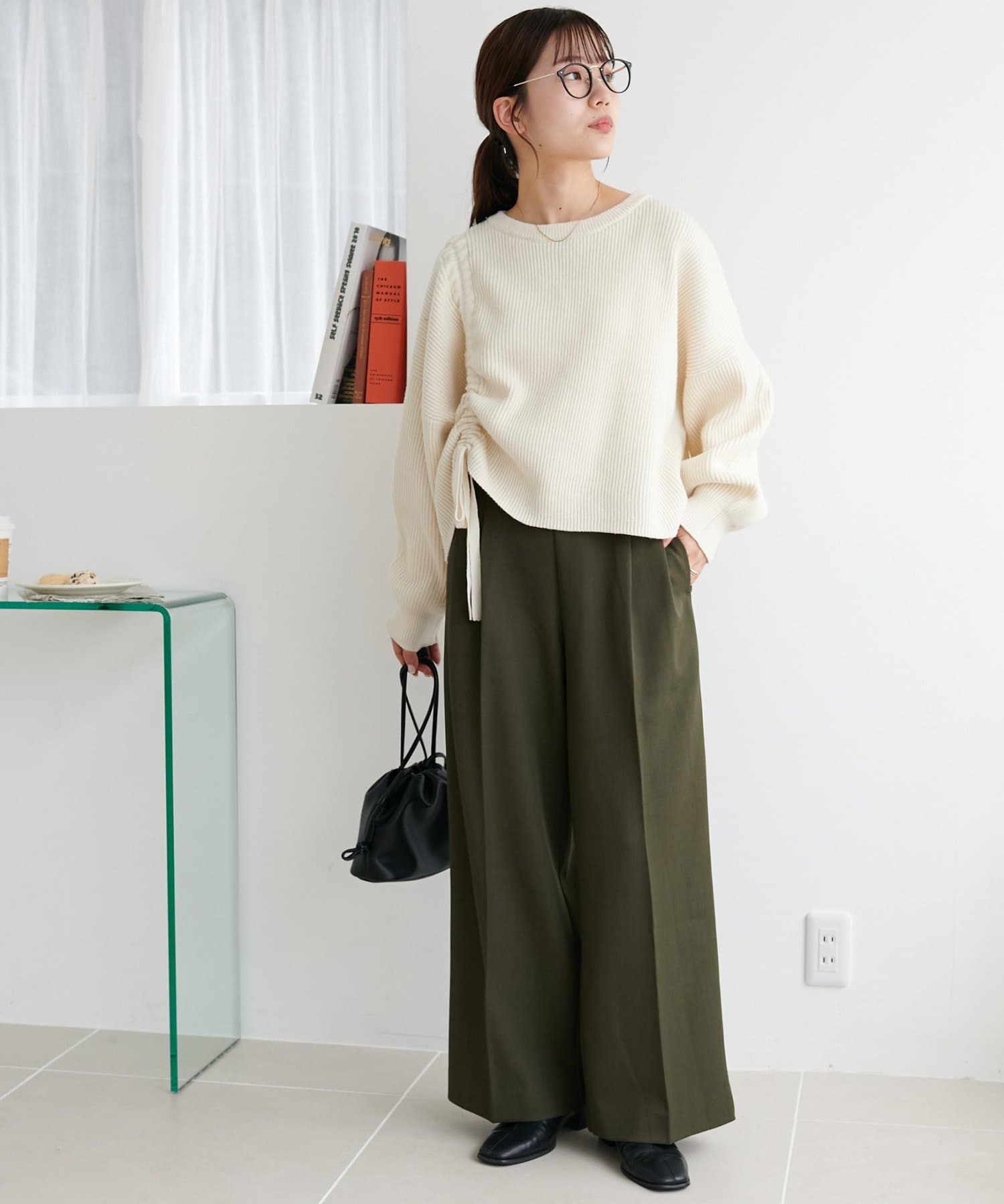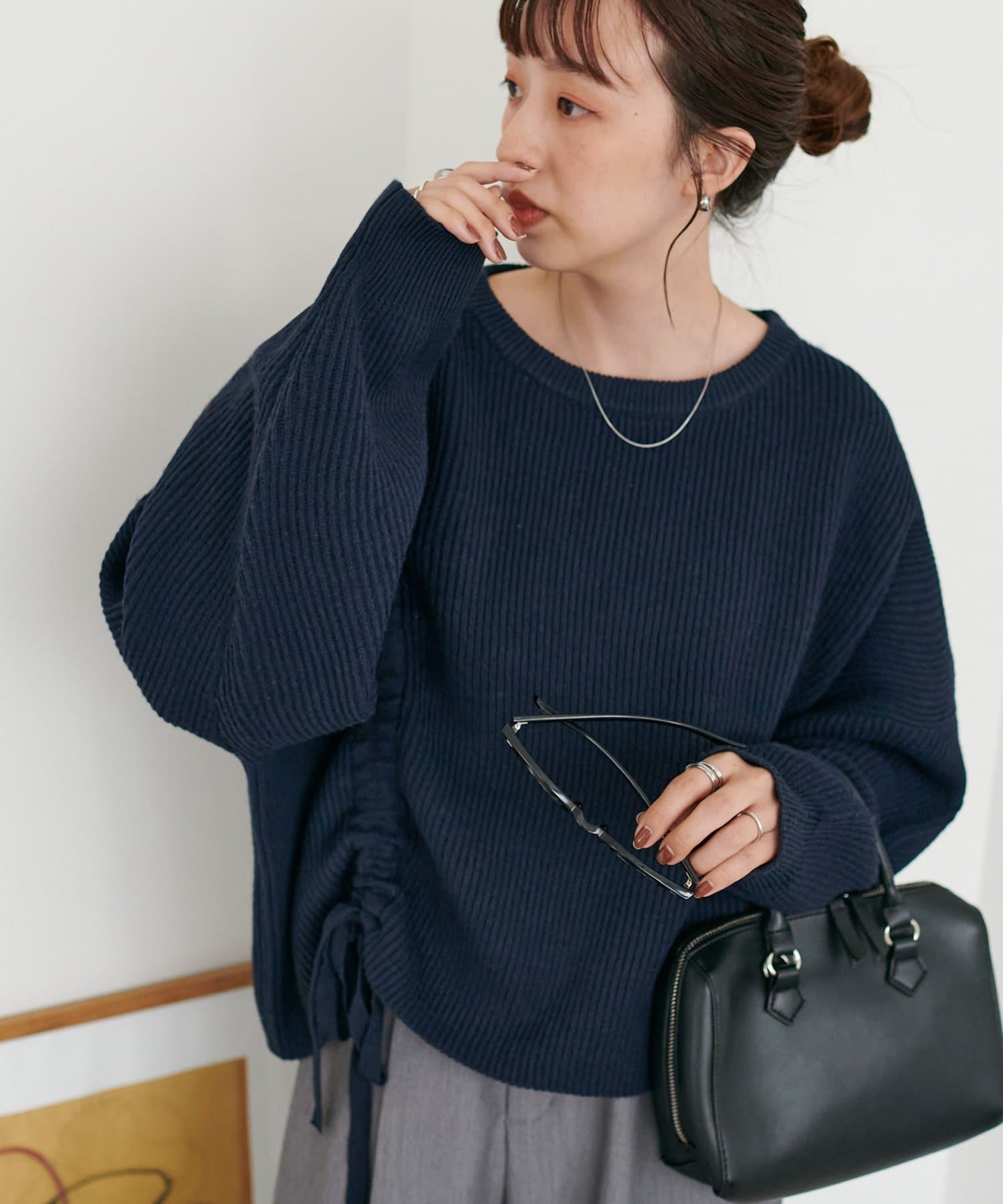 168cmスタッフ:サイドギャザーがポイントのニット。ゆとりのある身幅で、リラックスして着ていただけます