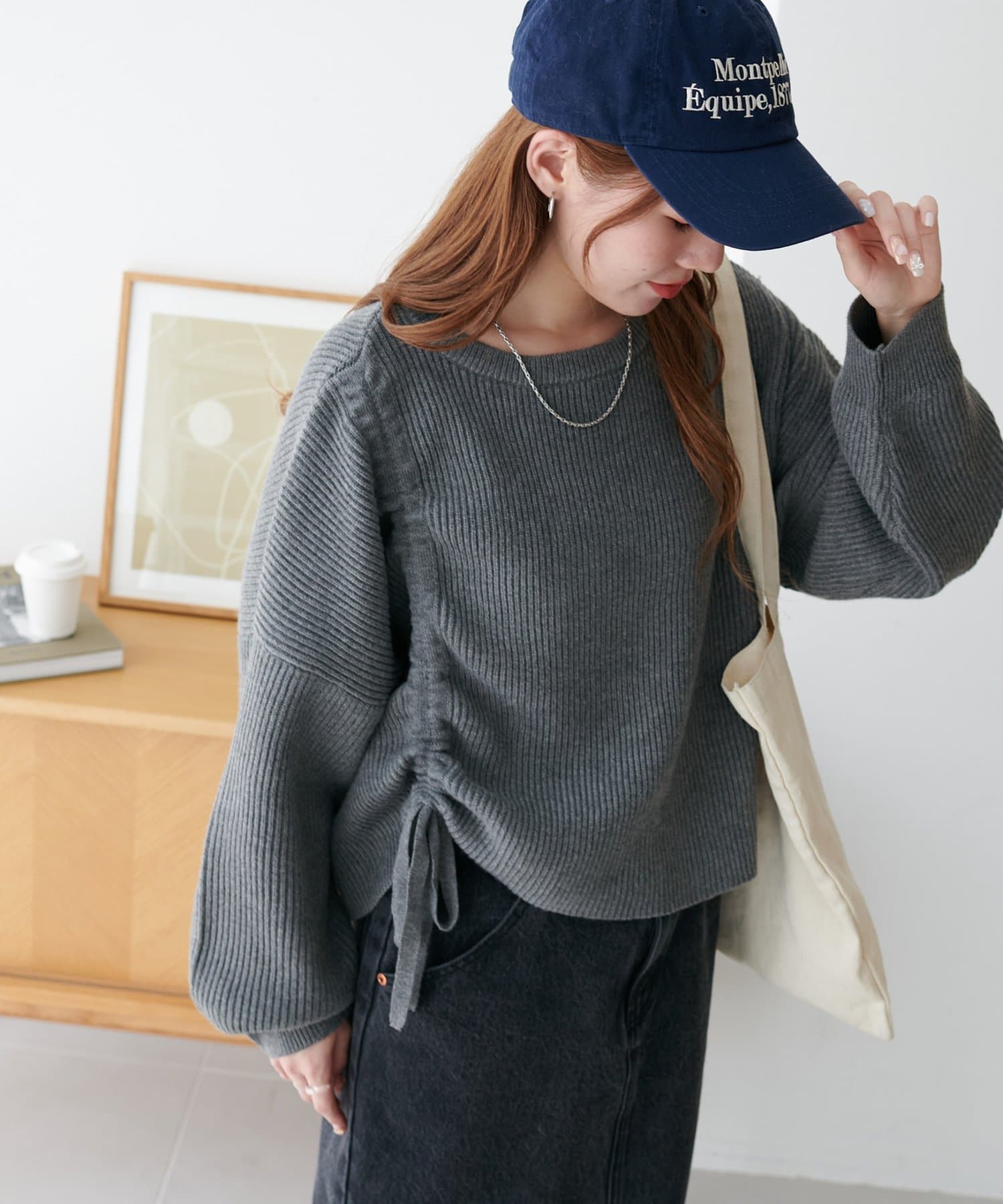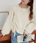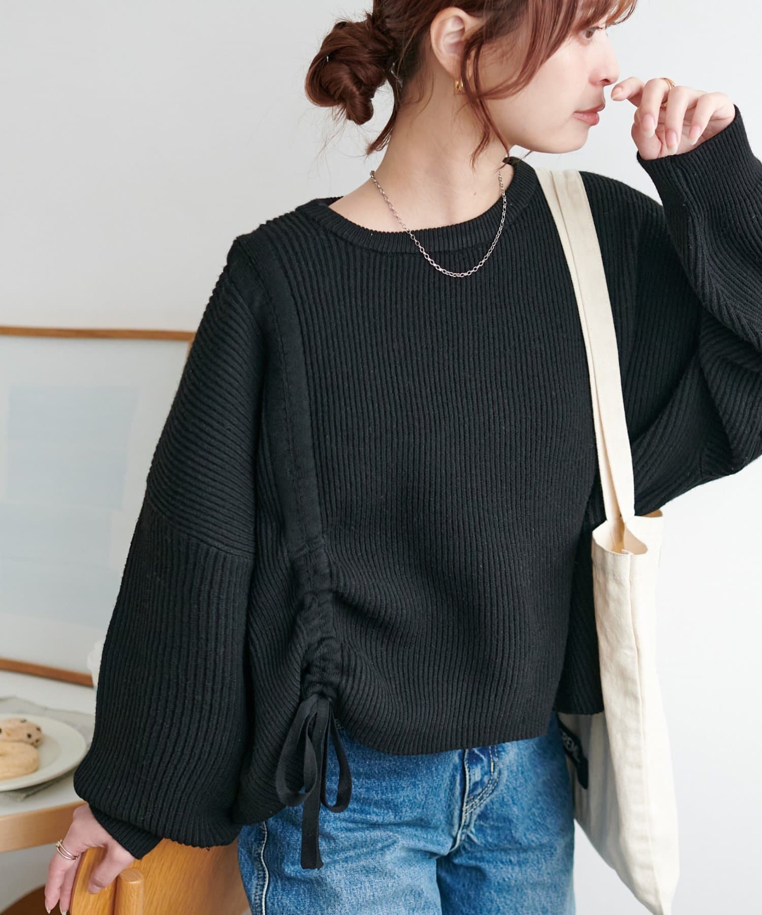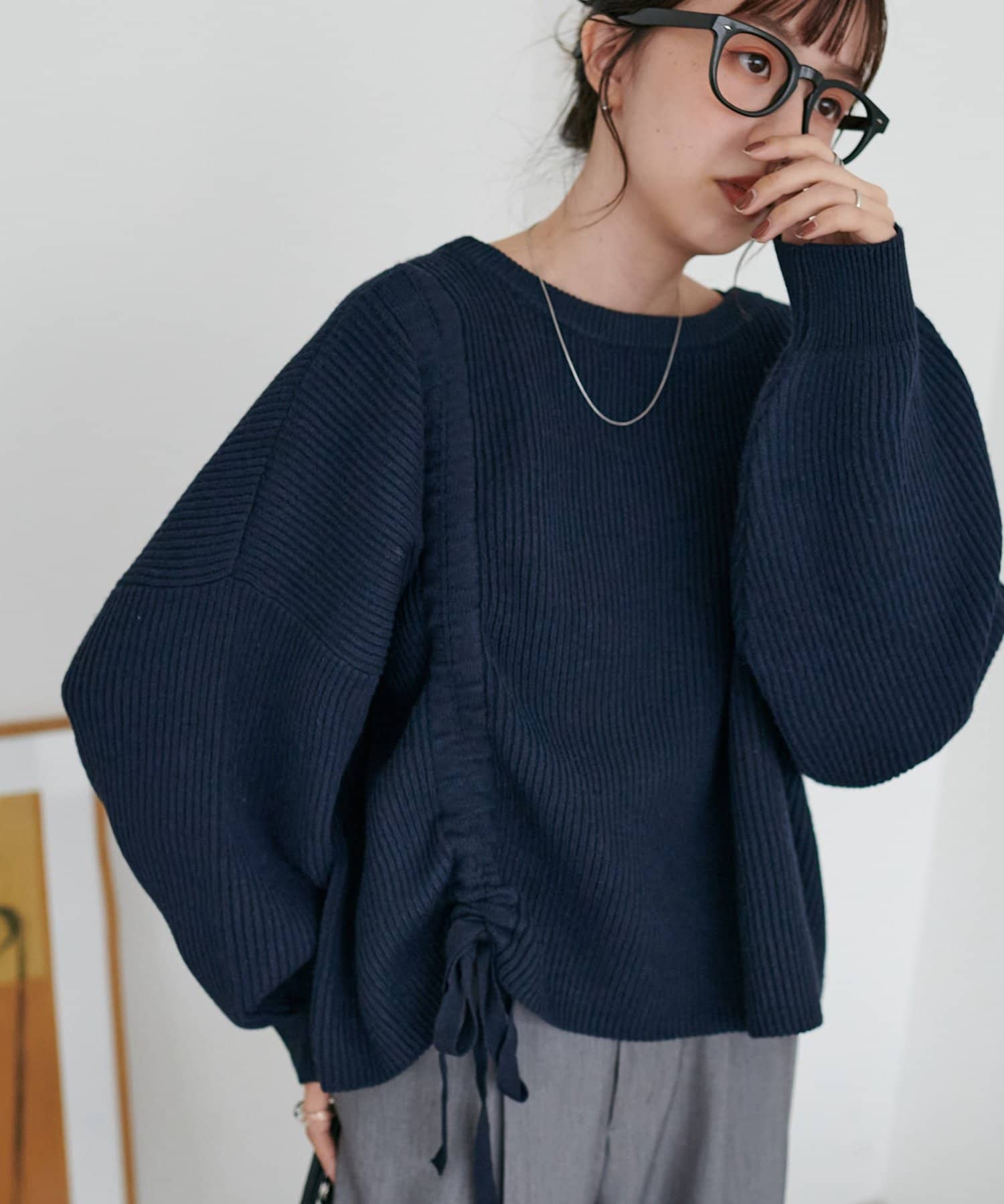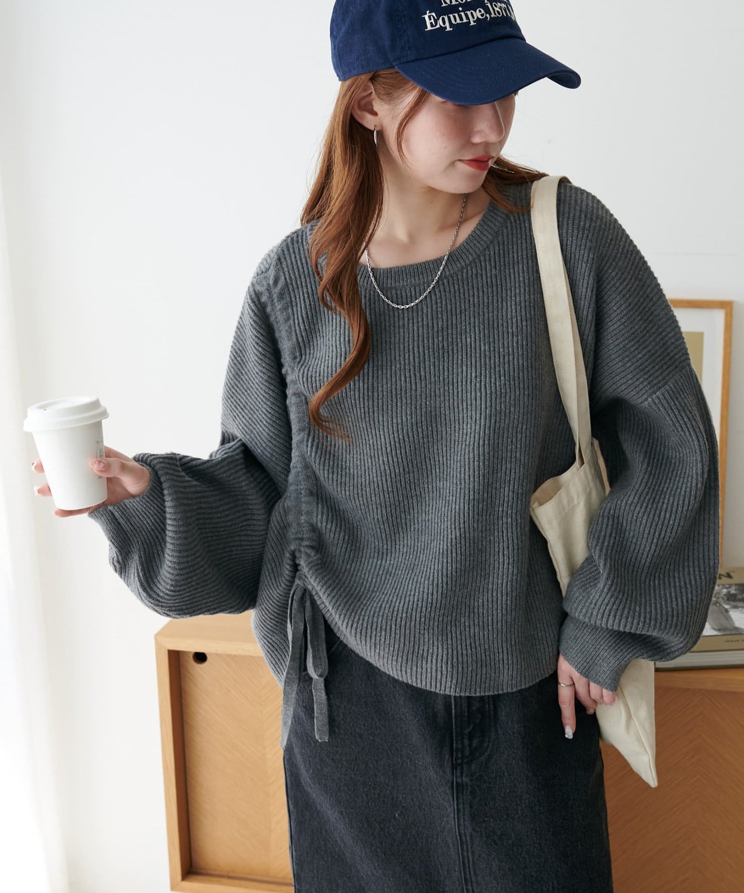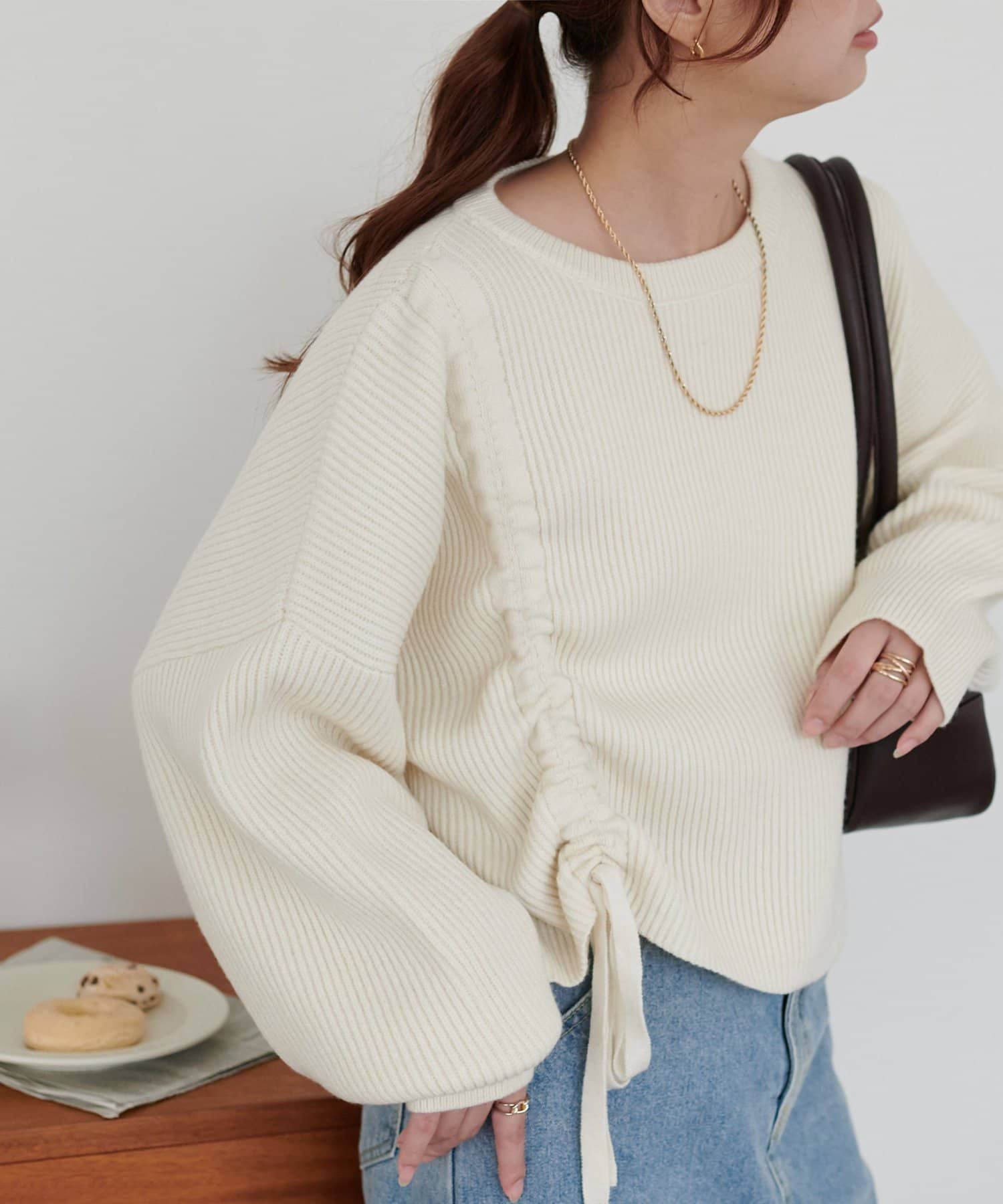 168cmスタッフ:サイドギャザーがポイントのニット。ゆとりのある身幅で、リラックスして着ていただけます