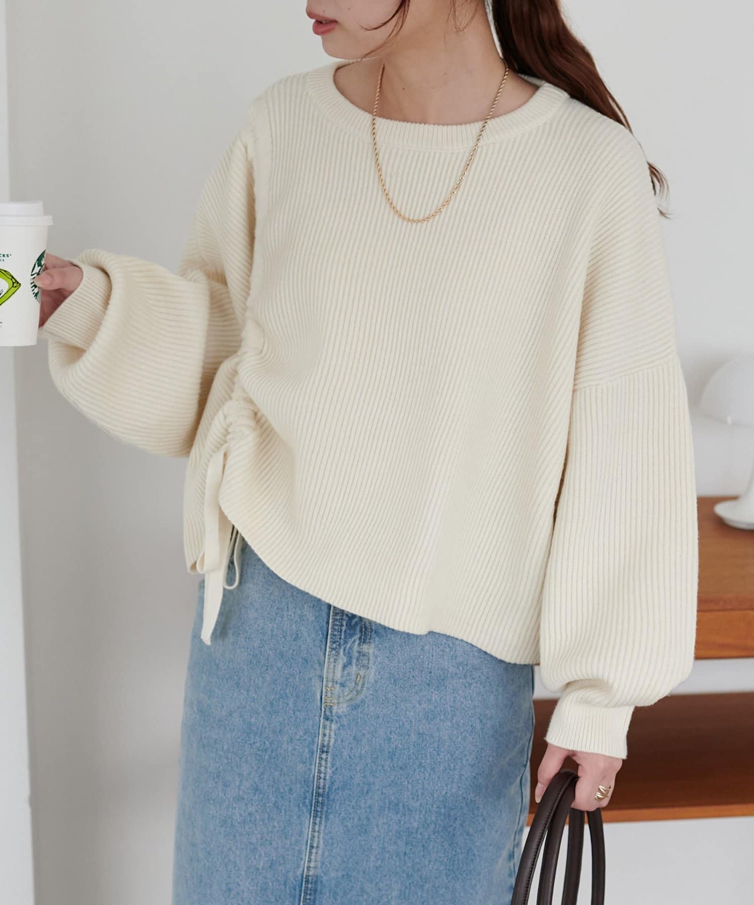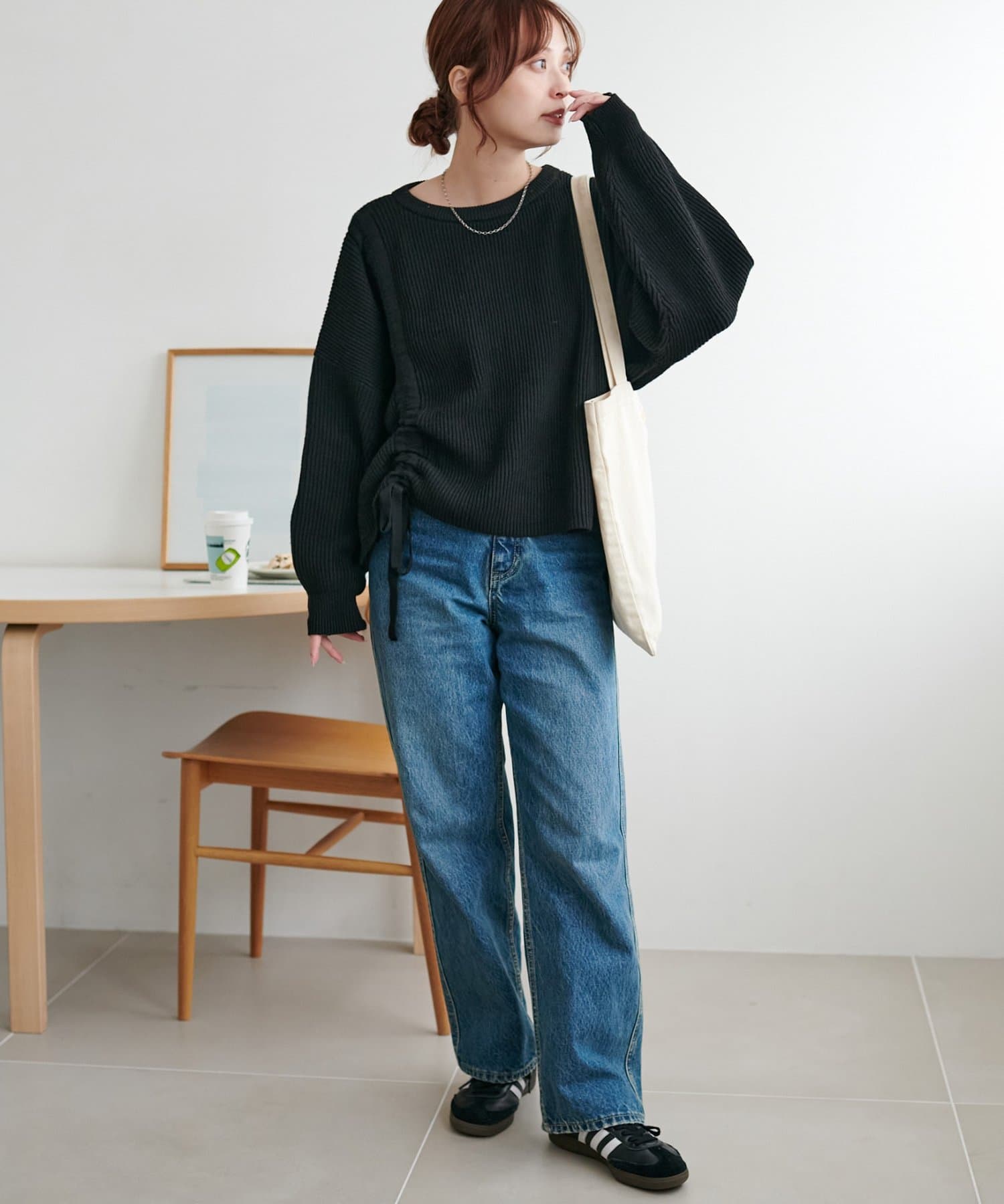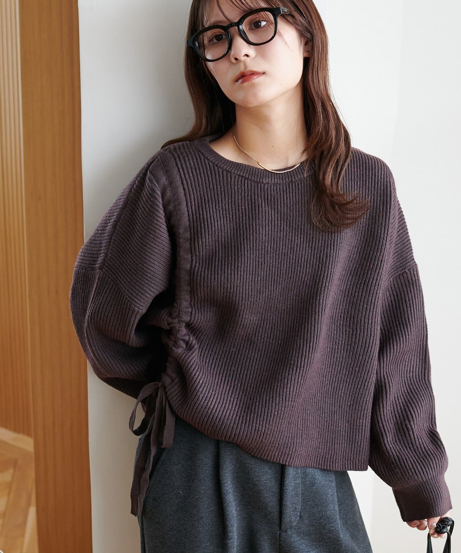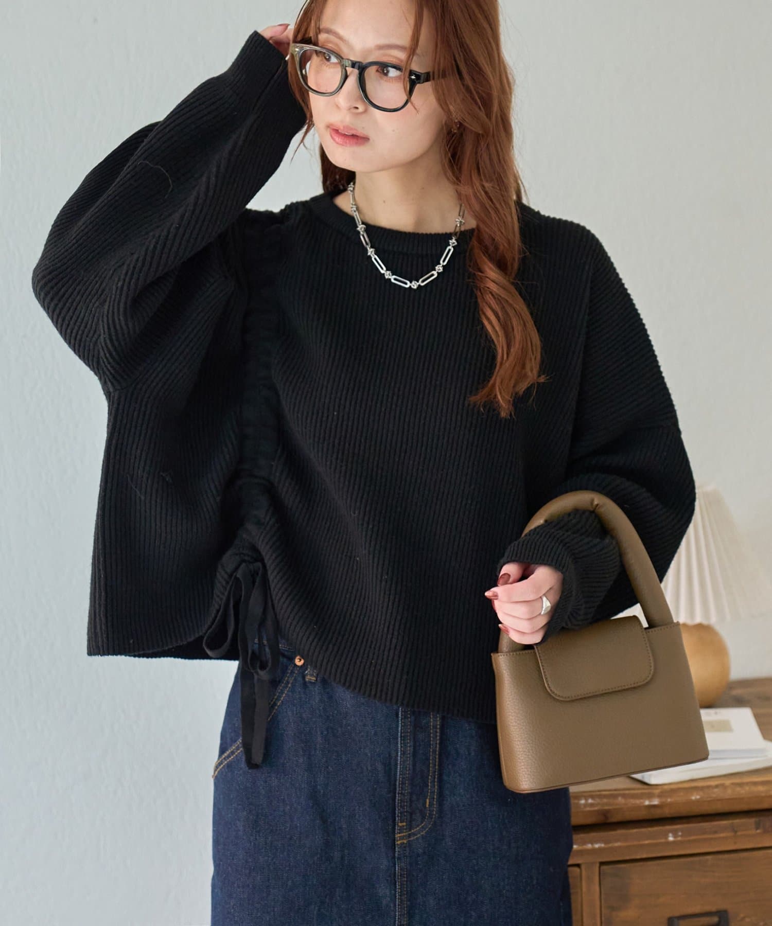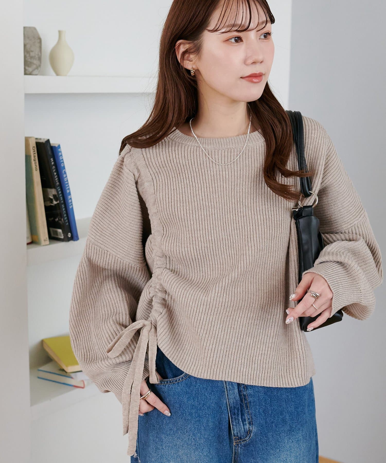 168cmスタッフ:サイドギャザーがポイントのニット。ゆとりのある身幅で、リラックスして着ていただけます