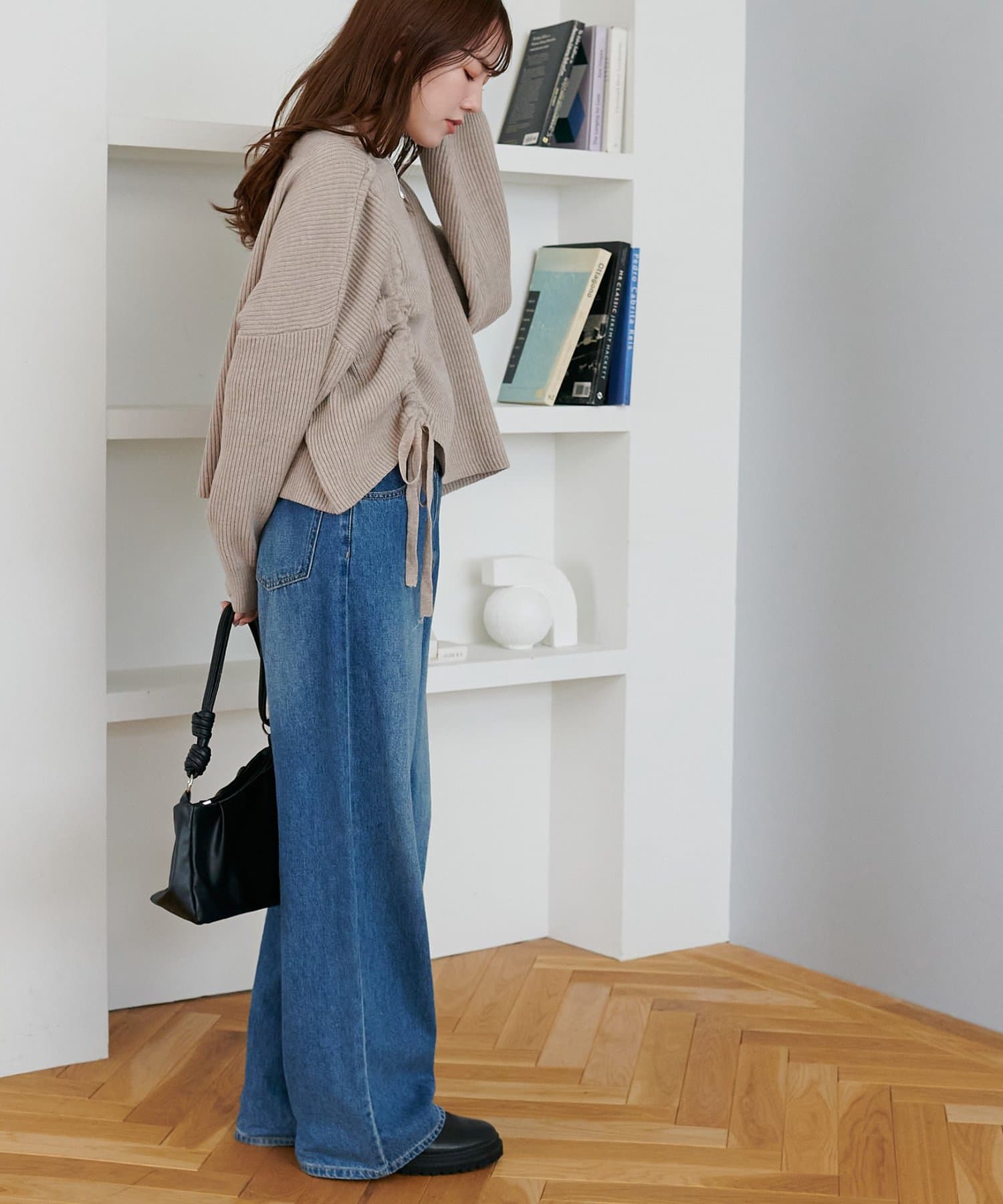 ギャザー部分を調節すると片側の丈を短くできるので、ハイウエストやワイド系のボトムスとの相性も〇