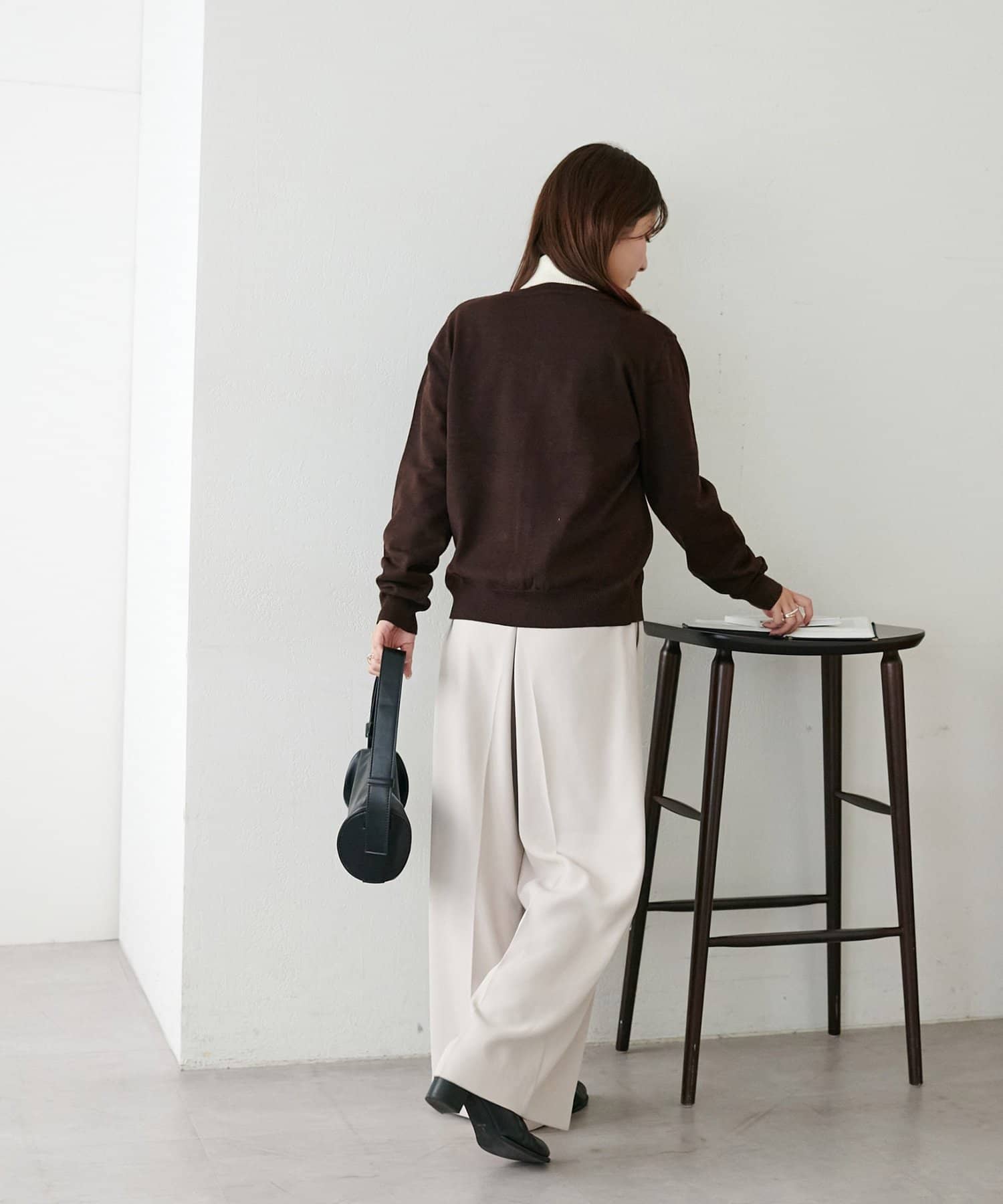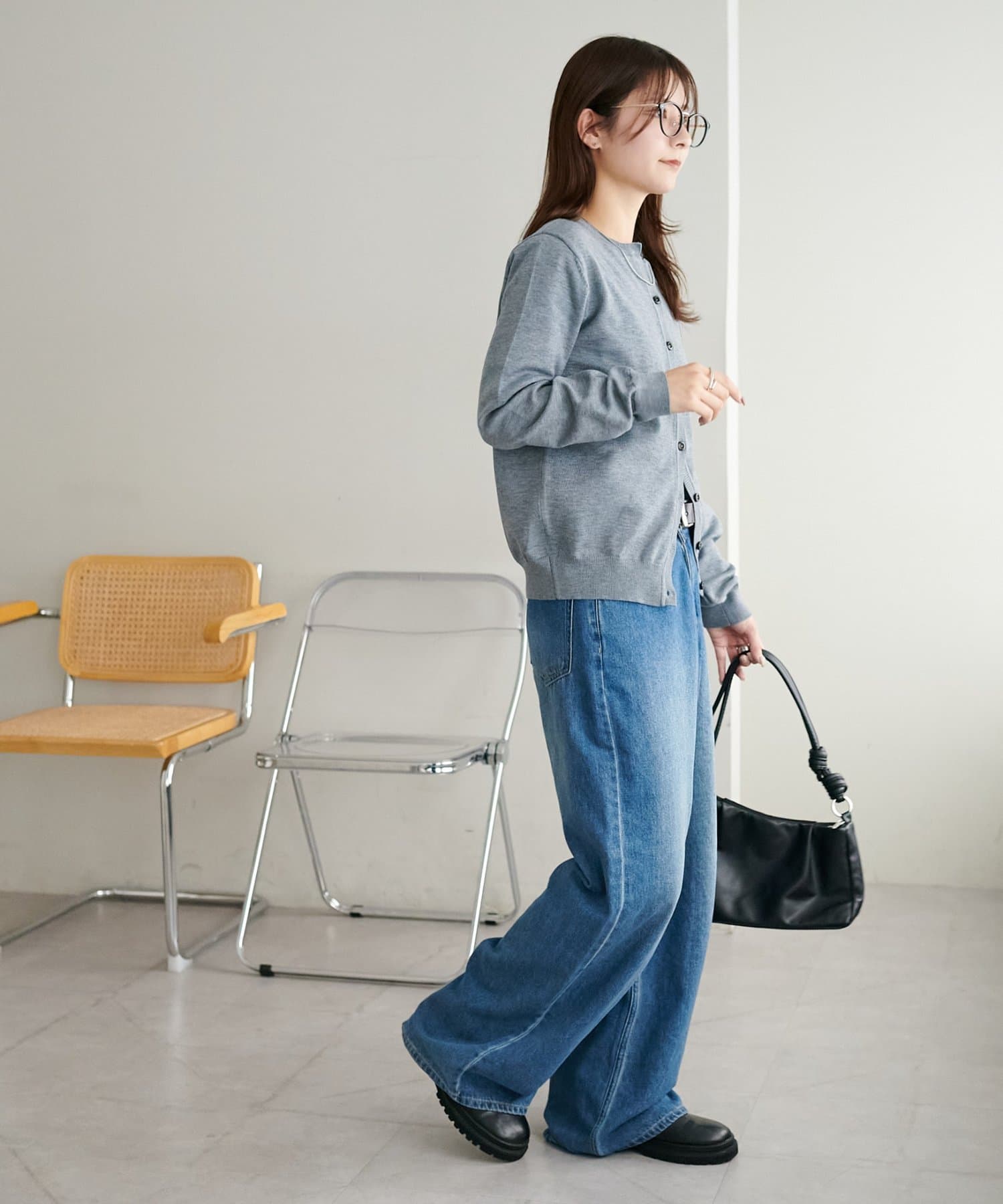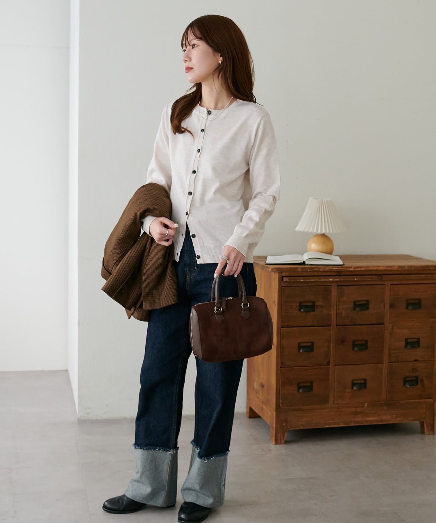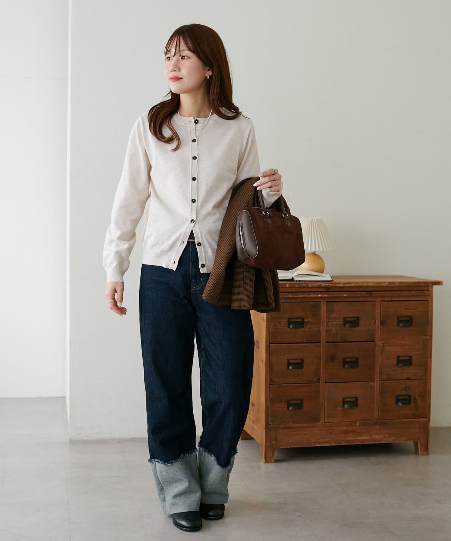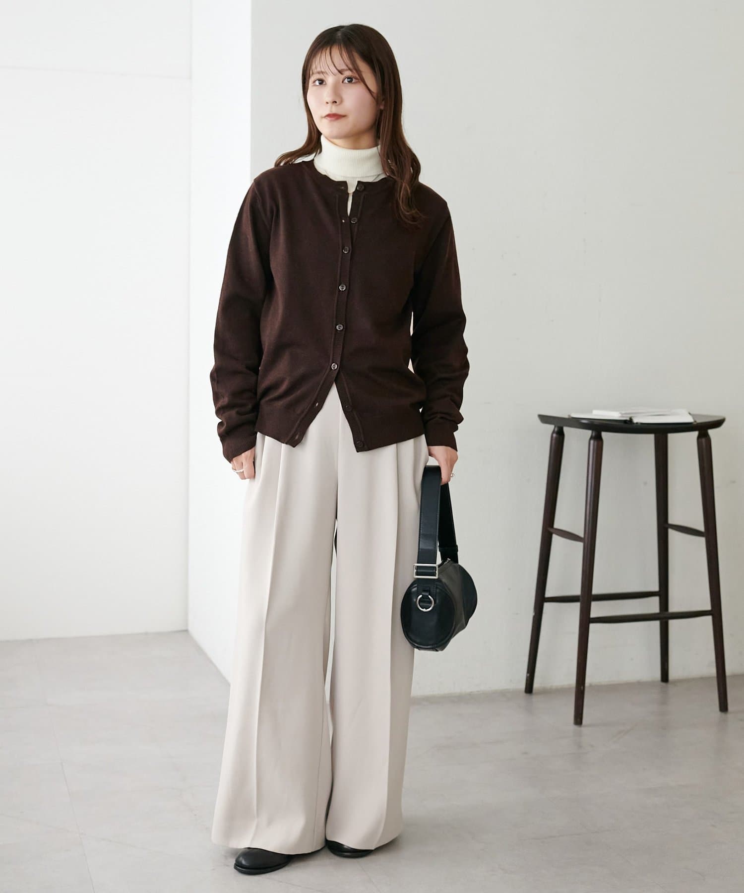 162cmスタッフ:首元の詰まったクルーネックが上品で、アクセサリー映えするのもポイントです。オンオフ問わず着回せる万能カーディガンです!