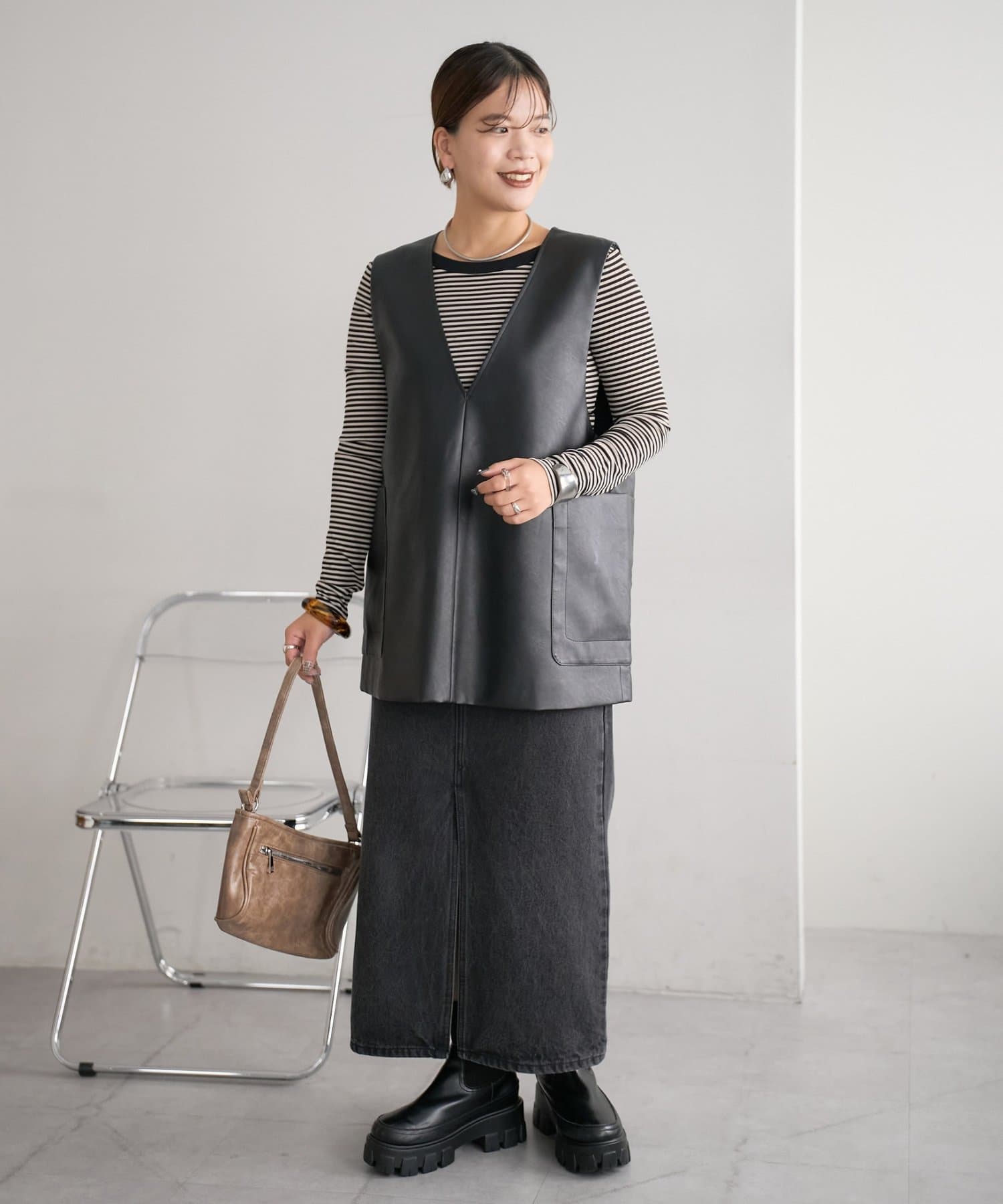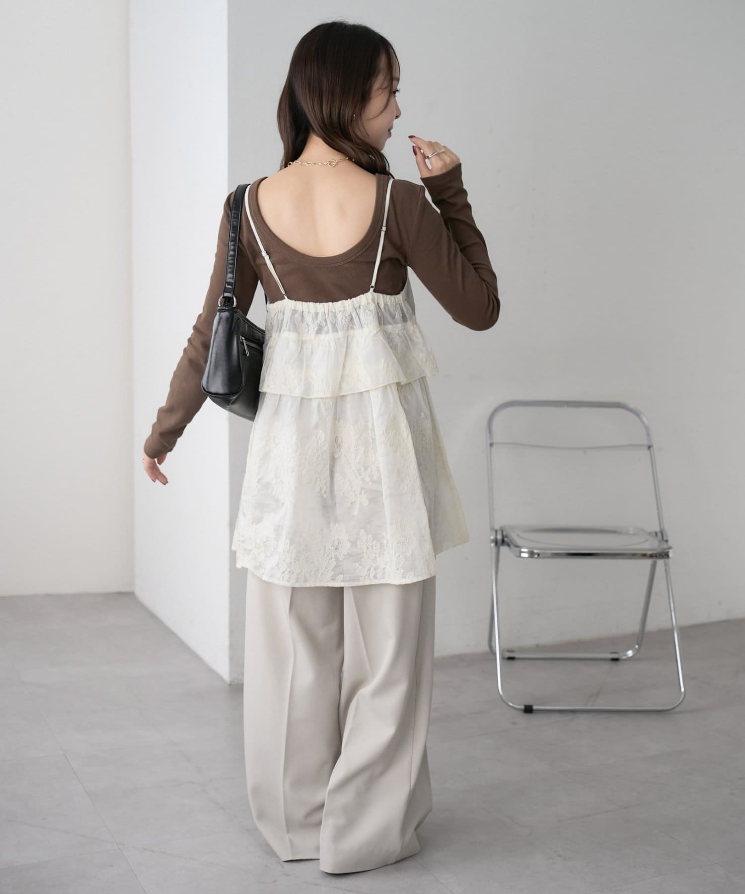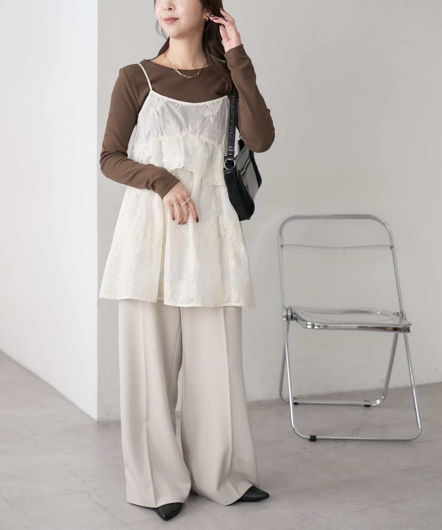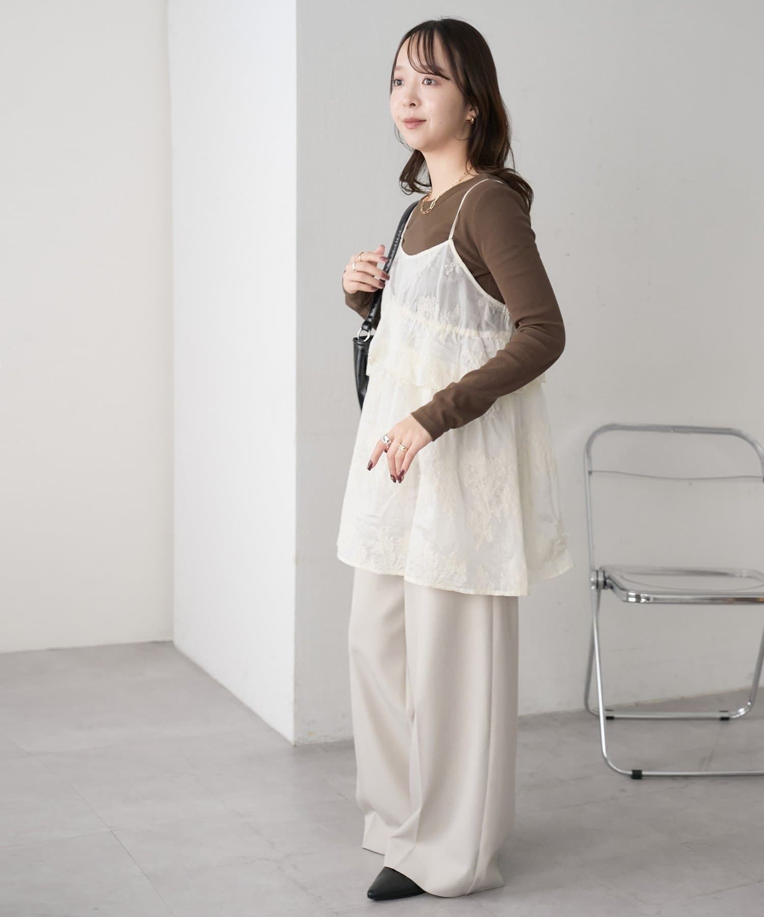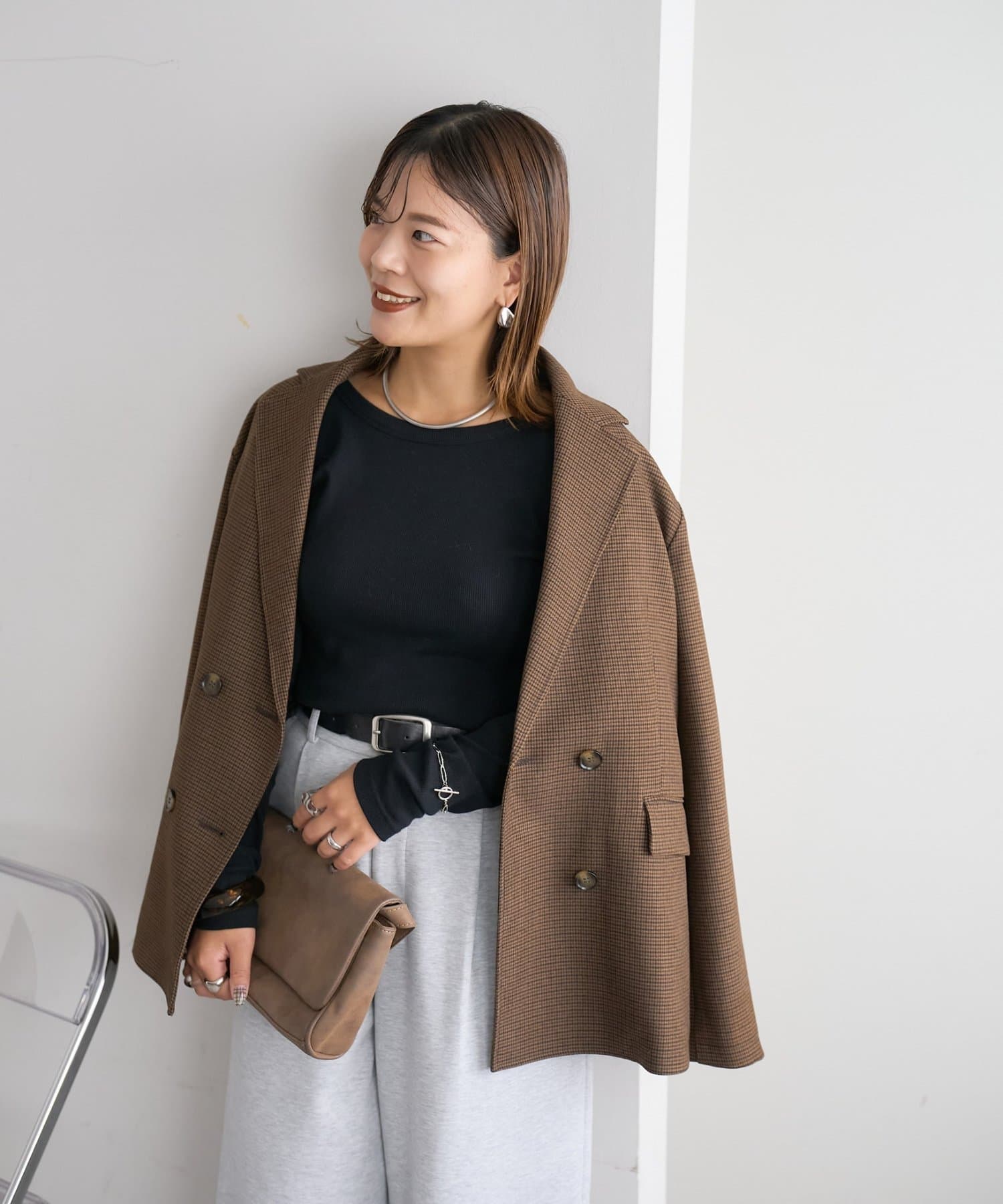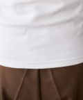 トップスは、前後2WAY仕様で首が開きすぎず、詰まりすぎないデザインにしました◎ベストやジャケットのインナーにもなるし、1枚でもラインを拾いすぎないように生地感やサイズ感にもとことんこだわった1枚です!