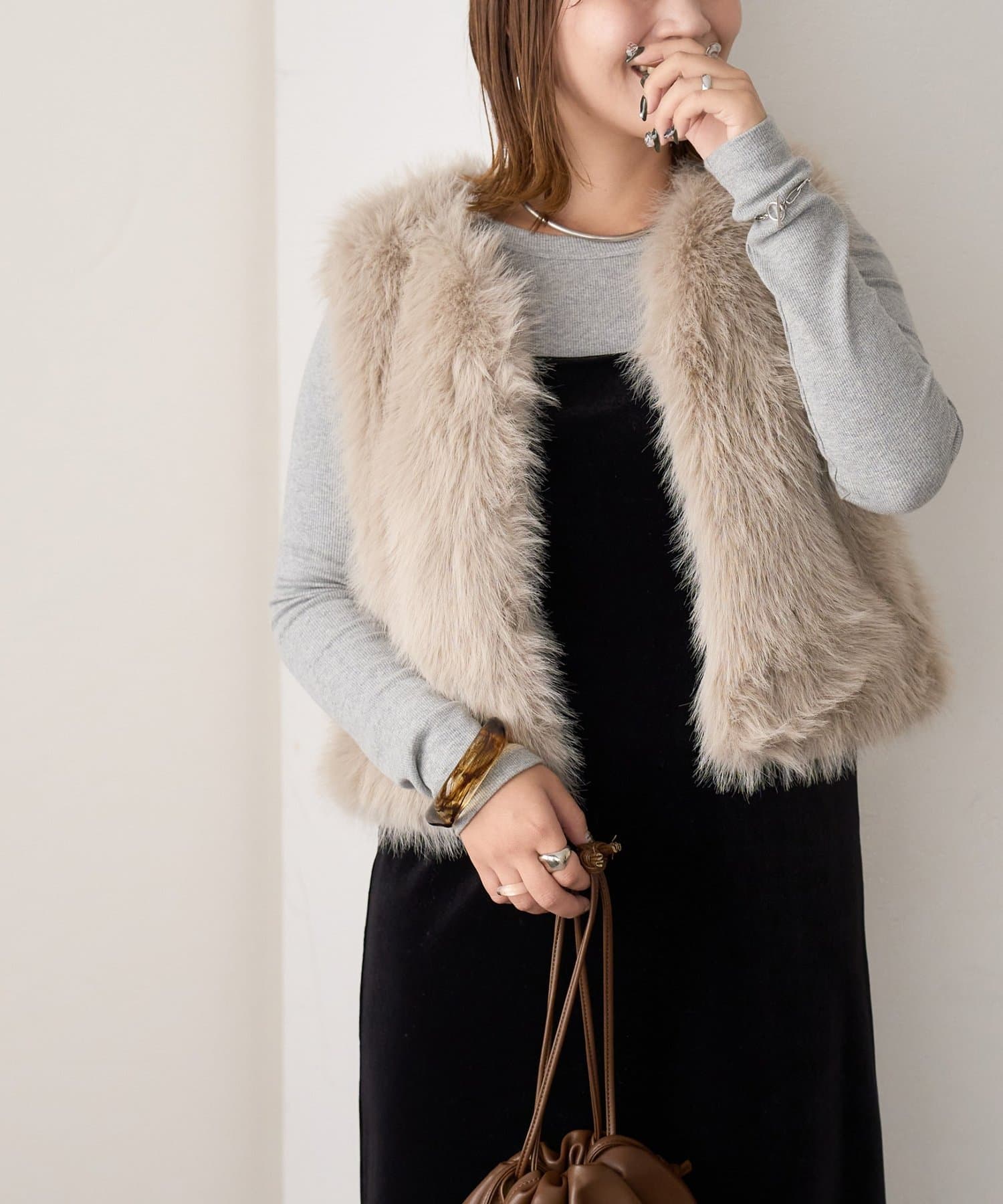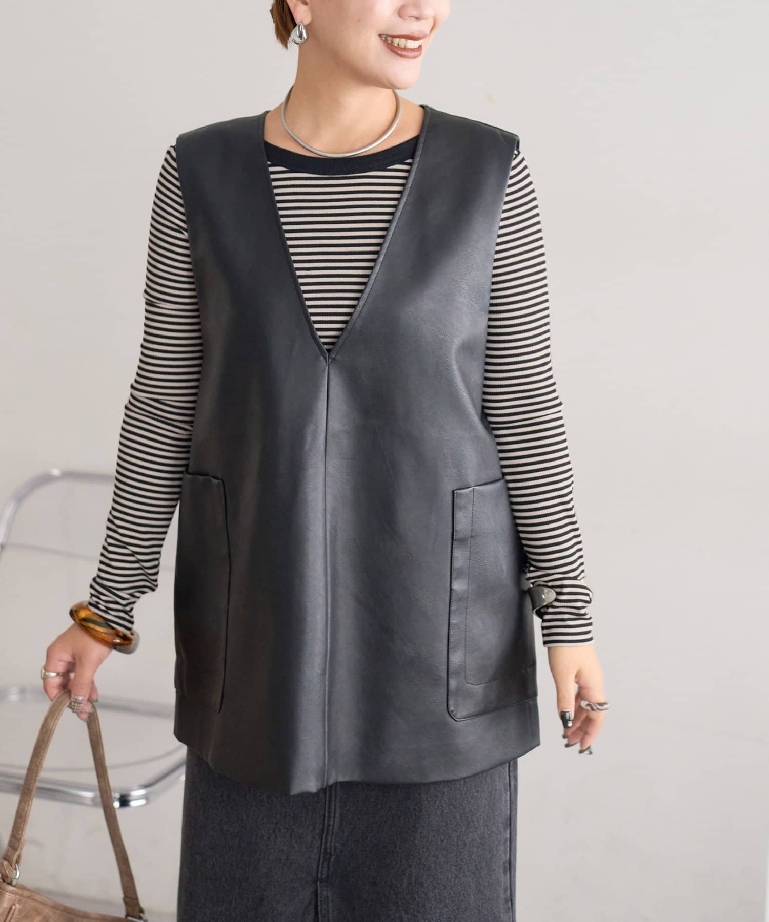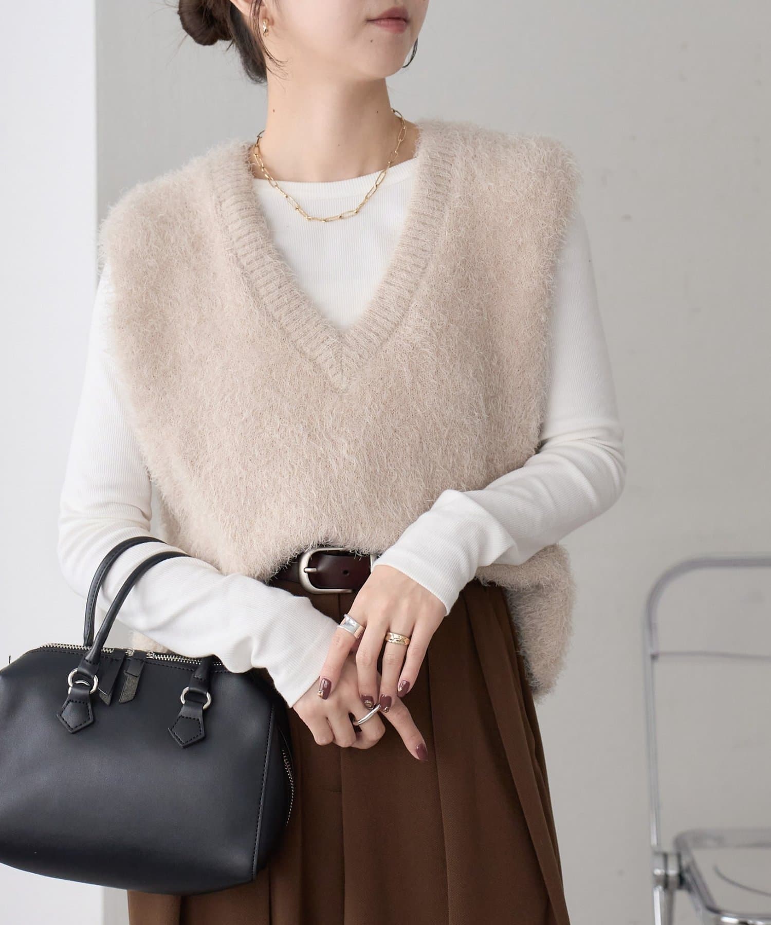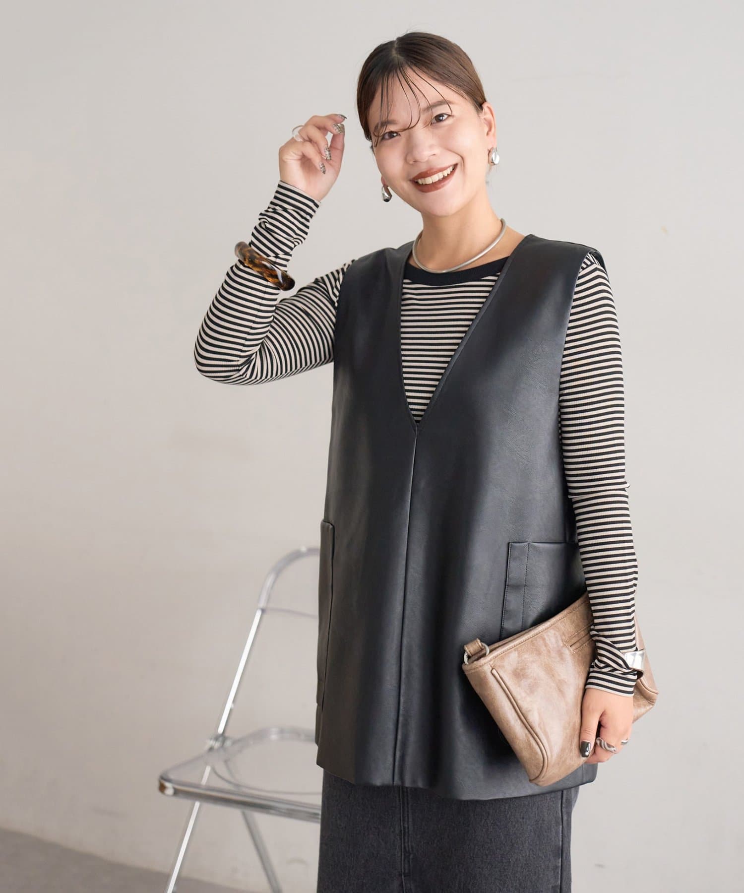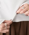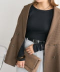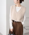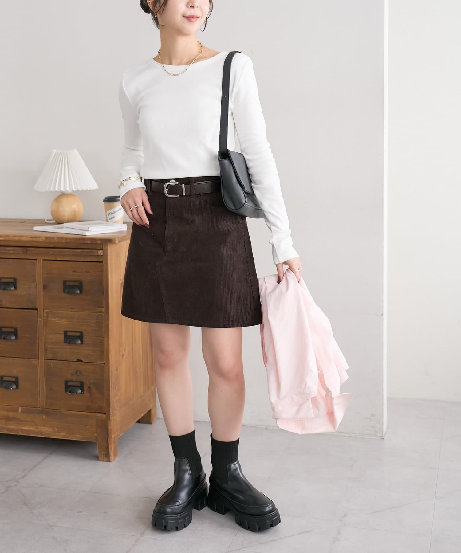 トップスは、前後2WAY仕様で首が開きすぎず、詰まりすぎないデザインにしました◎ベストやジャケットのインナーにもなるし、1枚でもラインを拾いすぎないように生地感やサイズ感にもとことんこだわった1枚です!