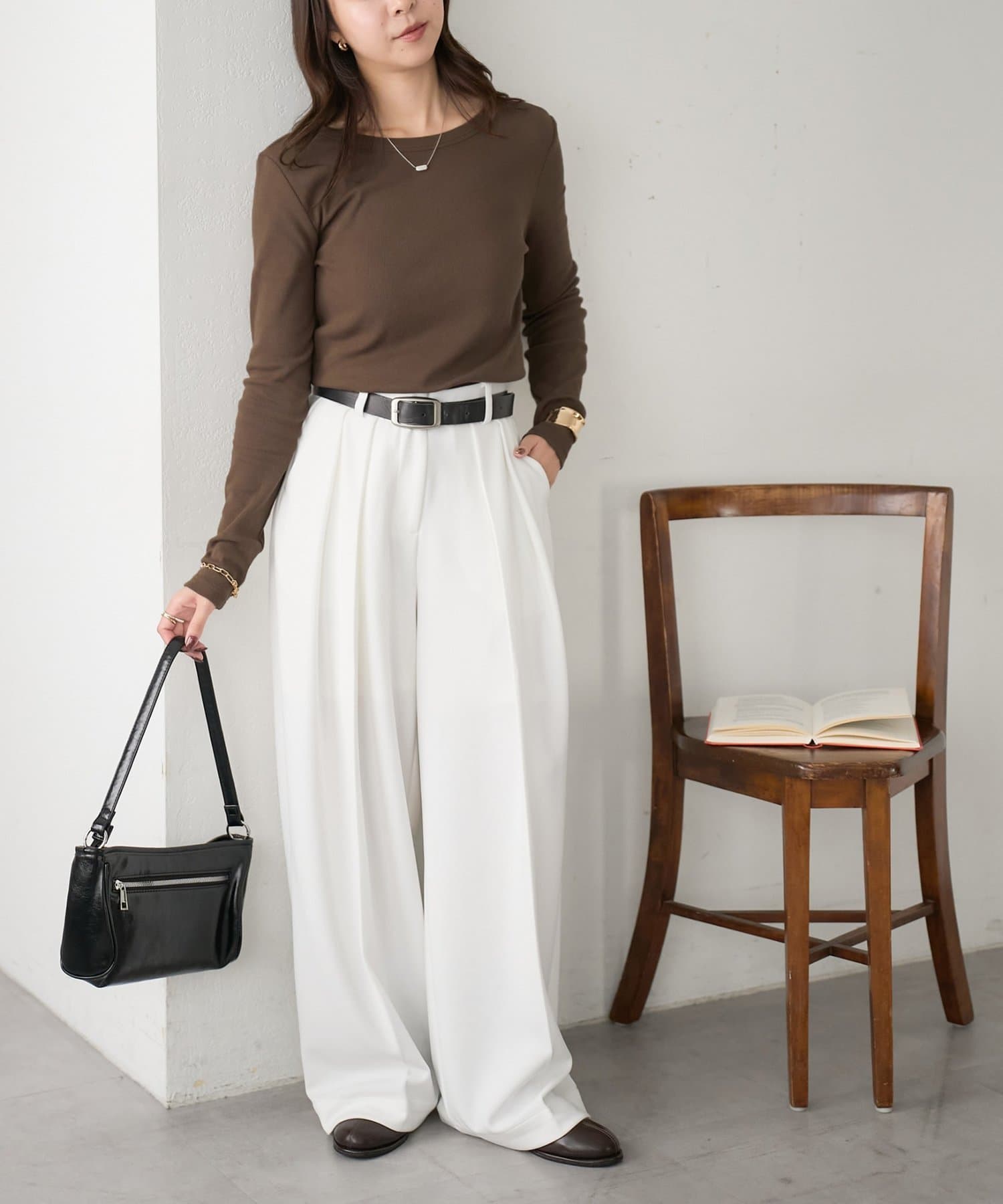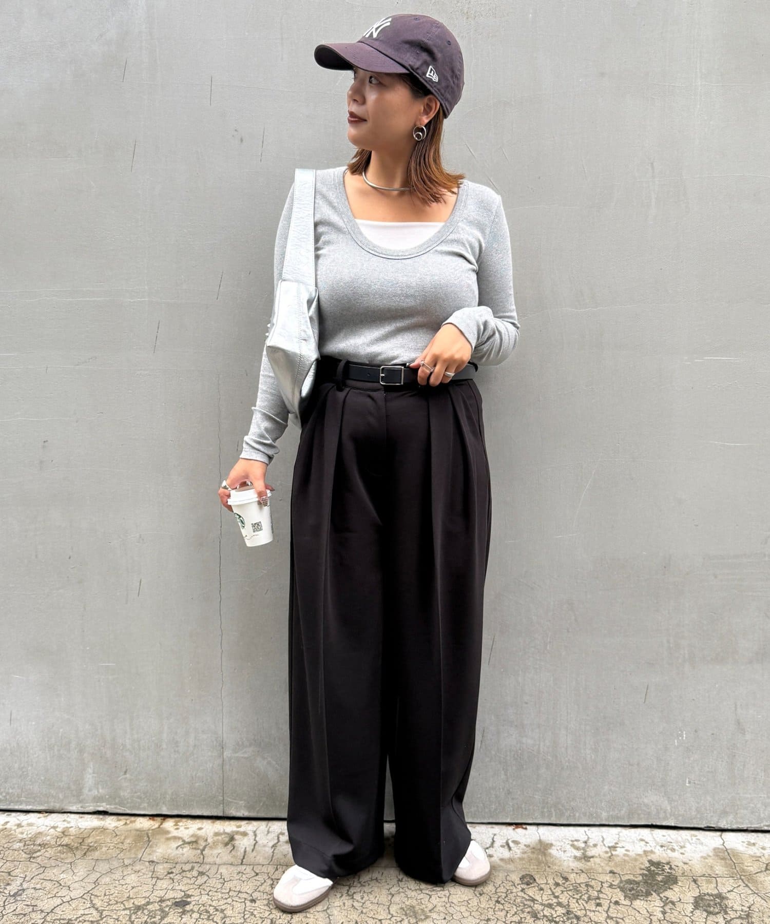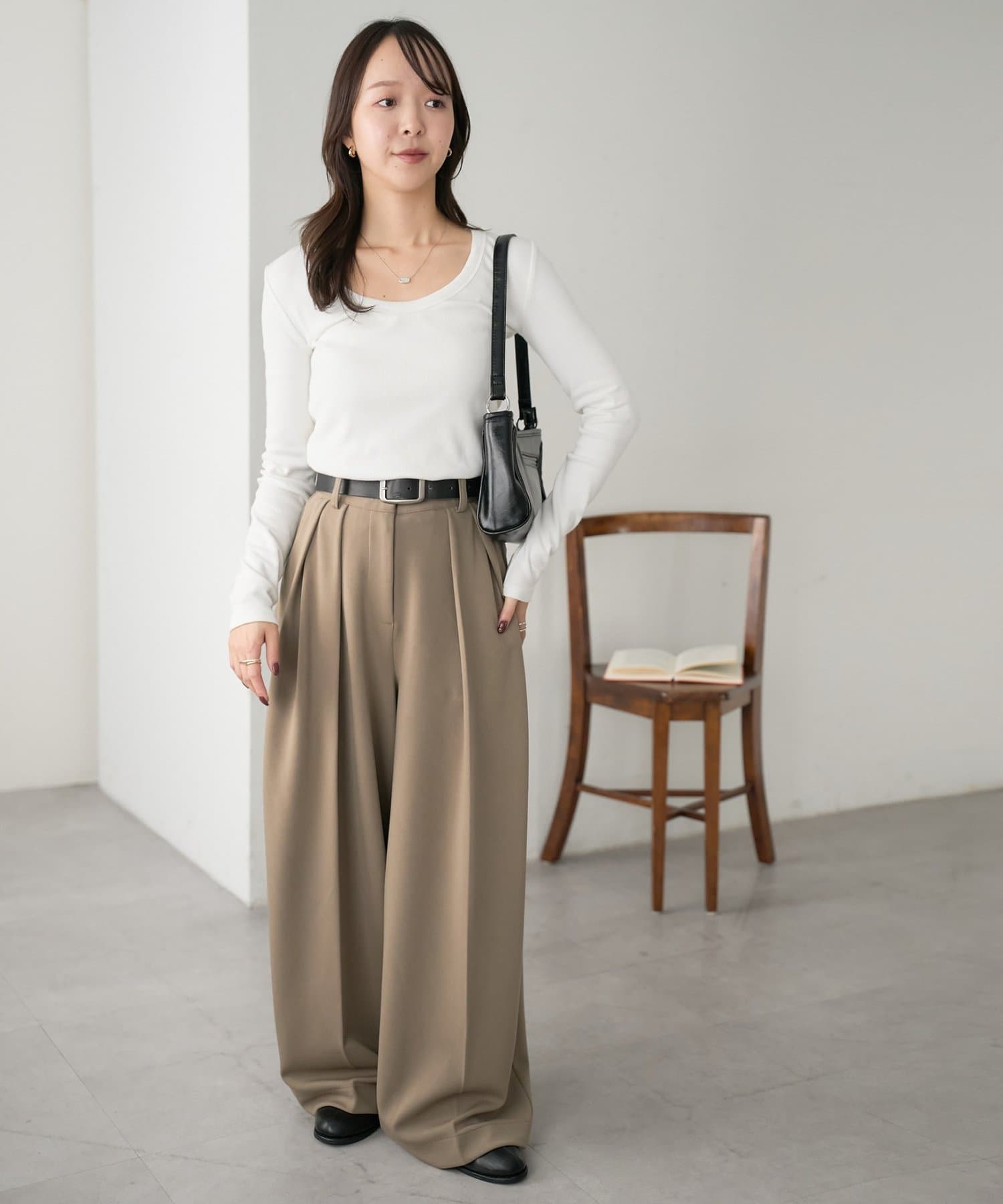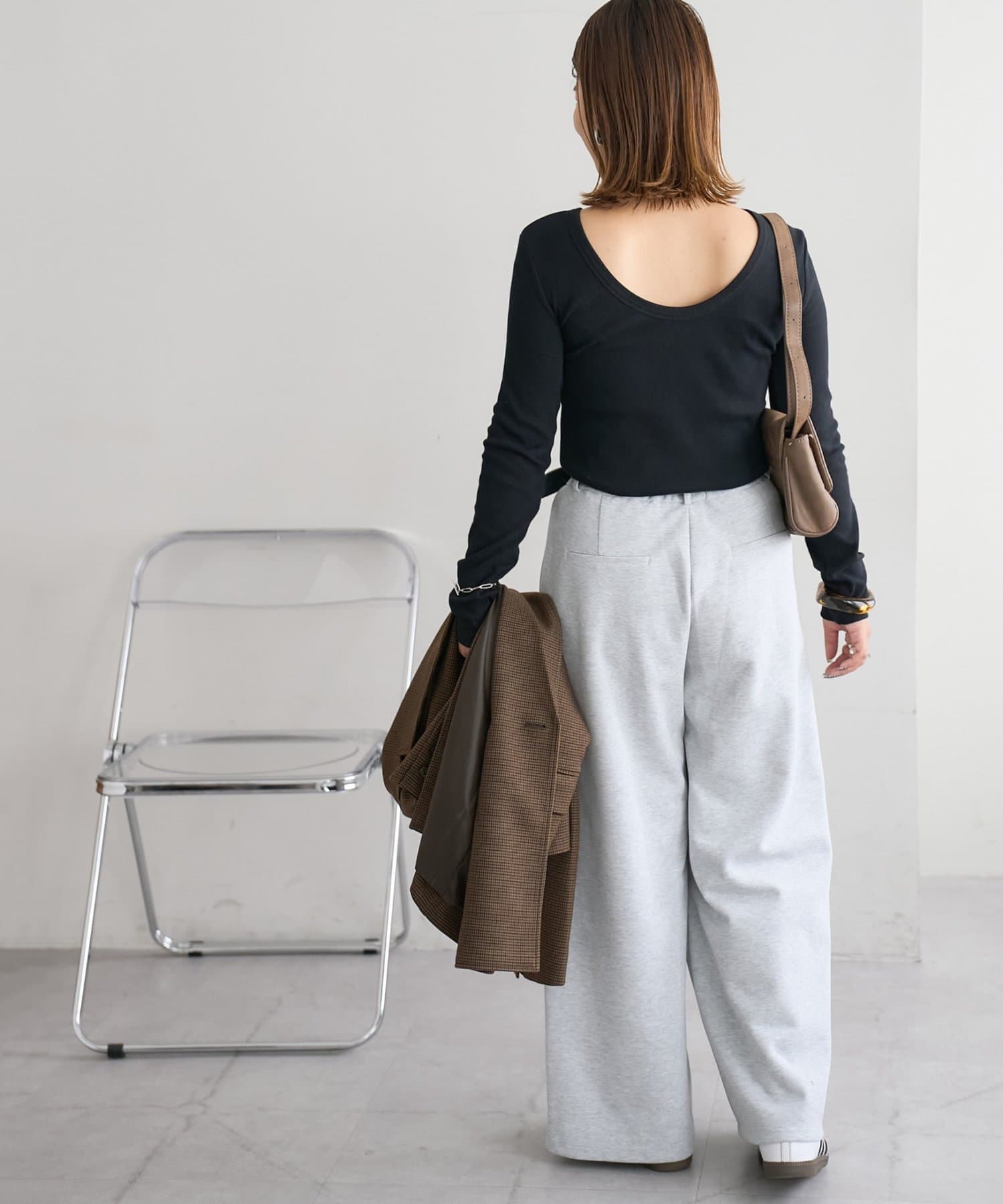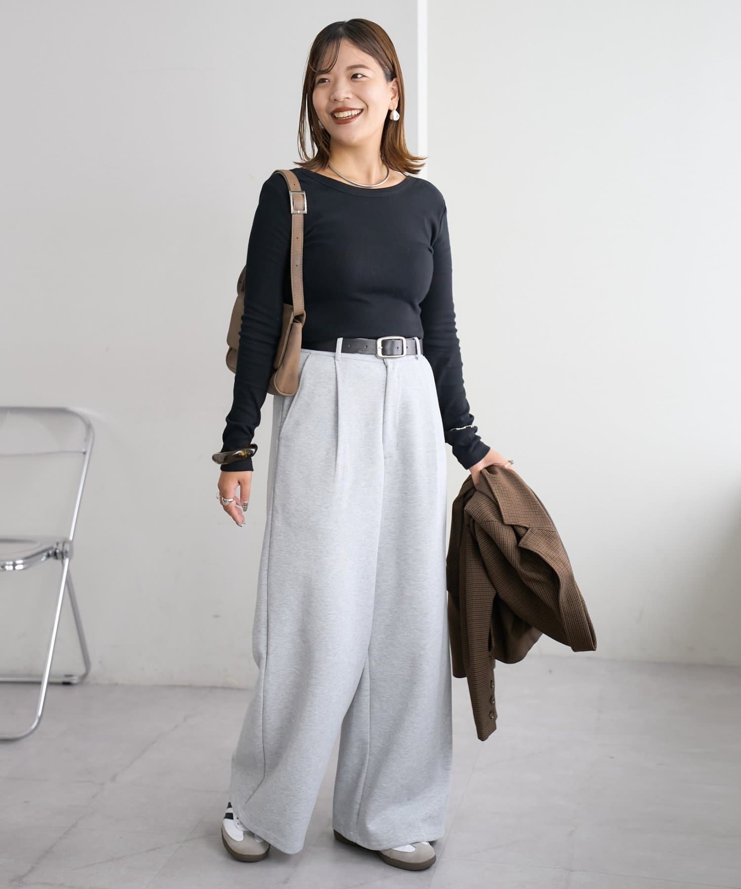 フィット感のあるシルエットなので、ワイドパンツにインすればすっきりとまとまり、スタイルアップ効果も。