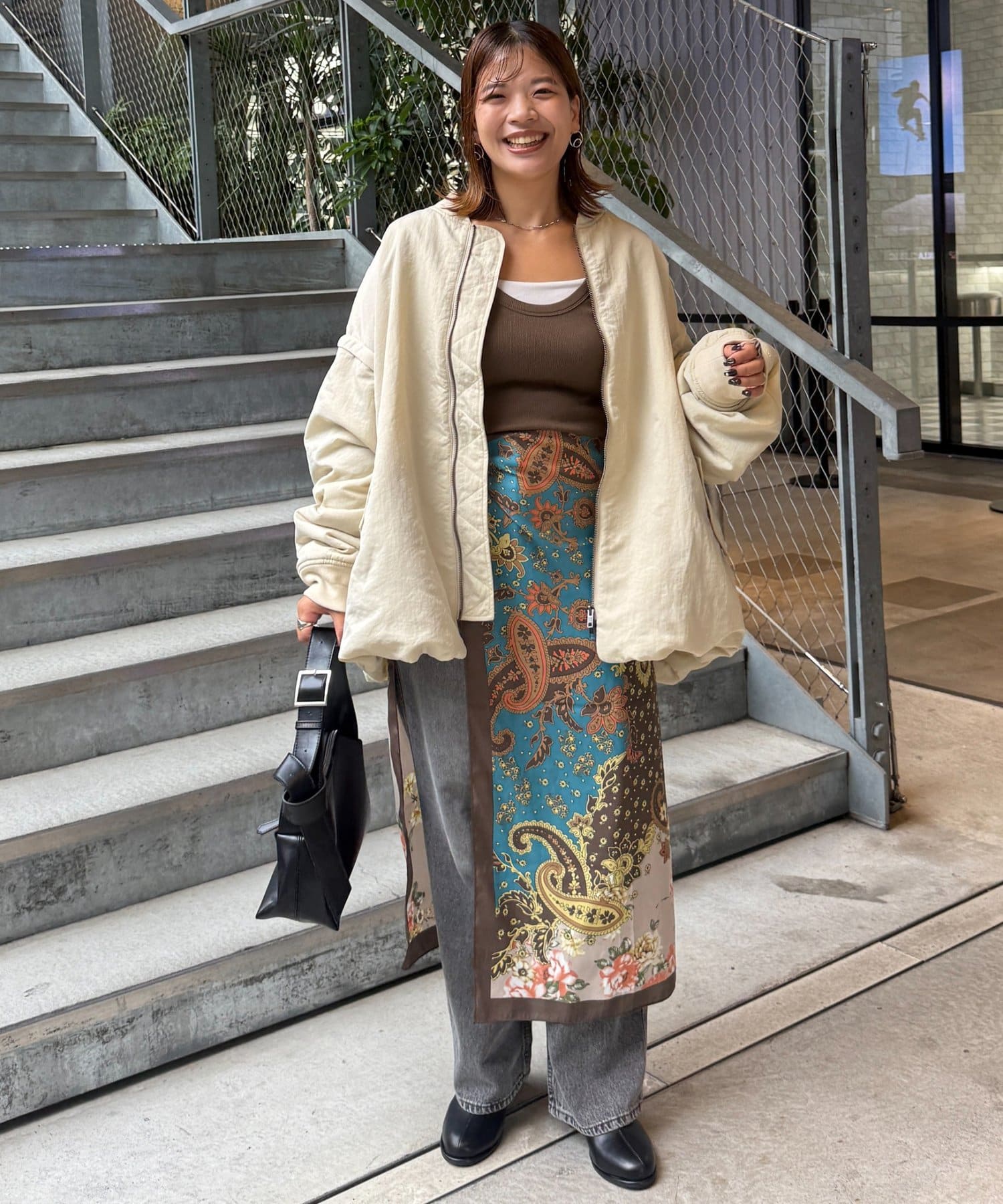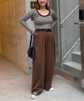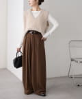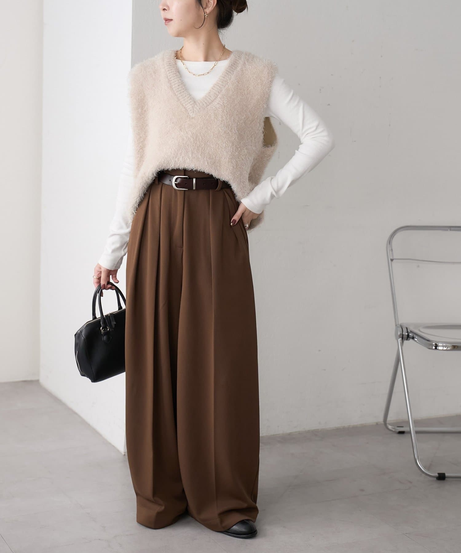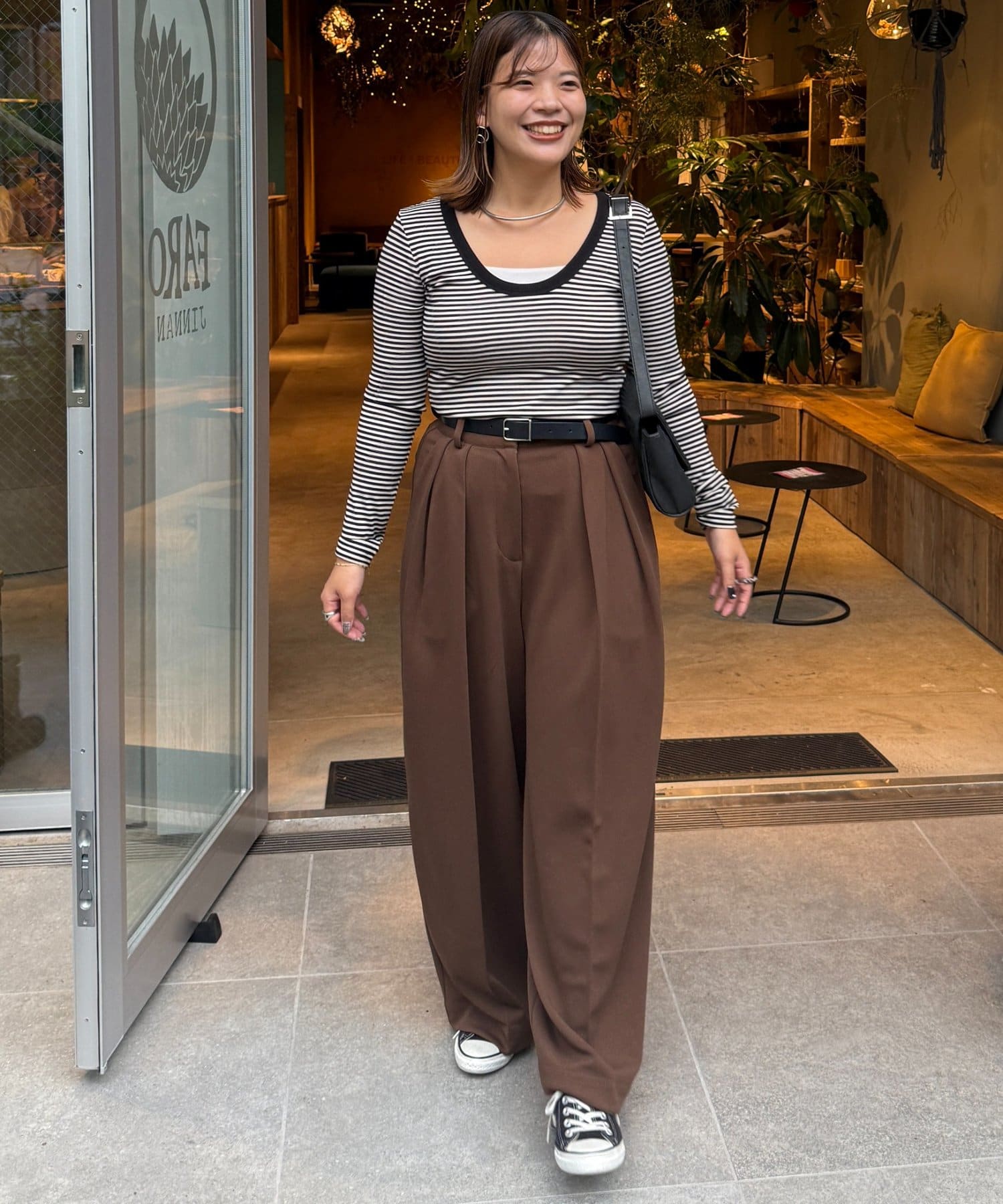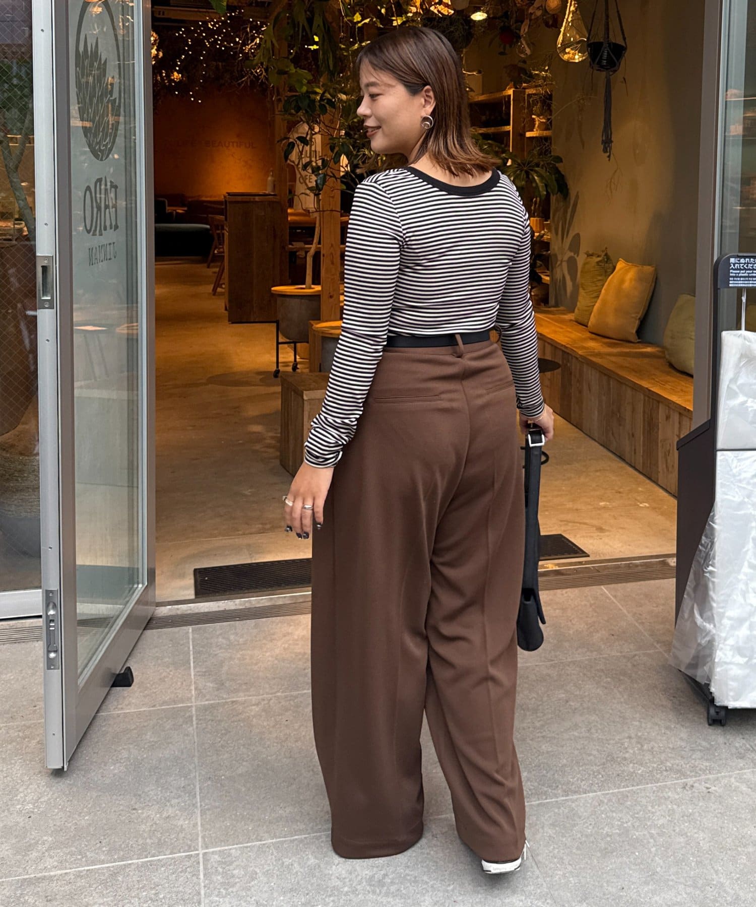 フィット感のあるシルエットなので、ワイドパンツにインすればすっきりとまとまり、スタイルアップ効果も。